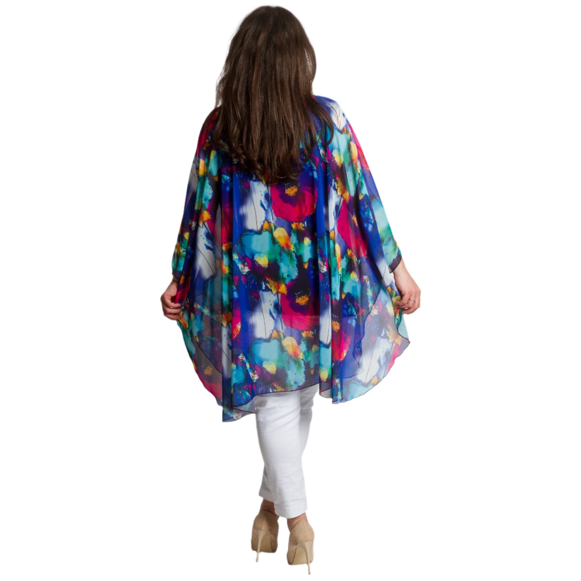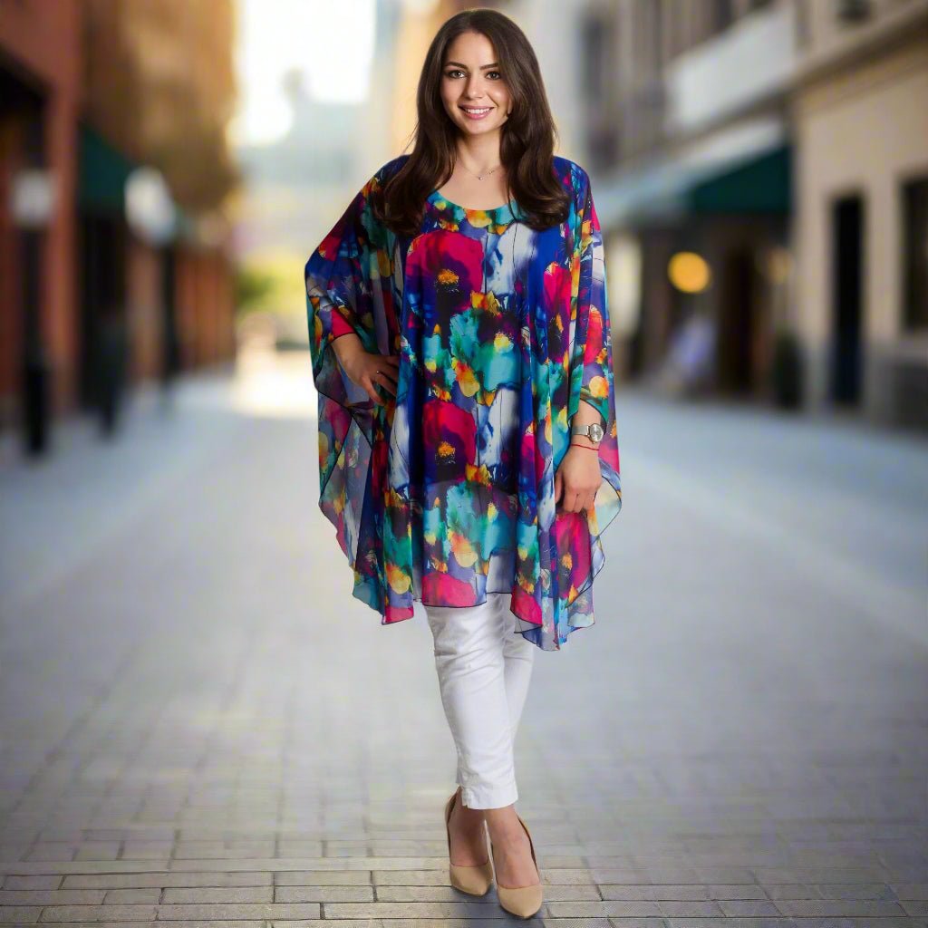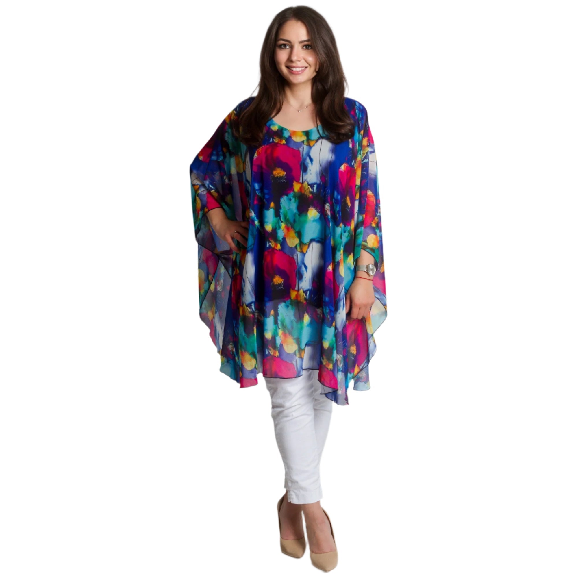 Această tunică din șifon impresionează printr-un imprimeu floral extrem de proaspăt, în culori strălucitoare și vibrante, care conferă o atmosferă estivală și eleganță feminină. Croiul lejer creează o senzație de lejeritate și oferă confort maxim chiar și în mărimi mai mari. Este potrivită atât pentru ocazii formale, cât și pentru ținute elegante de zi cu zi. Materialul ușor și respirabil cad frumos pe corp, iar designul fără mâneci conferă o siluetă modernă și lejeră.