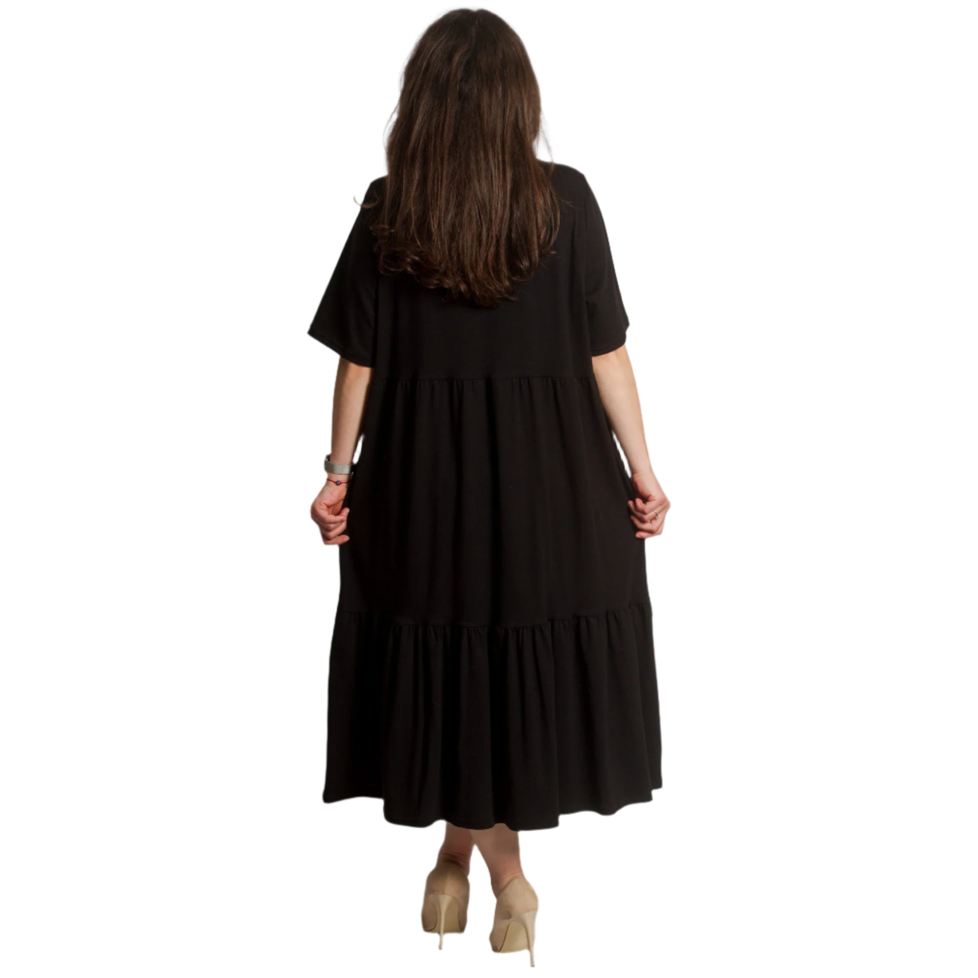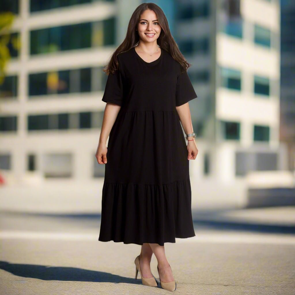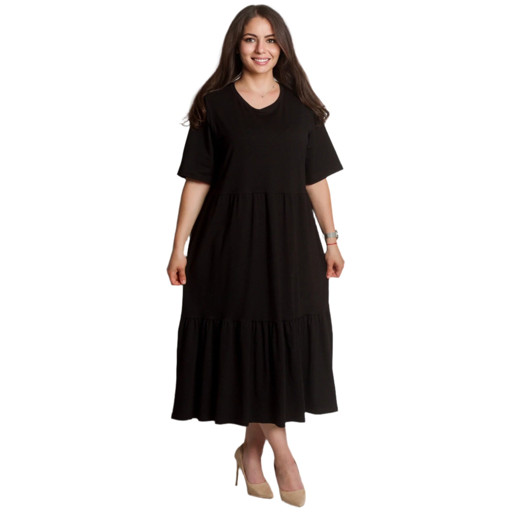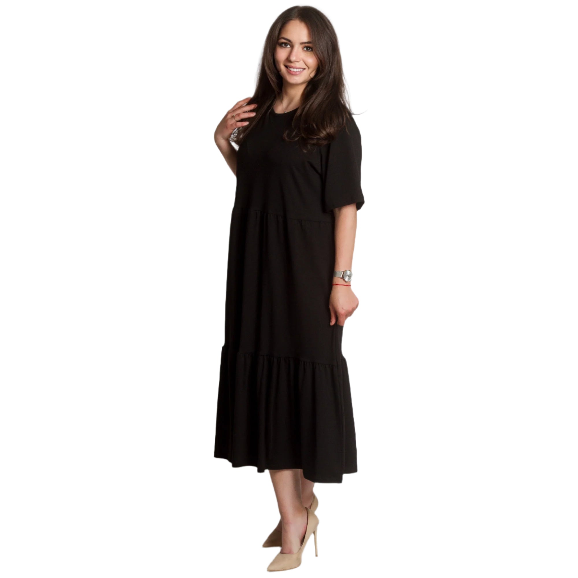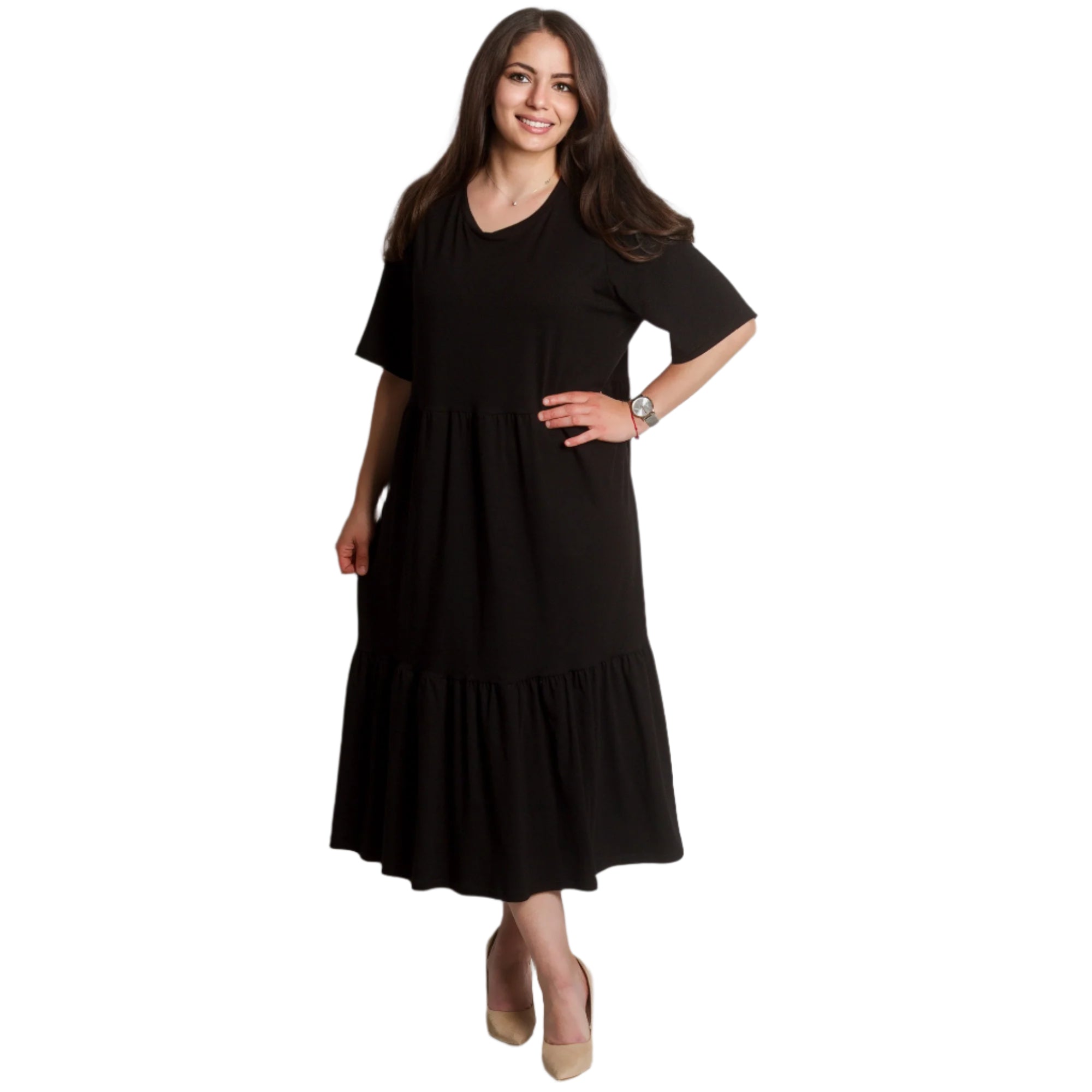 Rochie confortabilă și elegantă, în mărimi mari, confecționată din viscoză moale și elastică. Modelul are o parte inferioară evazată și o parte superioară mulată care accentuează talia fără a fi strâmtă. Mânecile scurte și decolteul rotund o fac o alegere ideală pentru purtarea de zi cu zi - atât la birou, cât și pentru o plimbare în parc. Materialul ușor și croiala lejeră oferă confort pe tot parcursul zilei.