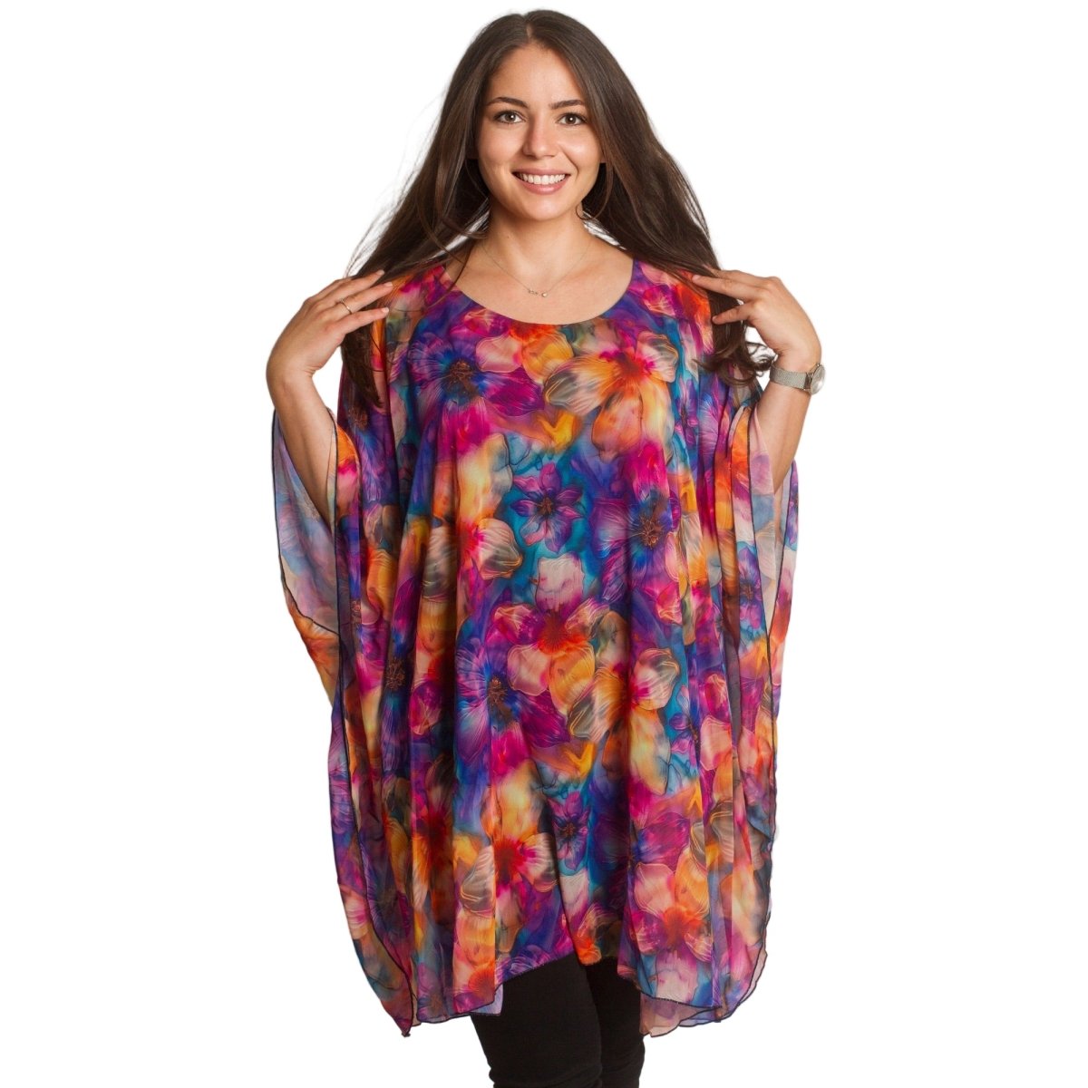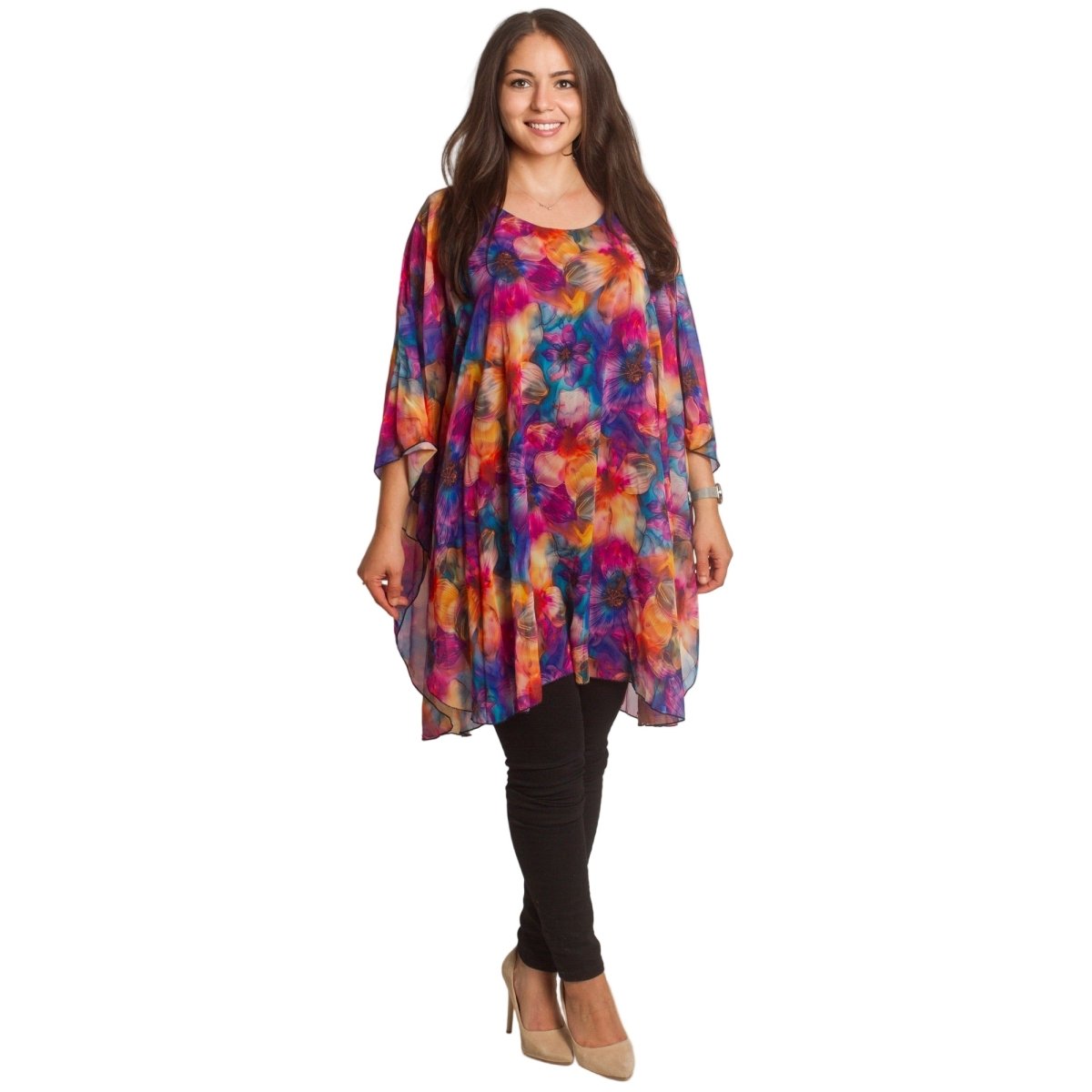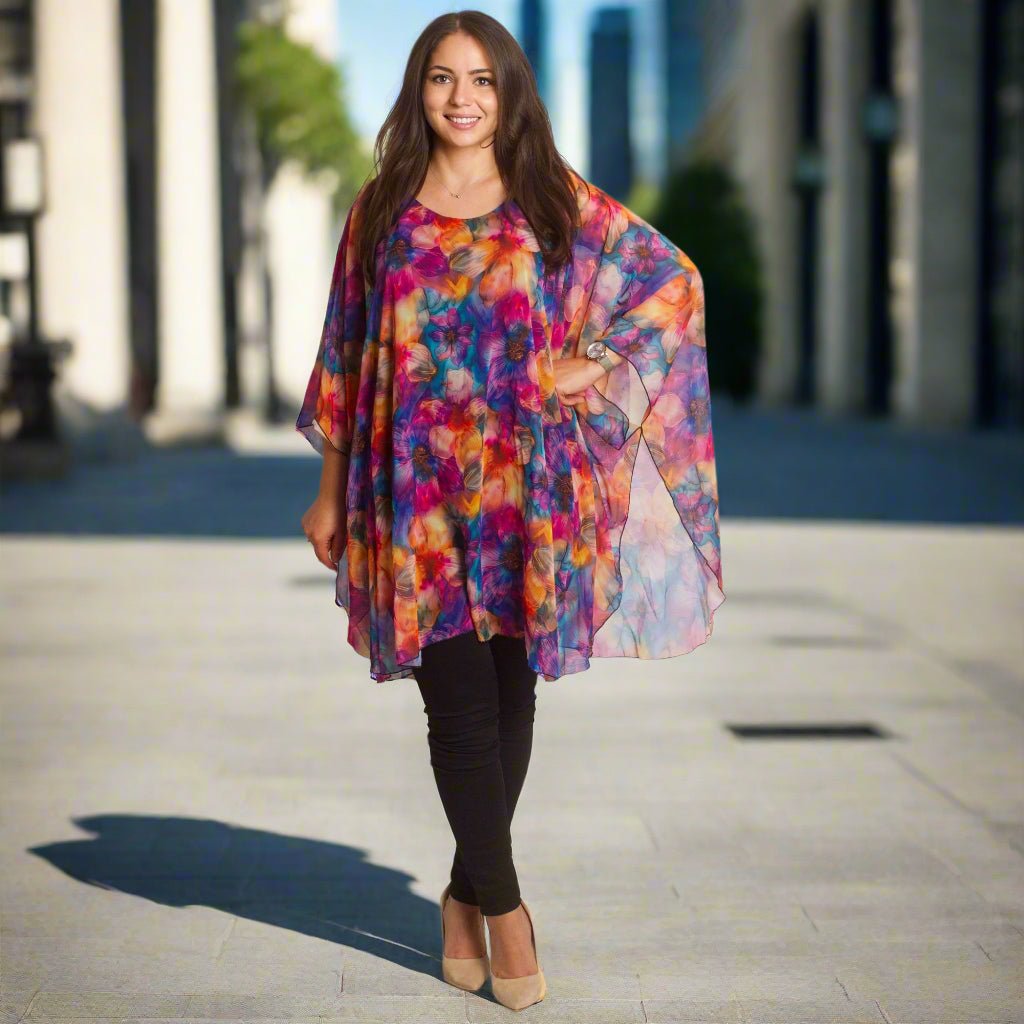Accentuează-ți feminitatea cu această tunică vaporoasă din șifon, disponibilă în mărimi mari. Modelul impresionează printr-un model floral strălucitor, într-o paletă bogată de culori. Croiul lejer și mânecile largi oferă lejeritate și confort, iar căptușeala adaugă un plus de rafinament și ascunde transparența. Este potrivită pentru ocazii formale, când vrei să arăți elegantă și să te simți confortabilă în același timp.