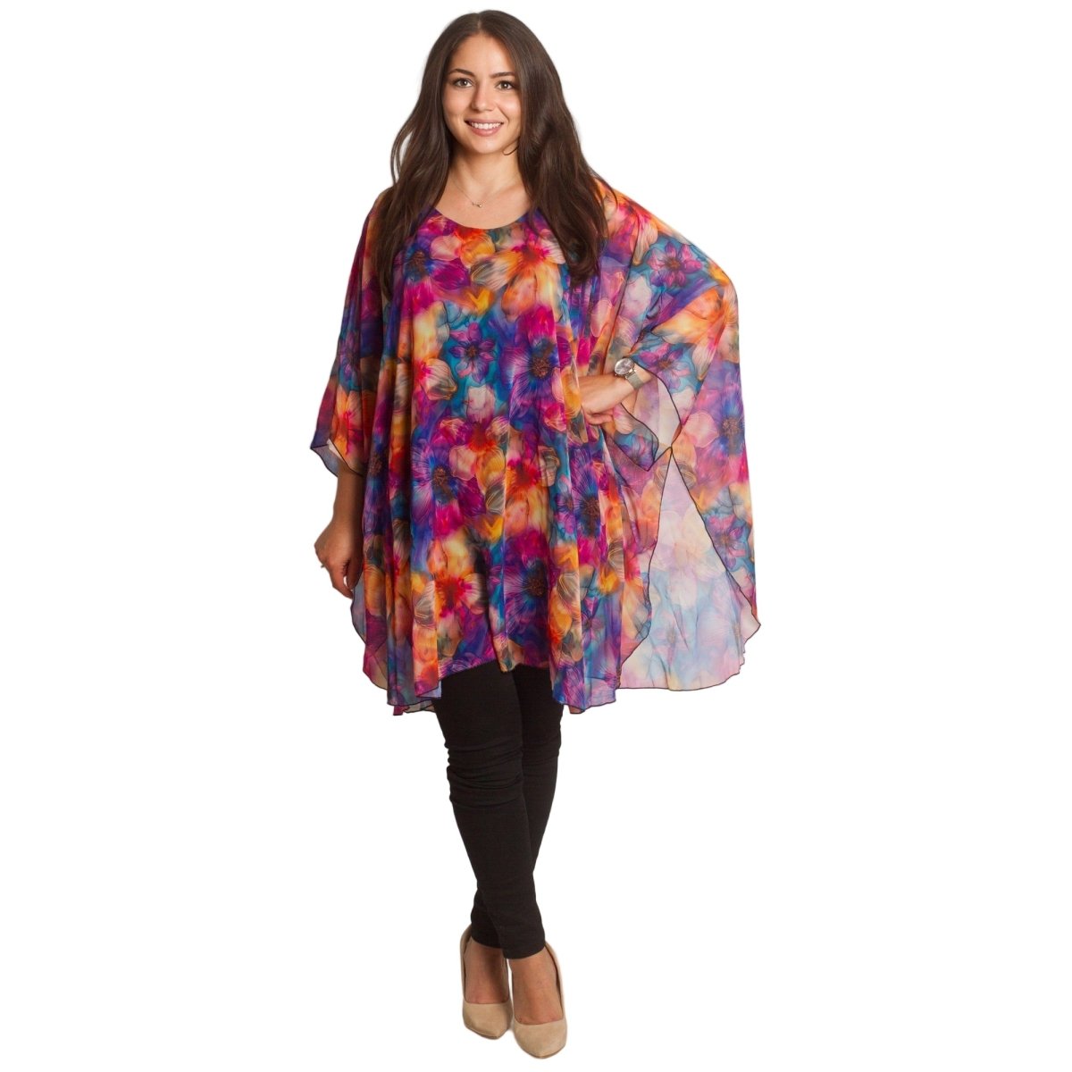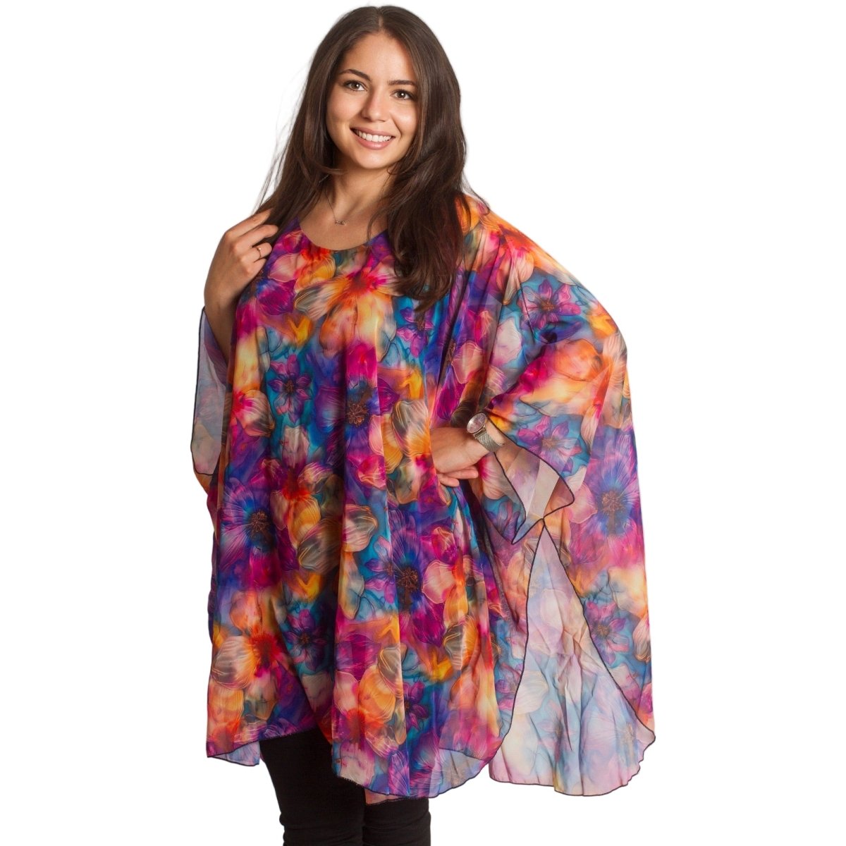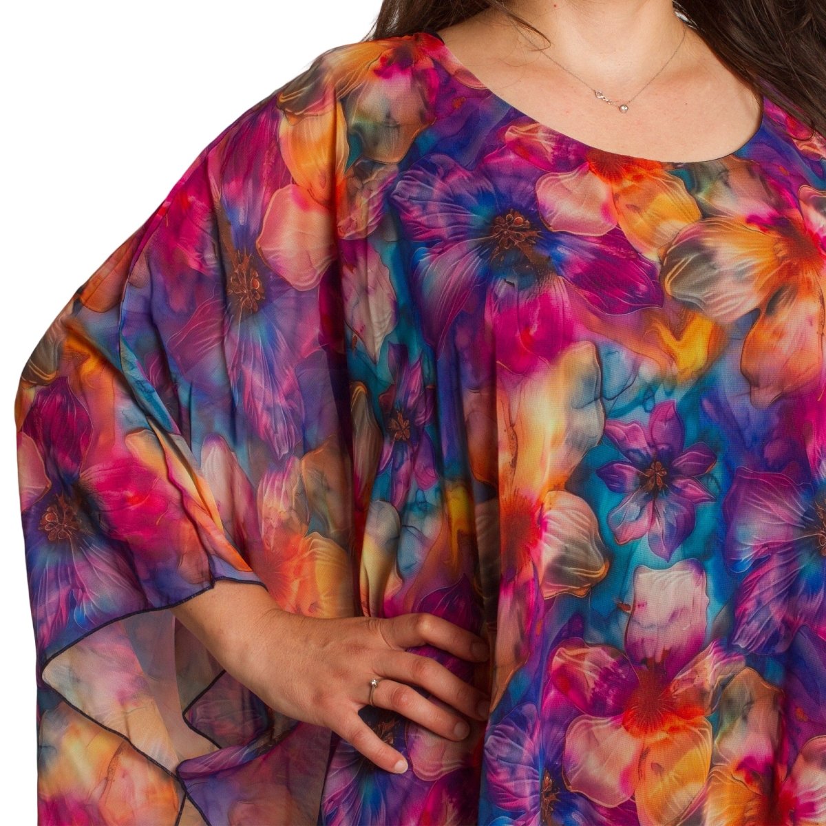 Accentuează-ți feminitatea cu această tunică vaporoasă din șifon, disponibilă în mărimi mari. Modelul impresionează printr-un model floral strălucitor, într-o paletă bogată de culori. Croiul lejer și mânecile largi oferă lejeritate și confort, iar căptușeala adaugă un plus de rafinament și ascunde transparența. Este potrivită pentru ocazii formale, când vrei să arăți elegantă și să te simți confortabilă în același timp.