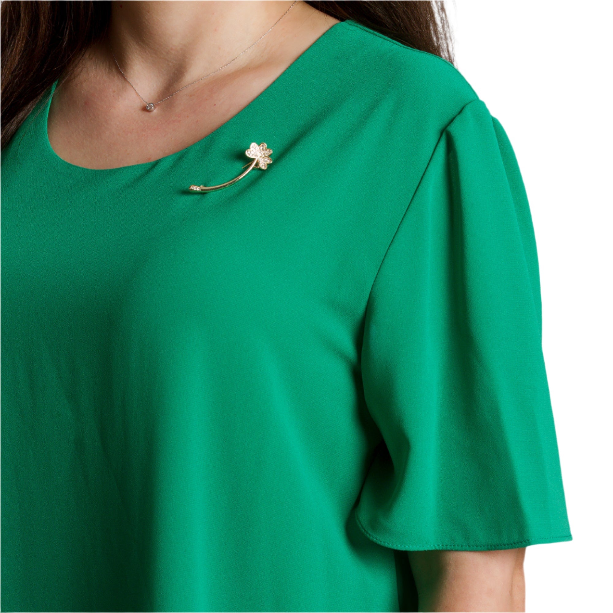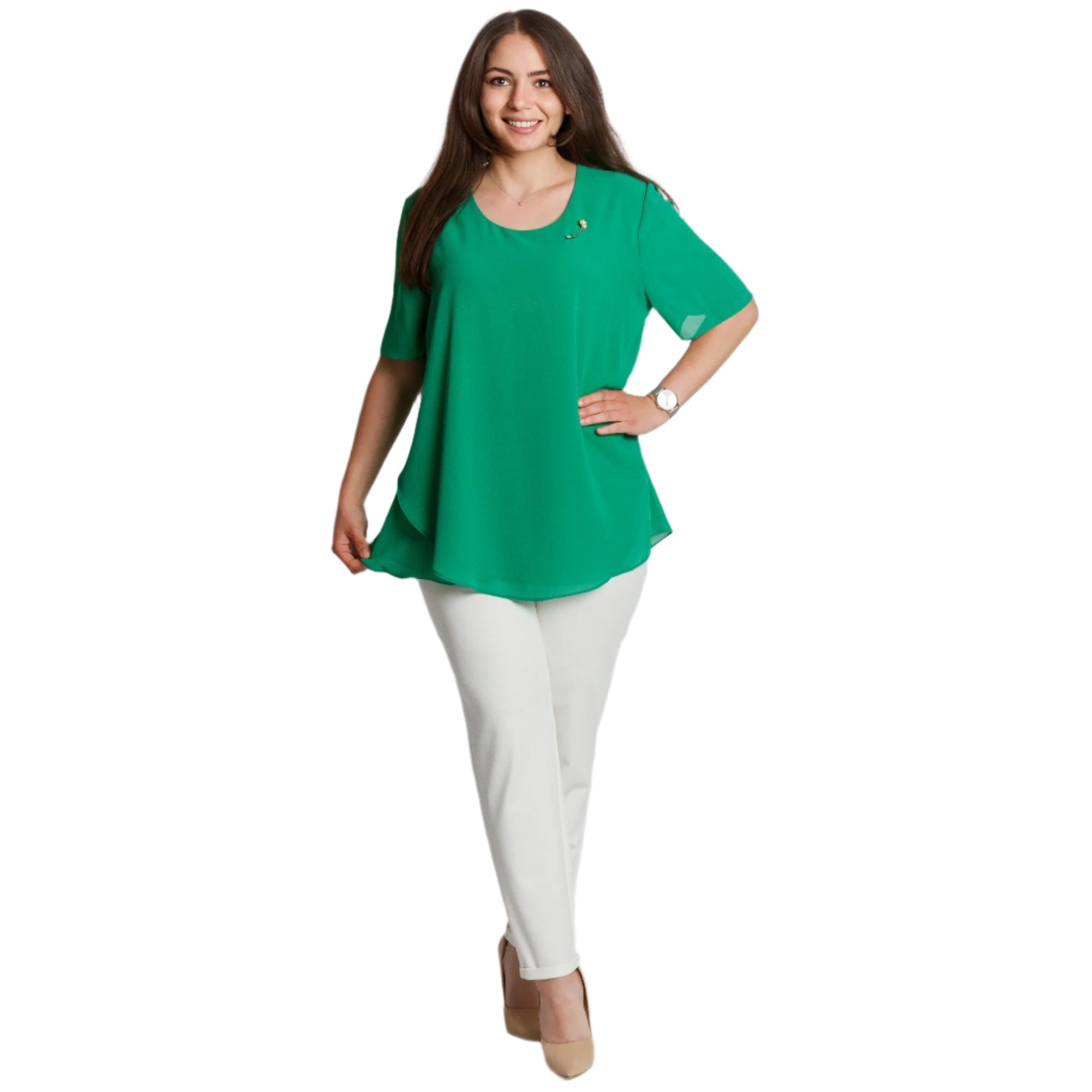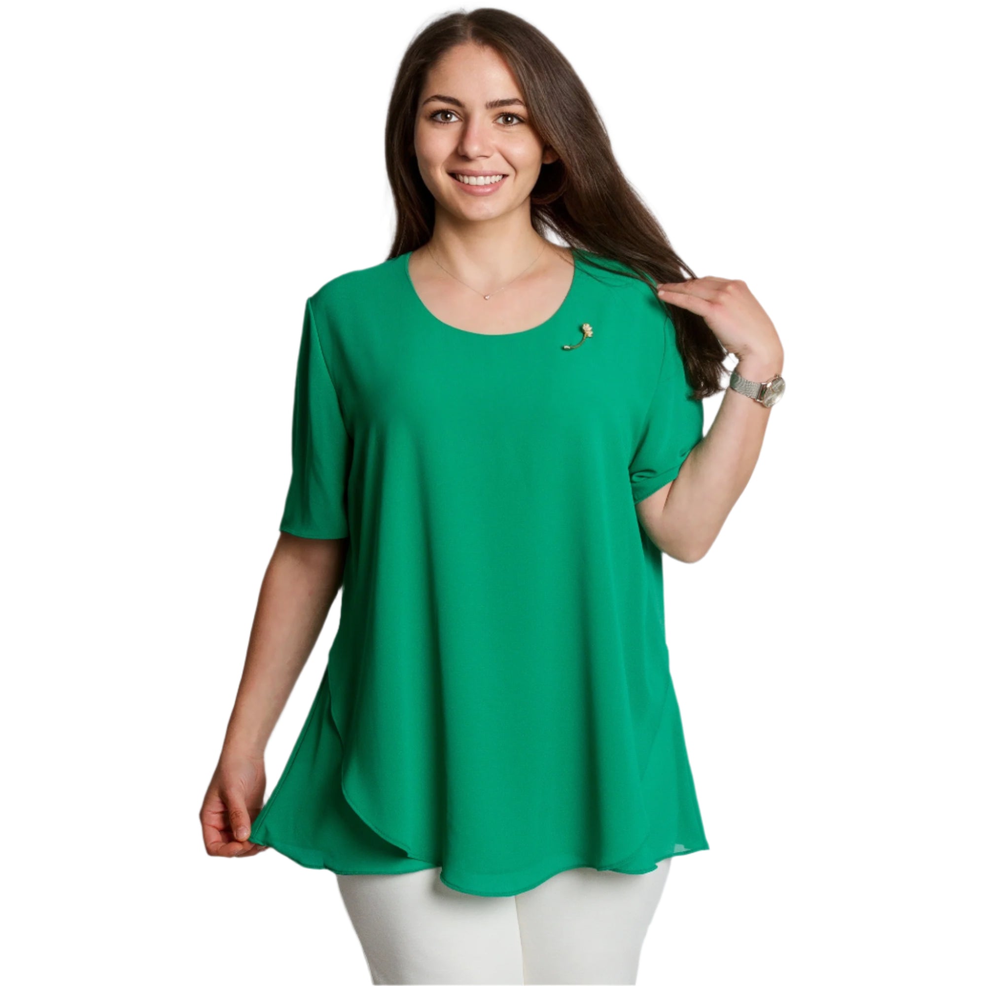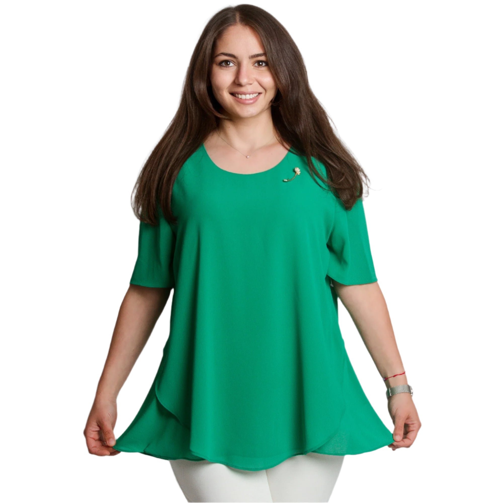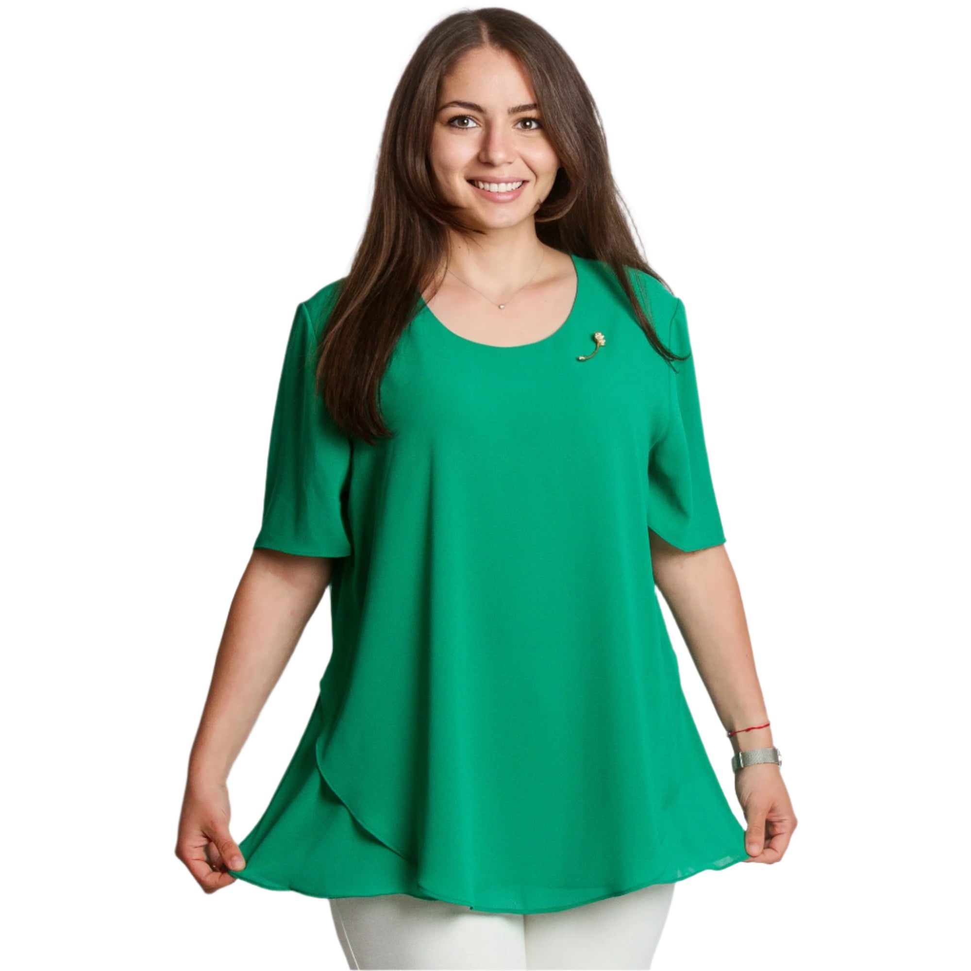 Tunică proaspătă și elegantă, cu o siluetă evazată, potrivită pentru doamne în mărimi mari. Modelul este într-o culoare verde intensă, cu mâneci scurte și decolteu rotund. Confecționată dintr-un material ușor și plăcut la atingere - poliester și viscoză - tunica cade liber și ascunde delicat formele. Ideală pentru ocazii formale, evenimente sau ieșiri de seară. Broșa decorativă adaugă completitudine și un aspect feminin.