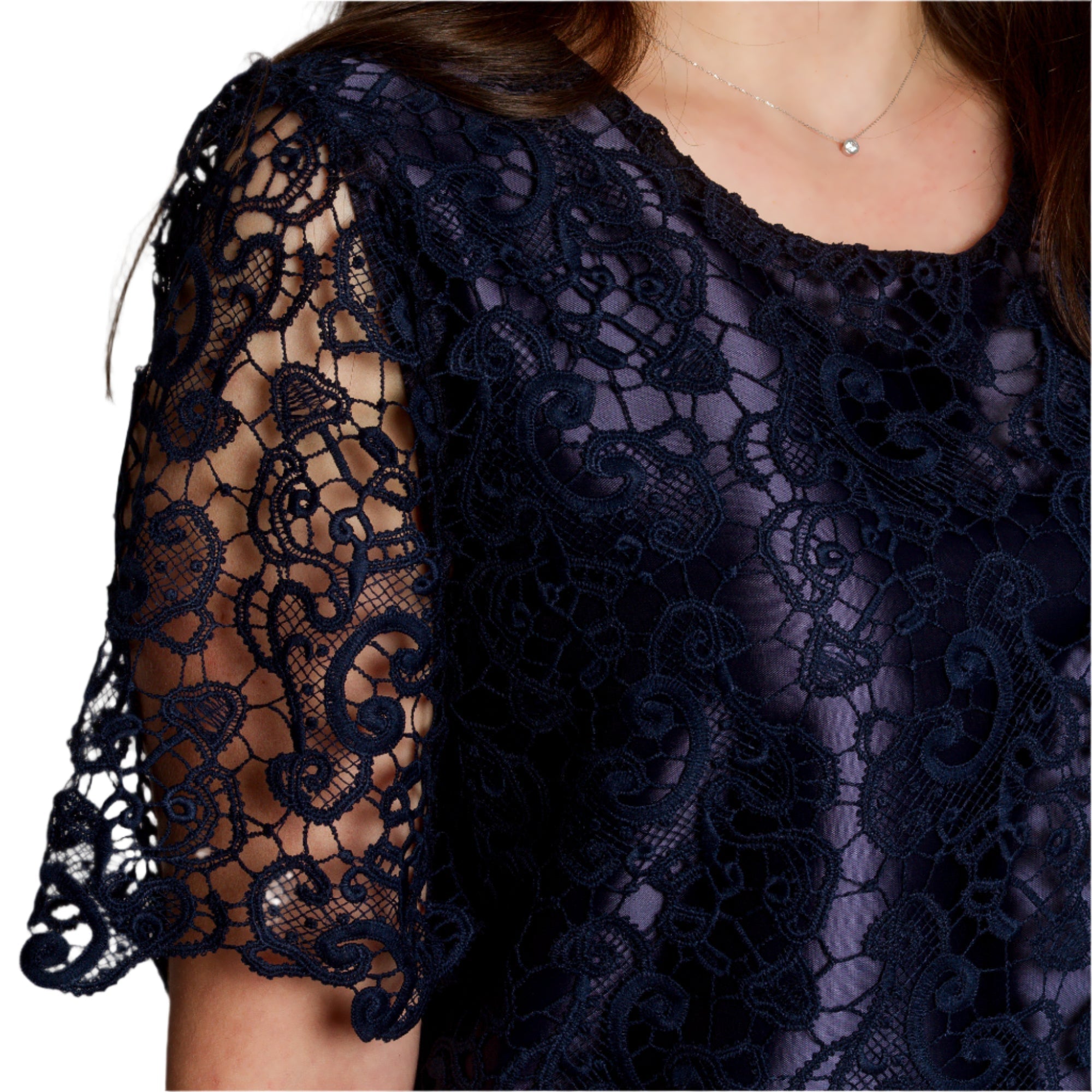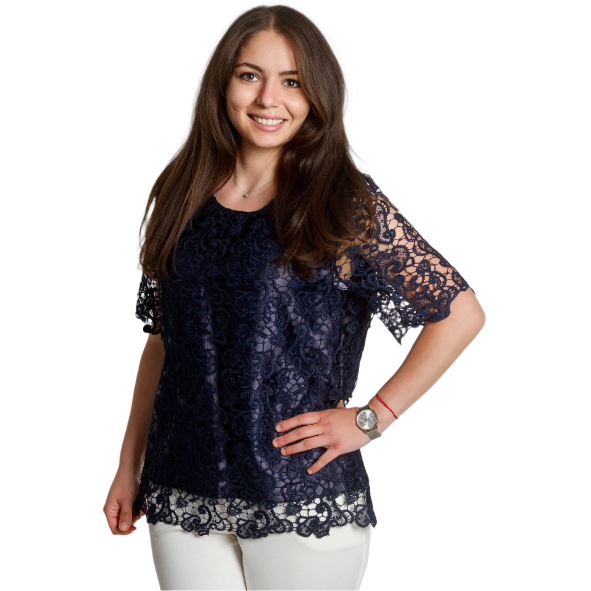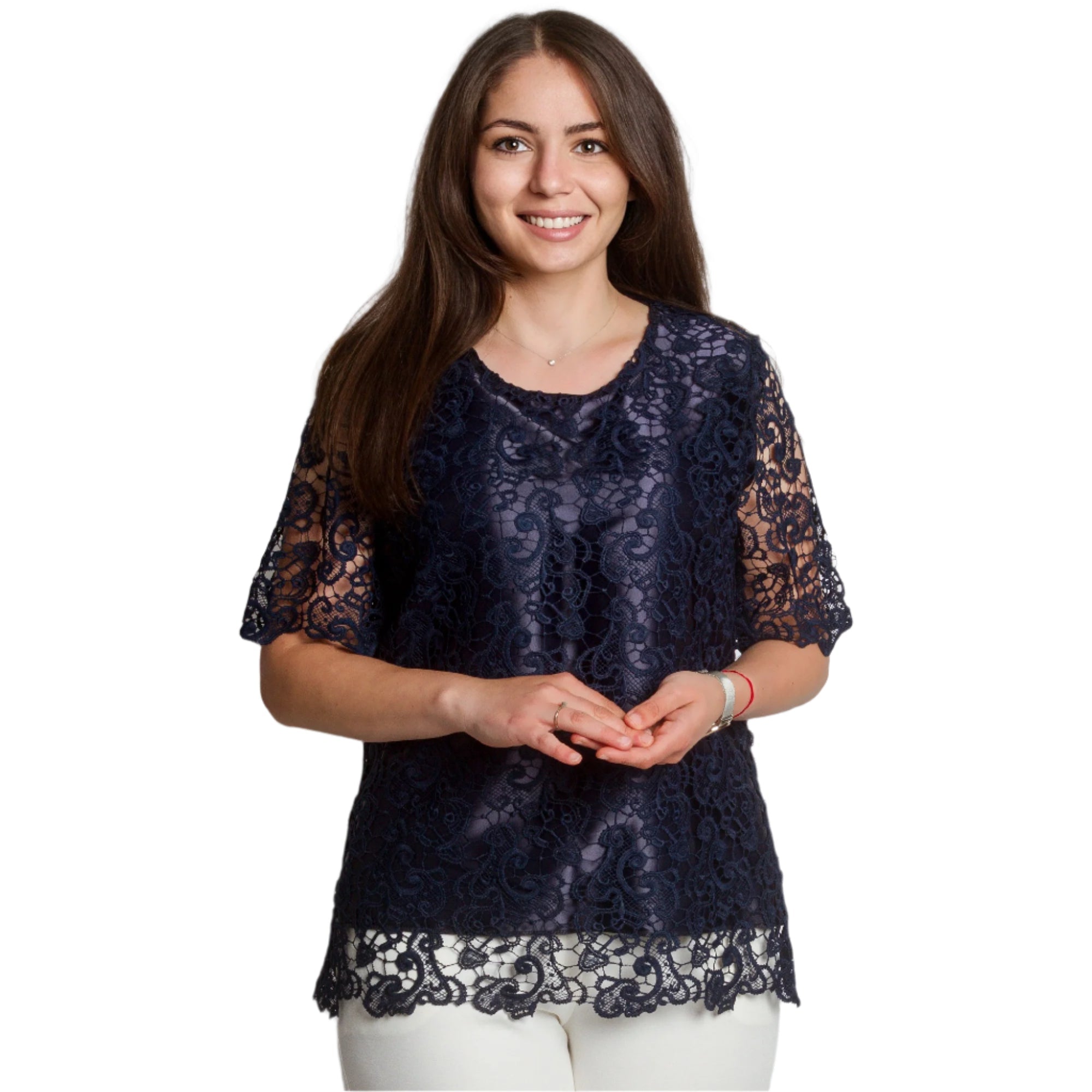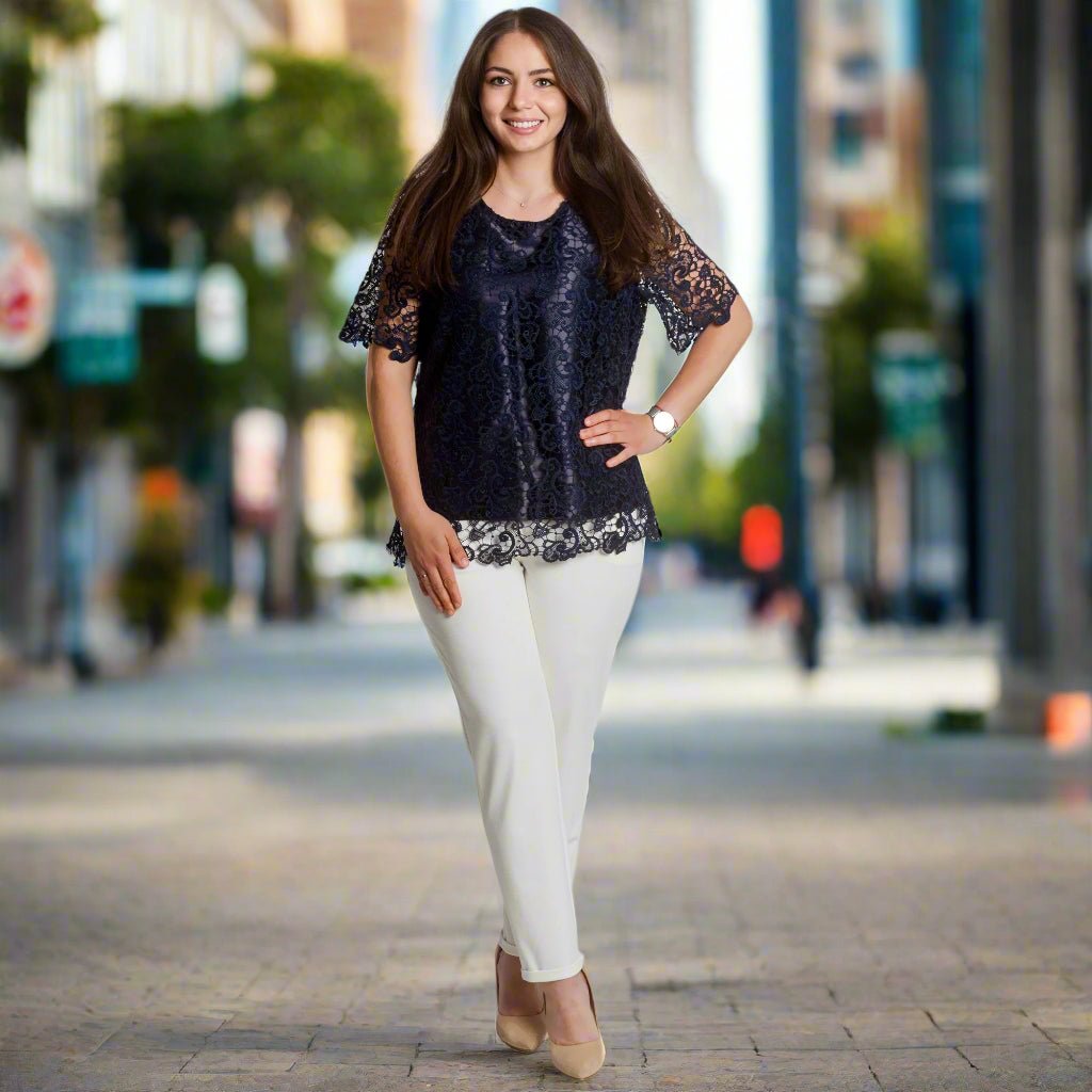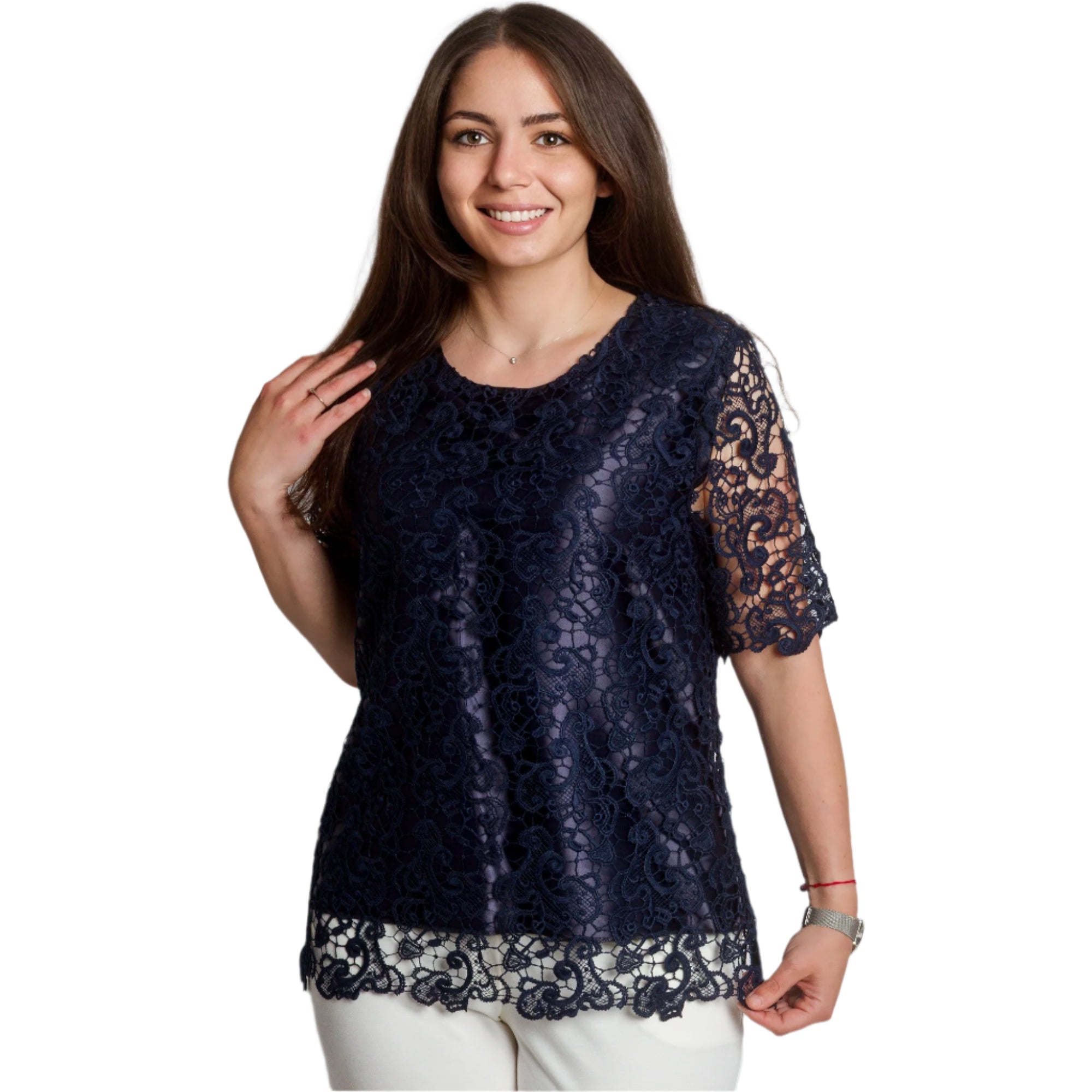 Bluză elegantă de damă, cu croială dreaptă, confecționată din dantelă delicată de culoare albastru închis, cu căptușeală groasă. Modelul are decolteu rotund și mâneci scurte care rămân translucide pentru un plus de eleganță. Tivul se termină cu o frumoasă bordură din dantelă, care conferă un aspect romantic. Alegere perfectă pentru ocazii speciale, sărbători sau seri elegante. Potrivită pentru a fi combinată cu pantaloni eleganți sau o fustă.