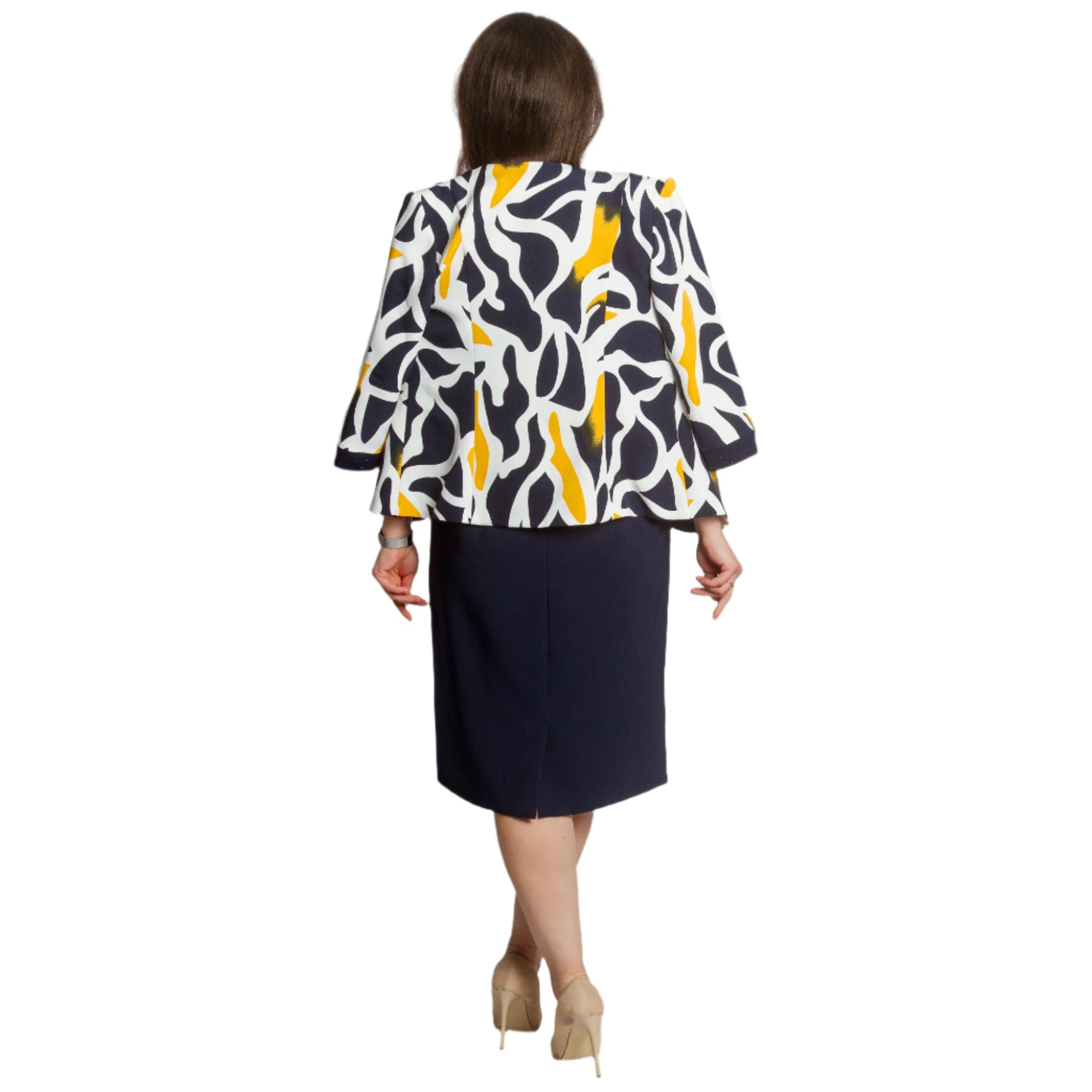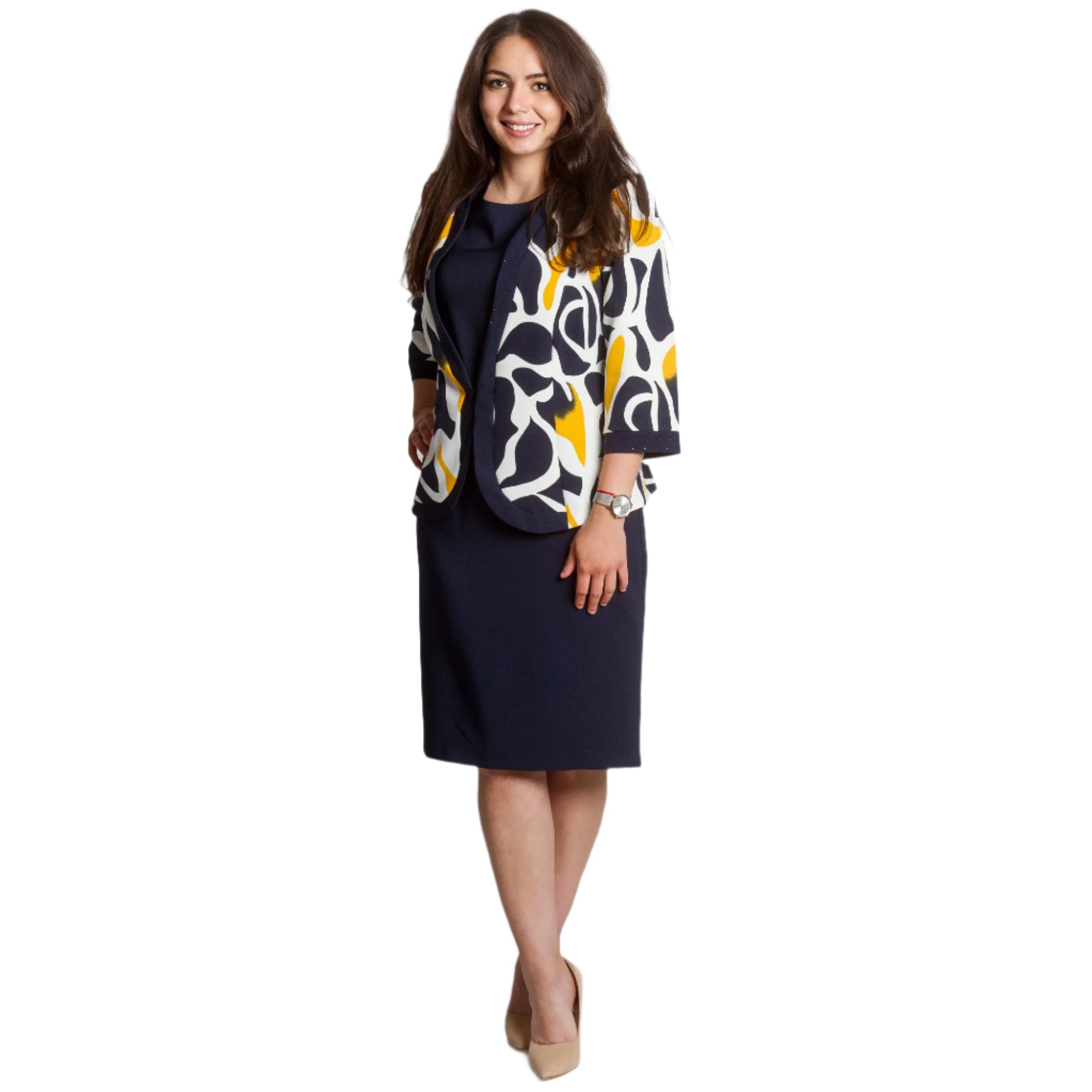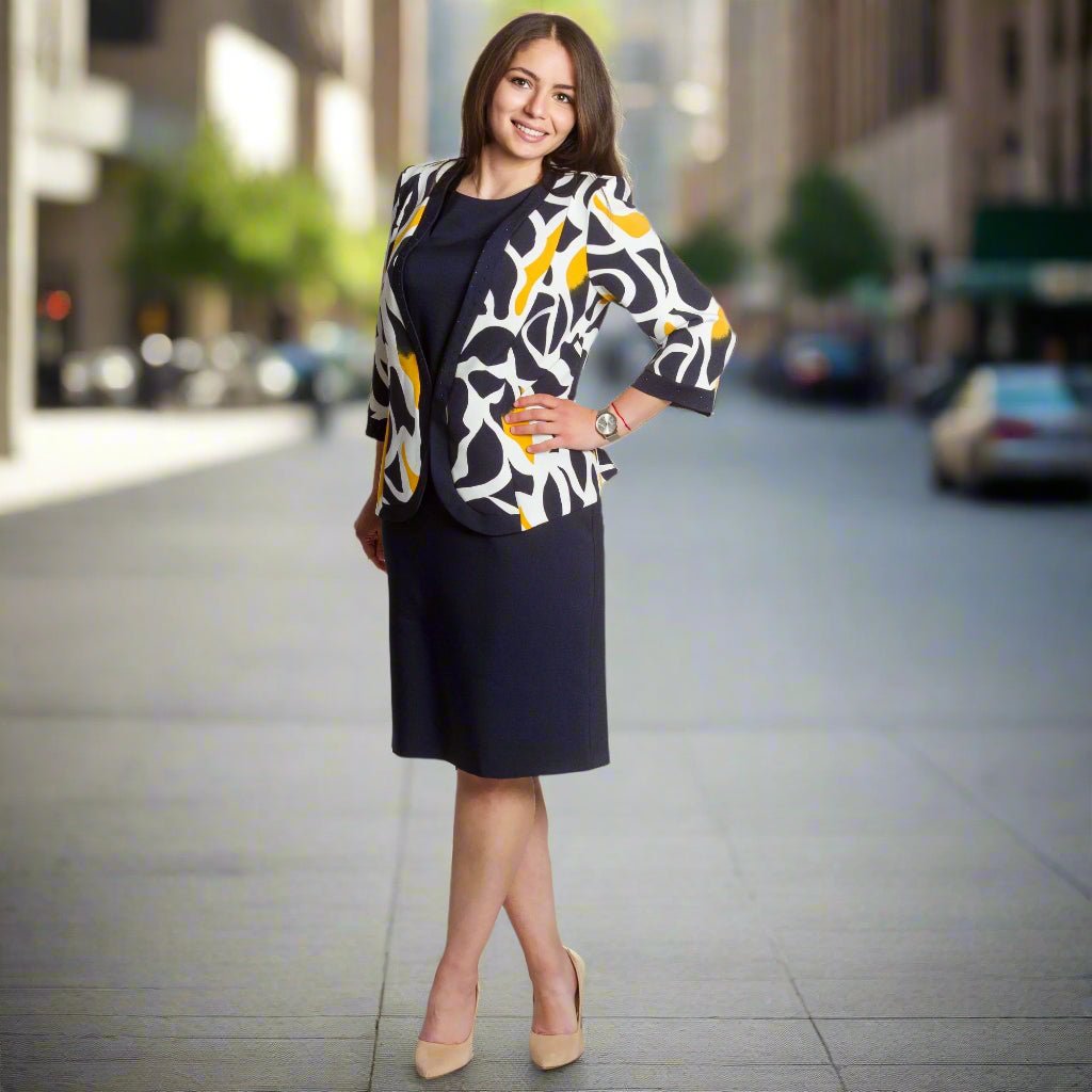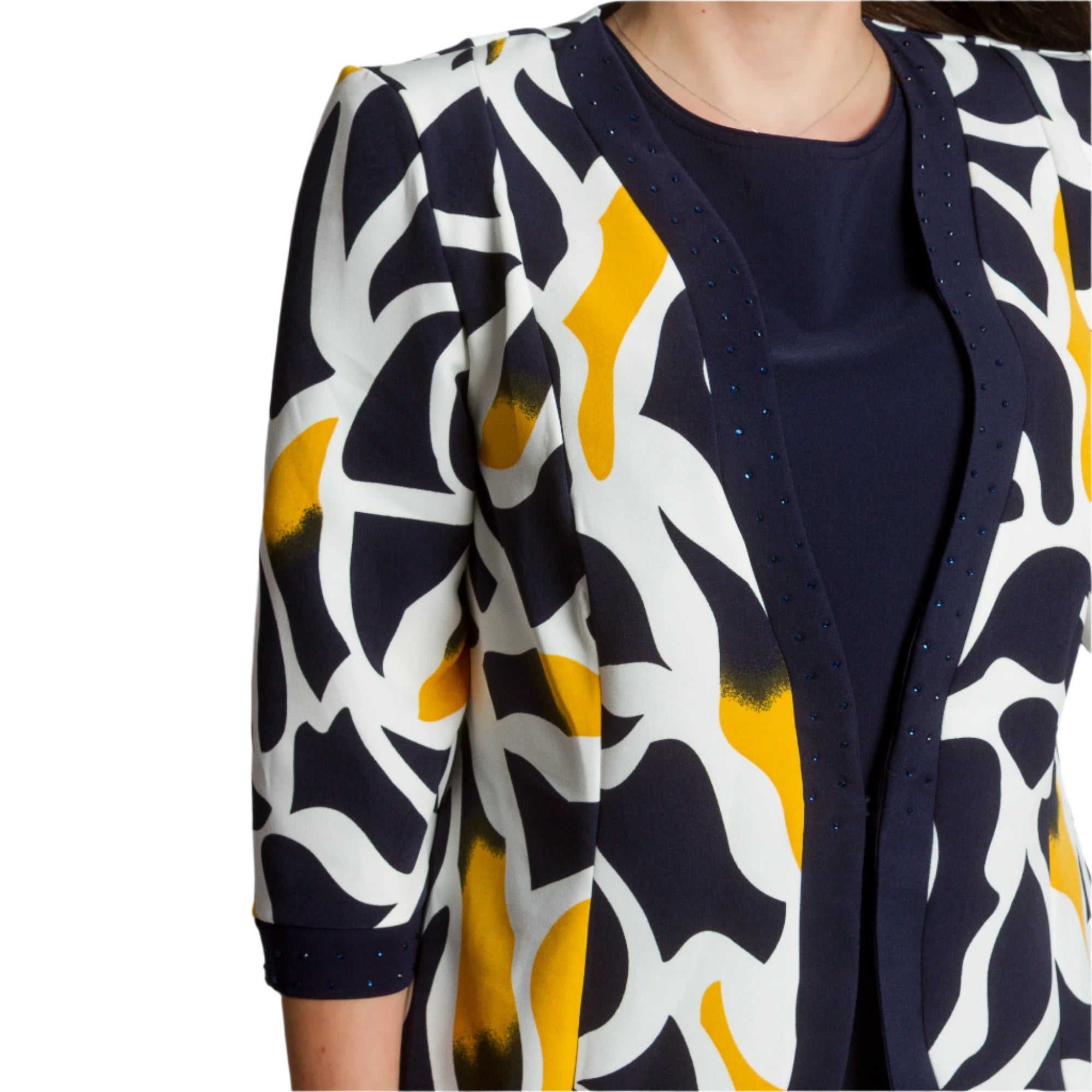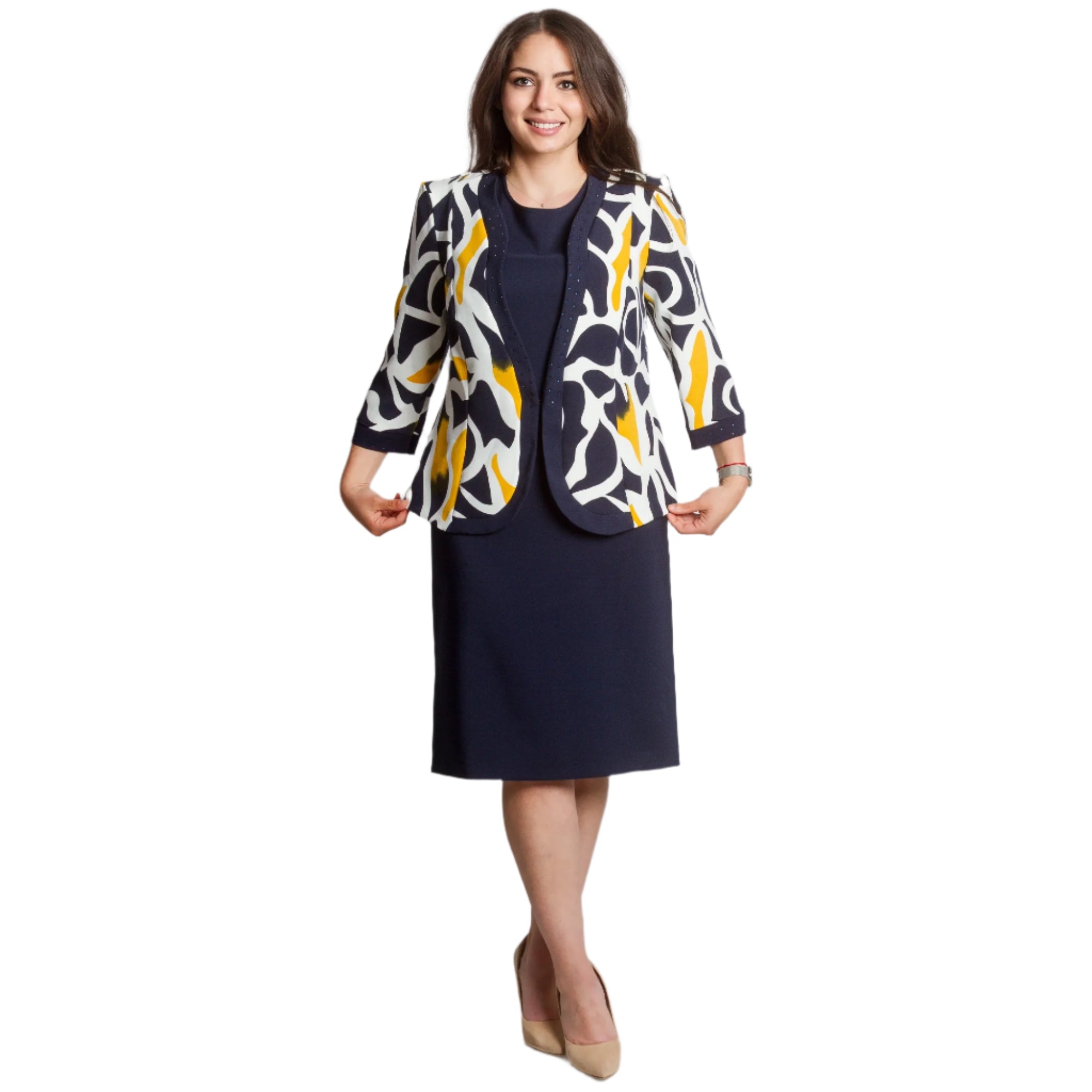 Costum de damă elegant și modern, format dintr-o rochie bleumarin cu croială dreaptă și un sacou cu mâneci 3/4 și un model abstract spectaculos în galben, bleumarin și ecru. Rochia are decolteu rotund și este decorată cu pietre fine în talie și în jurul decolteului, creând o strălucire blândă. Sacoul este descheiat, cu o siluetă ușor mulată și o bandă decorativă cu pietre de-a lungul marginilor. O alegere potrivită pentru evenimente formale, medii de lucru sau ocazii festive.
