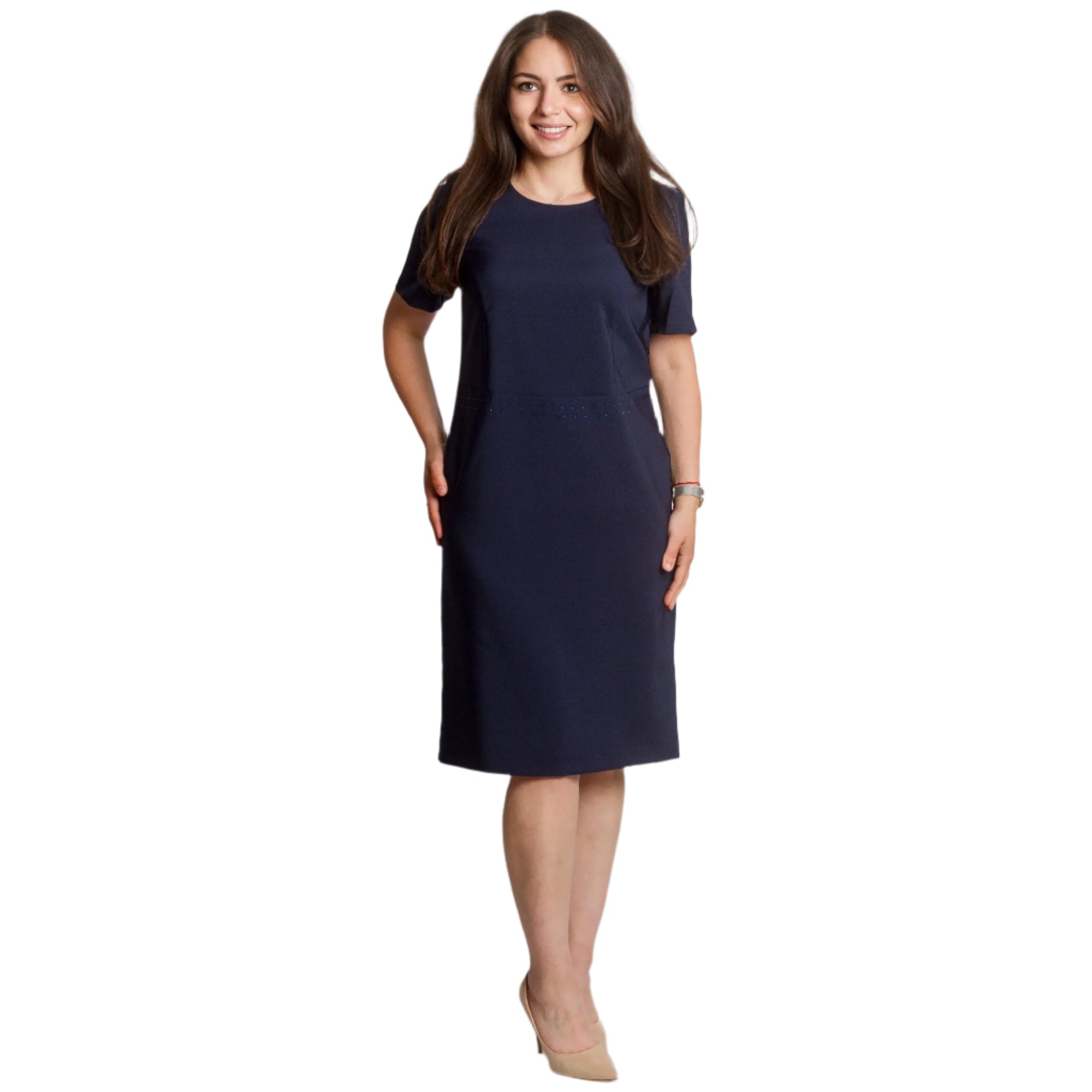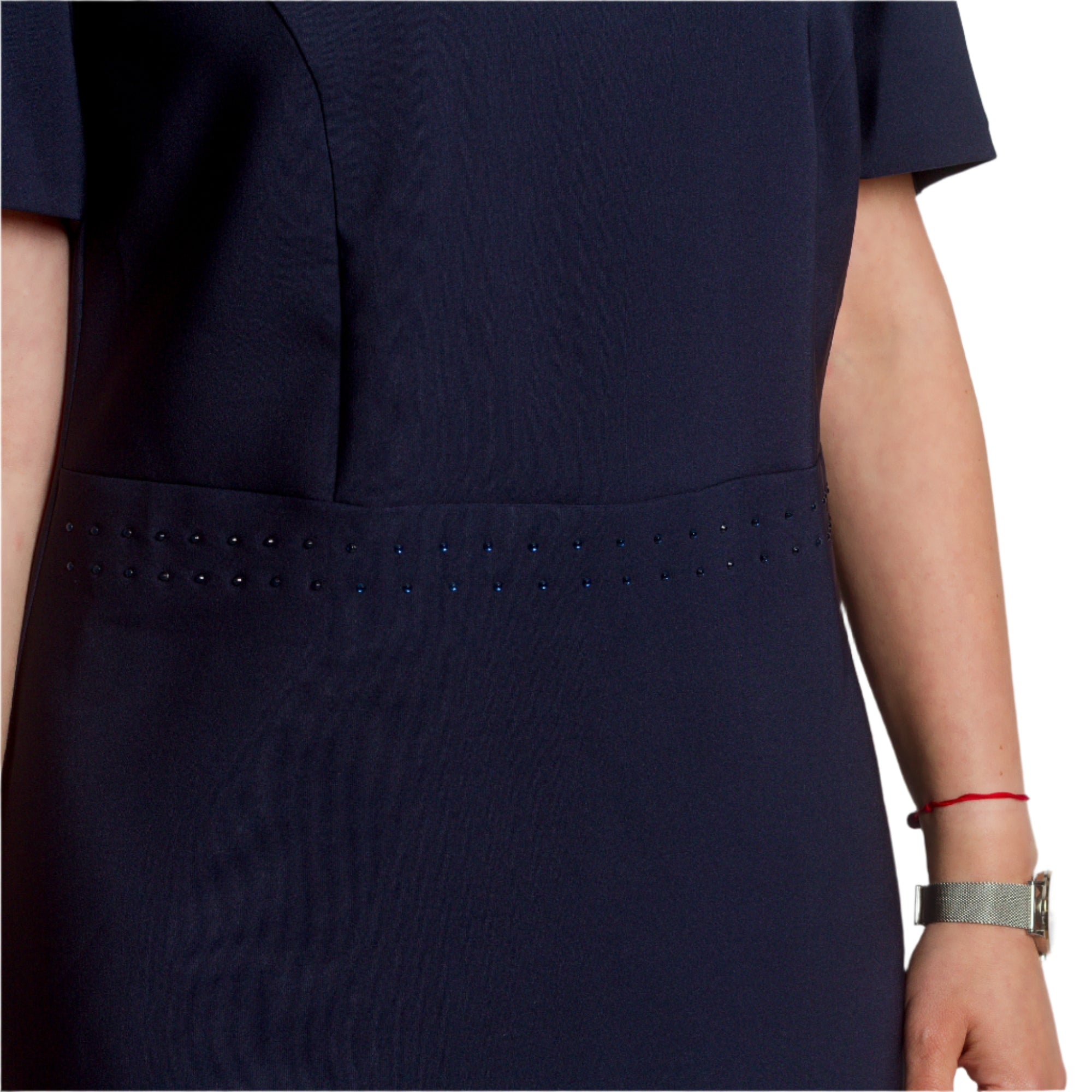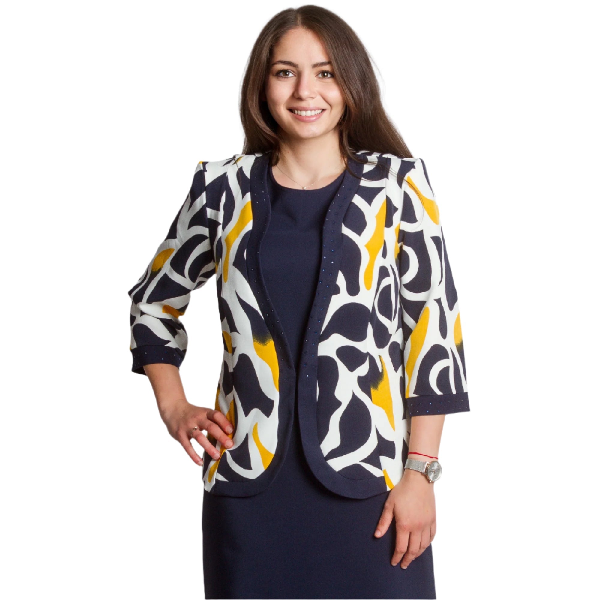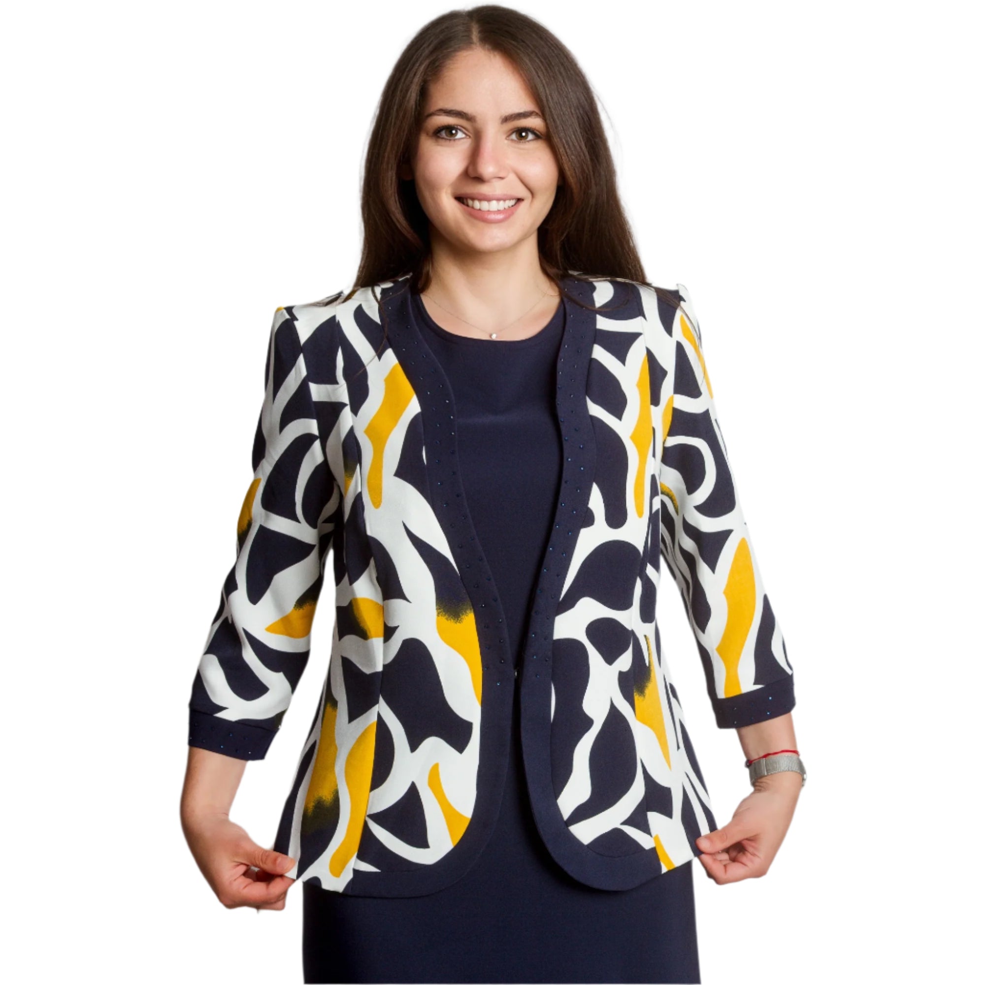 Costum de damă elegant și modern, format dintr-o rochie bleumarin cu croială dreaptă și un sacou cu mâneci 3/4 și un model abstract spectaculos în galben, bleumarin și ecru. Rochia are decolteu rotund și este decorată cu pietre fine în talie și în jurul decolteului, creând o strălucire blândă. Sacoul este descheiat, cu o siluetă ușor mulată și o bandă decorativă cu pietre de-a lungul marginilor. O alegere potrivită pentru evenimente formale, medii de lucru sau ocazii festive.
