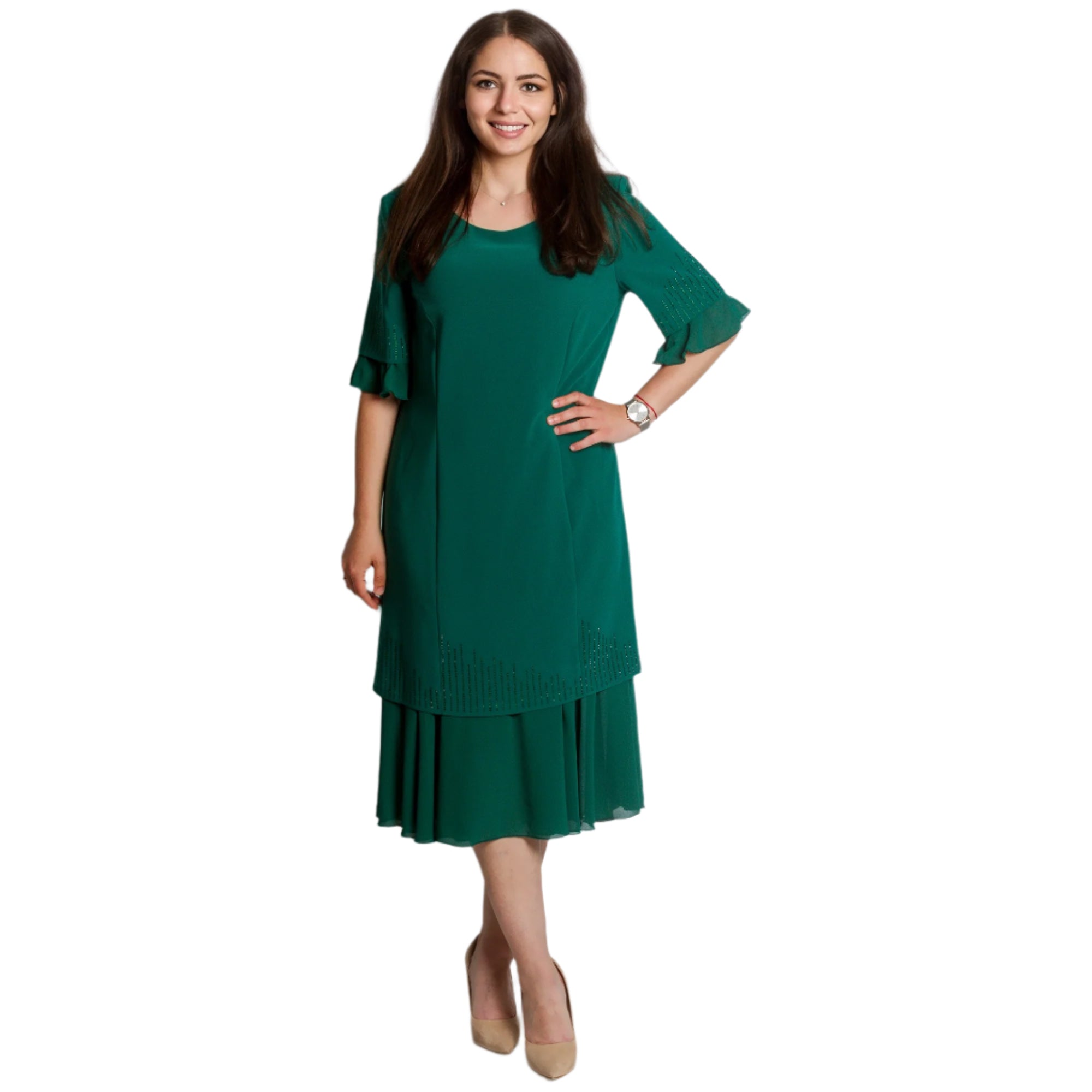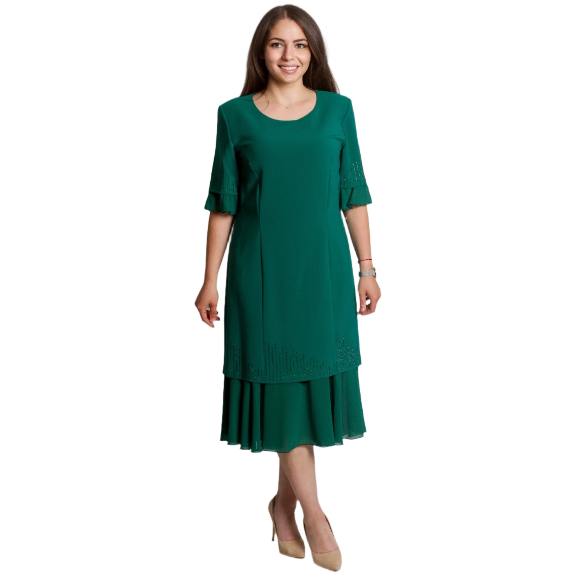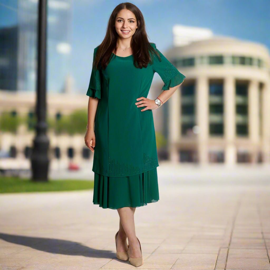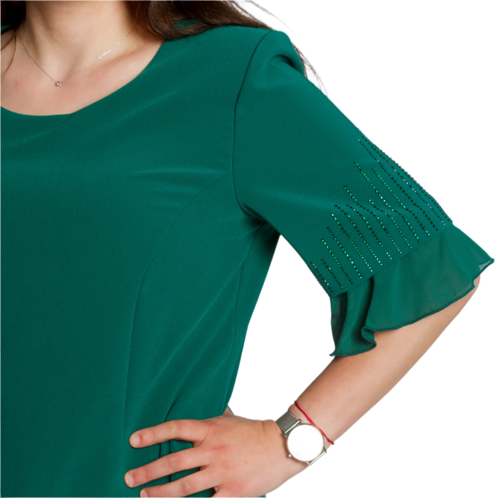 Această rochie elegantă verde, cu șifon vaporos, este soluția perfectă pentru ocazii speciale. Modelul are o croială dreaptă și confortabilă, care oferă libertate de mișcare și acoperă delicat zonele corpului. Stratul superior este finisat cu o decorațiune fină cu pietre mici, iar cel inferior este confecționat din șifon ușor pentru un efect frumos în două straturi. Mânecile au aceeași decorațiune și se termină cu un volan delicat care conferă un aspect romantic.