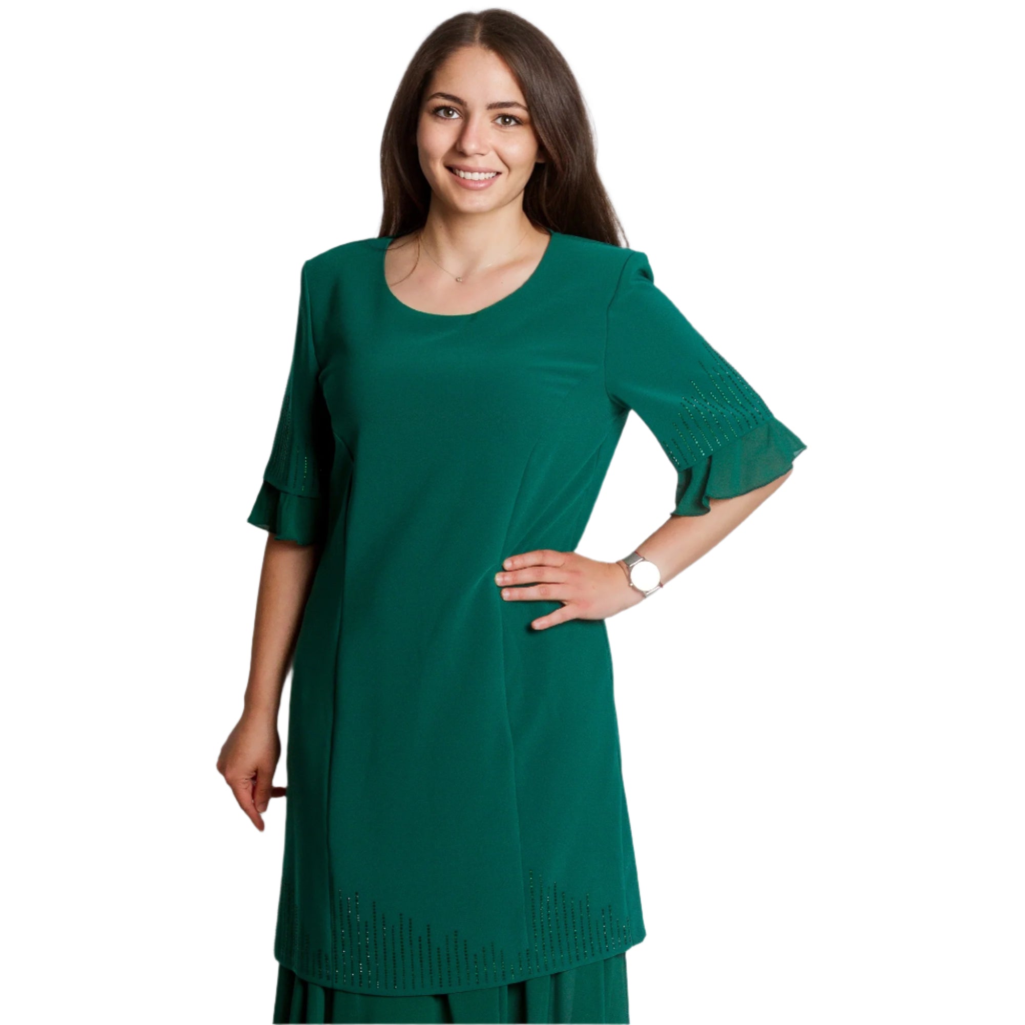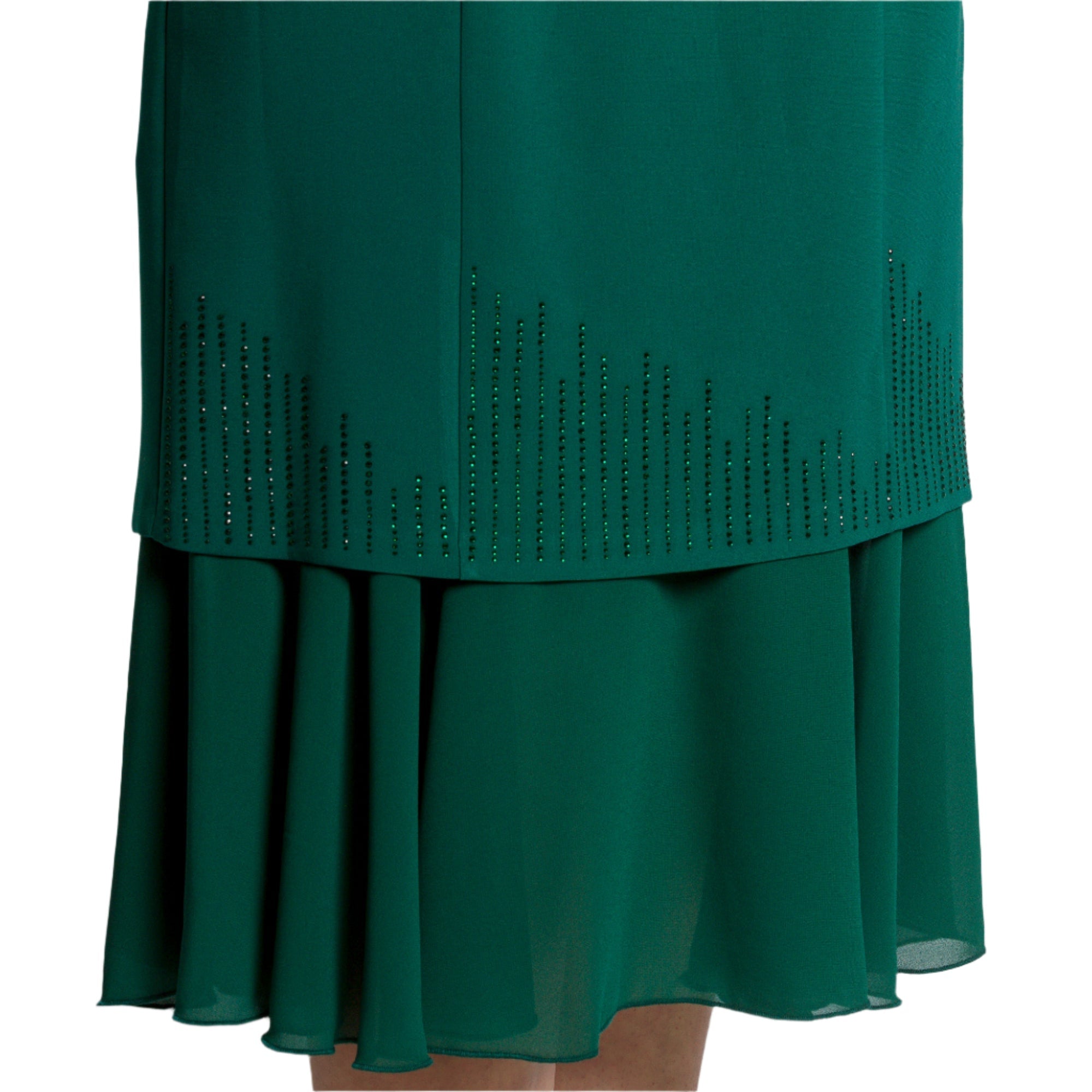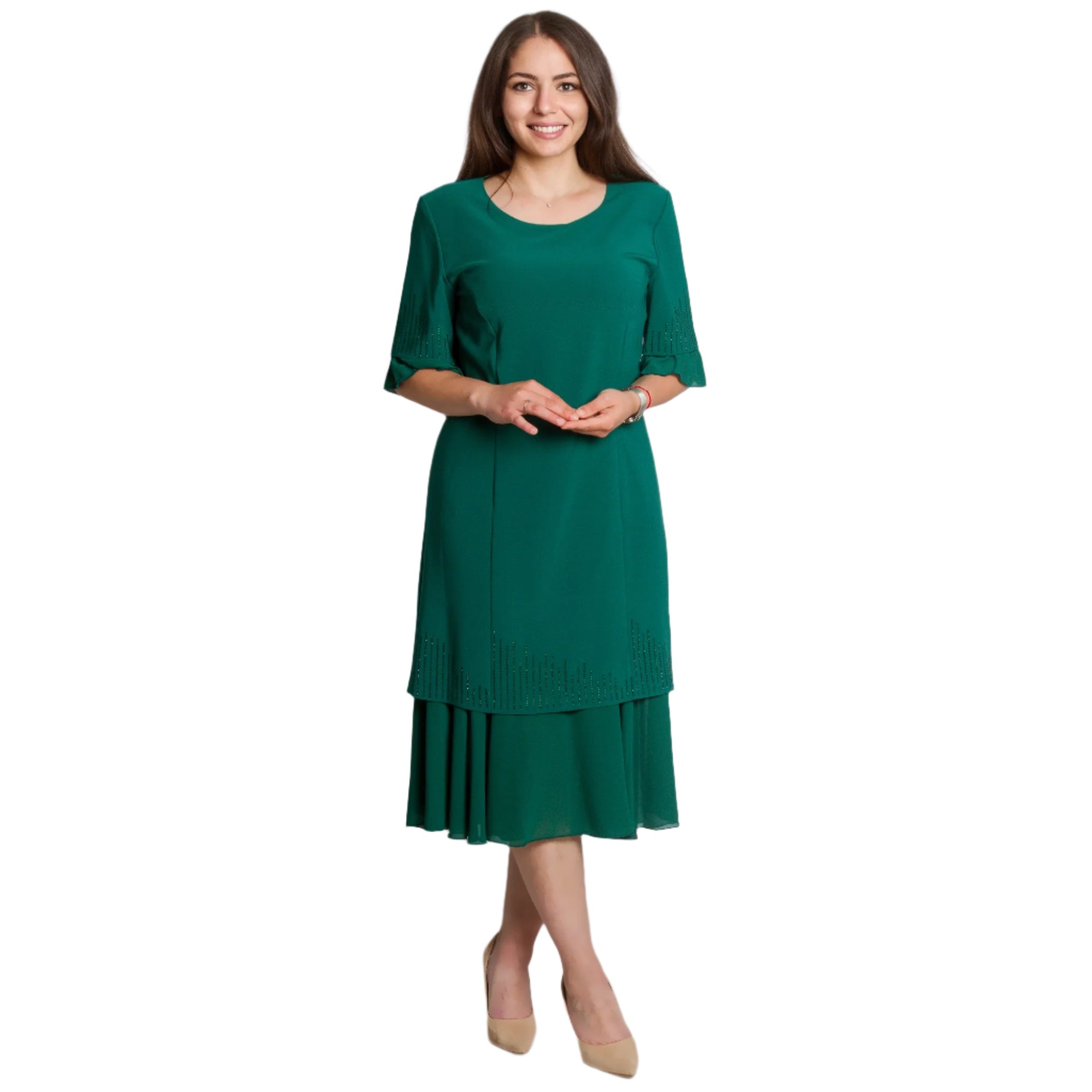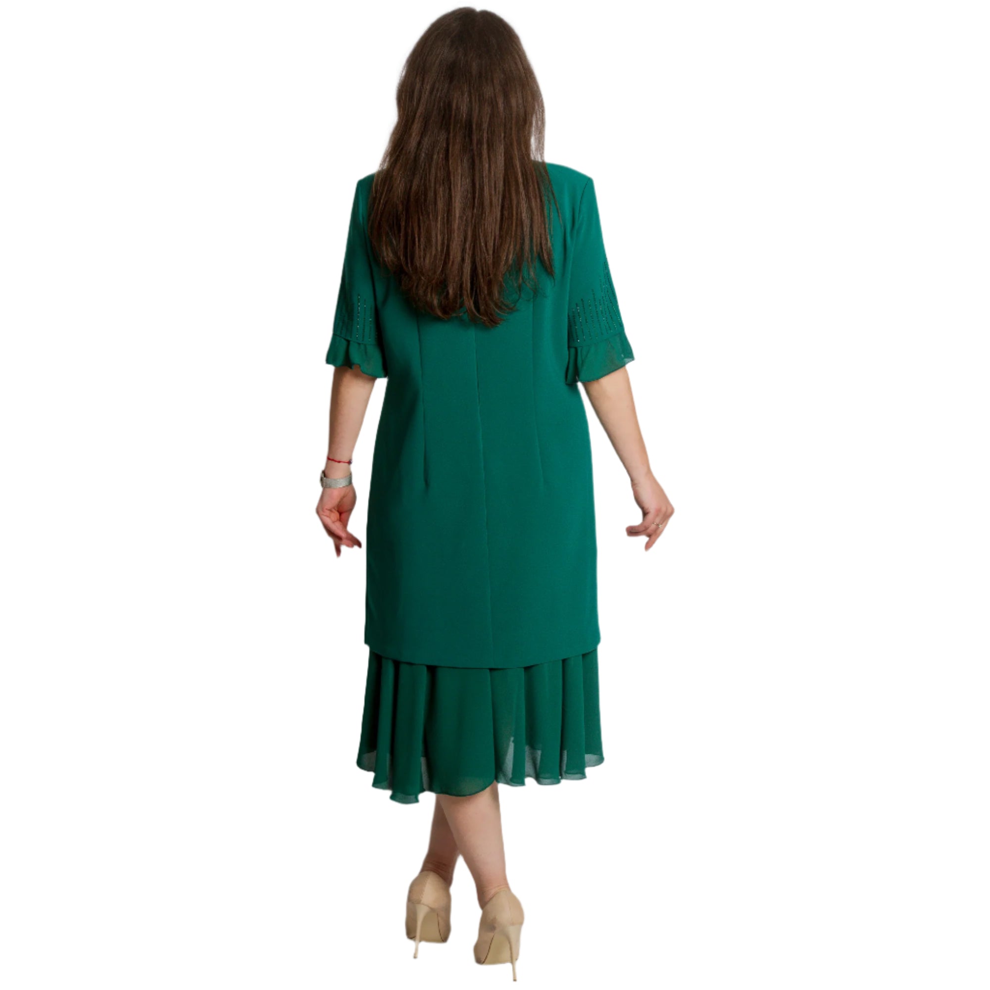 Această rochie elegantă verde, cu șifon vaporos, este soluția perfectă pentru ocazii speciale. Modelul are o croială dreaptă și confortabilă, care oferă libertate de mișcare și acoperă delicat zonele corpului. Stratul superior este finisat cu o decorațiune fină cu pietre mici, iar cel inferior este confecționat din șifon ușor pentru un efect frumos în două straturi. Mânecile au aceeași decorațiune și se termină cu un volan delicat care conferă un aspect romantic.