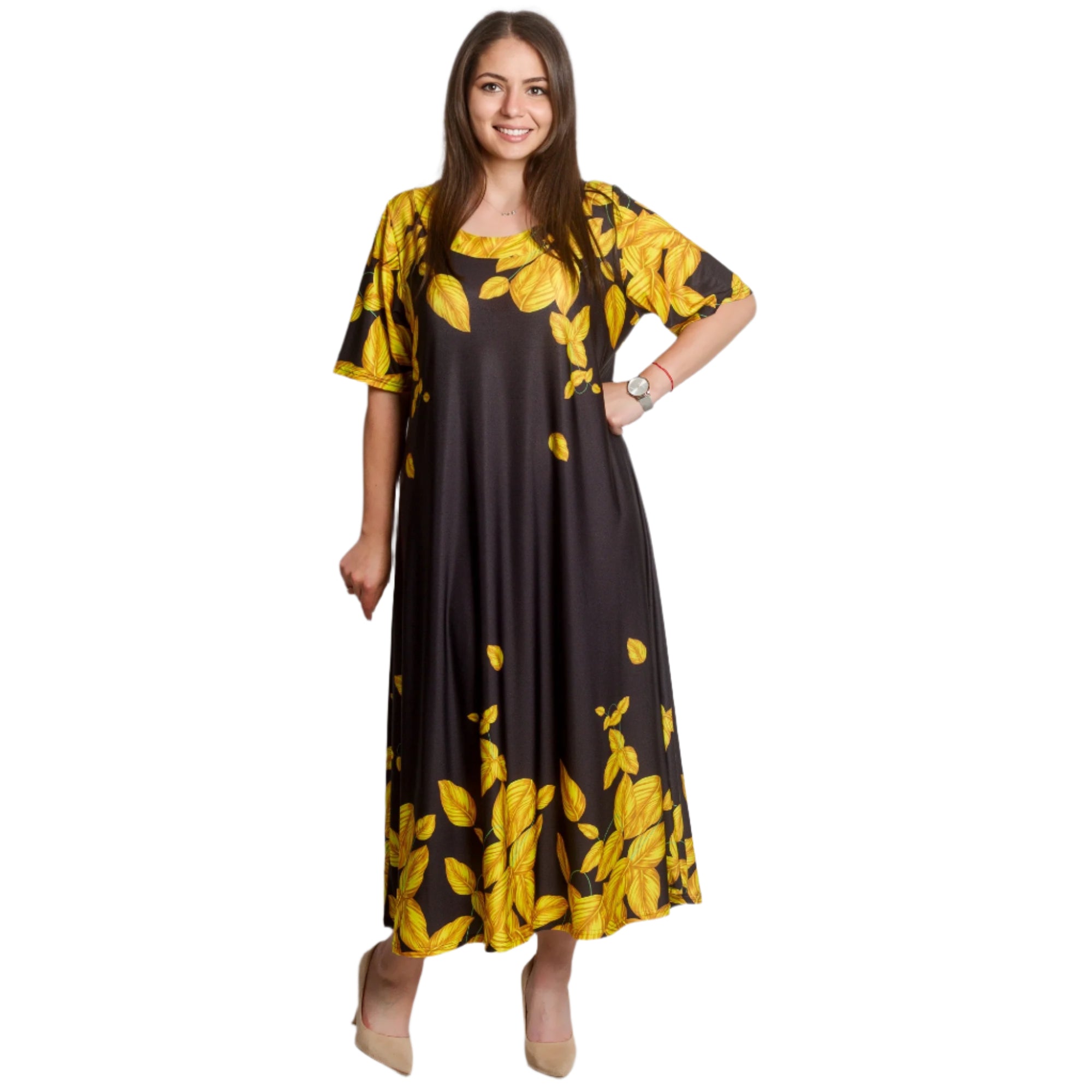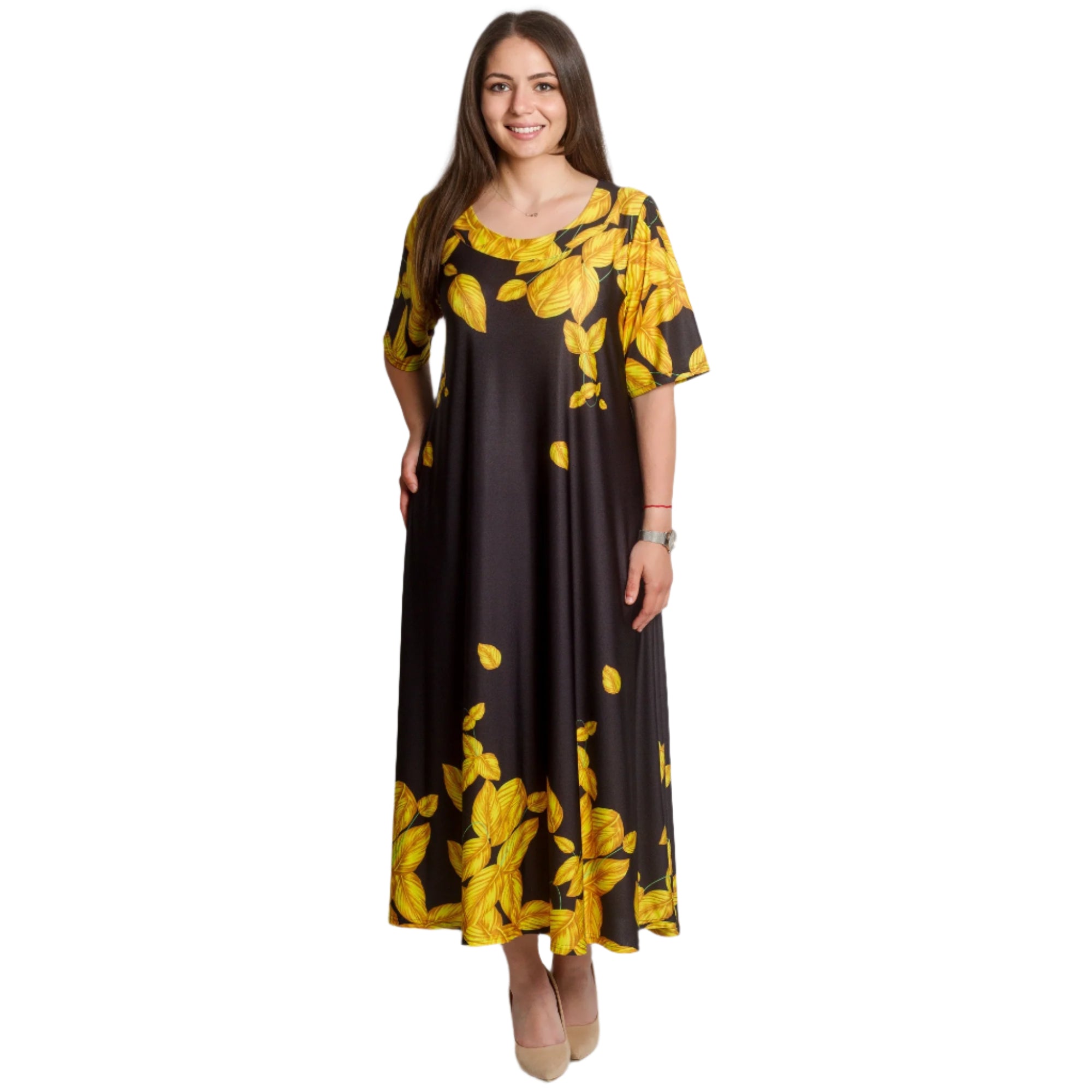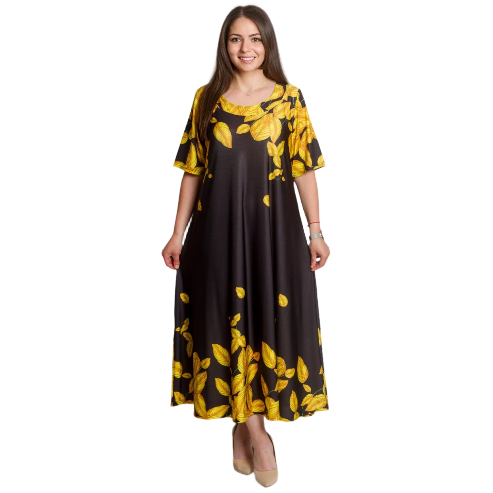 Pune-ți în valoare stilul cu această rochie lungă neagră, în mărimi mari, decorată cu frunze galbene spectaculoase. Croiul lejer și materialul ușor, elastic, oferă confort maxim, în timp ce decolteul rotund și mânecile scurte adaugă o notă de eleganță. Modelul este potrivit atât pentru viața de zi cu zi, cât și pentru ocaziile formale. O alegere perfectă pentru sezonul primăvară-vară, când cauți ceva proaspăt, confortabil și elegant.