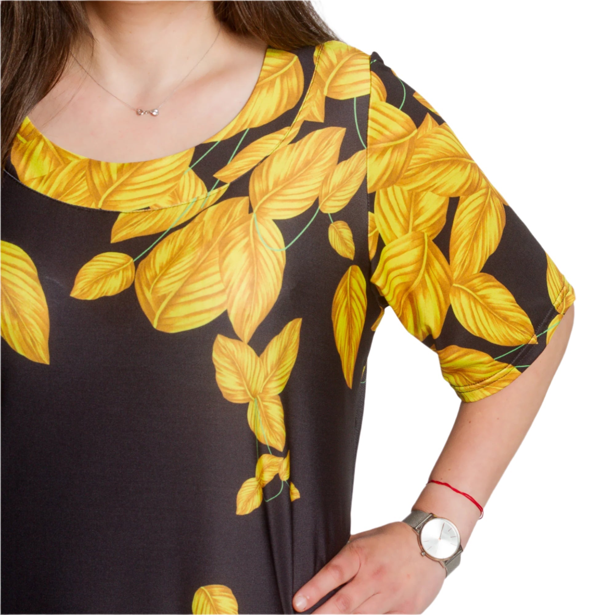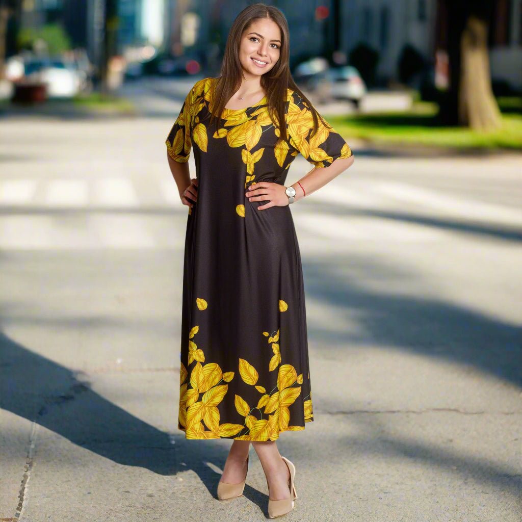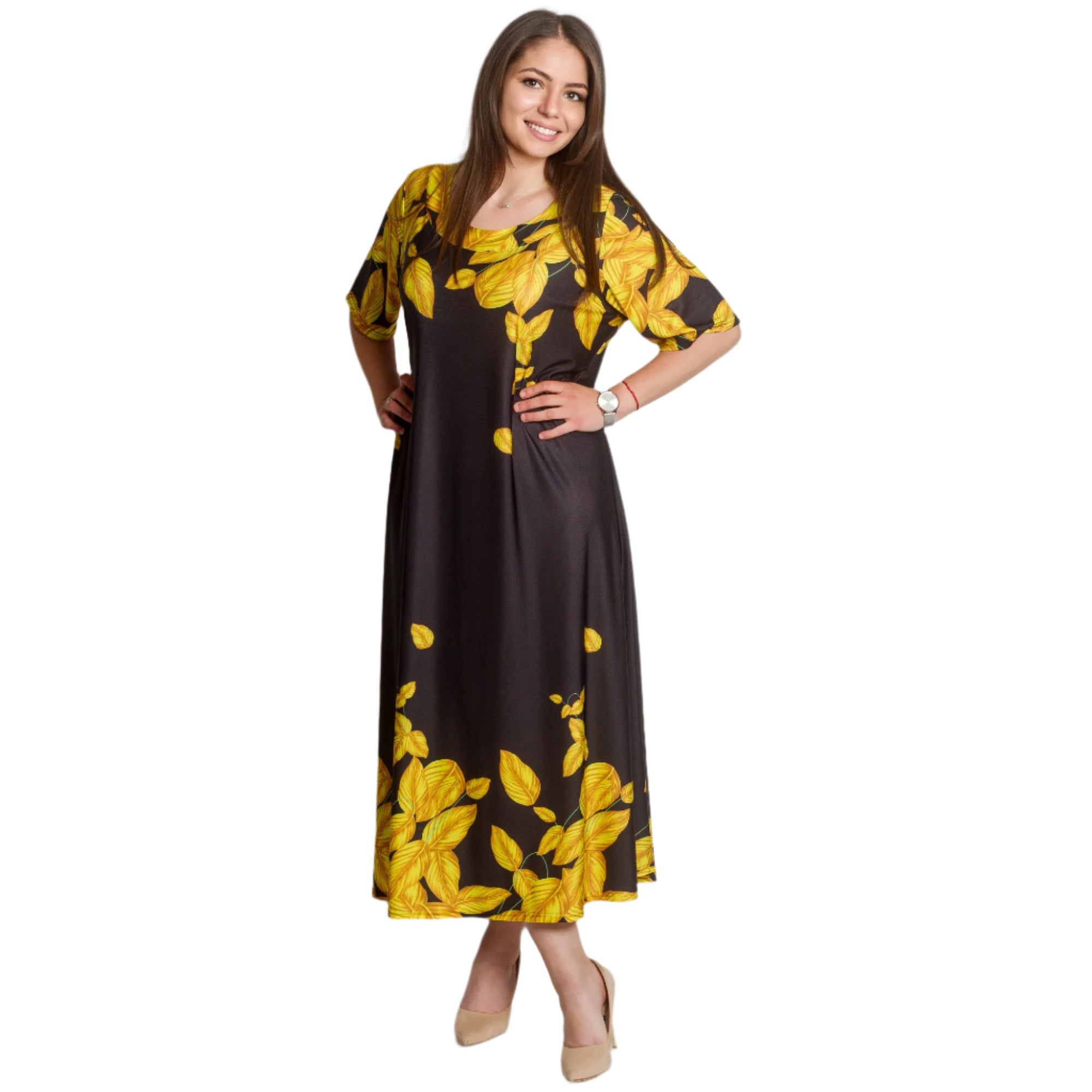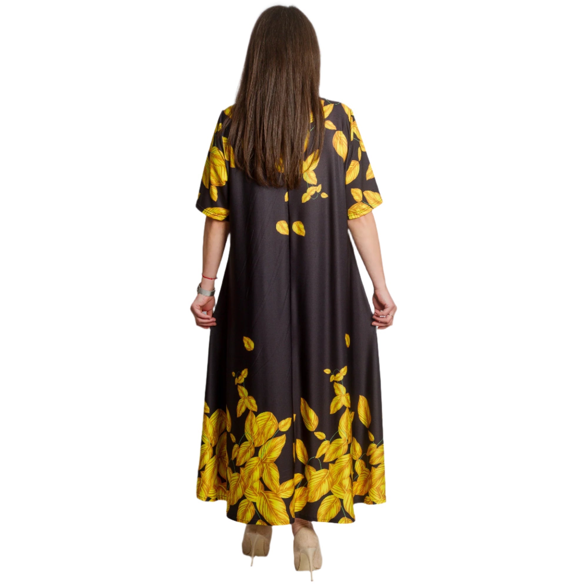 Pune-ți în valoare stilul cu această rochie lungă neagră, în mărimi mari, decorată cu frunze galbene spectaculoase. Croiul lejer și materialul ușor, elastic, oferă confort maxim, în timp ce decolteul rotund și mânecile scurte adaugă o notă de eleganță. Modelul este potrivit atât pentru viața de zi cu zi, cât și pentru ocaziile formale. O alegere perfectă pentru sezonul primăvară-vară, când cauți ceva proaspăt, confortabil și elegant.
