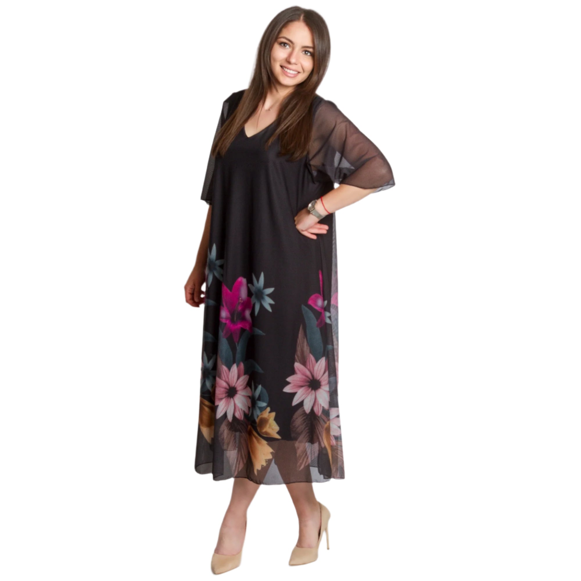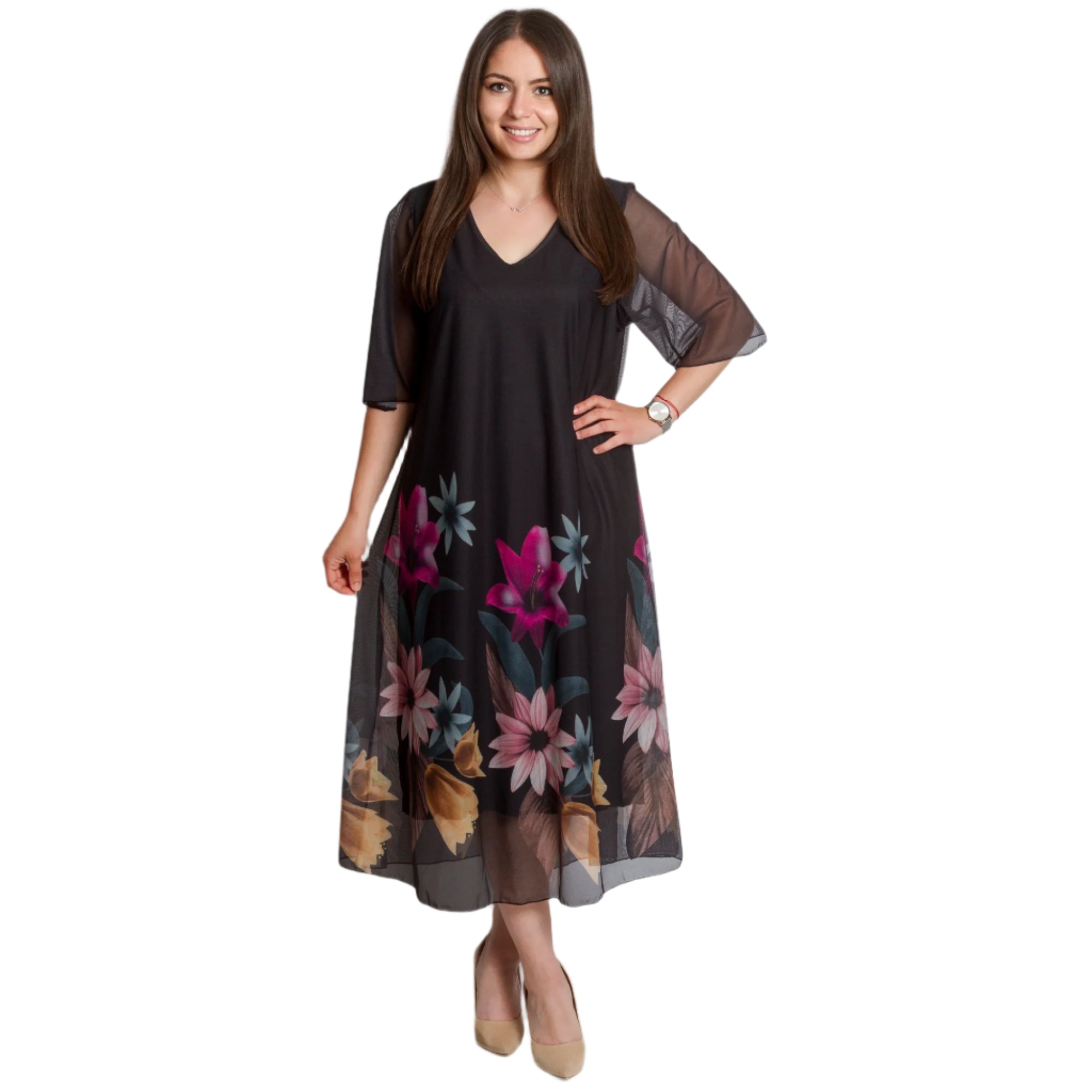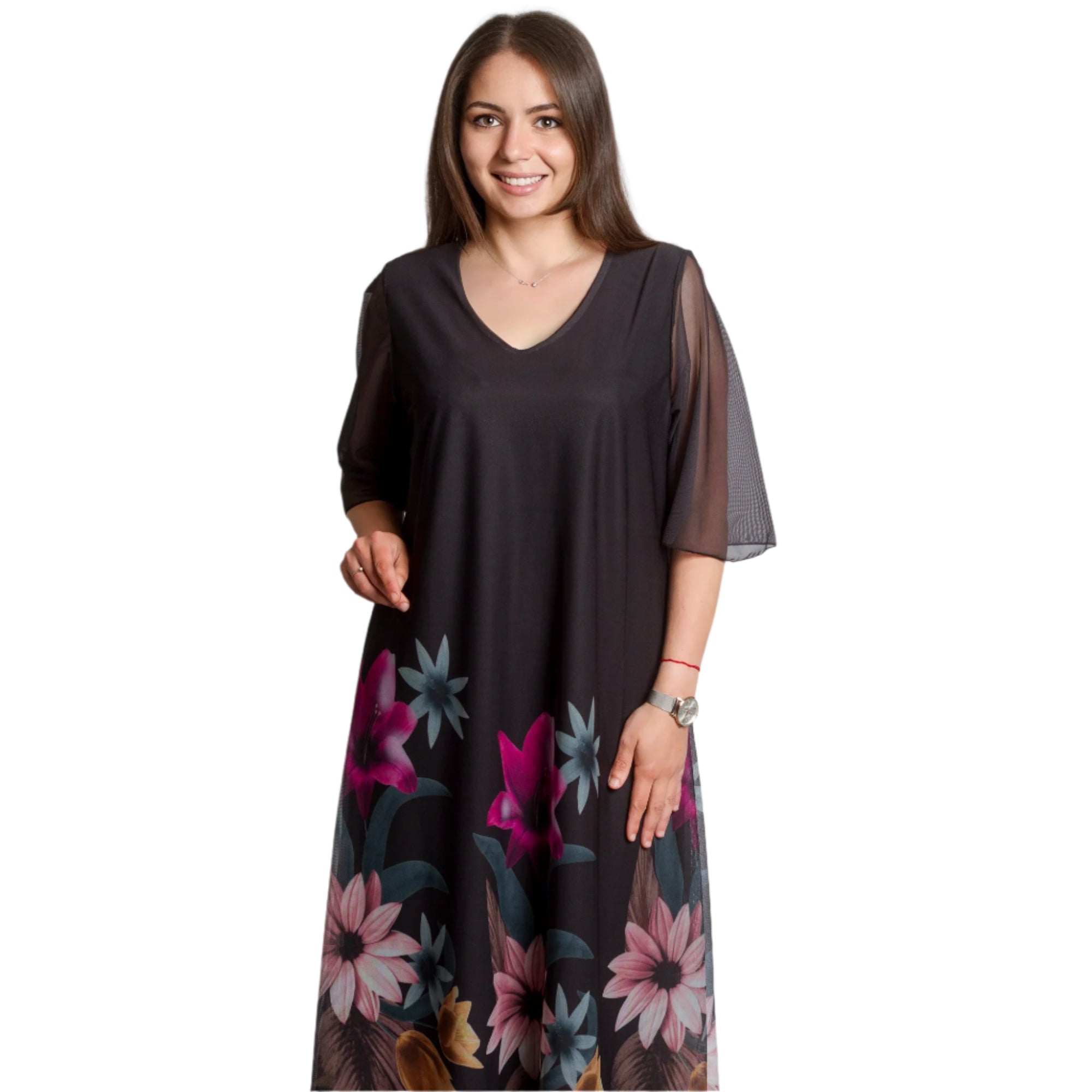 Alege eleganța clasică cu această rochie neagră din șifon cu model floral, concepută pentru femei plus-size. Modelul are o croială evazată și o linie lejeră ce combină confortul cu stilul sofisticat. Confecționată din material ușor de șifon cu elemente florale colorate în partea de jos și la mâneci, această rochie este ideală pentru ocazii formale. Căptușeala interioară din viscoză cu elastan oferă moliciune și flexibilitate în timpul mișcării. Imprimeul colorat în roz, bordo și galben pe fundal negru oferă un contrast spectaculos și un aspect memorabil.