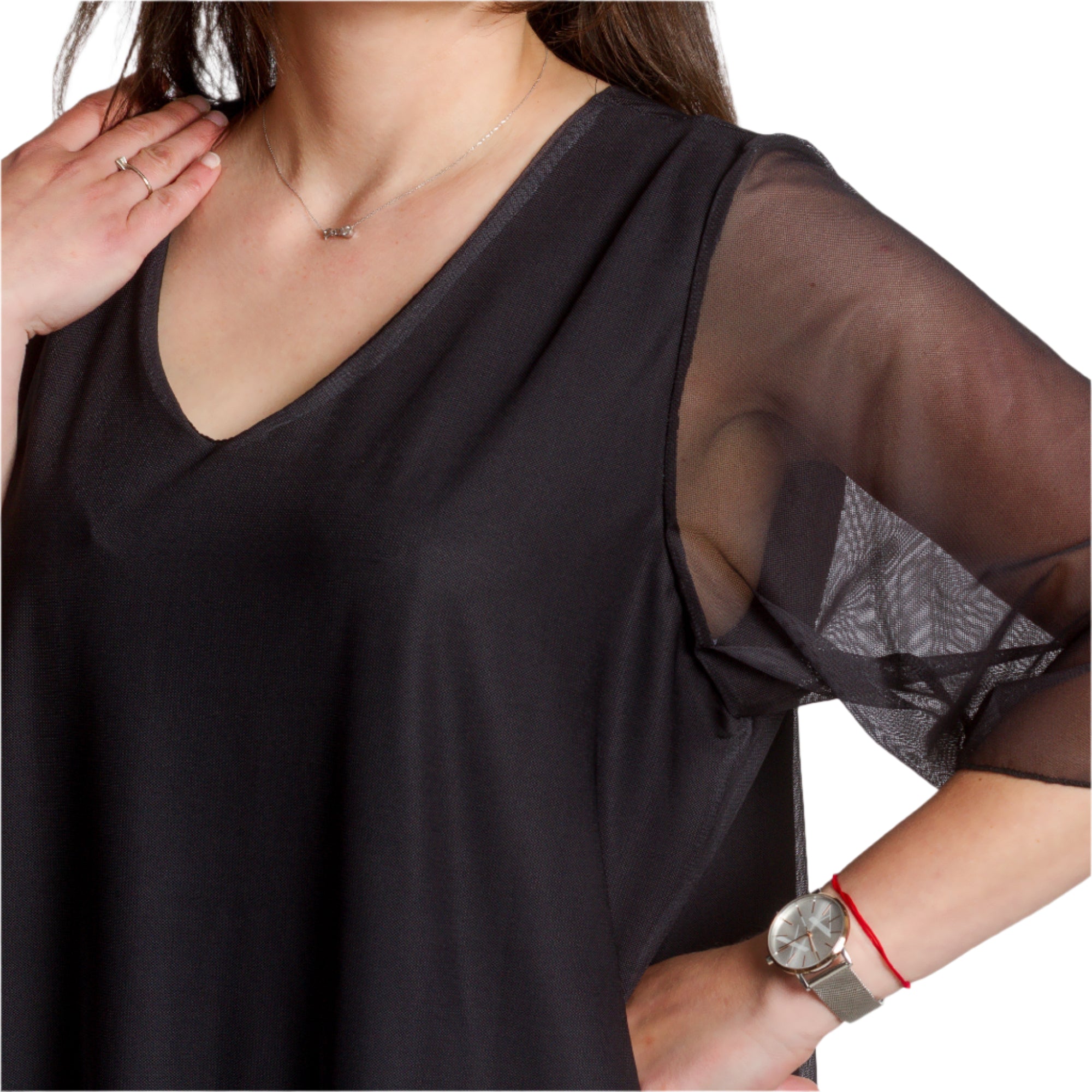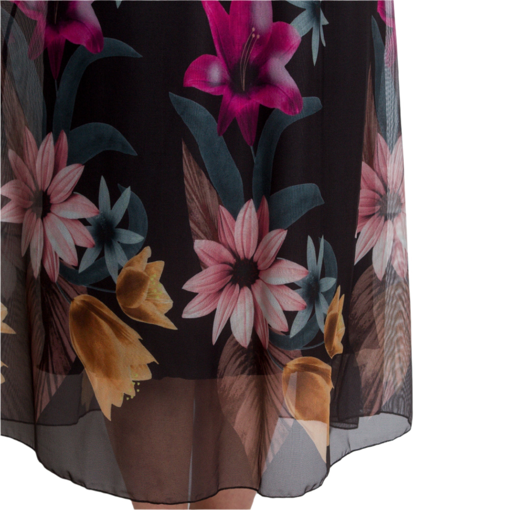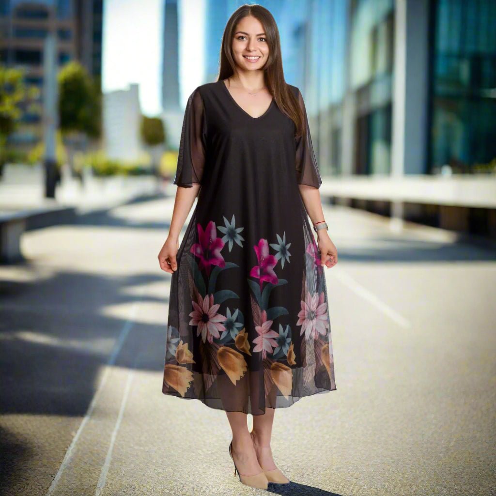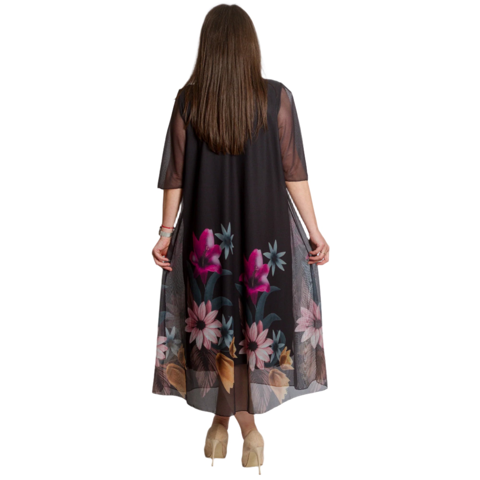 Alege eleganța clasică cu această rochie neagră din șifon cu model floral, concepută pentru femei plus-size. Modelul are o croială evazată și o linie lejeră ce combină confortul cu stilul sofisticat. Confecționată din material ușor de șifon cu elemente florale colorate în partea de jos și la mâneci, această rochie este ideală pentru ocazii formale. Căptușeala interioară din viscoză cu elastan oferă moliciune și flexibilitate în timpul mișcării. Imprimeul colorat în roz, bordo și galben pe fundal negru oferă un contrast spectaculos și un aspect memorabil.