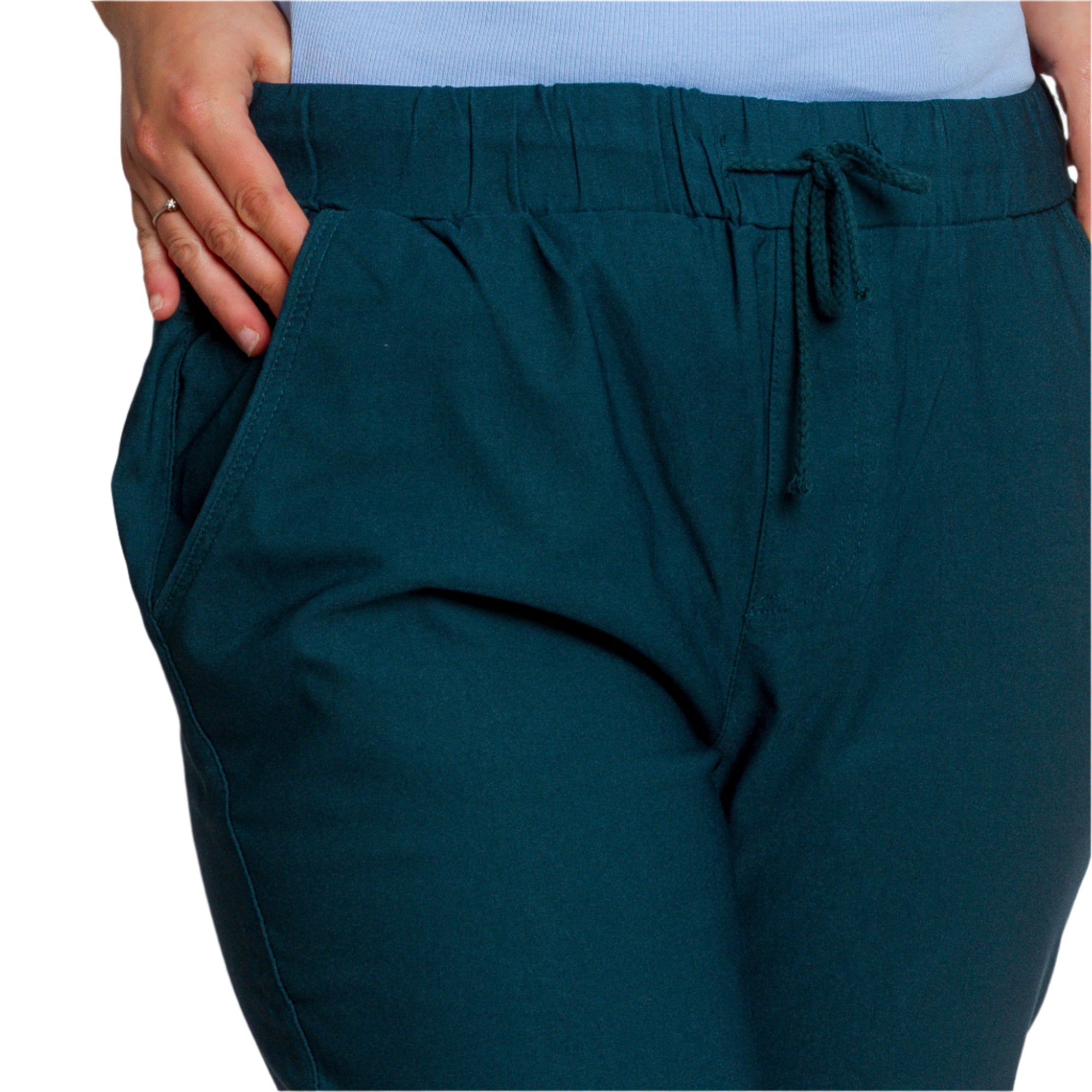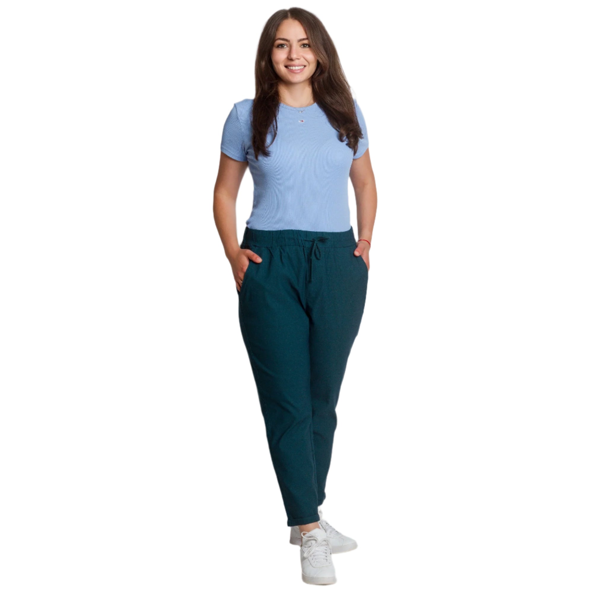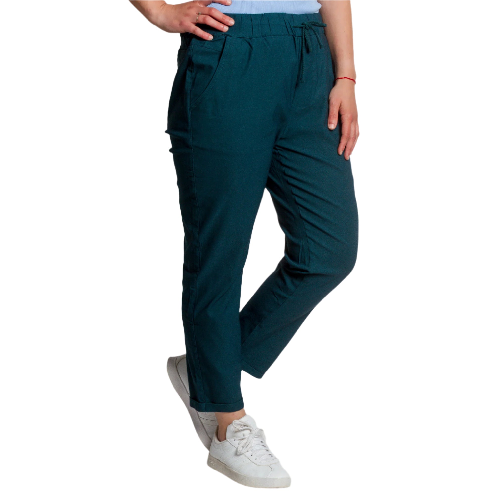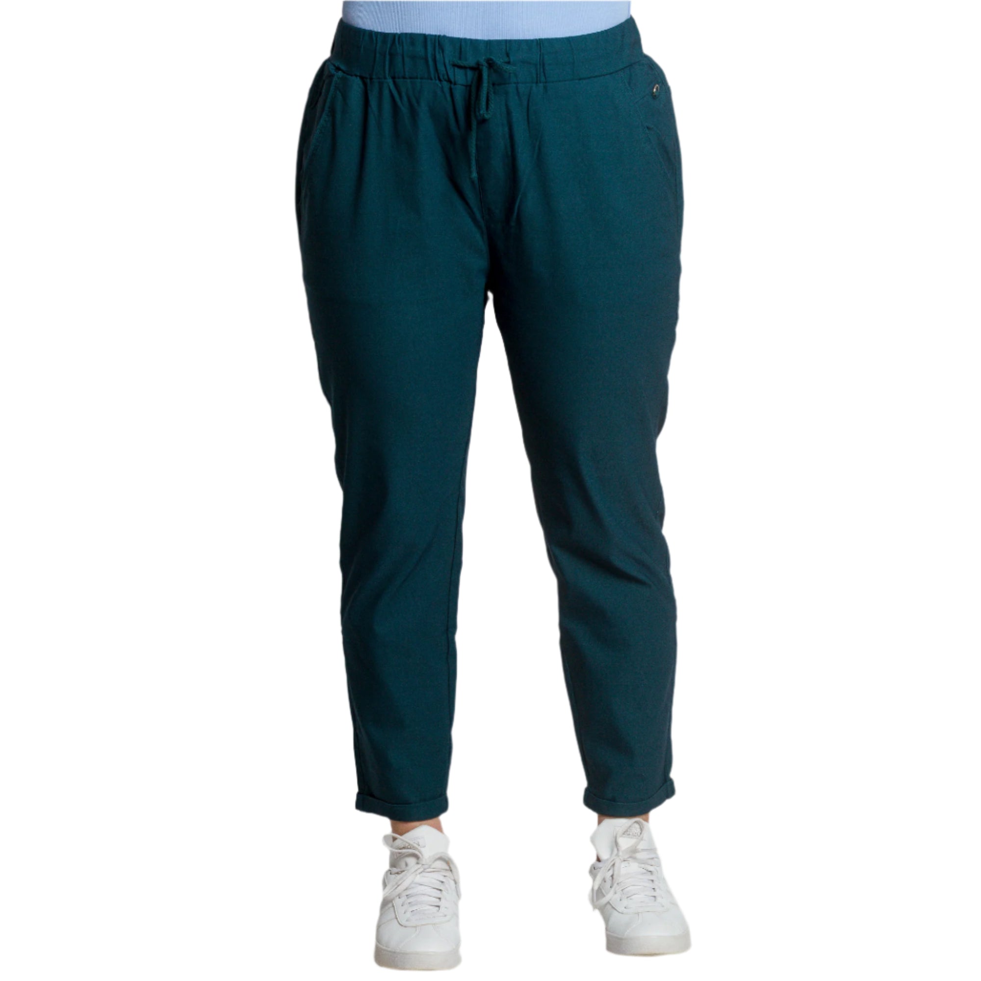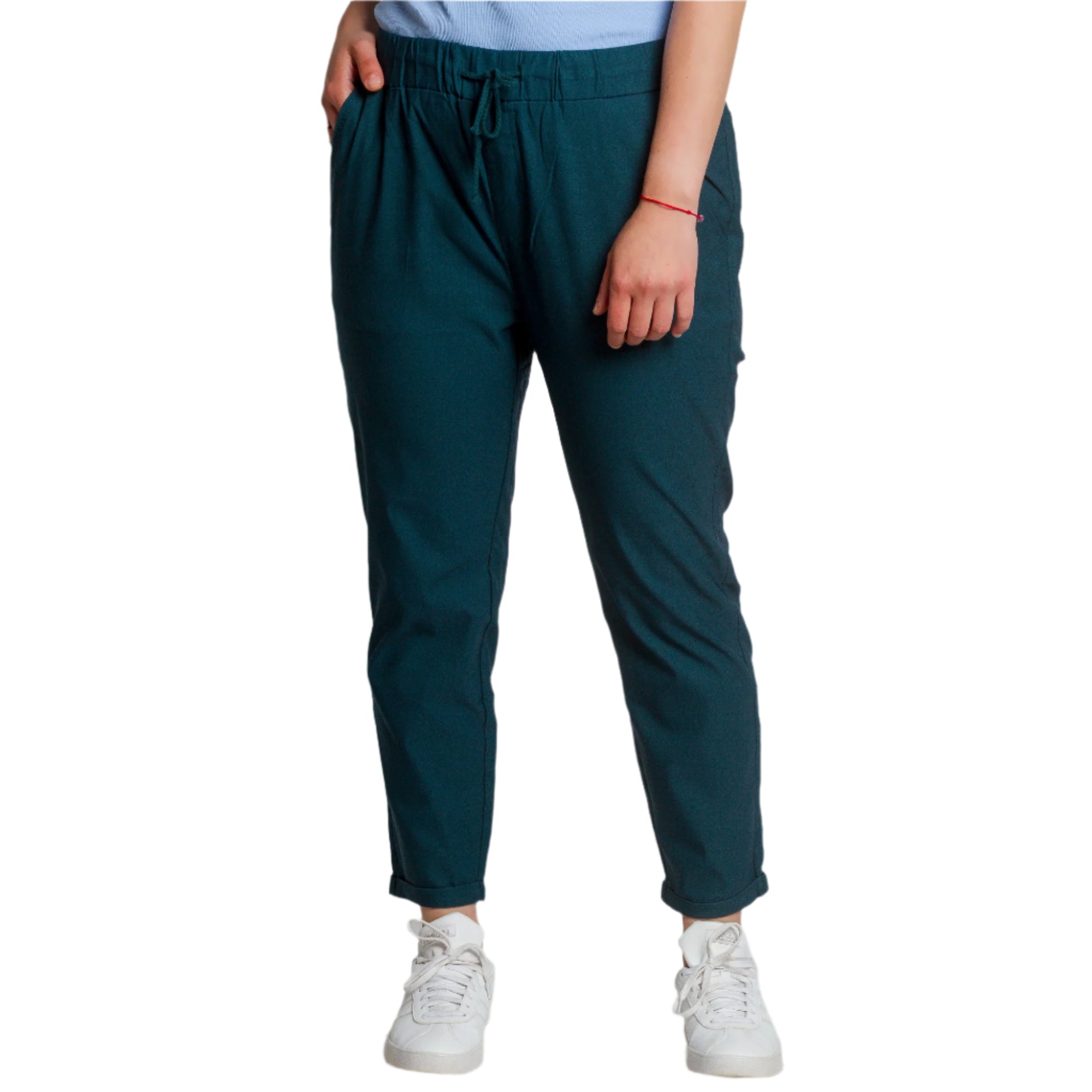Pantaloni maxi eleganți și confortabili, de culoare verde închis. Fabricați din 70% viscoză, 25% poliamidă și 5% elastan. Pantalonii au talie înaltă, elastic cu legături și buzunare funcționale.