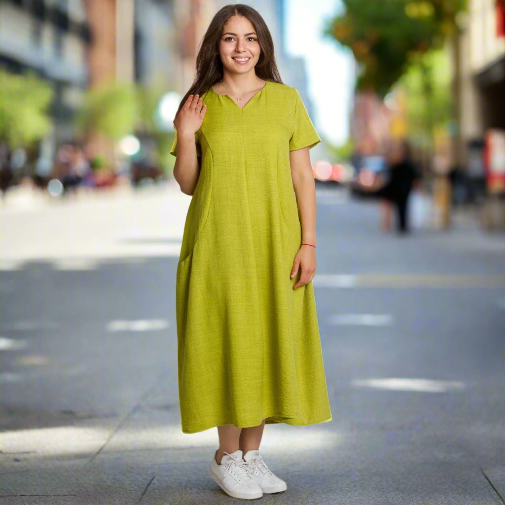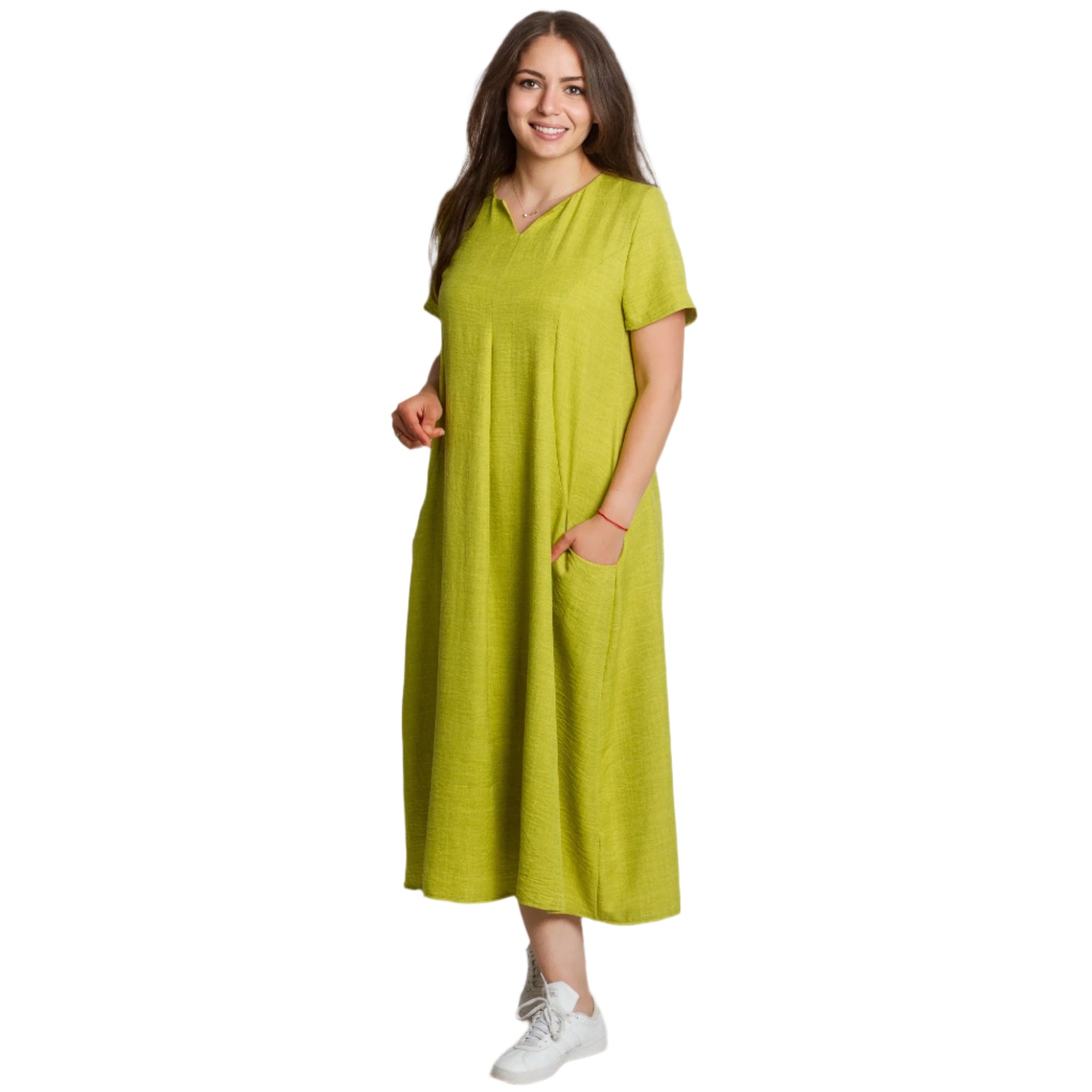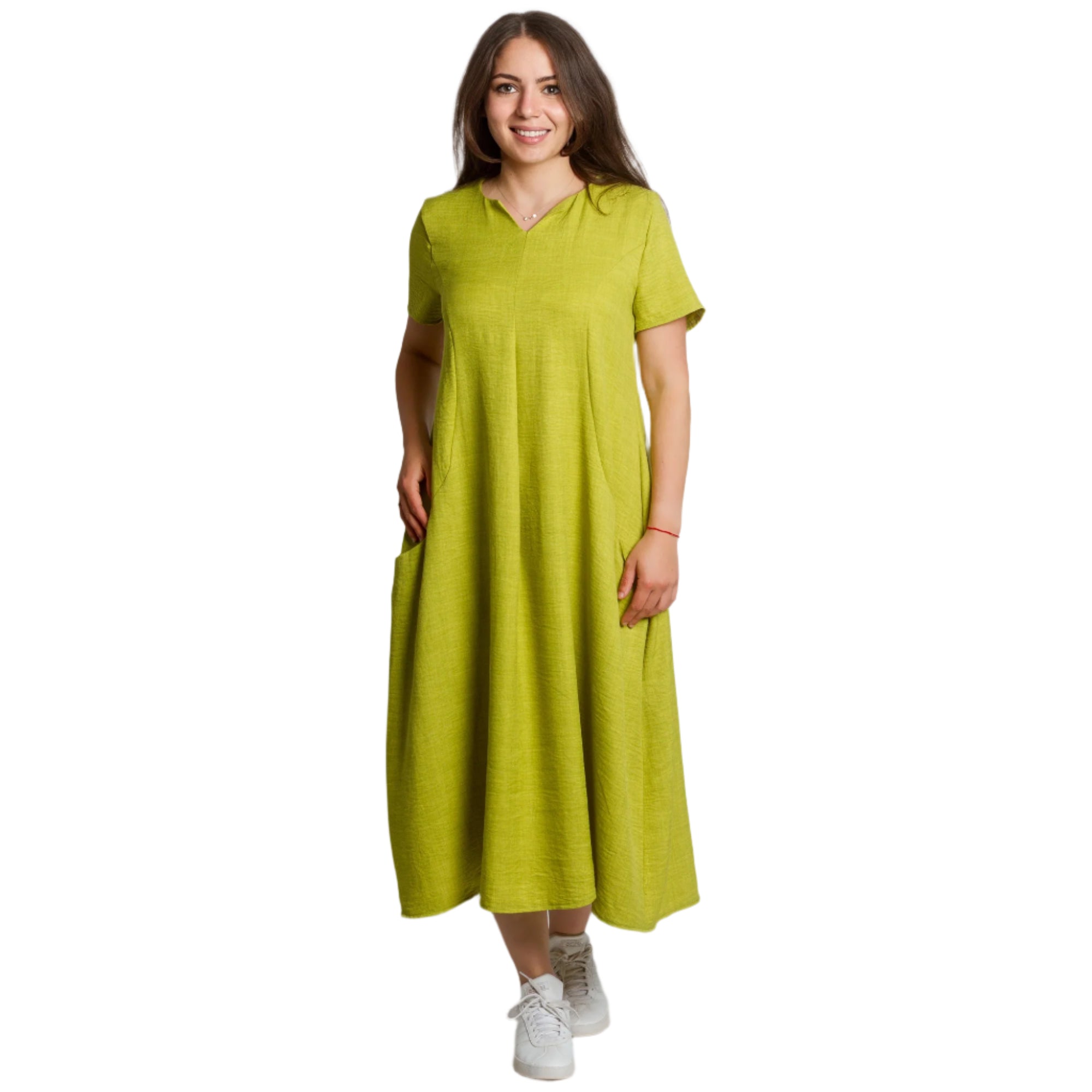 Proaspătă și modernă, această rochie verde lime este alegerea perfectă pentru zilele însorite. Confecționată din in natural cu adaos de poliester, este ușoară, confortabilă și ideală pentru sezonul primăvară-vară. Croiul evazat și decolteul în V accentuează feminitatea, în timp ce buzunarele practice adaugă confort și stil casual. Modelul are mâneci scurte și o linie lejeră, potrivită pentru orice ocazie - de la plimbările de zi cu zi până la întâlnirile cu prietenii.