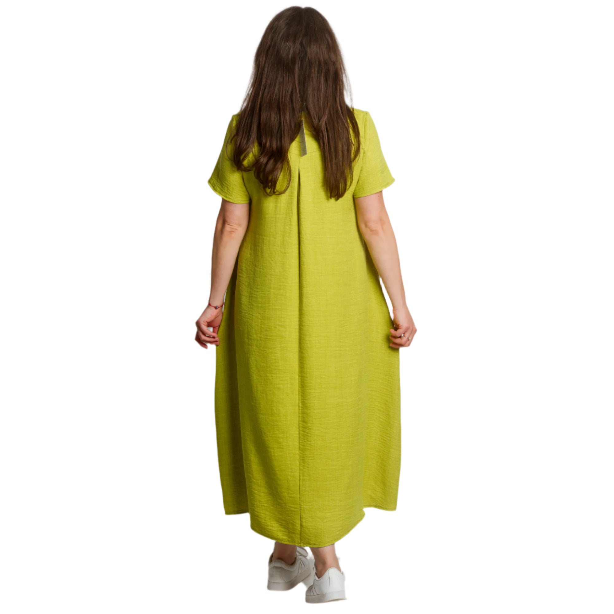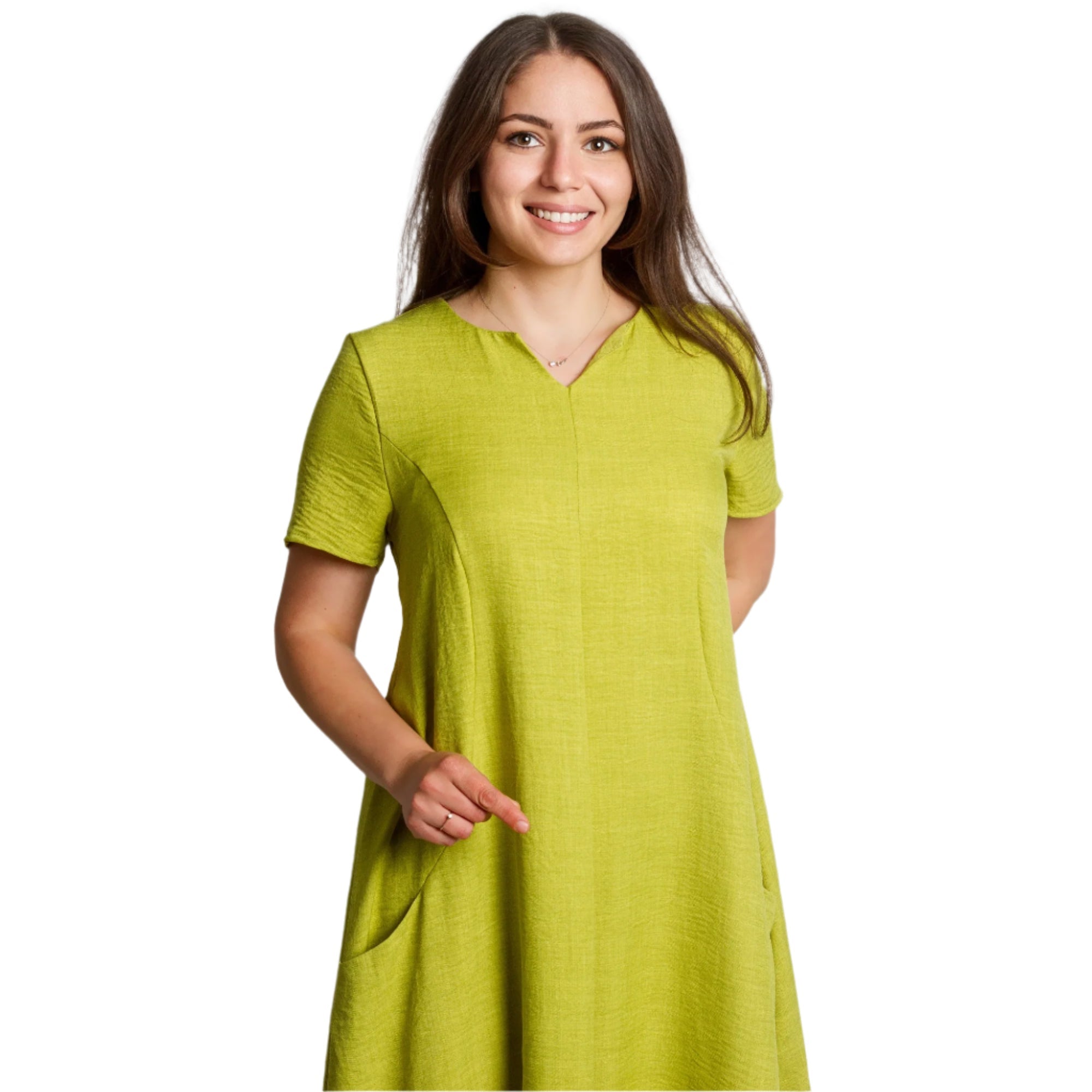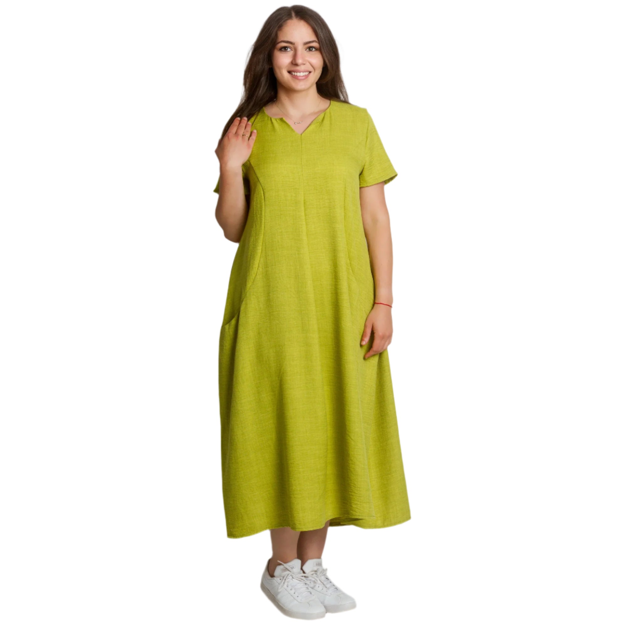 Proaspătă și modernă, această rochie verde lime este alegerea perfectă pentru zilele însorite. Confecționată din in natural cu adaos de poliester, este ușoară, confortabilă și ideală pentru sezonul primăvară-vară. Croiul evazat și decolteul în V accentuează feminitatea, în timp ce buzunarele practice adaugă confort și stil casual. Modelul are mâneci scurte și o linie lejeră, potrivită pentru orice ocazie - de la plimbările de zi cu zi până la întâlnirile cu prietenii.