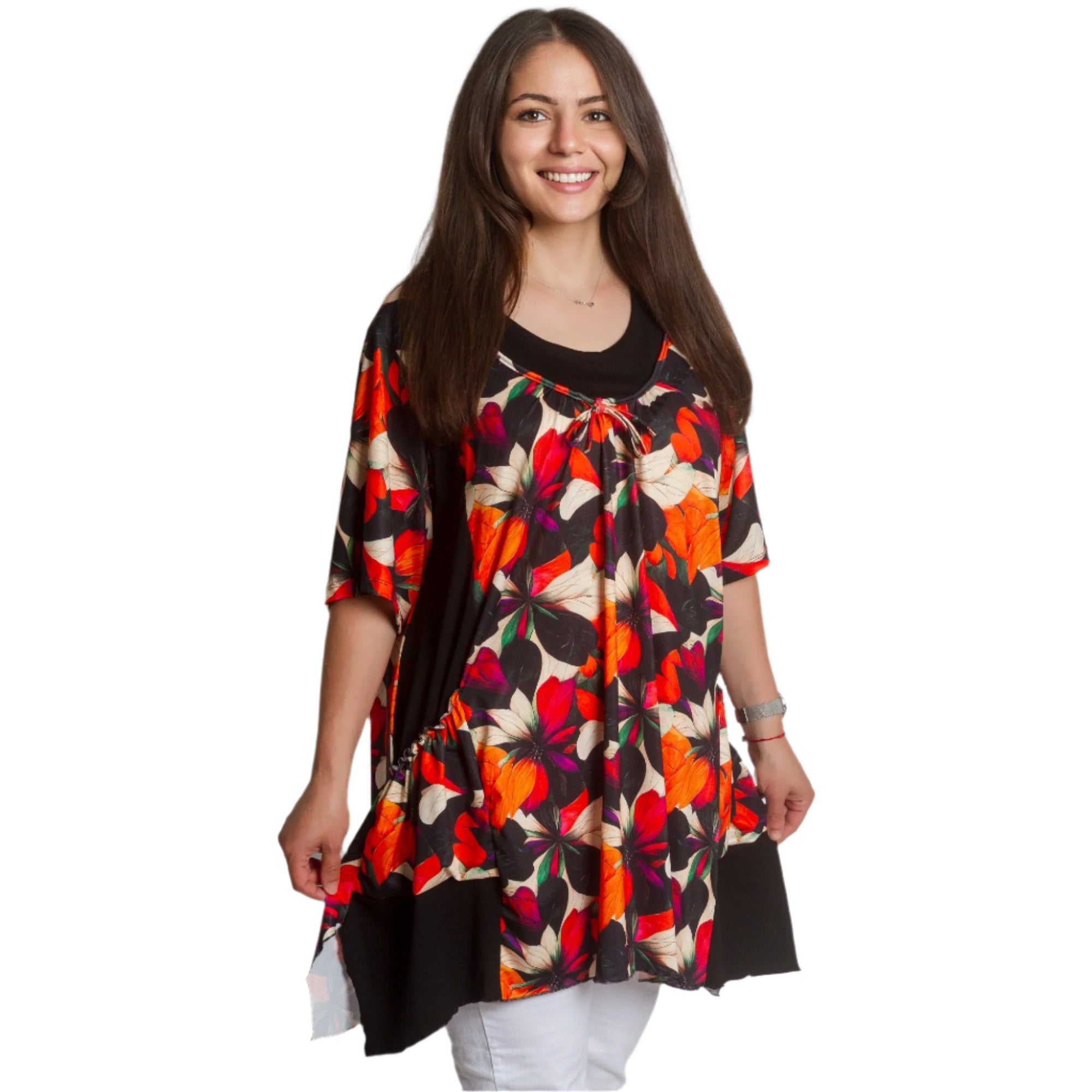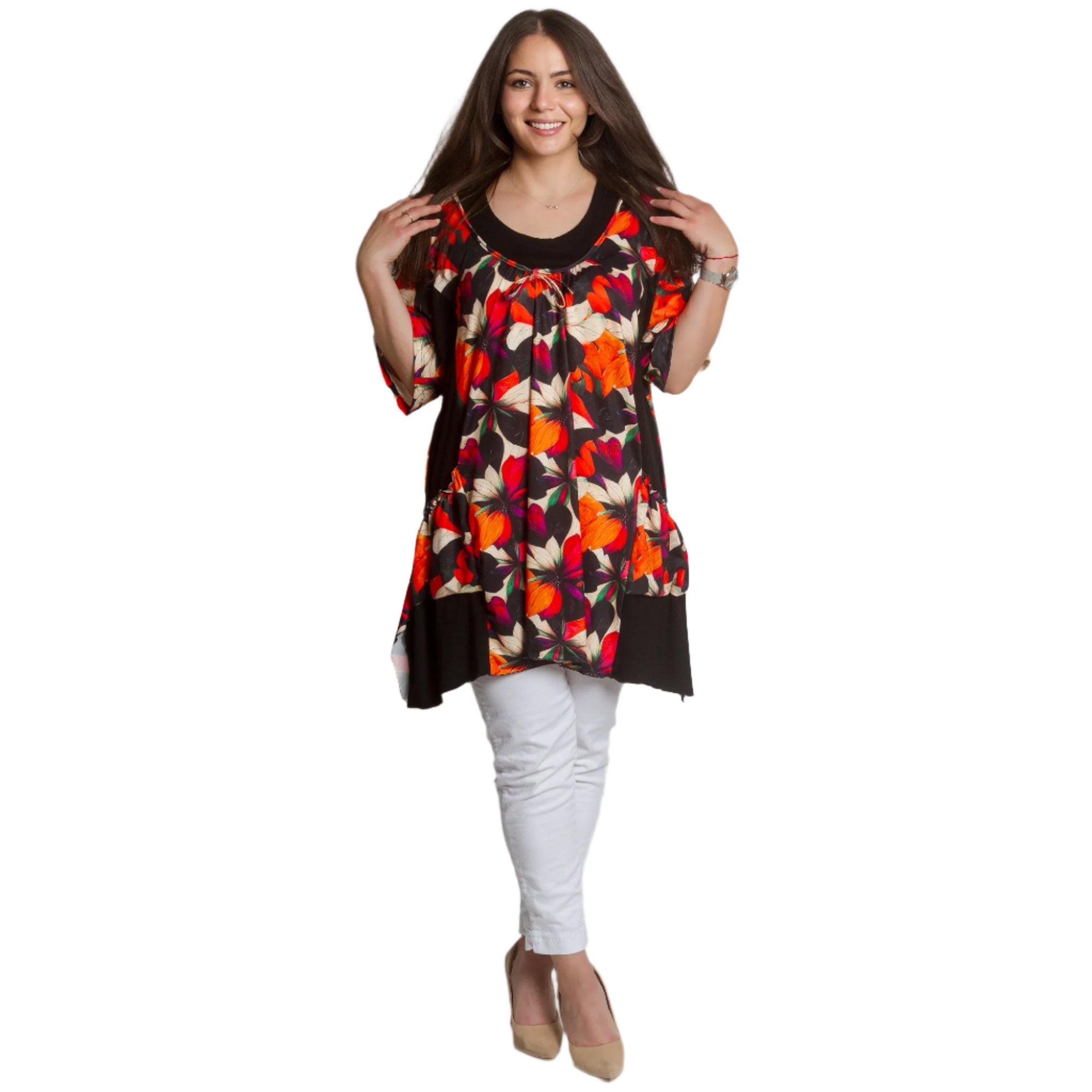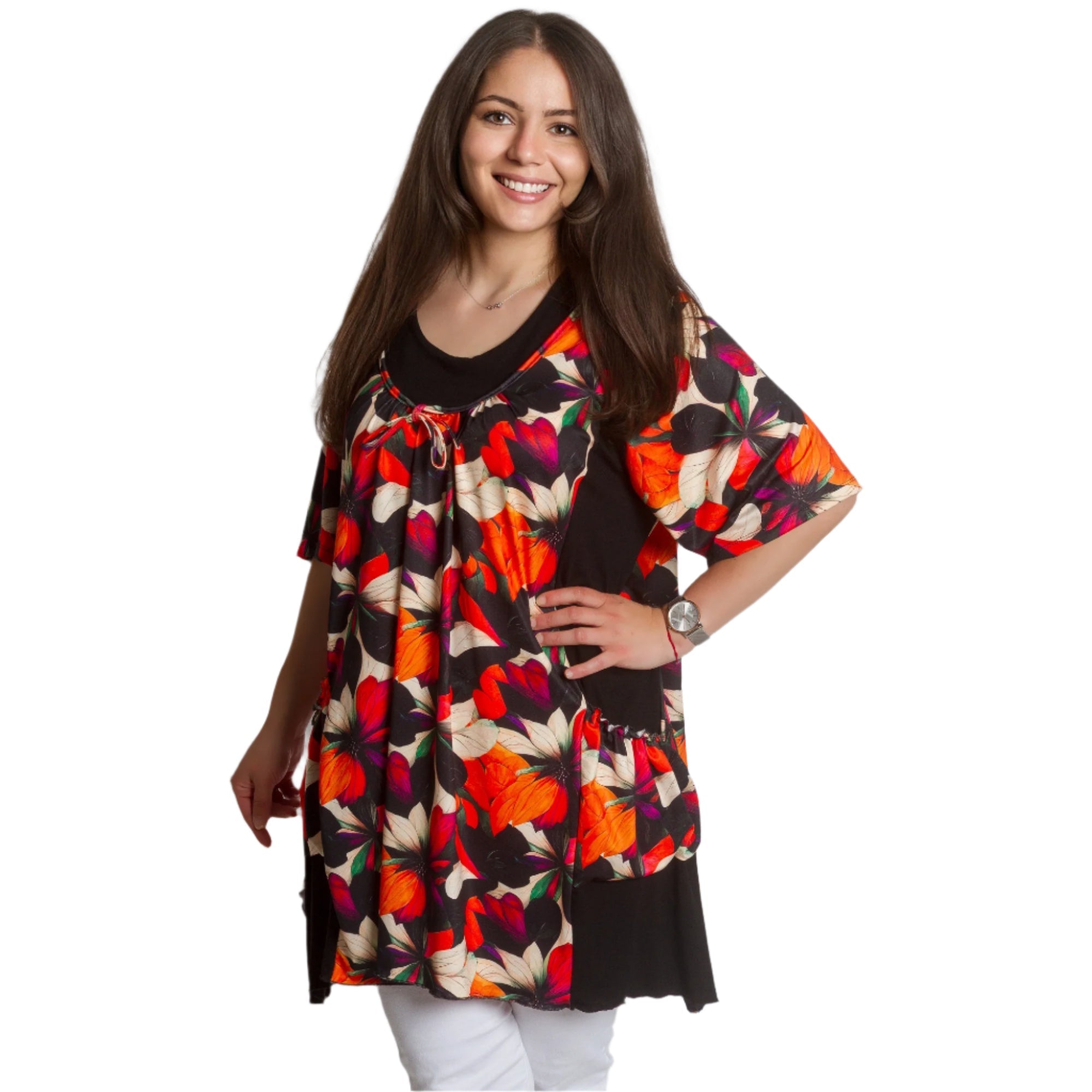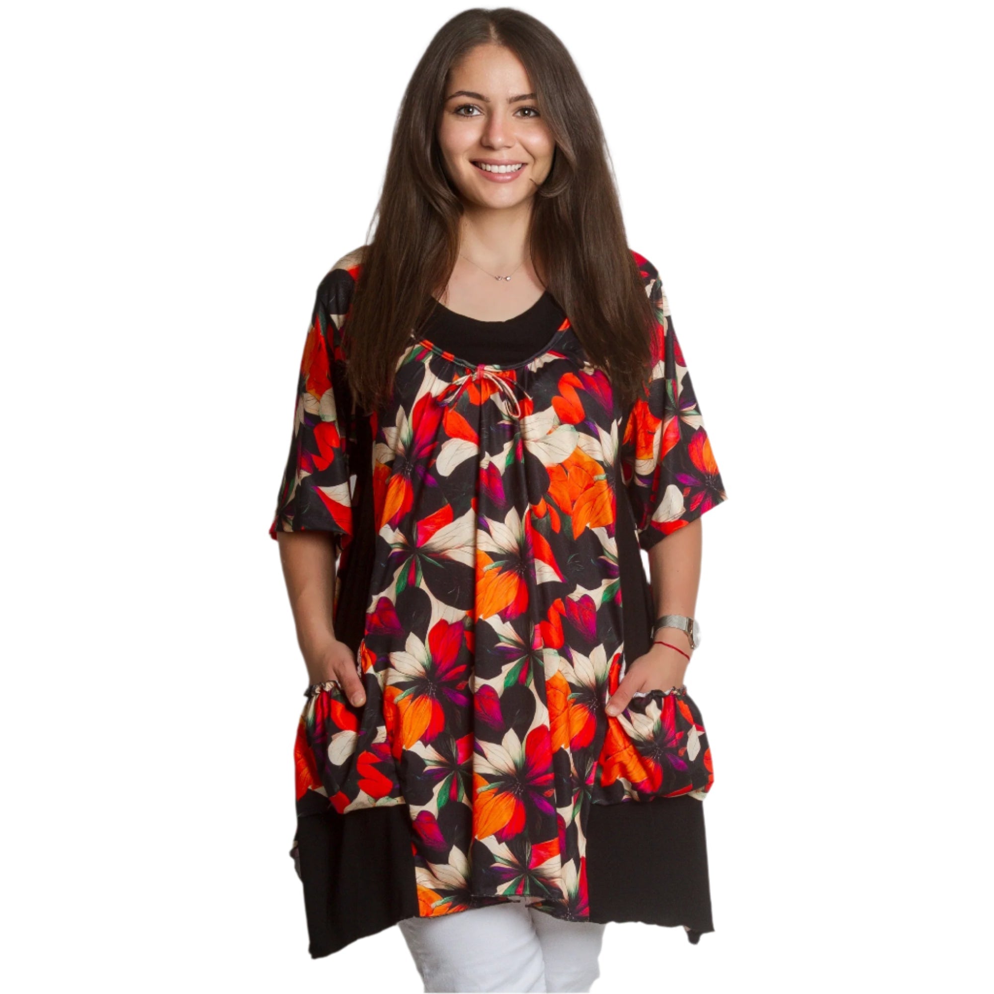 Adaugă culoare și atmosferă garderobei tale cu această tunică impresionantă pentru mărimi mari. Designul său combină motive florale bogate în portocaliu, violet și alb pe un fundal negru, care creează un aspect spectaculos. Croiul evazat și buzunarele laterale oferă confort și practicitate, iar legăturile de la decolteu completează stilul. Tunica este potrivită atât pentru plimbările de zi cu zi, cât și pentru evenimente mai elegante.