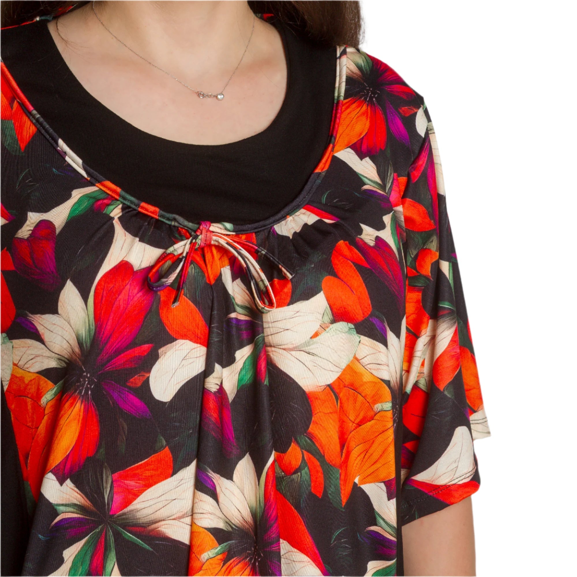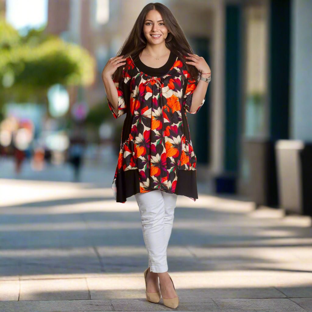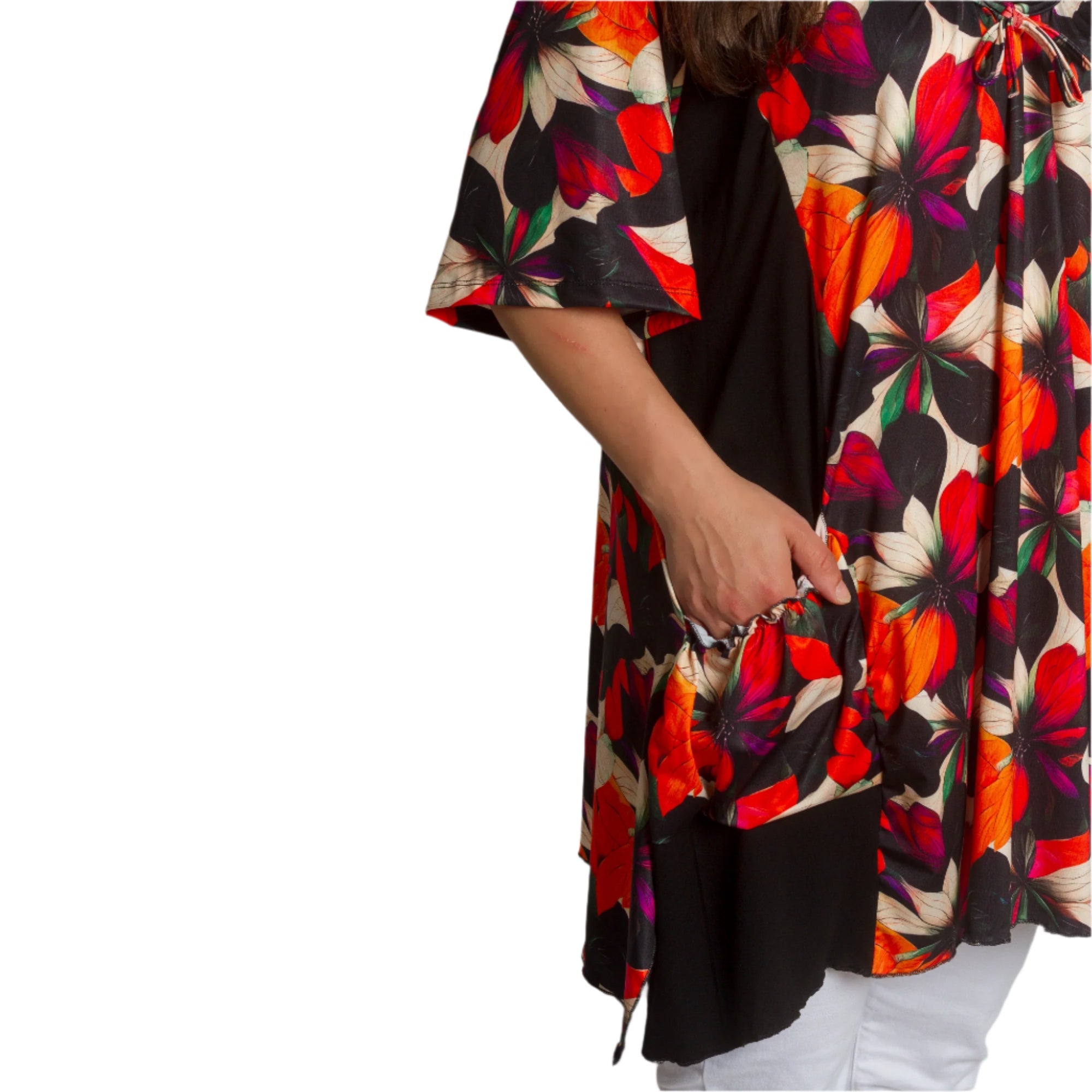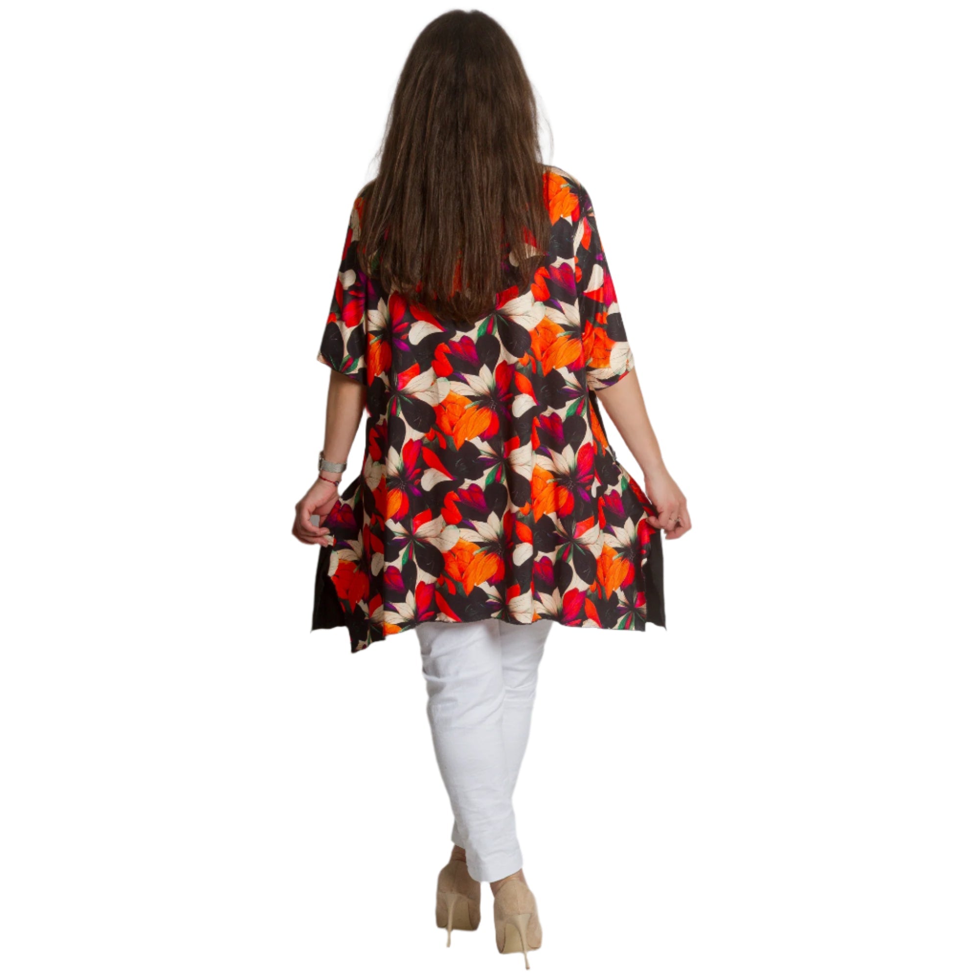 Adaugă culoare și atmosferă garderobei tale cu această tunică impresionantă pentru mărimi mari. Designul său combină motive florale bogate în portocaliu, violet și alb pe un fundal negru, care creează un aspect spectaculos. Croiul evazat și buzunarele laterale oferă confort și practicitate, iar legăturile de la decolteu completează stilul. Tunica este potrivită atât pentru plimbările de zi cu zi, cât și pentru evenimente mai elegante.
