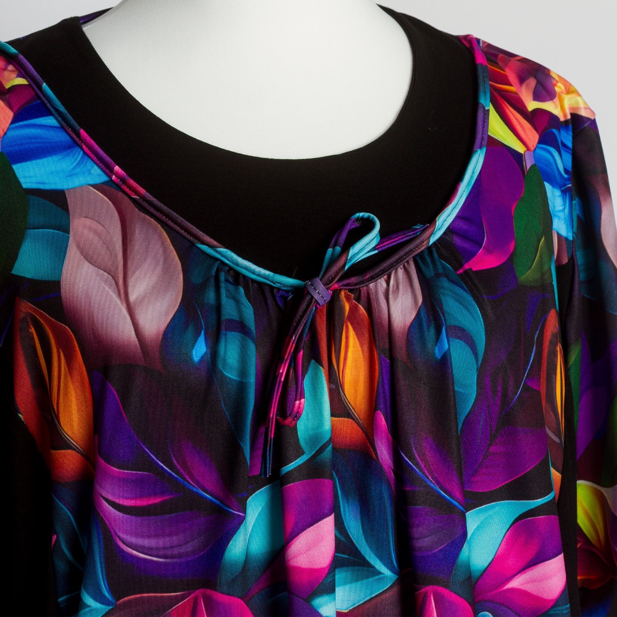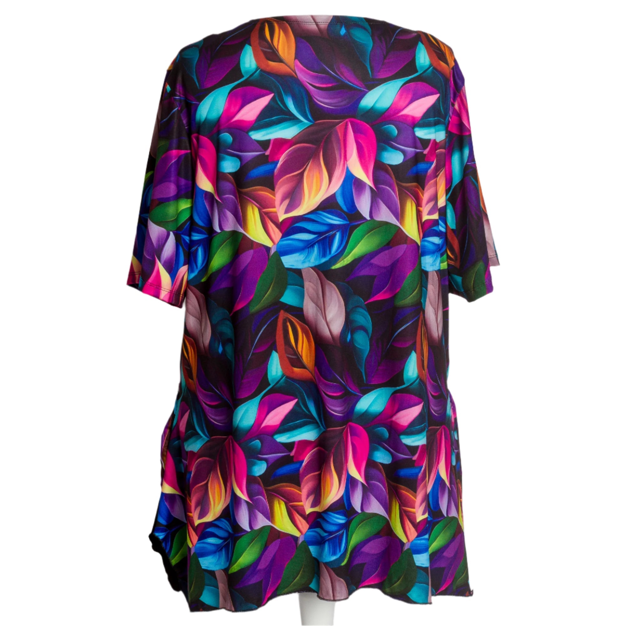 Oferă-ți o atmosferă colorată cu această tunică elegantă plus-size, decorată cu un imprimeu strălucitor cu frunze în nuanțe bogate de violet, albastru, portocaliu și verde. Fundalul închis accentuează culorile vibrante și modelează vizual silueta. Croiul lejer asigură confort pe tot parcursul zilei, în timp ce legăturile de la decolteu și cele două buzunare adaugă funcționalitate și stil. O alegere ideală pentru viața de zi cu zi sau pentru ocazii mai formale.