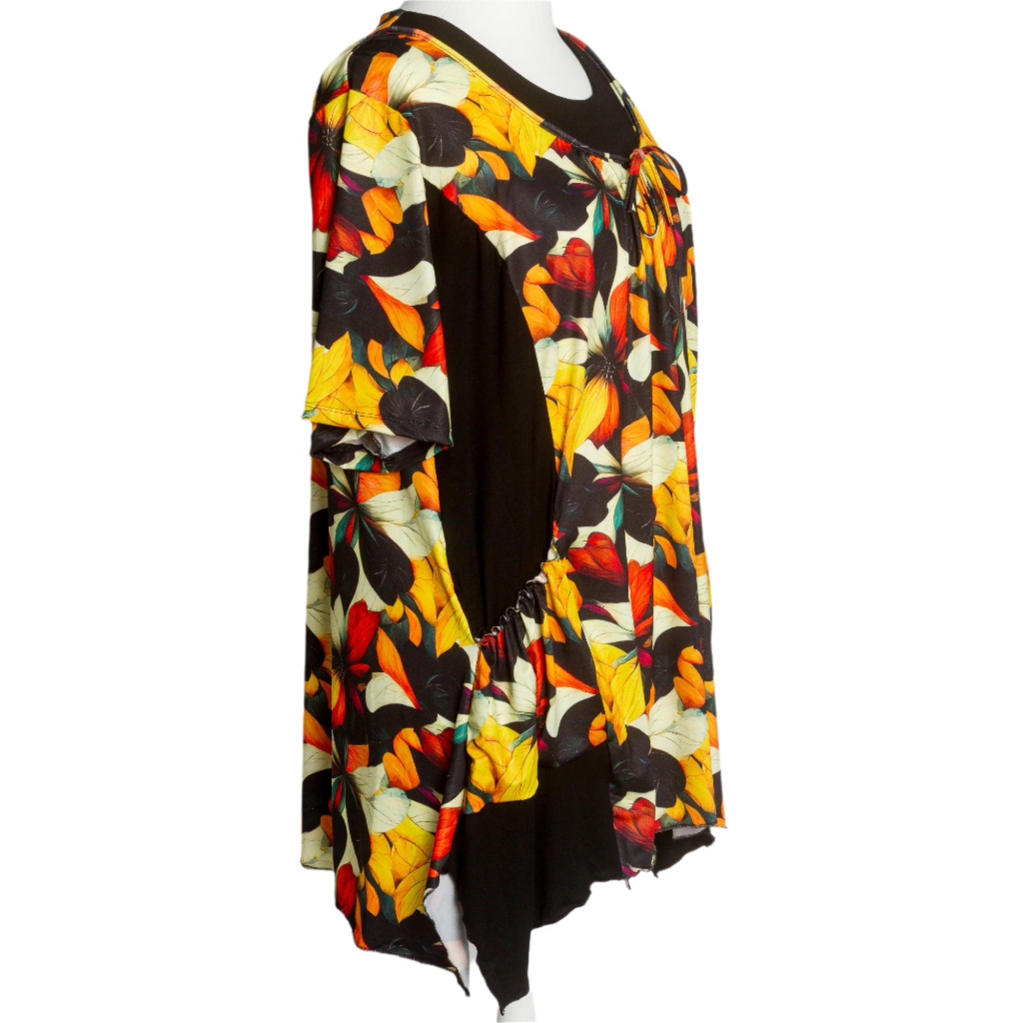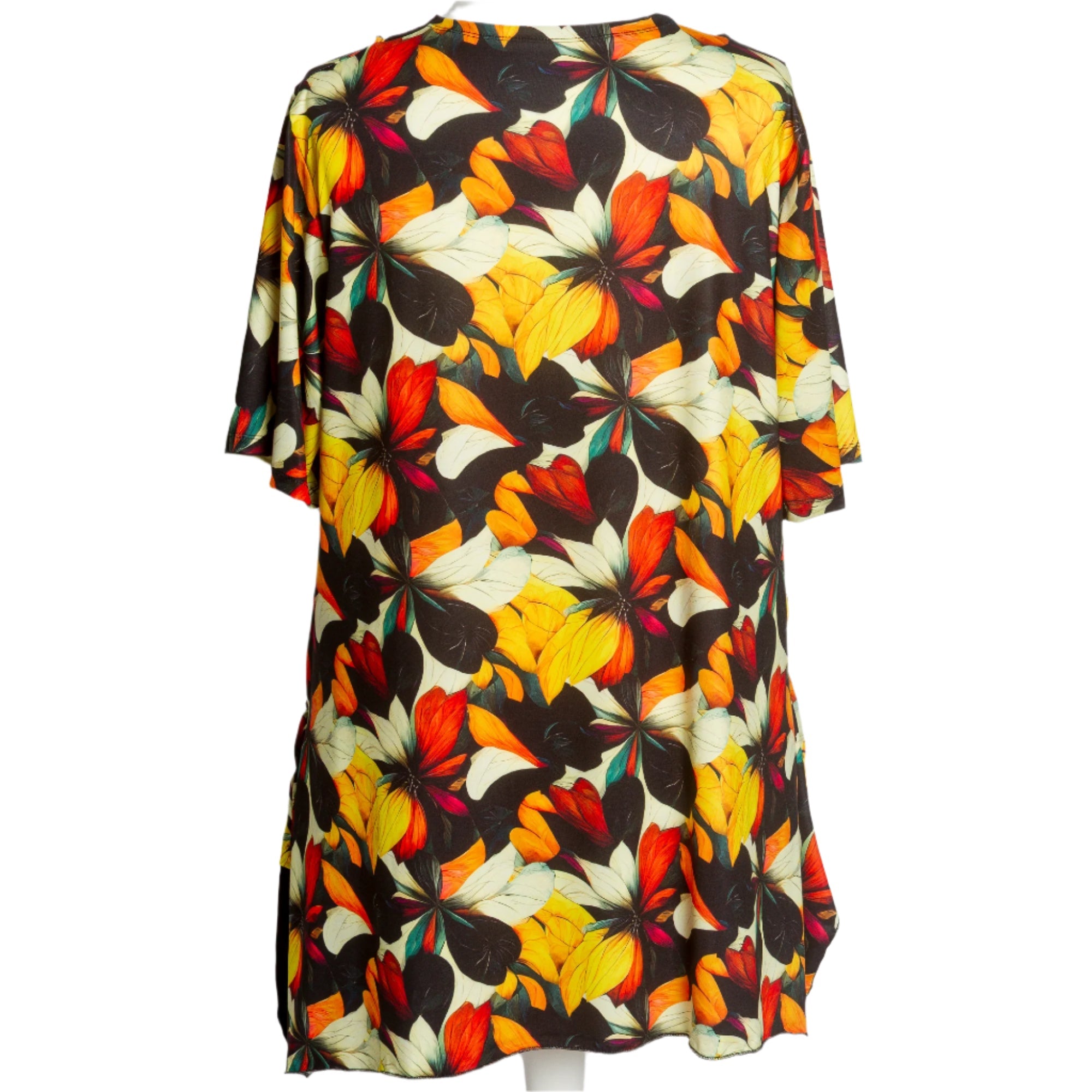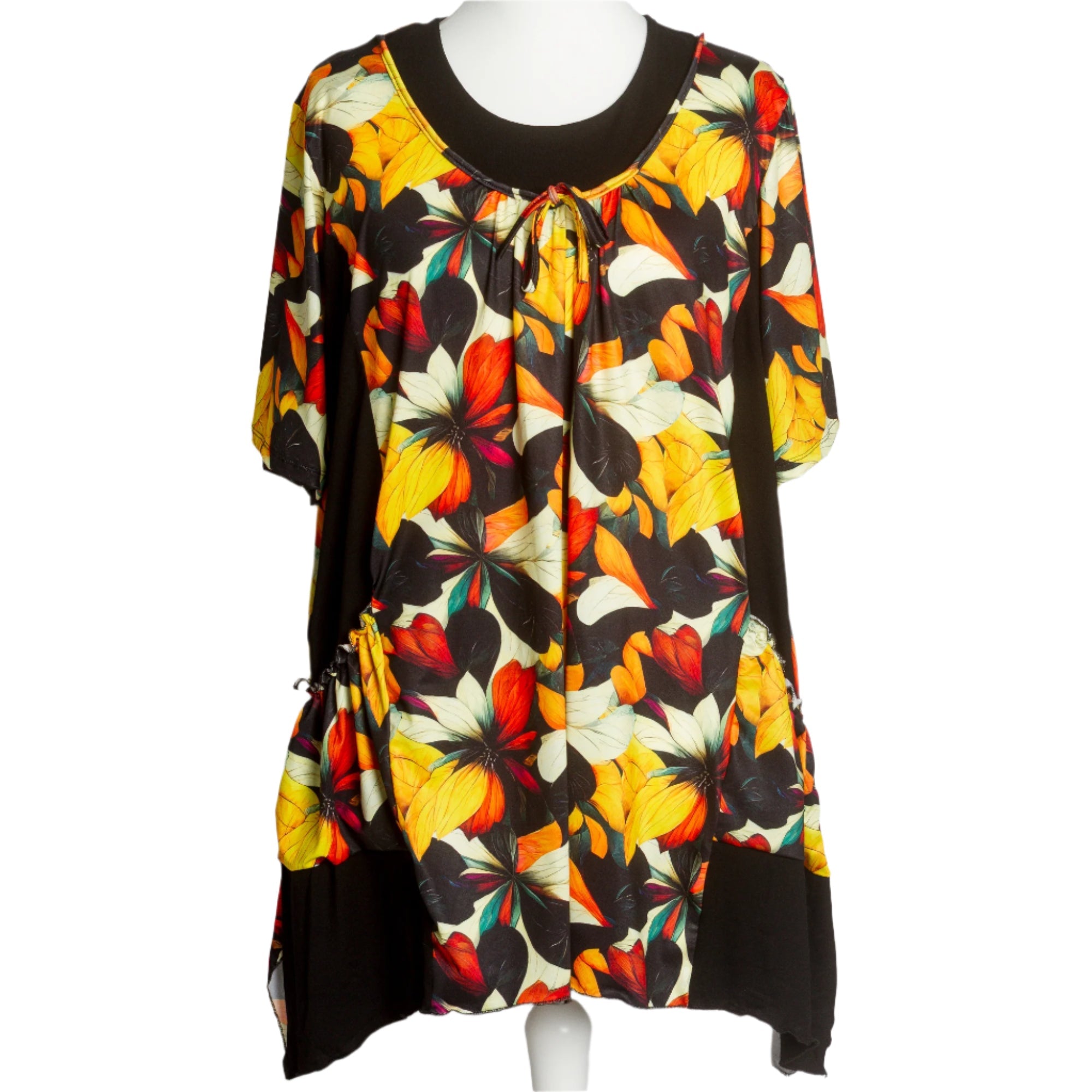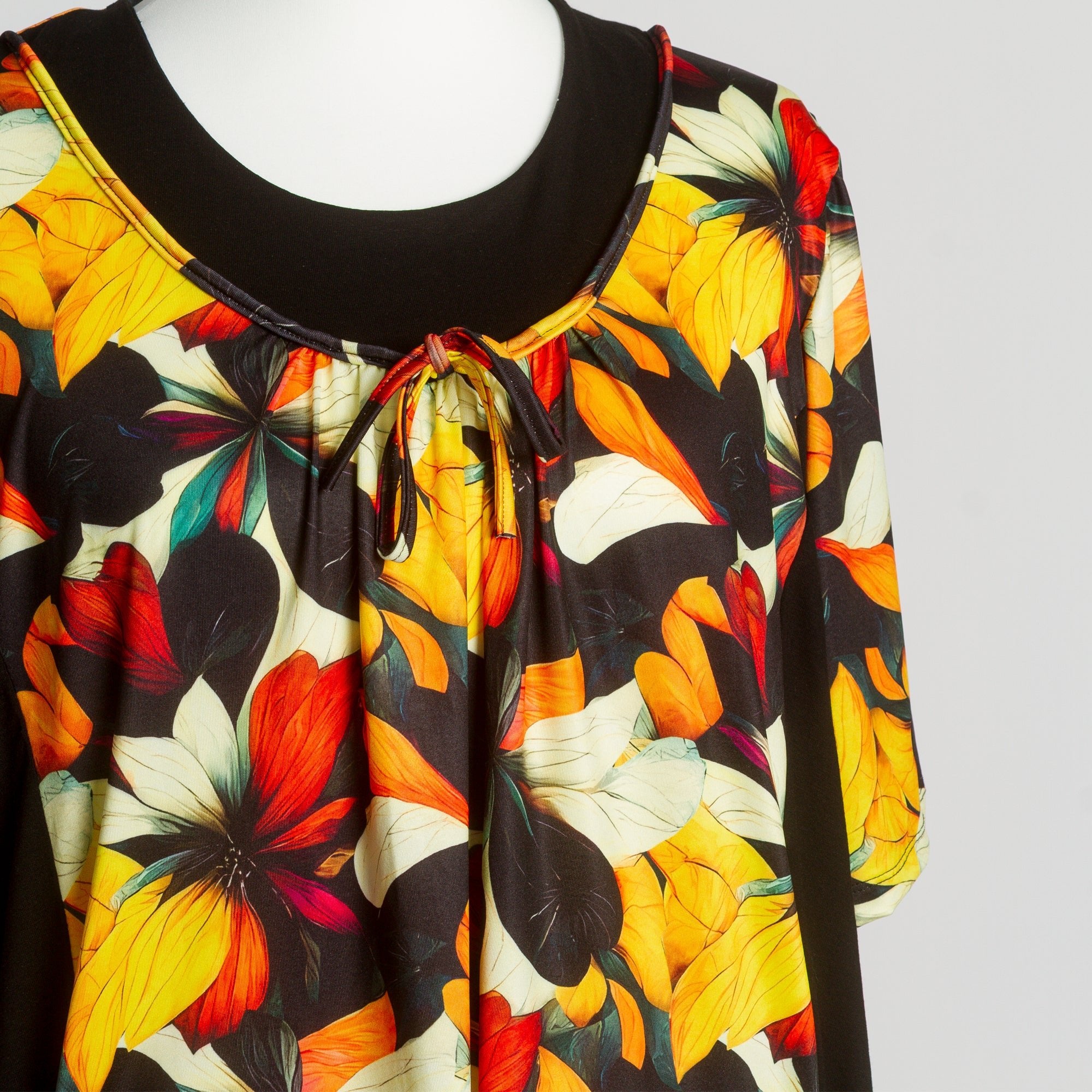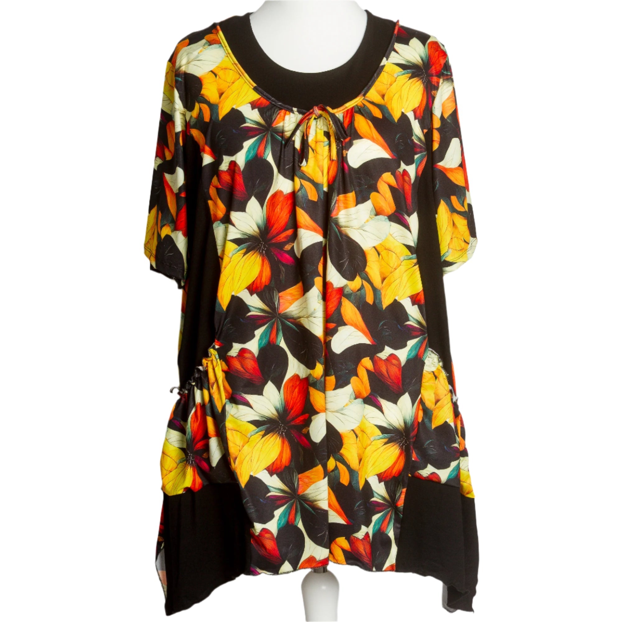Optează pentru prospețime și confort cu această tunică colorată în mărimi mari, care va aduce o atmosferă însorită ținutei tale. Modelul impresionează printr-un model floral spectaculos în galben, portocaliu, roșu și crem pe fundal negru. Croiul lejer este potrivit pentru toate siluetele, iar buzunarele și legăturile de la decolteu adaugă practicitate și eleganță. Ideală atât pentru zi de zi, cât și pentru ocazii speciale.
