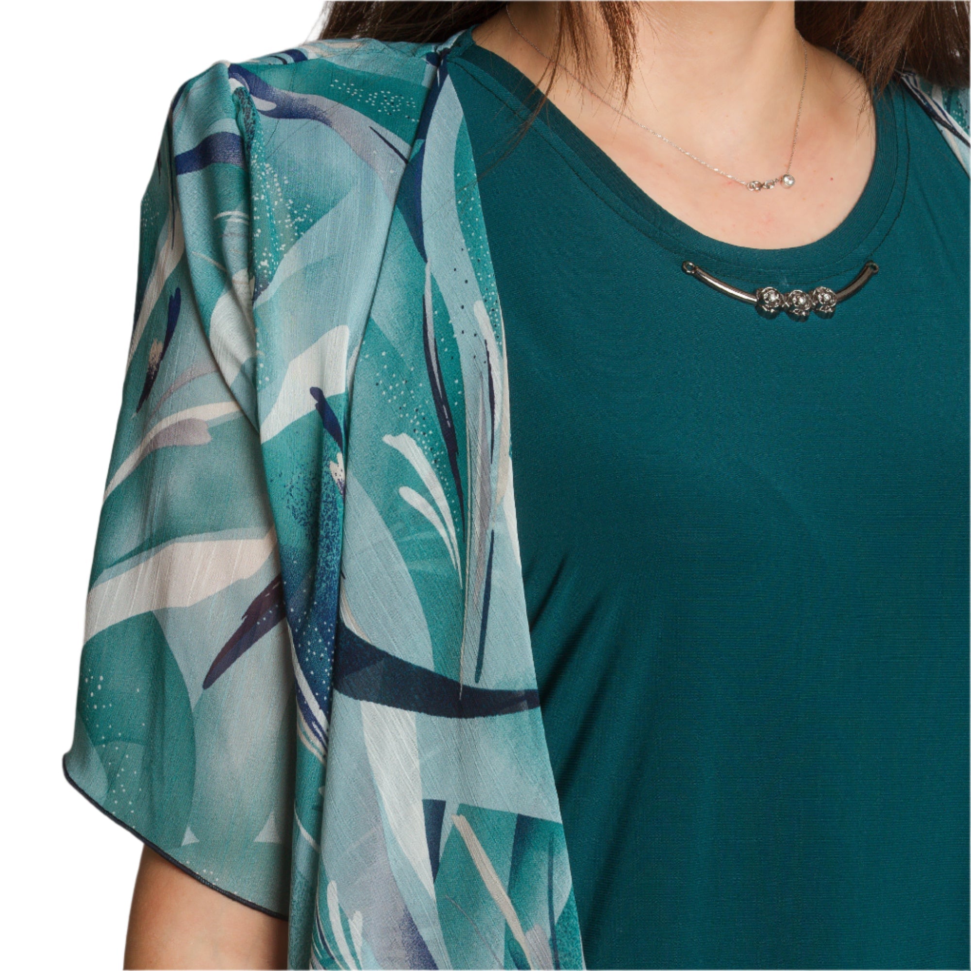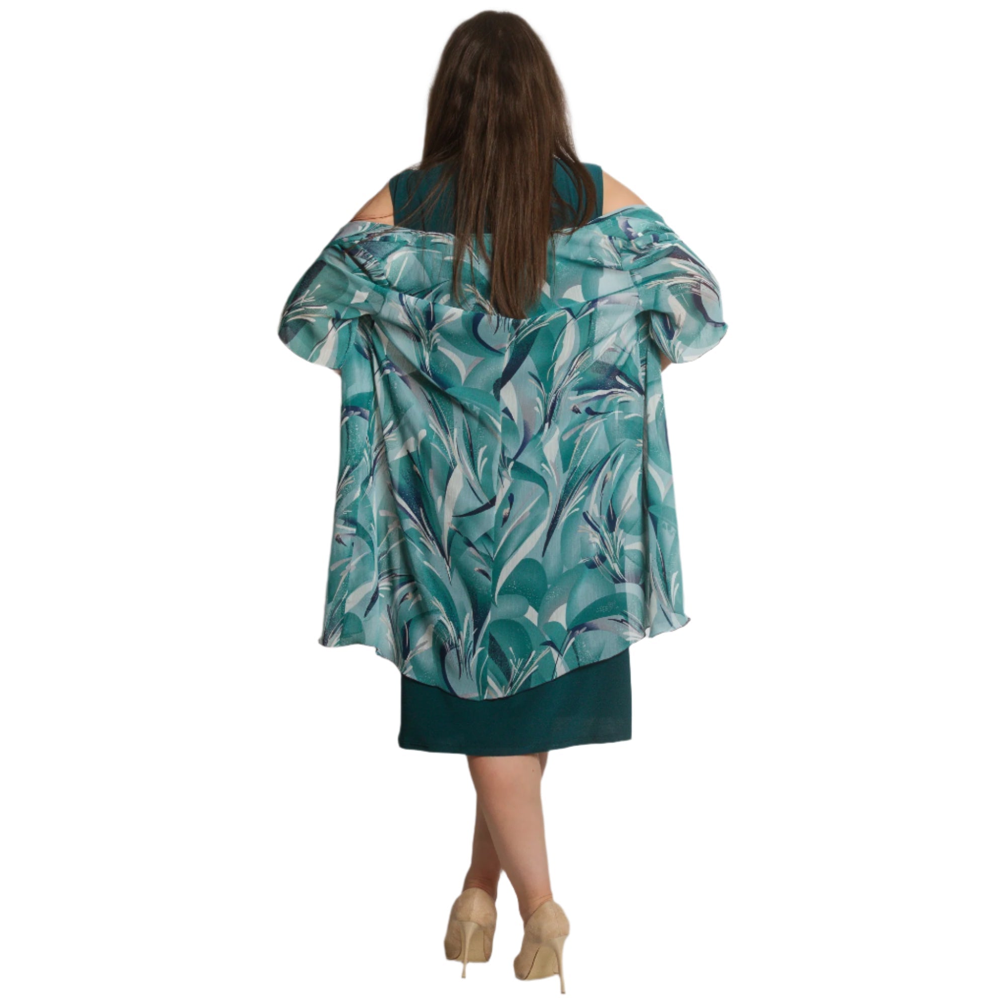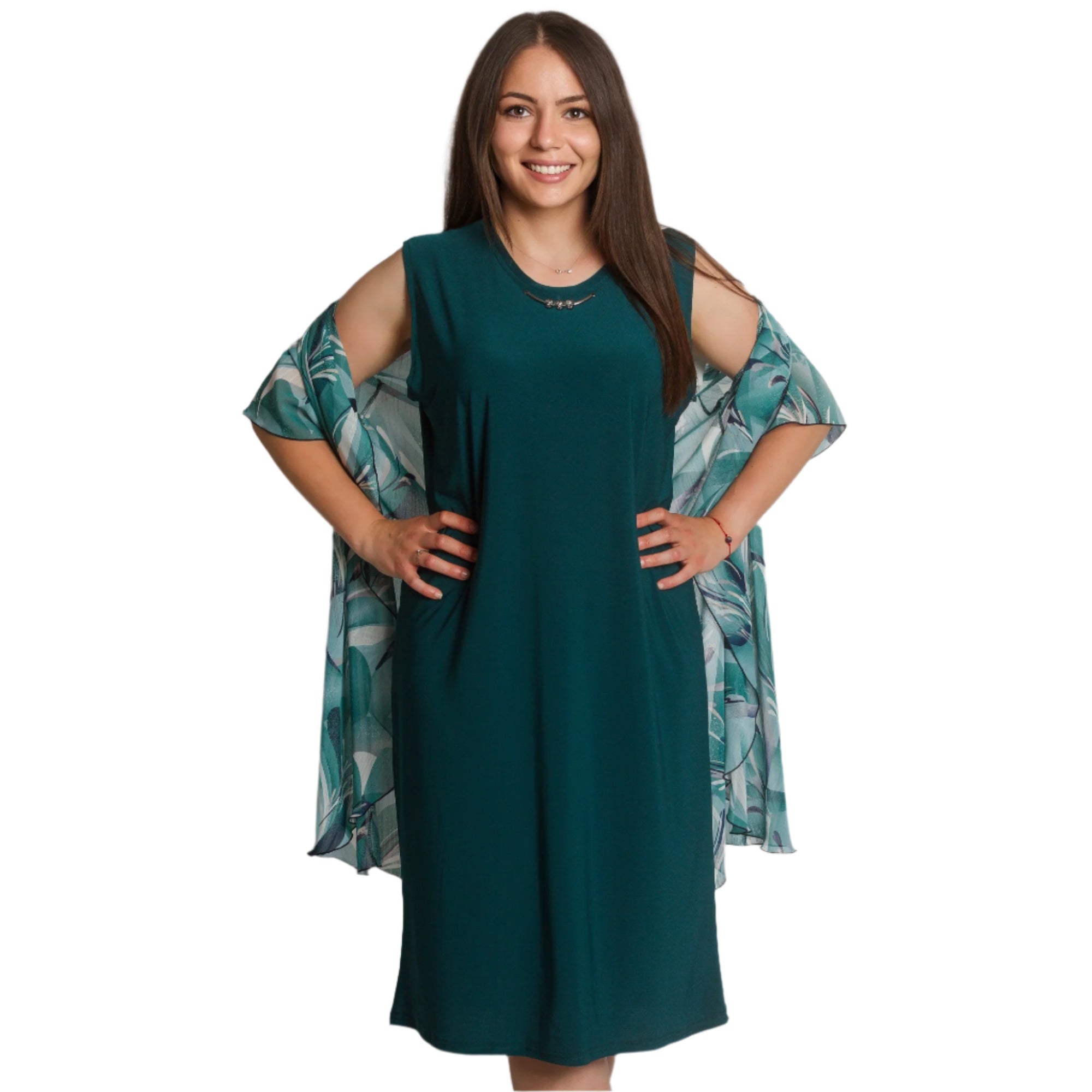 Radiază eleganță cu această rochie elegantă de seară, în culoarea turcoaz, combinată cu o pelerină vaporoasă din șifon cu model floral. Rochia este confecționată dintr-un material elastic și confortabil, cu bretele groase și o croială dreaptă care pune în valoare silueta. Decolteul rotund este decorat cu o aplicație metalică elegantă. Pelerina ușoară și care cade liber adaugă delicatețe și rafinament, făcând din acest model o alegere ideală pentru ocaziile formale din sezonul primăvară-vară.