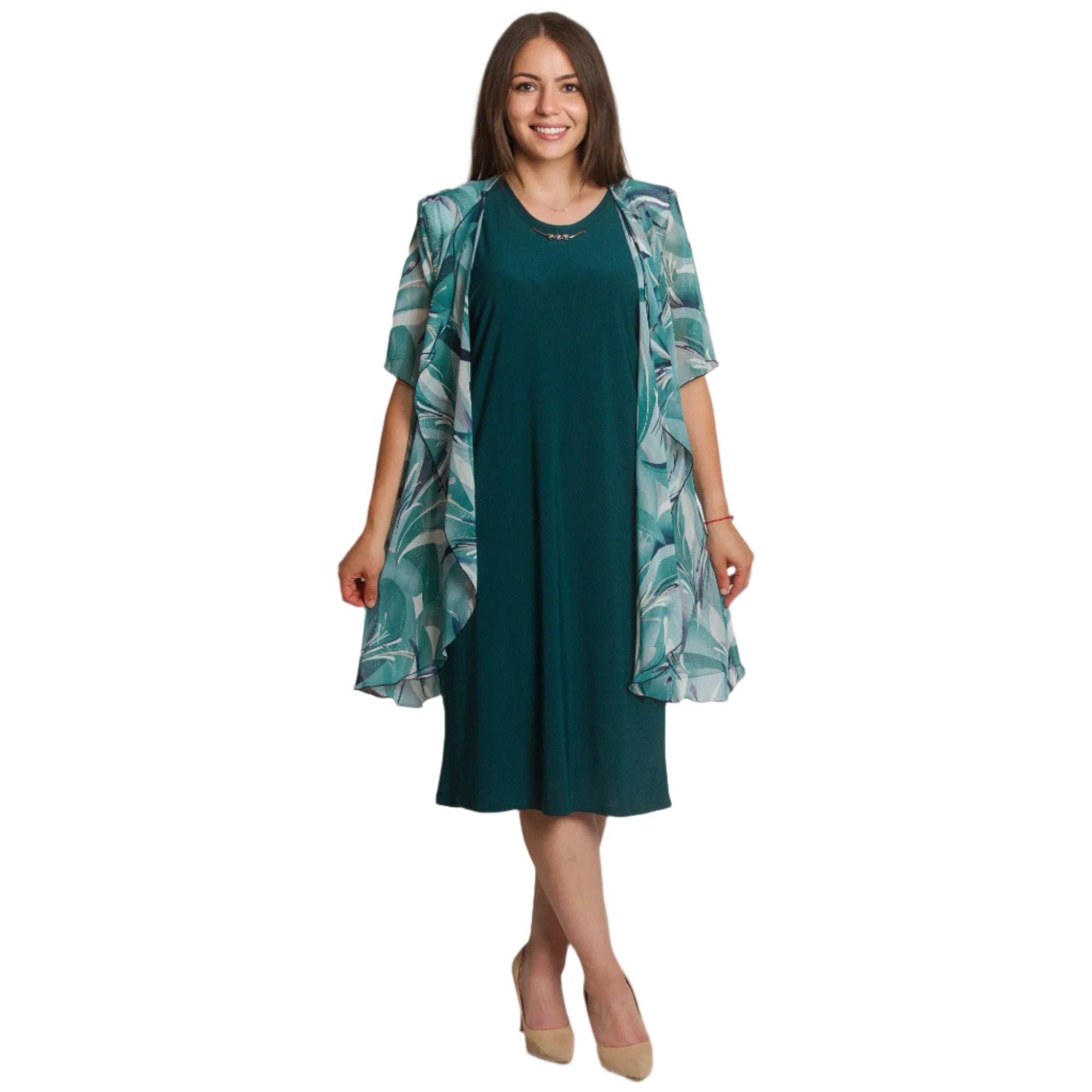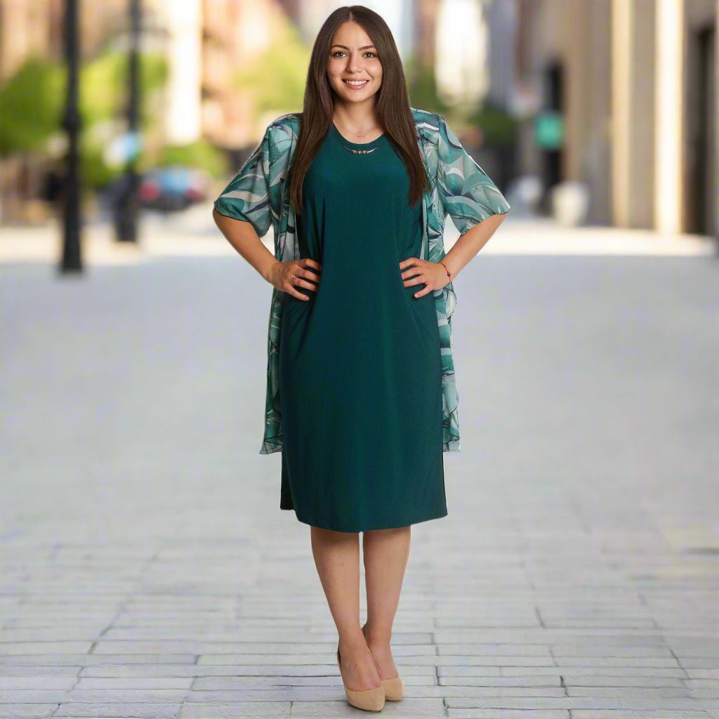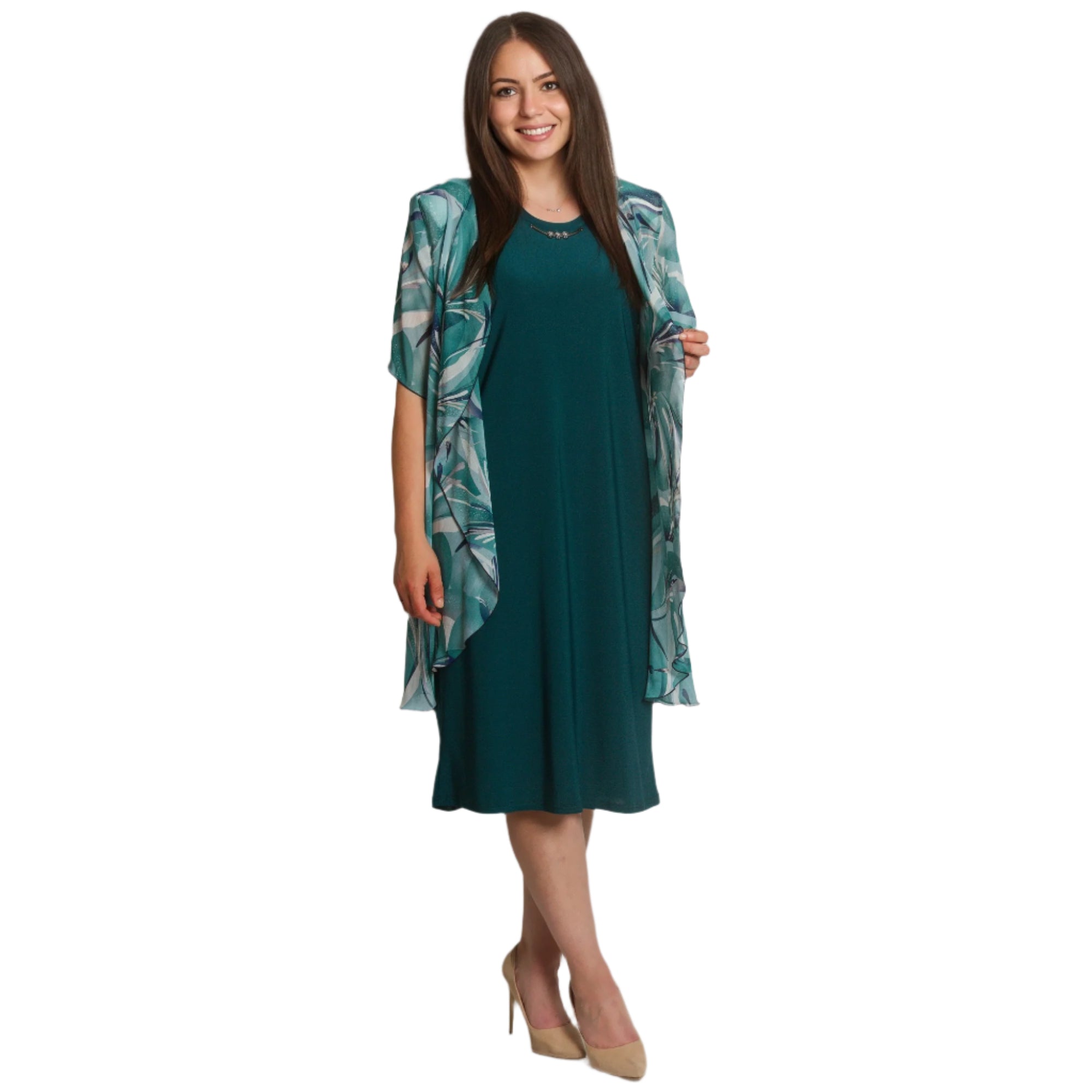 Radiază eleganță cu această rochie elegantă de seară, în culoarea turcoaz, combinată cu o pelerină vaporoasă din șifon cu model floral. Rochia este confecționată dintr-un material elastic și confortabil, cu bretele groase și o croială dreaptă care pune în valoare silueta. Decolteul rotund este decorat cu o aplicație metalică elegantă. Pelerina ușoară și care cade liber adaugă delicatețe și rafinament, făcând din acest model o alegere ideală pentru ocaziile formale din sezonul primăvară-vară.