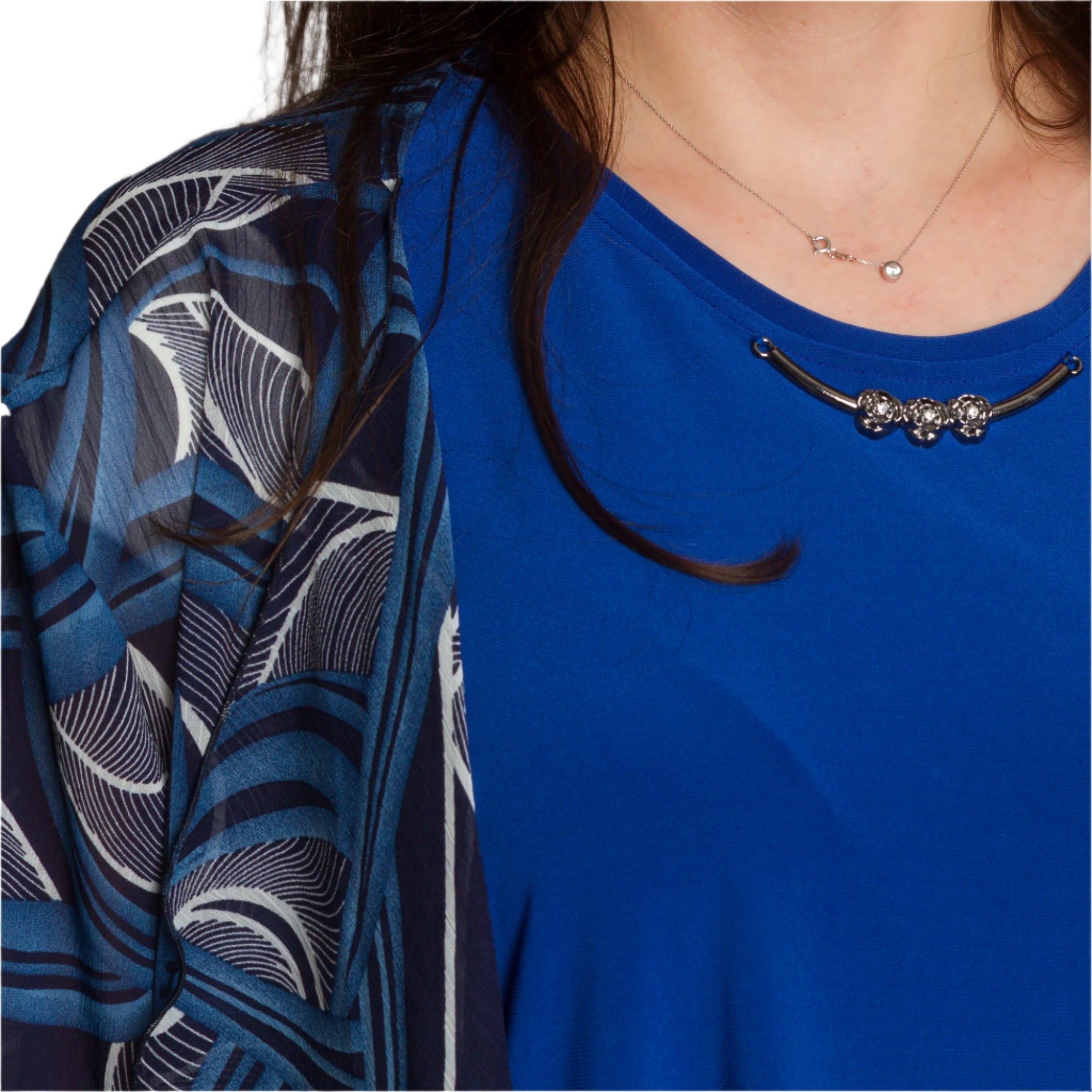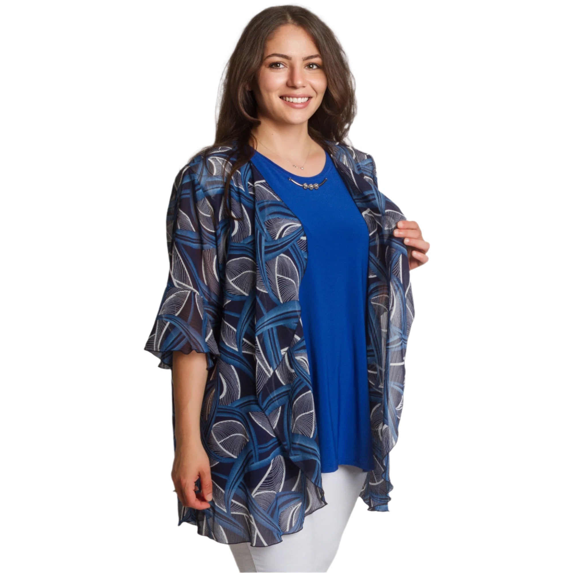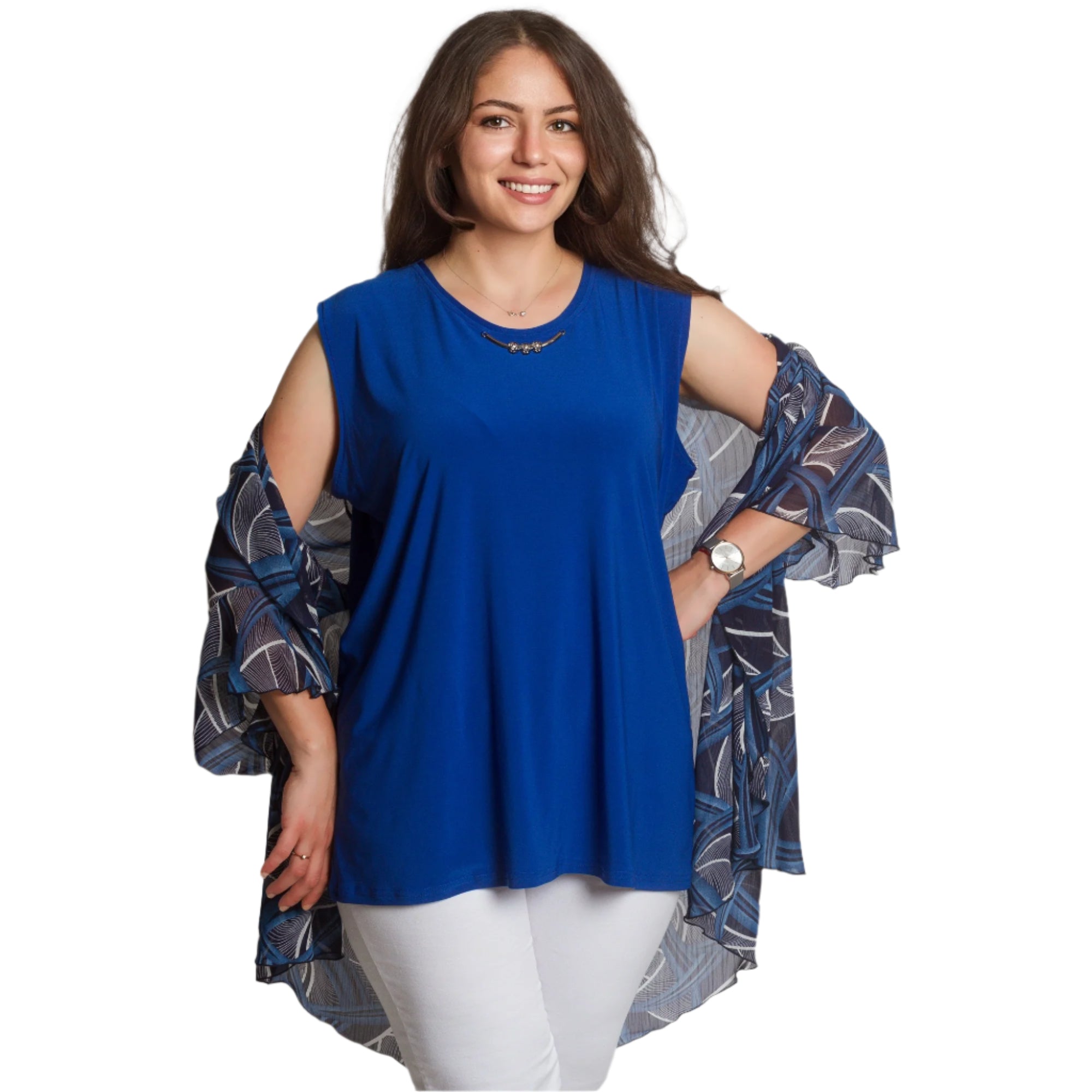 Fii stilată și încrezătoare cu acest set elegant, format dintr-un maiou într-o culoare albastru intens și o pelerină lejeră din șifon cu un model abstract. Maioul are un decolteu rotund și o croială dreaptă, elastică, oferind confort și libertate de mișcare. Stratul ușor de șifon cade liber și acoperă ușor umerii și brațele, creând o senzație de lejeritate și grație. O alegere perfectă pentru ocazii formale, sărbători și seri de sărbători.