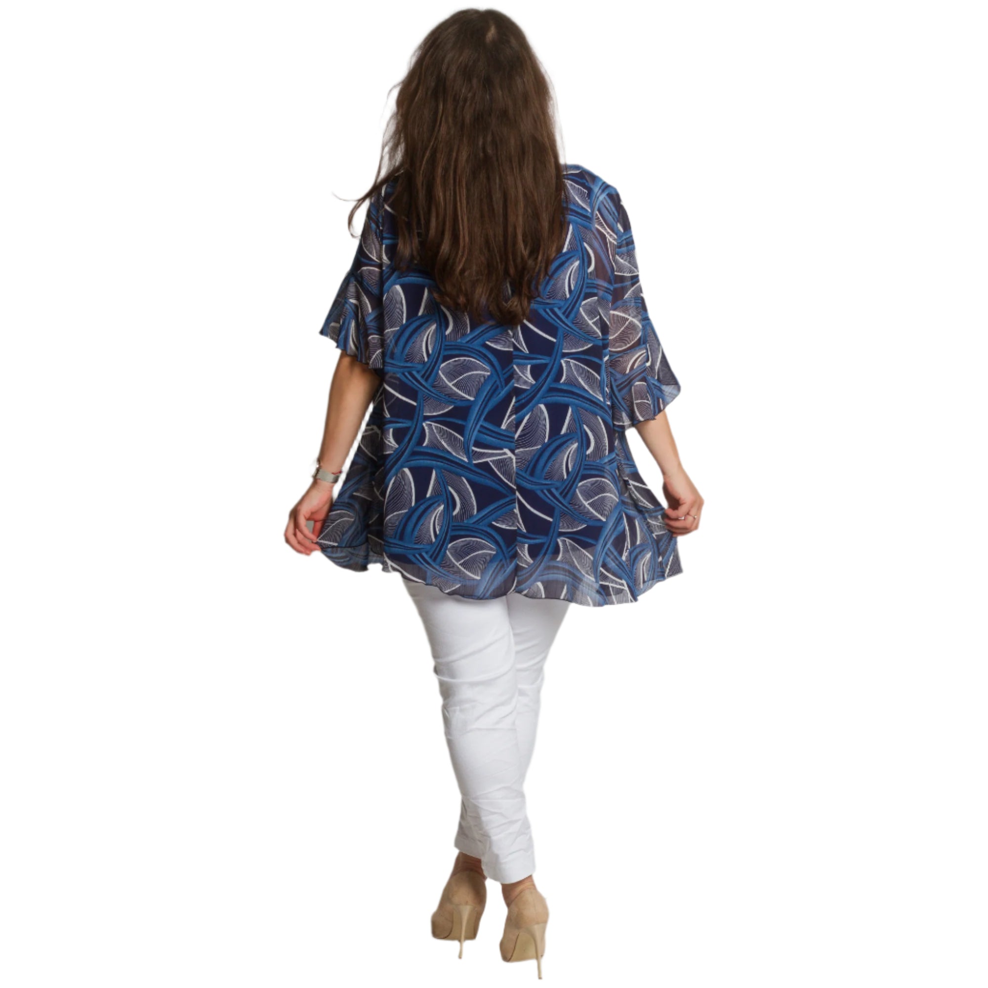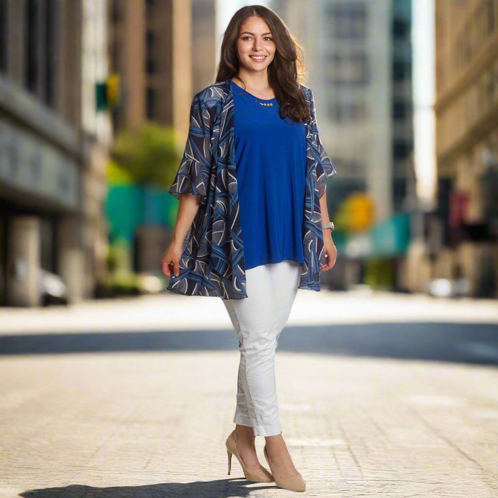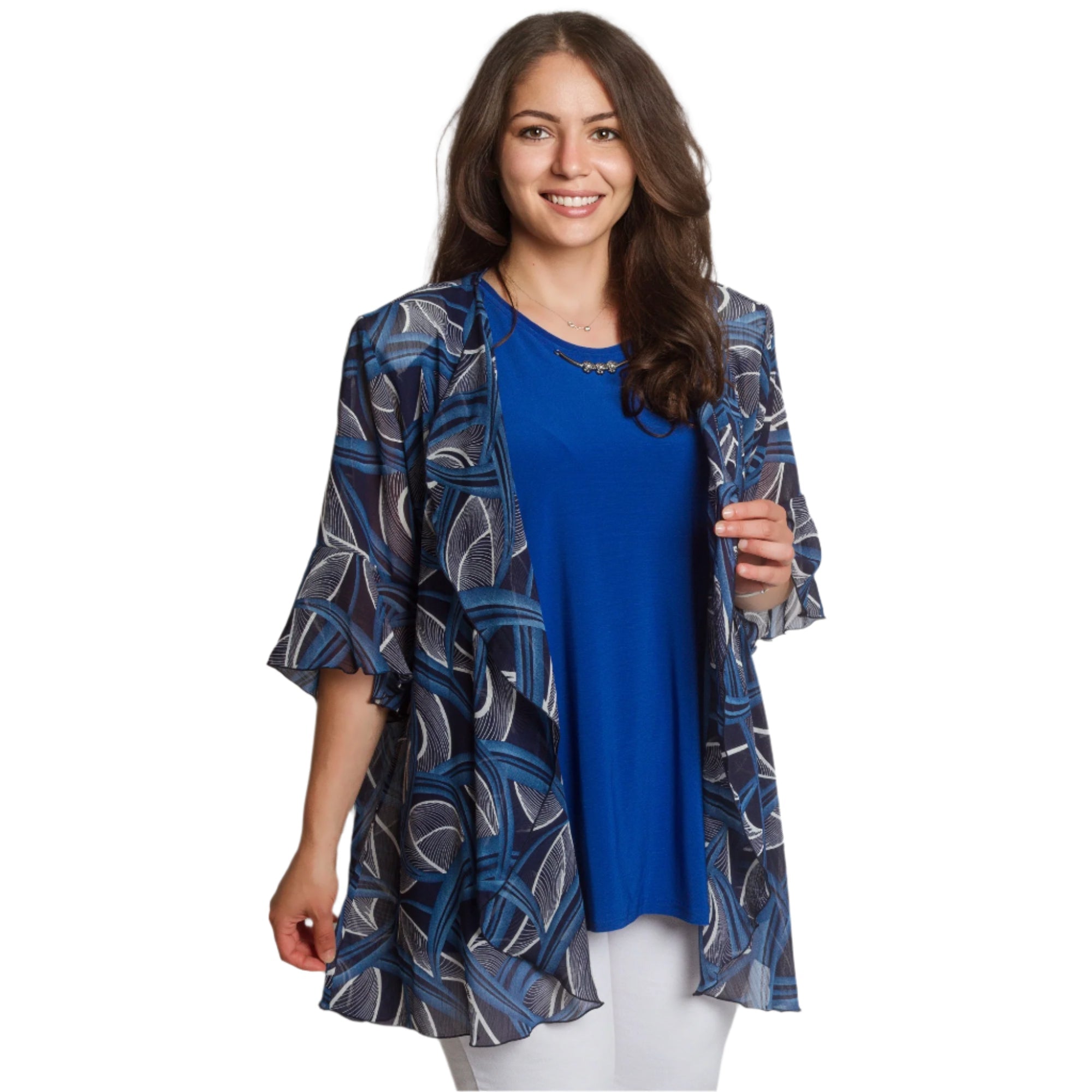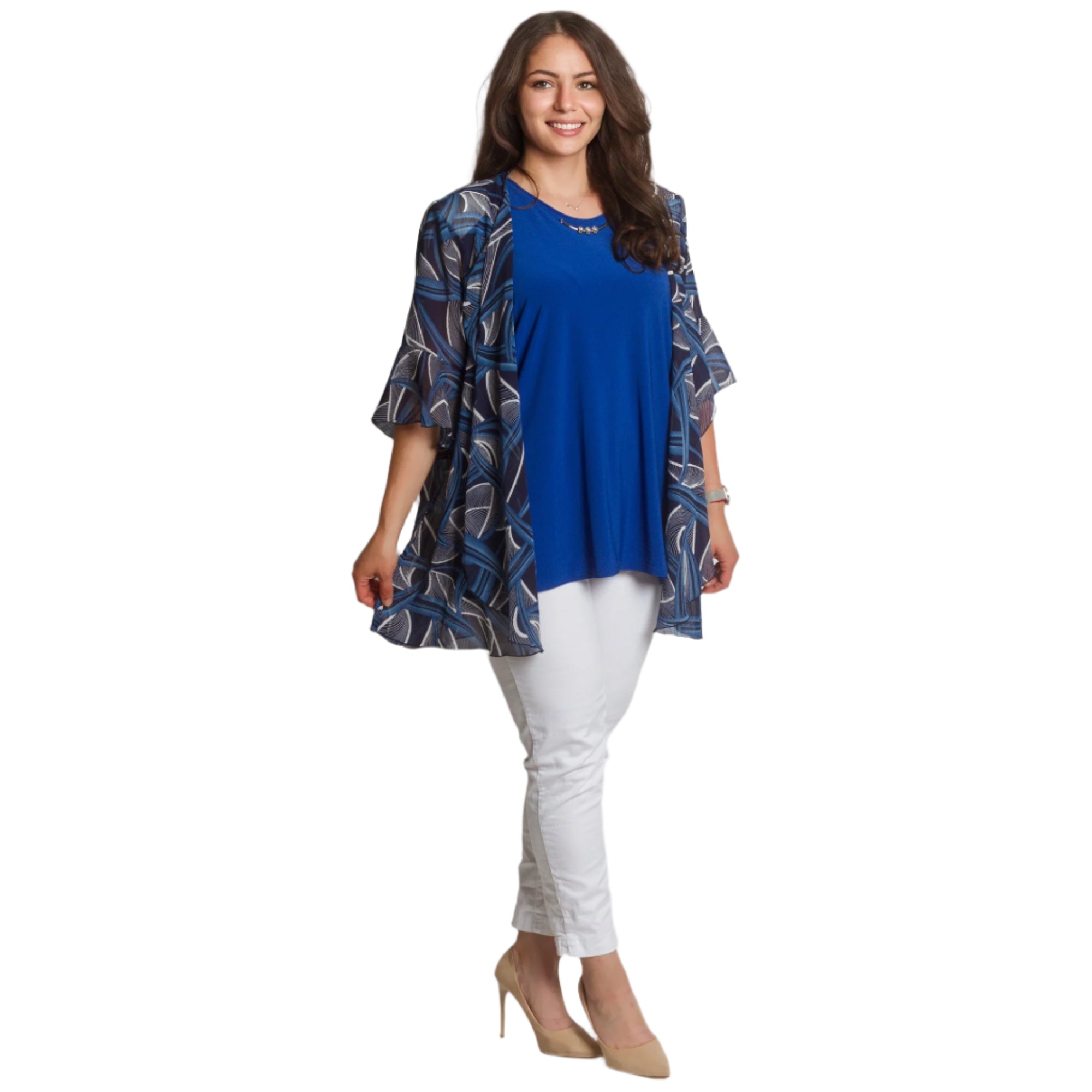 Fii stilată și încrezătoare cu acest set elegant, format dintr-un maiou într-o culoare albastru intens și o pelerină lejeră din șifon cu un model abstract. Maioul are un decolteu rotund și o croială dreaptă, elastică, oferind confort și libertate de mișcare. Stratul ușor de șifon cade liber și acoperă ușor umerii și brațele, creând o senzație de lejeritate și grație. O alegere perfectă pentru ocazii formale, sărbători și seri de sărbători.