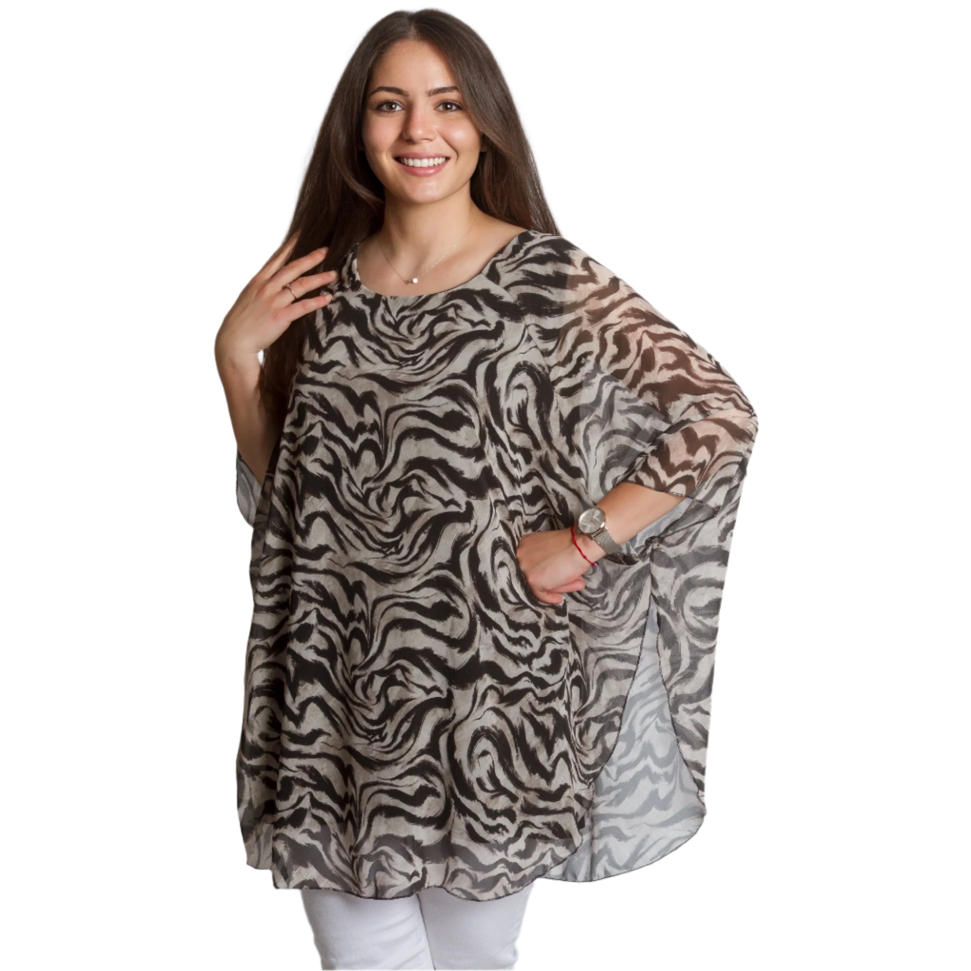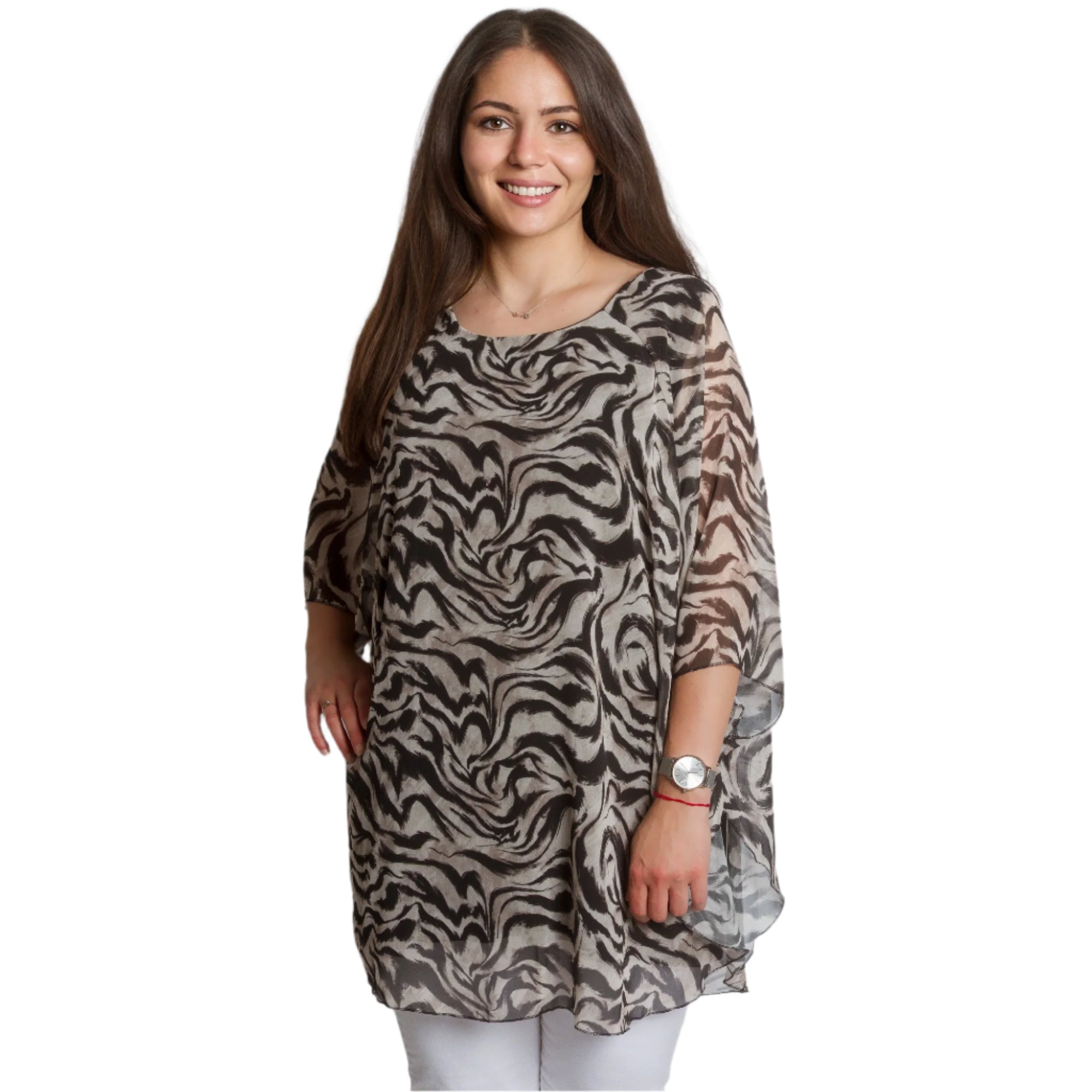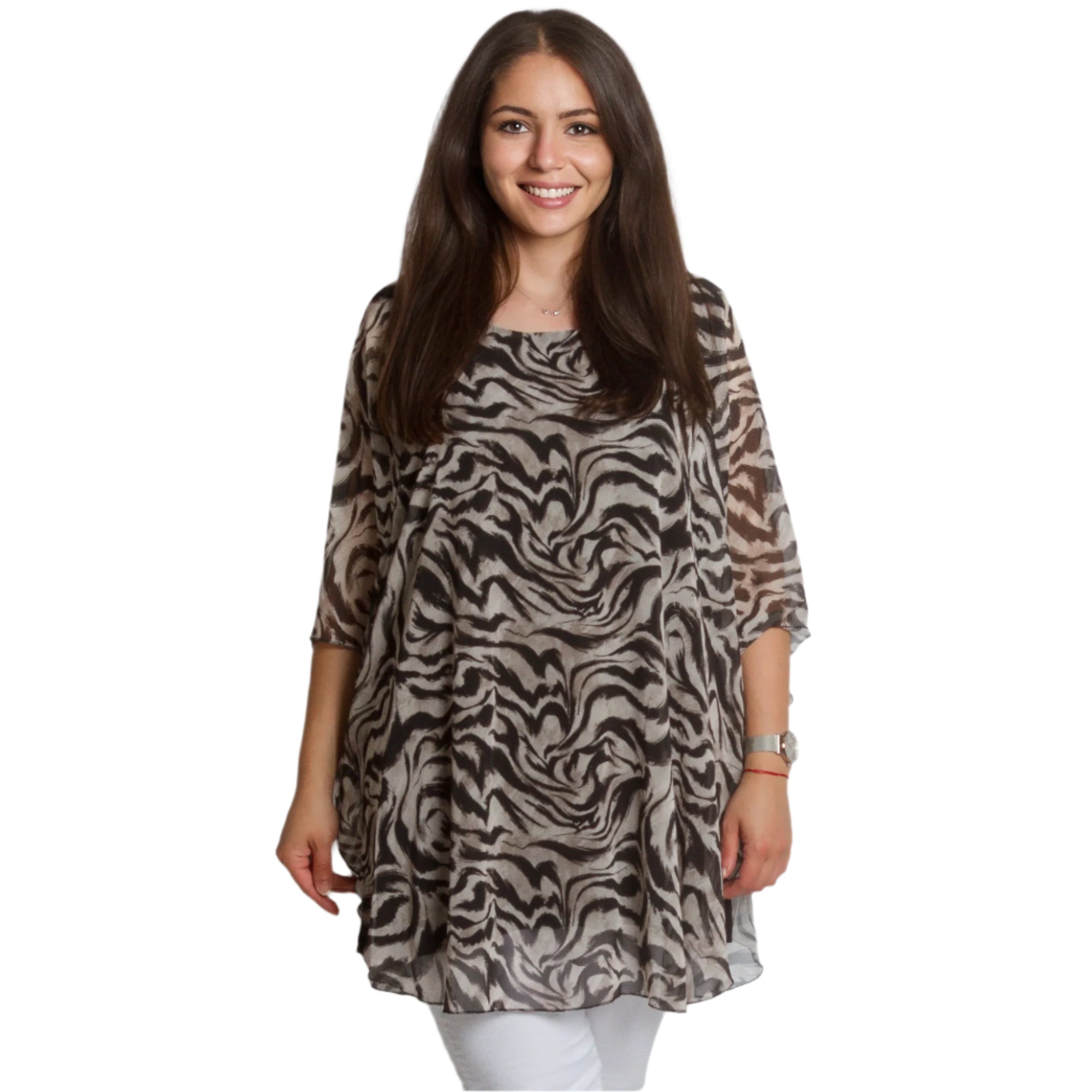 Exprimă stilul și încrederea cu această tunică deosebită, cu imprimeu animal abstract în negru și bej. Croiul lejer și materialul moale și elastic oferă confort și libertate de mișcare, în timp ce stratul exterior aerisit conferă o senzație de lejeritate. Cu o lungime potrivită și un decolteu rotund, modelul este ideal pentru ocazii formale din sezonul primăvară-vară. Tunica este o alegere excelentă pentru femeile plus-size care apreciază atât stilul, cât și confortul.