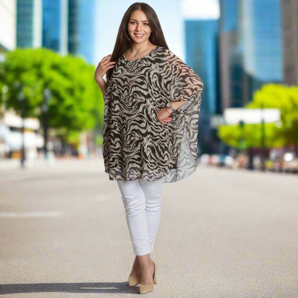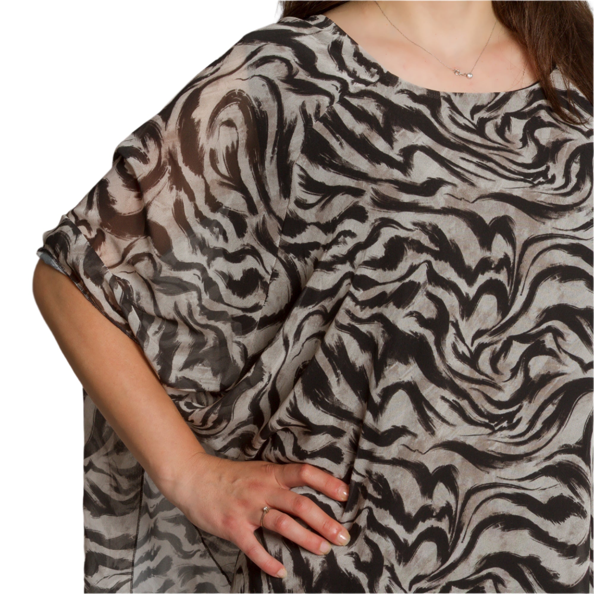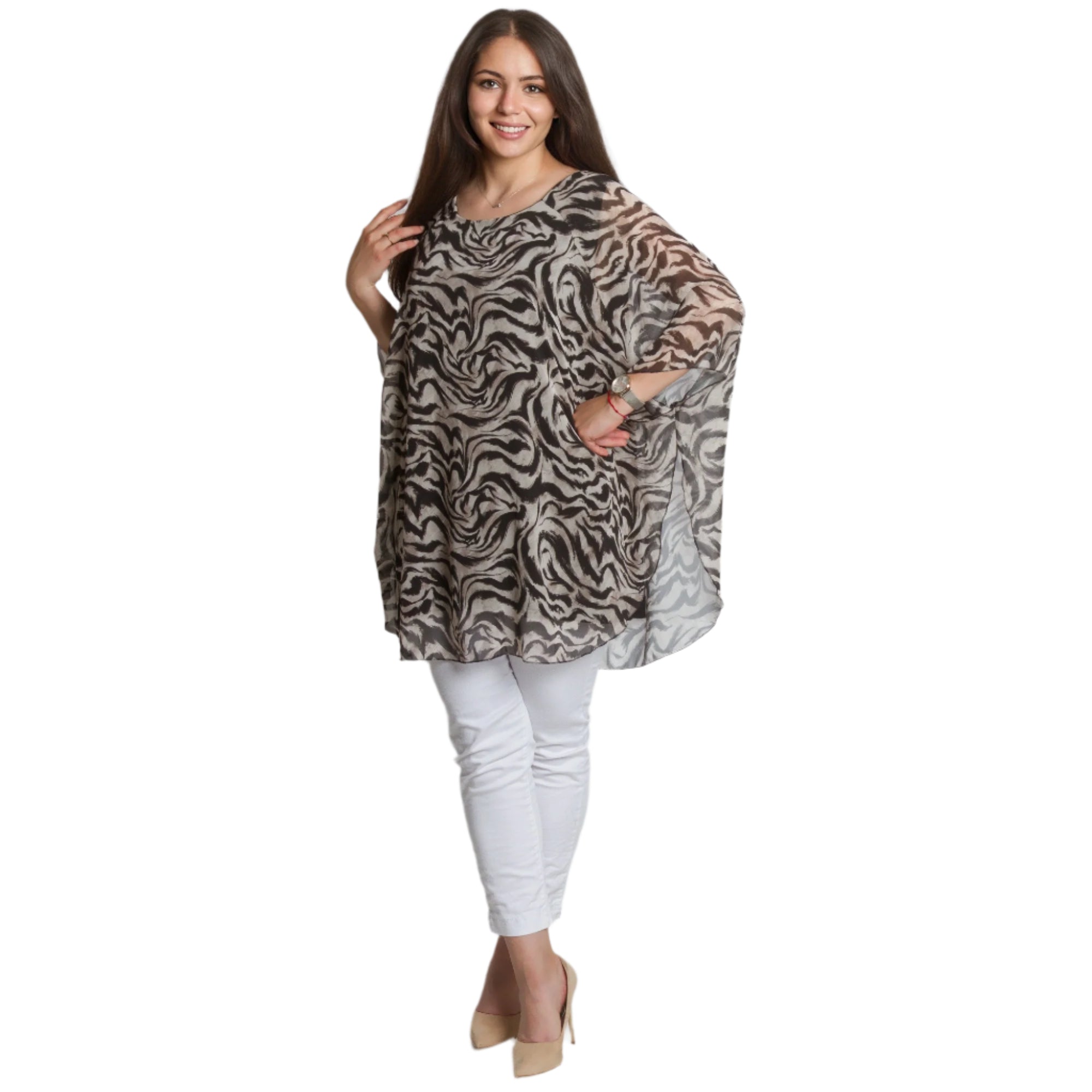 Exprimă stilul și încrederea cu această tunică deosebită, cu imprimeu animal abstract în negru și bej. Croiul lejer și materialul moale și elastic oferă confort și libertate de mișcare, în timp ce stratul exterior aerisit conferă o senzație de lejeritate. Cu o lungime potrivită și un decolteu rotund, modelul este ideal pentru ocazii formale din sezonul primăvară-vară. Tunica este o alegere excelentă pentru femeile plus-size care apreciază atât stilul, cât și confortul.