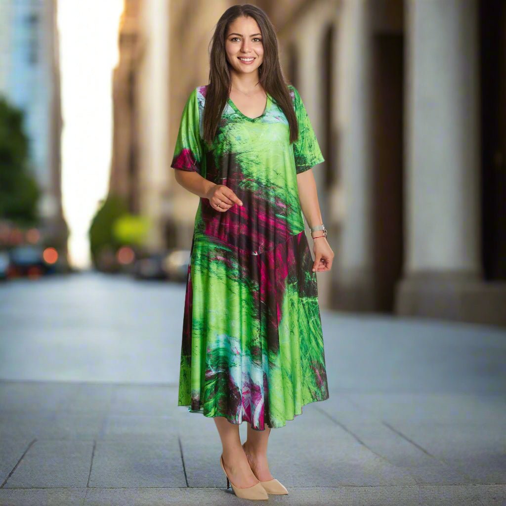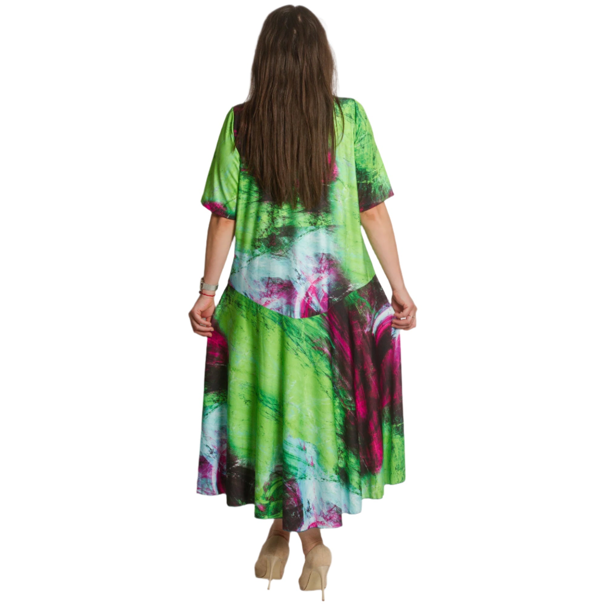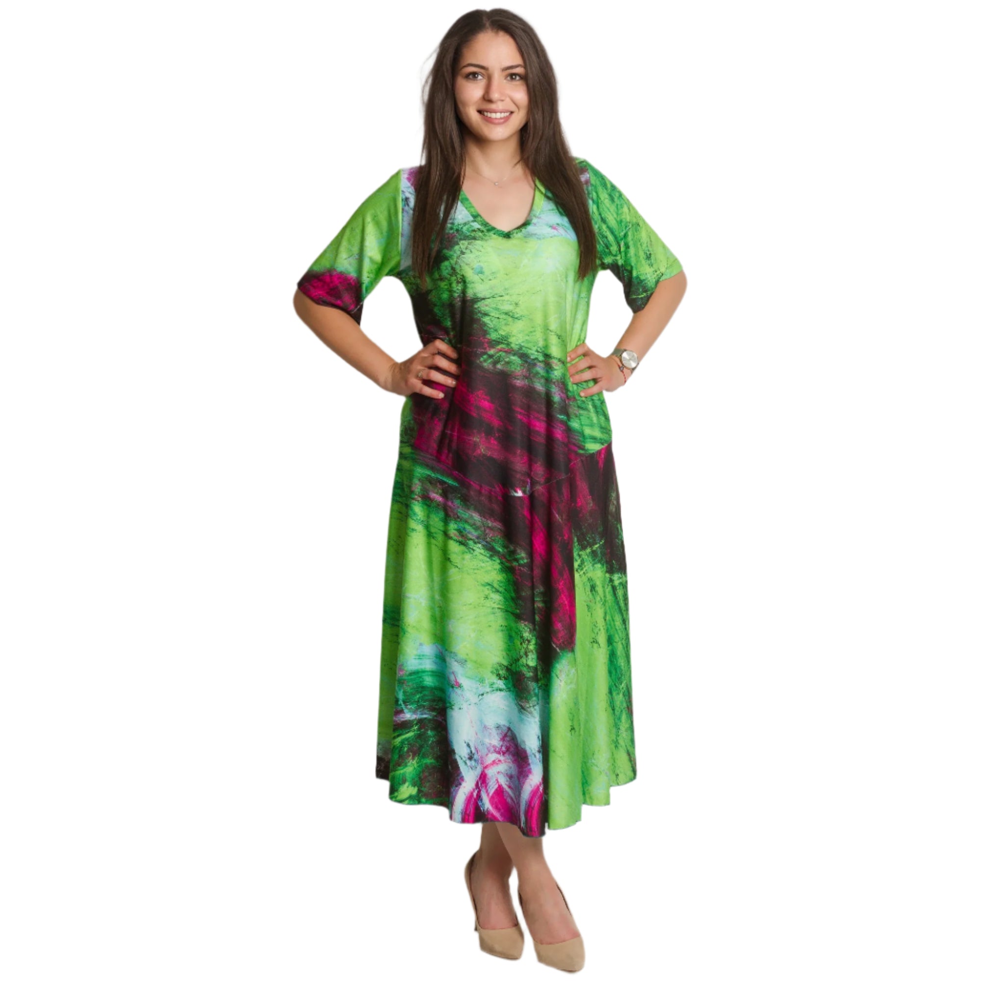 Radiază încredere cu această rochie de vară proaspătă, în mărimi mari, cu un imprimeu abstract verde atrăgător. Confecționată din material respirabil, cu un conținut ridicat de bumbac, oferă confort pe tot parcursul zilei. Croiul lejer și silueta lejeră creează lejeritate și libertate de mișcare, iar decolteul în V adaugă un accent elegant. Este potrivită pentru ocazii formale sau evenimente artistice în sezonul primăvară-vară.