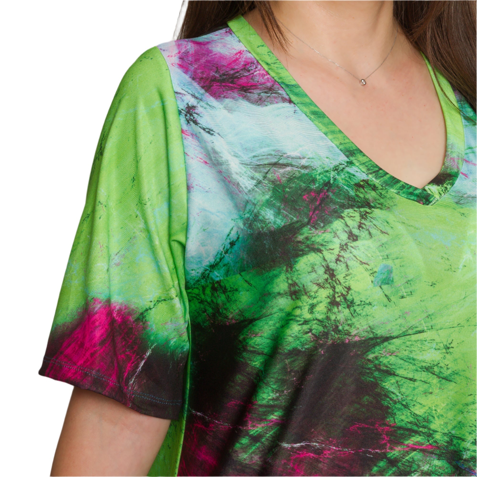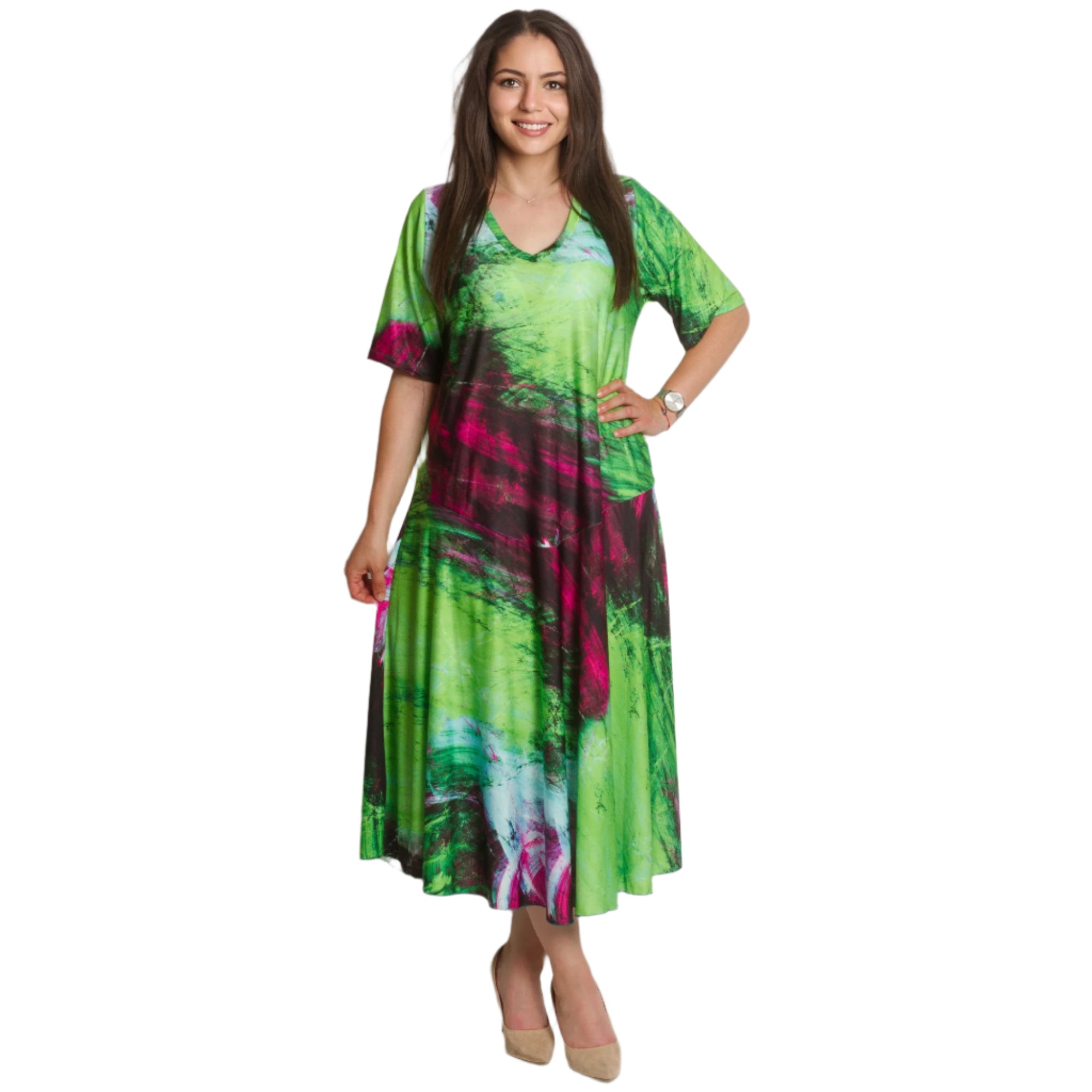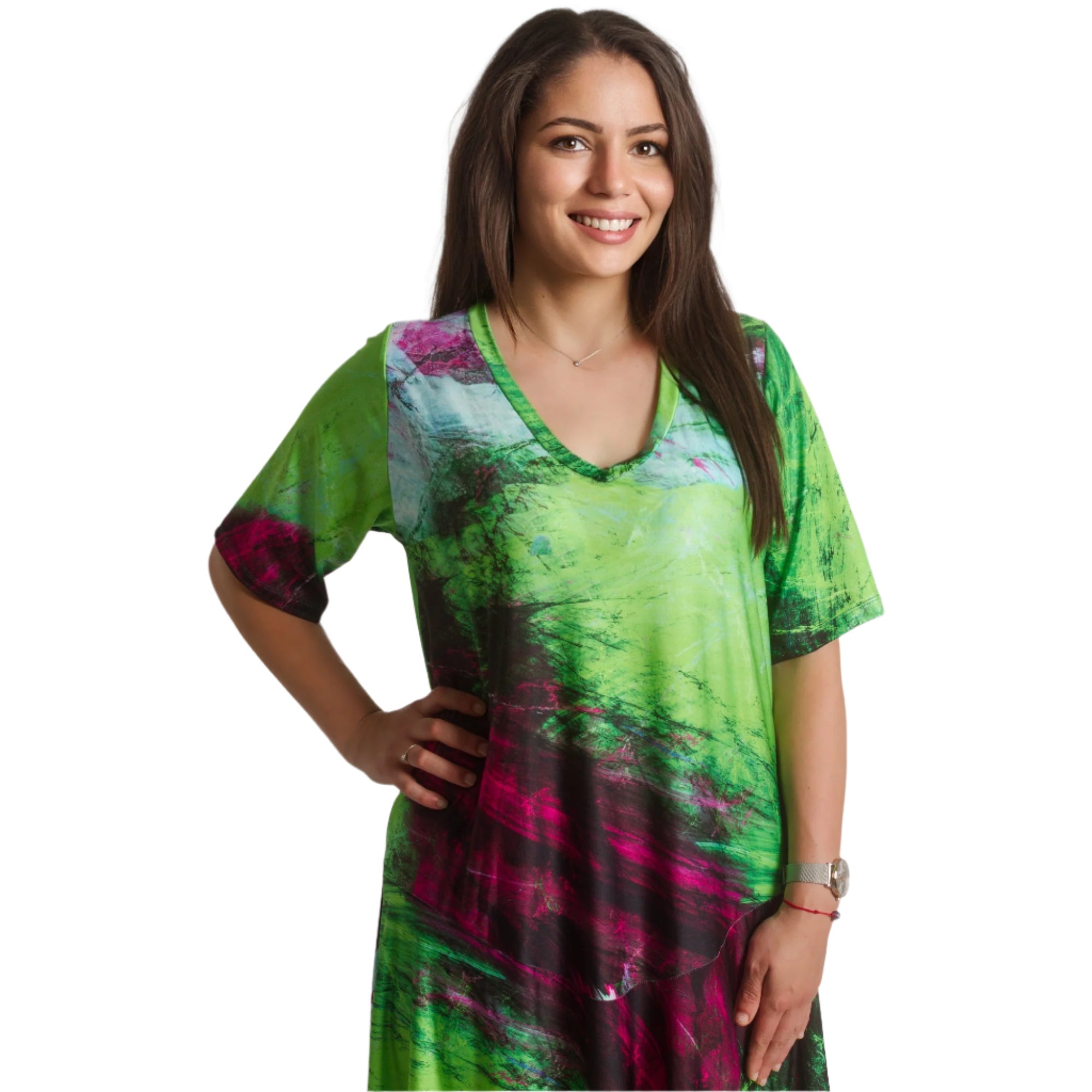 Radiază încredere cu această rochie de vară proaspătă, în mărimi mari, cu un imprimeu abstract verde atrăgător. Confecționată din material respirabil, cu un conținut ridicat de bumbac, oferă confort pe tot parcursul zilei. Croiul lejer și silueta lejeră creează lejeritate și libertate de mișcare, iar decolteul în V adaugă un accent elegant. Este potrivită pentru ocazii formale sau evenimente artistice în sezonul primăvară-vară.