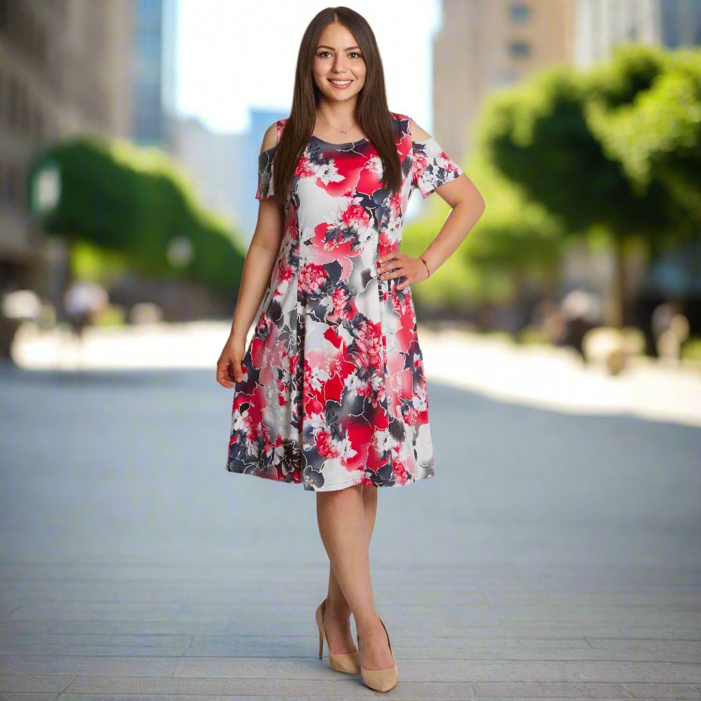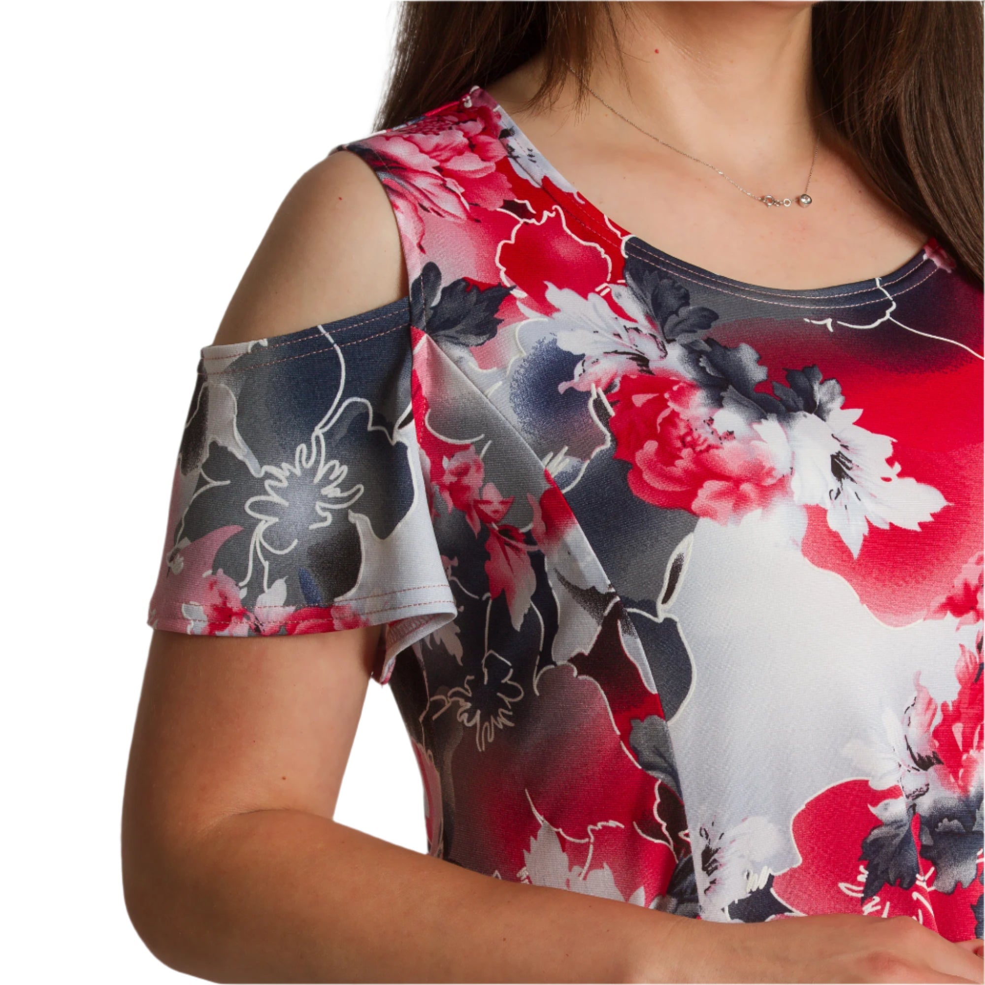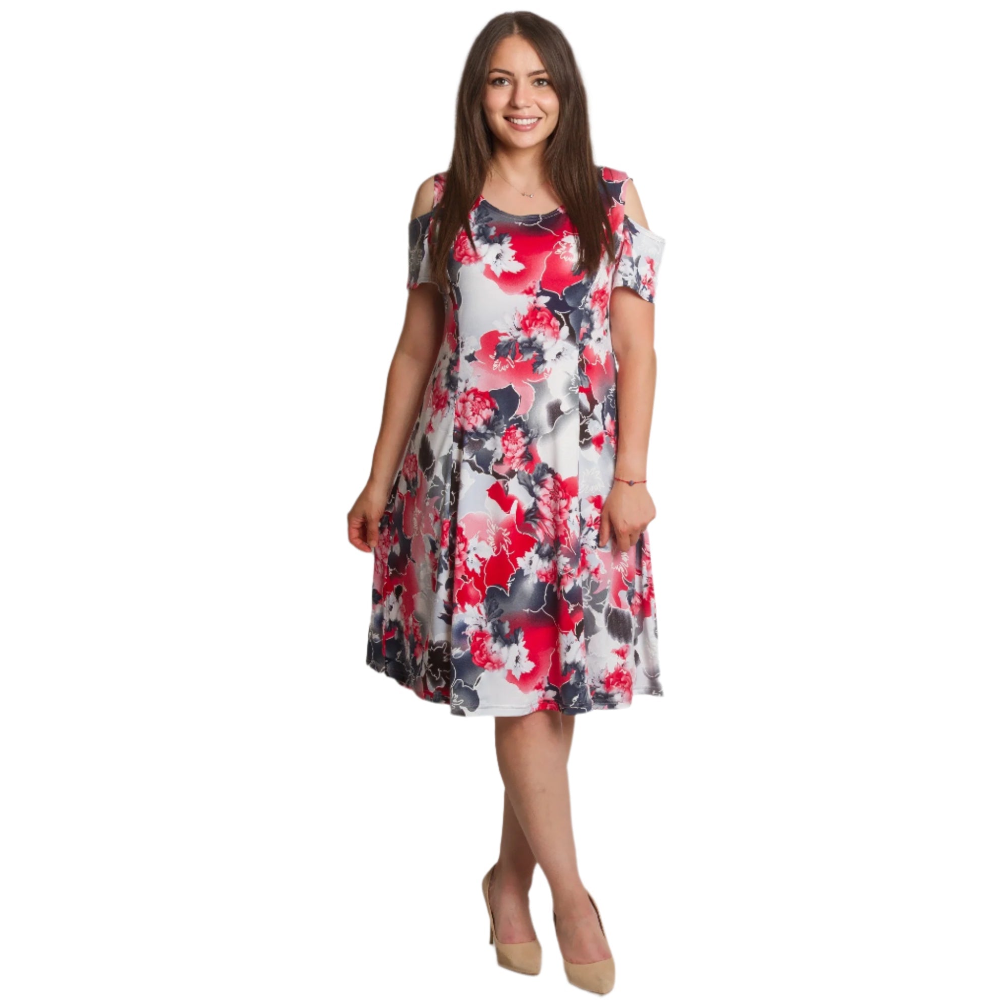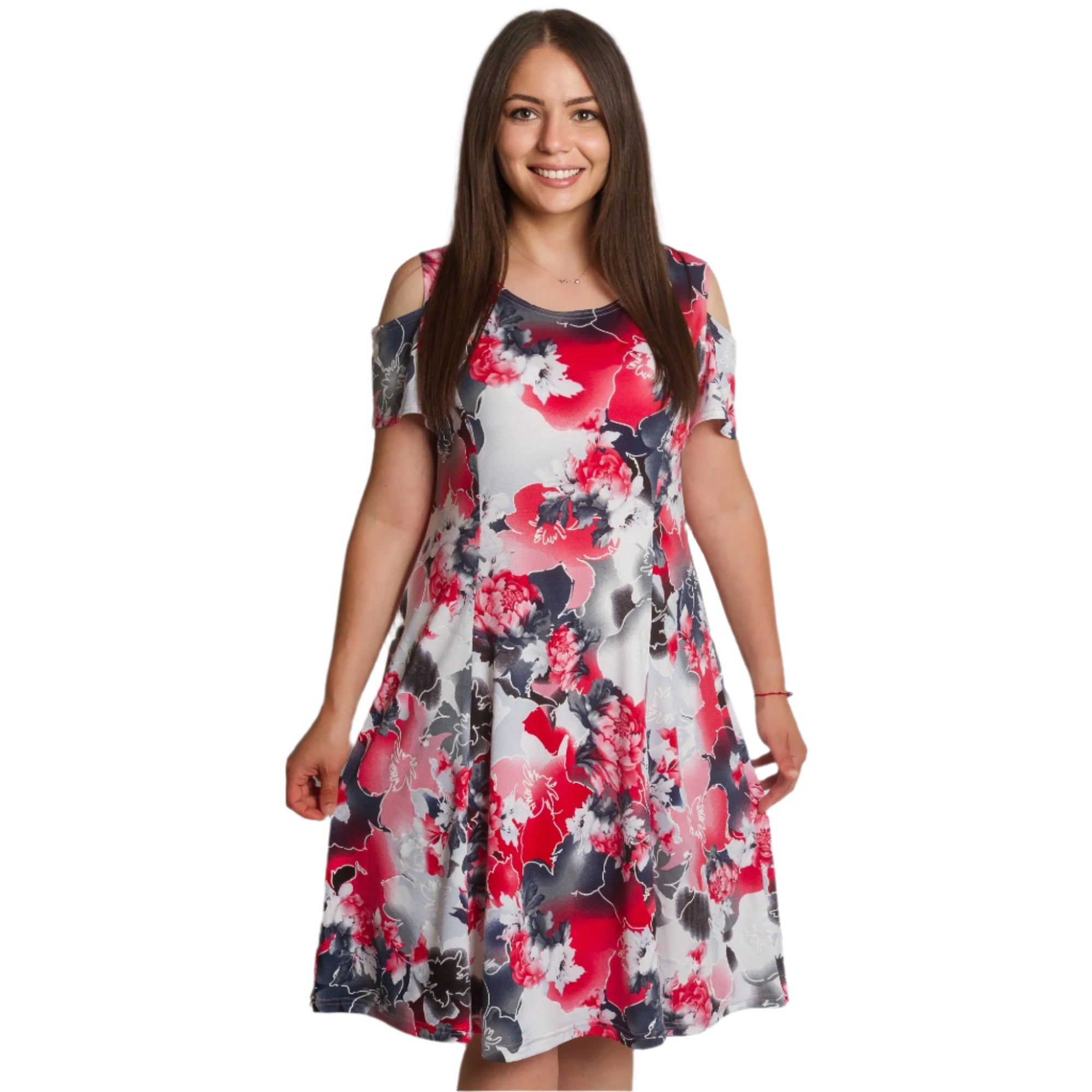 Rochie evazată cu imprimeu floral, cu umerii goi, în mărimi maxi