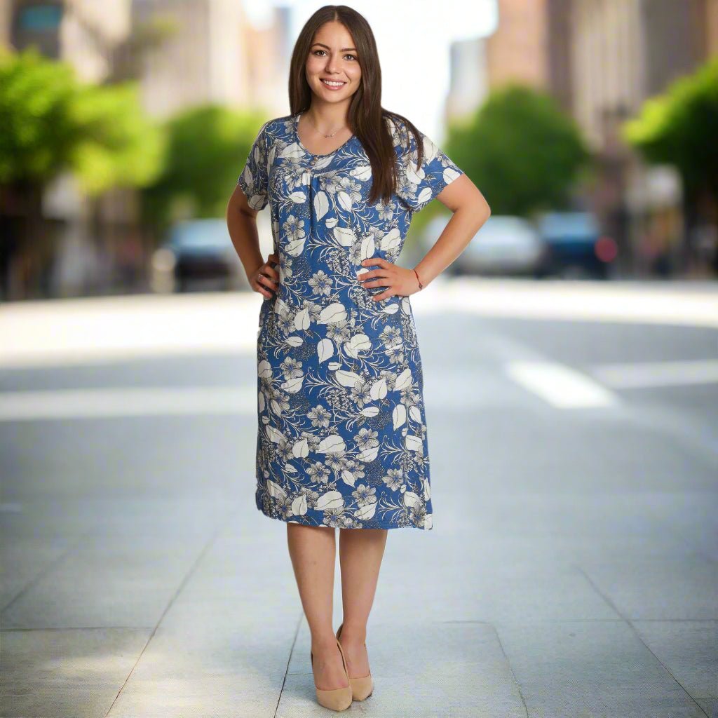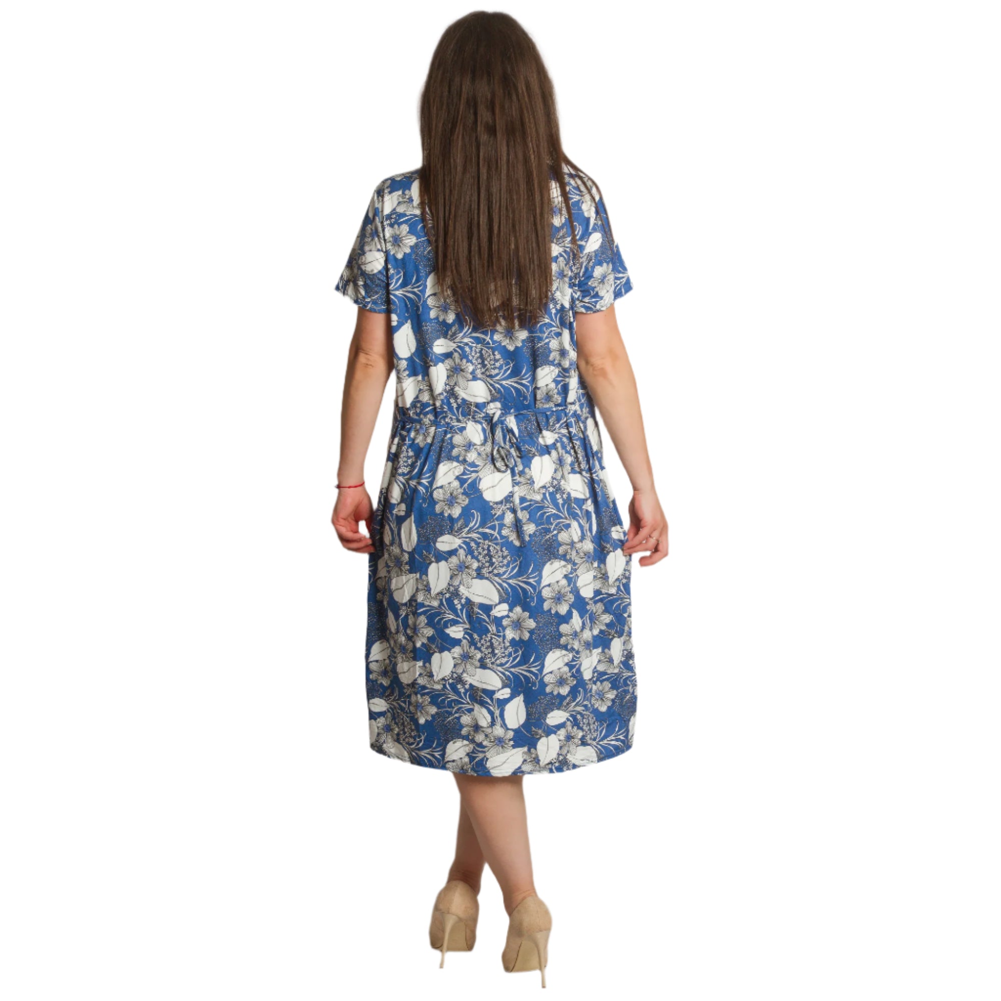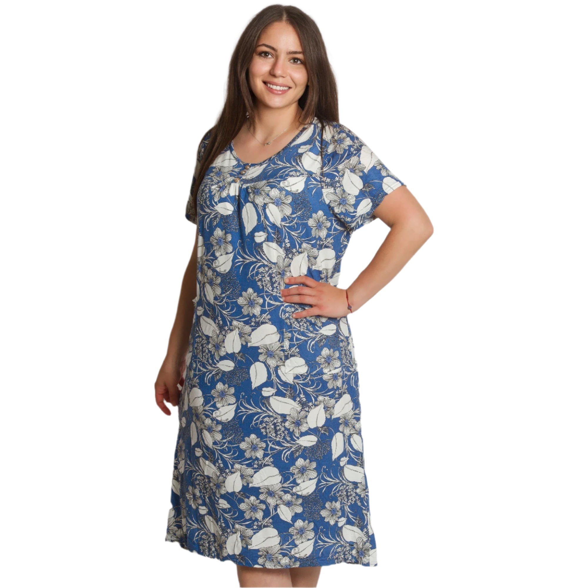 Această rochie elegantă, dreaptă, de culoare albastră, cu motive florale, este concepută special pentru doamnele cu forme voluptuoase care caută confort și feminitate într-un singur loc. Modelul are un decolteu rotund, mâneci scurte și două buzunare practice în față. Materialul ușor și elastic oferă confort pe tot parcursul zilei, iar modelul colorat conferă un aspect proaspăt și elegant, potrivit atât pentru viața de zi cu zi, cât și pentru ocaziile formale.