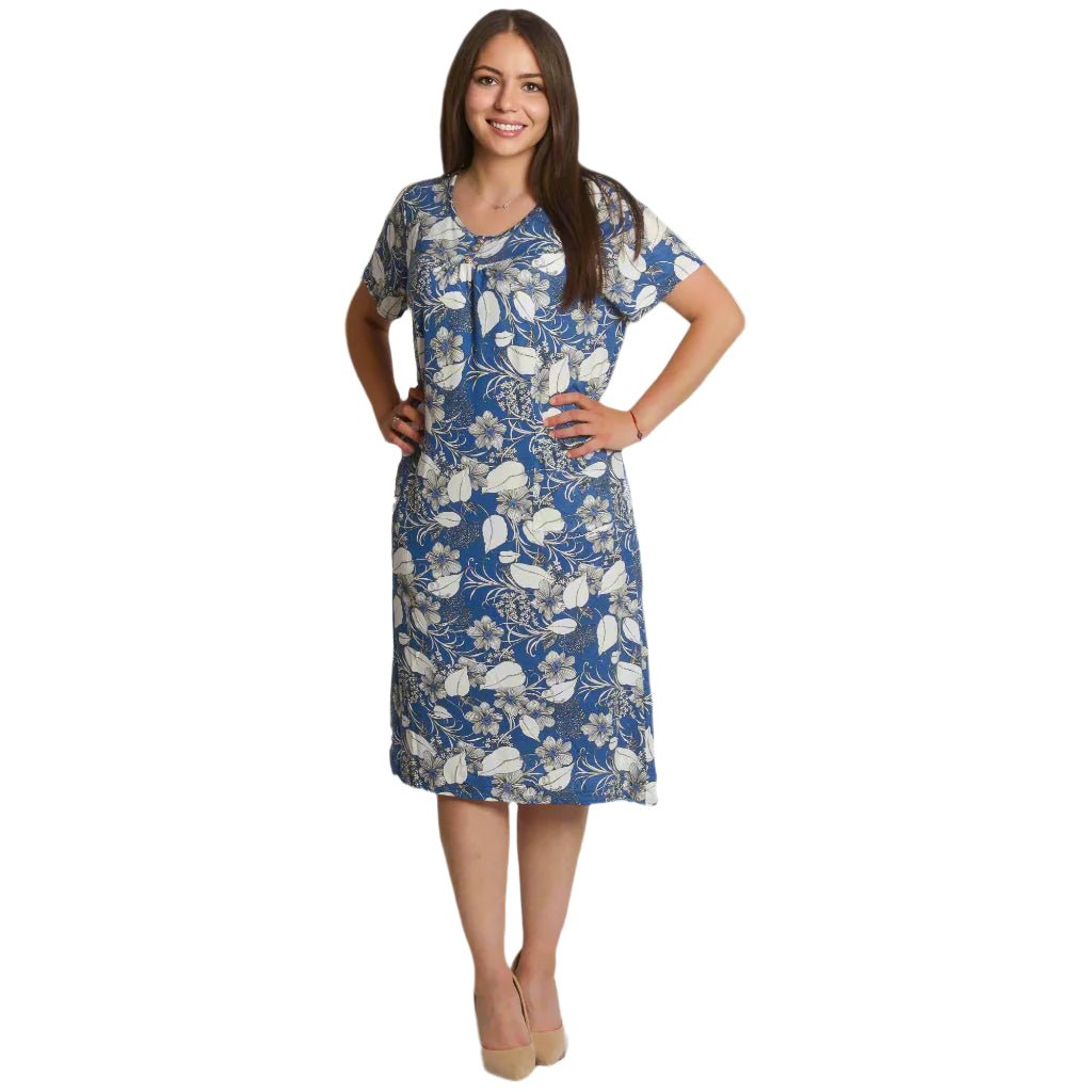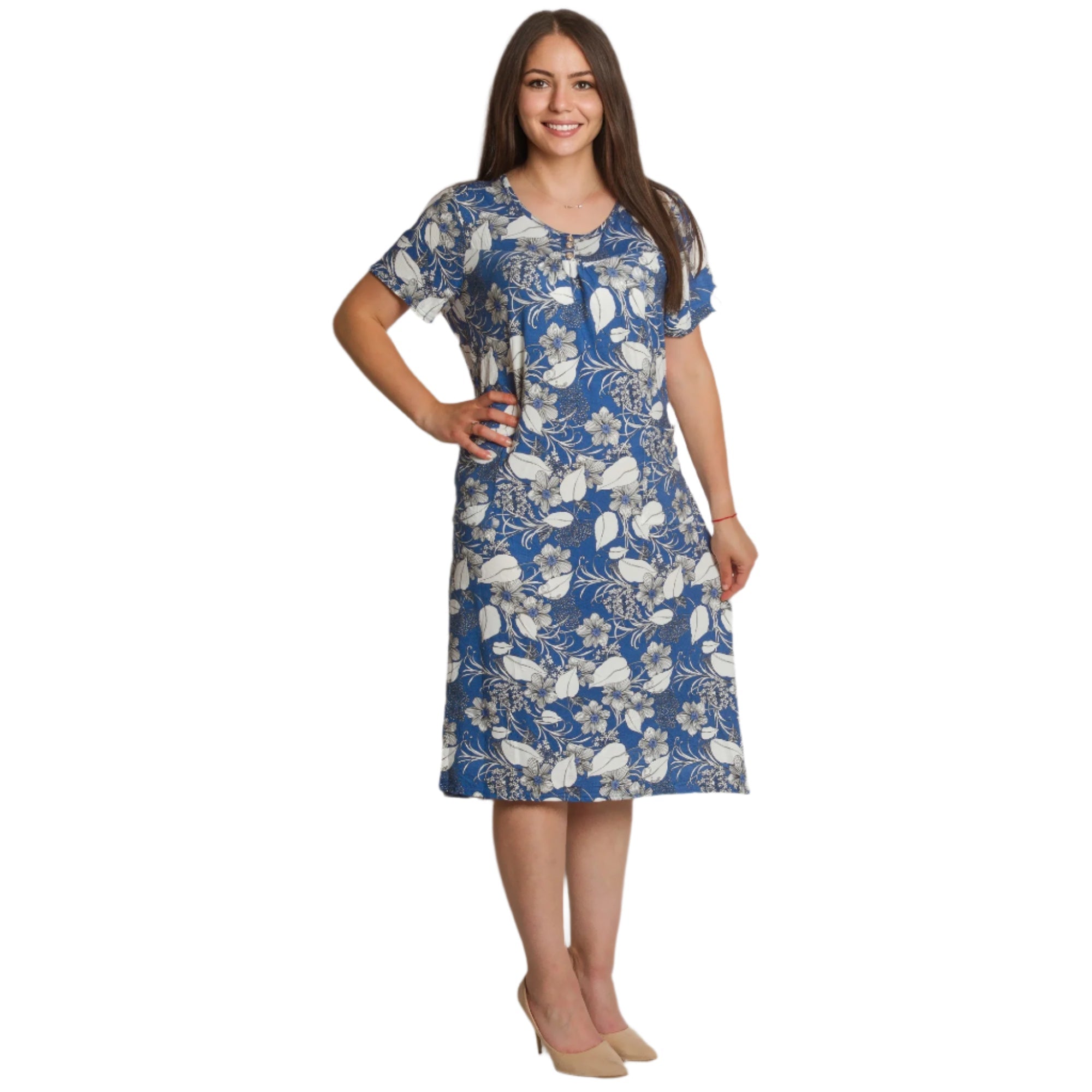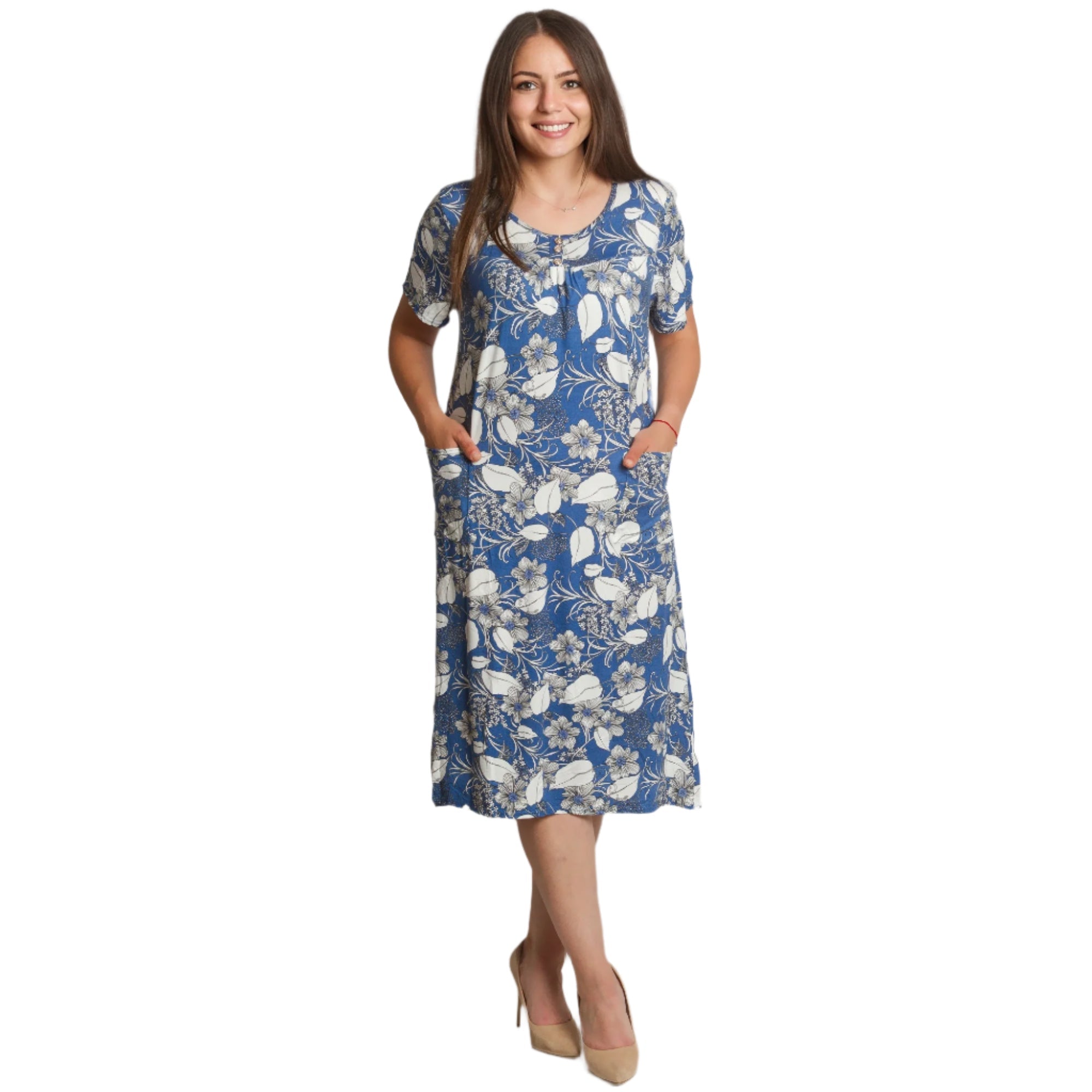 Această rochie elegantă, dreaptă, de culoare albastră, cu motive florale, este concepută special pentru doamnele cu forme voluptuoase care caută confort și feminitate într-un singur loc. Modelul are un decolteu rotund, mâneci scurte și două buzunare practice în față. Materialul ușor și elastic oferă confort pe tot parcursul zilei, iar modelul colorat conferă un aspect proaspăt și elegant, potrivit atât pentru viața de zi cu zi, cât și pentru ocaziile formale.