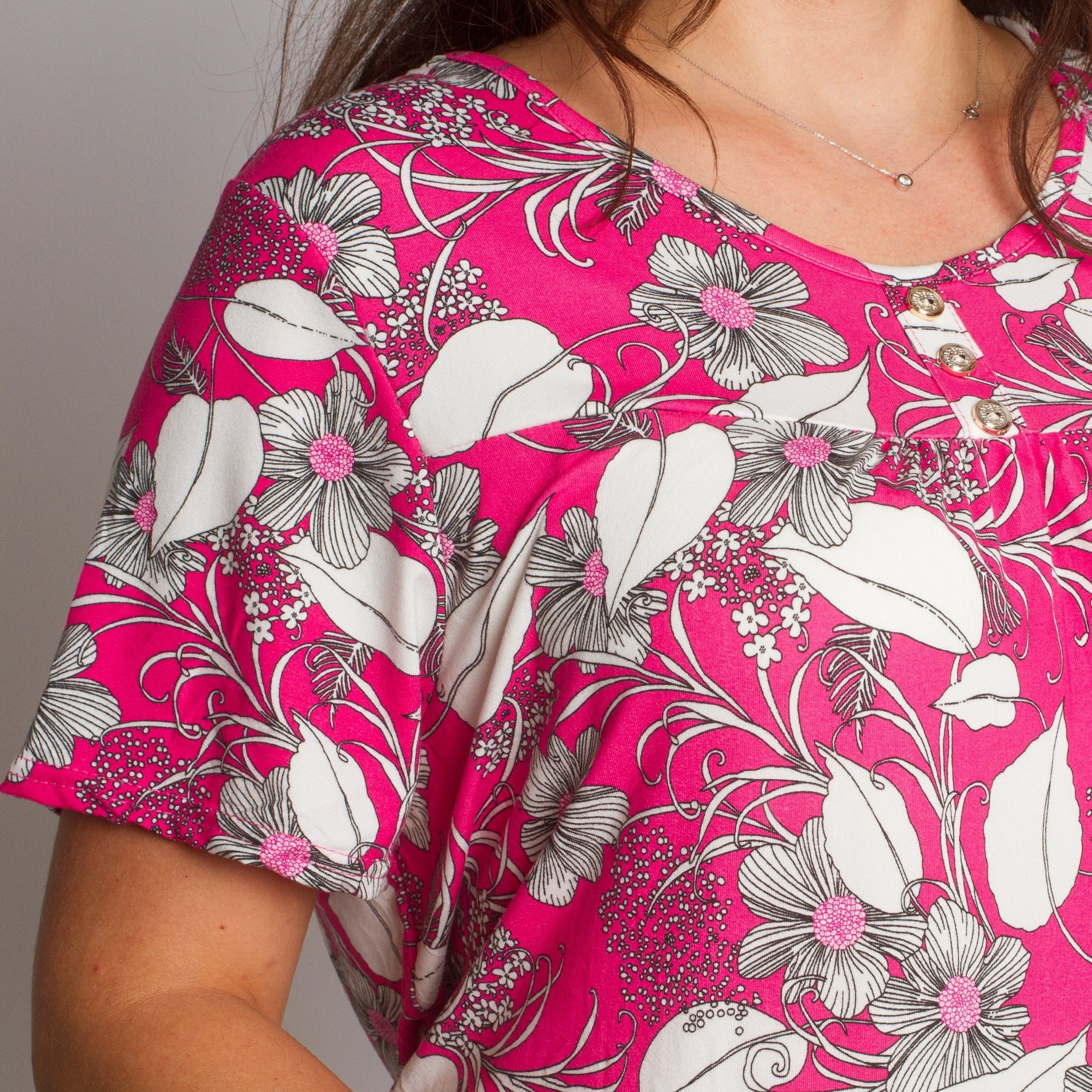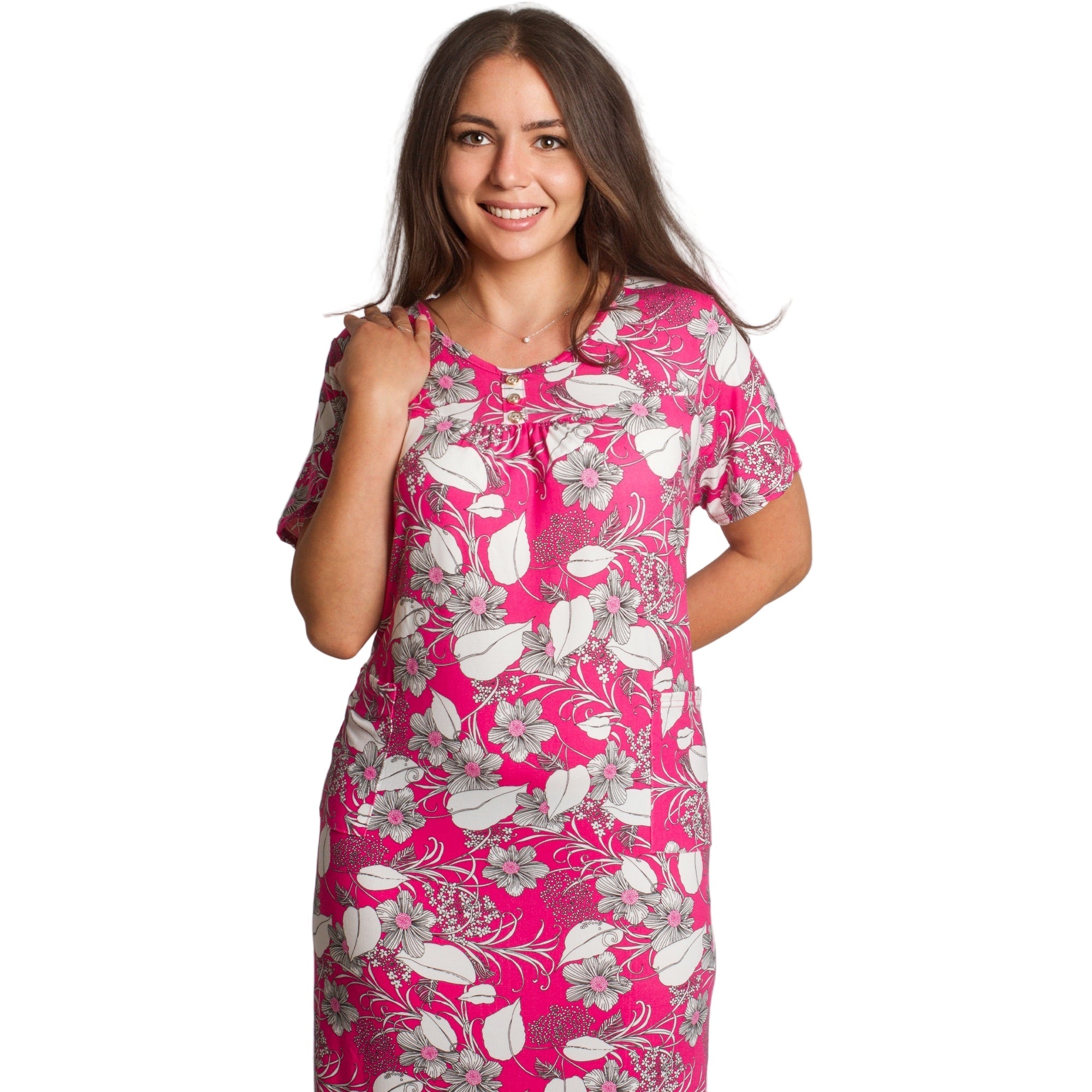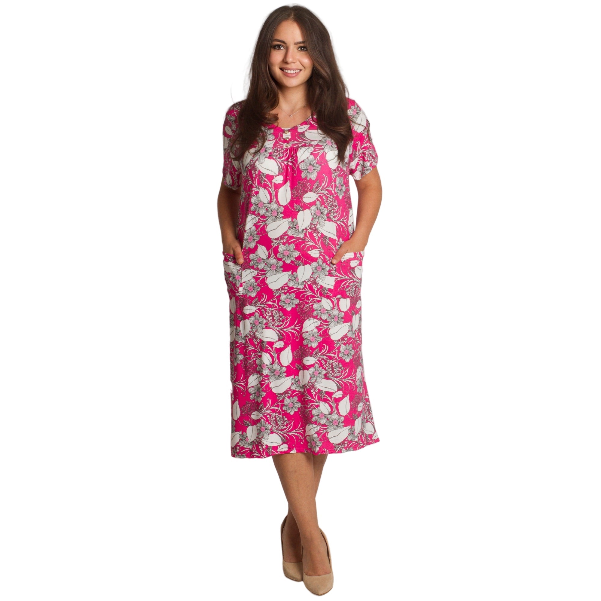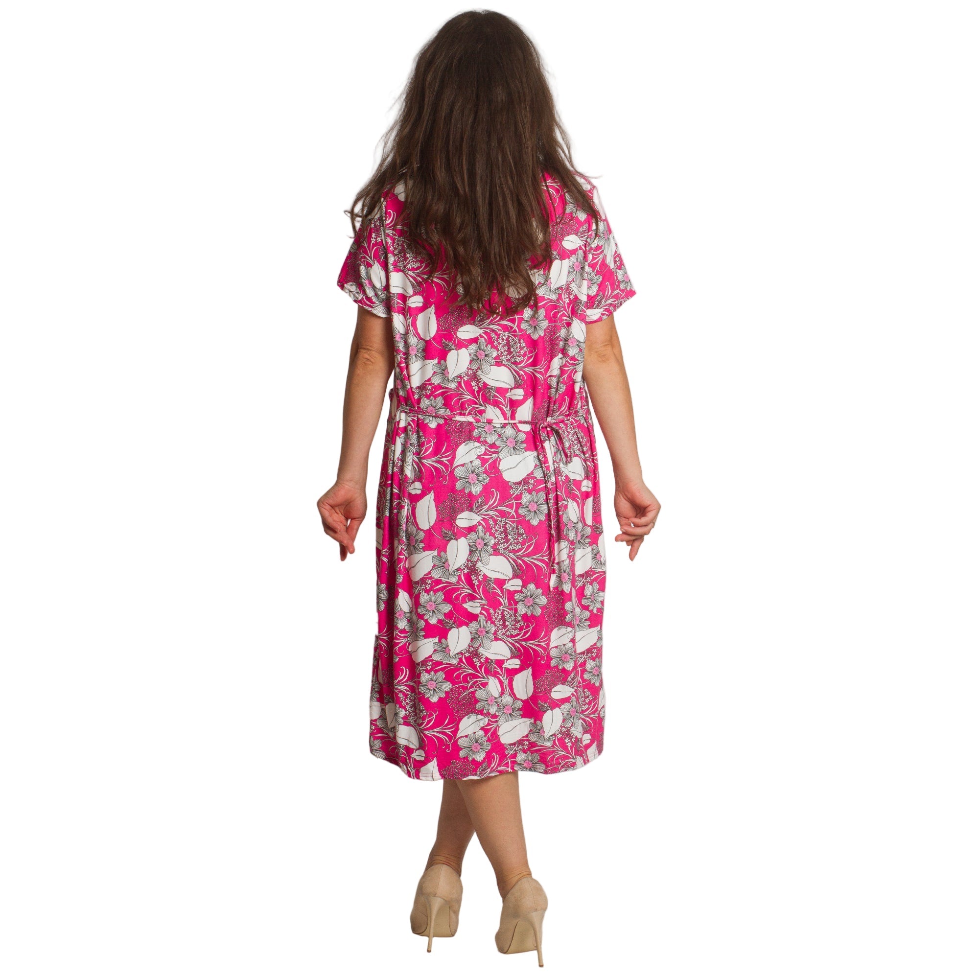Această rochie elegantă, dreaptă, de culoare roz, cu motive florale, este concepută special pentru doamnele cu forme voluptuoase care caută confort și feminitate într-un singur loc. Modelul are un decolteu rotund, mâneci scurte și două buzunare practice în față. Materialul ușor și elastic oferă confort pe tot parcursul zilei, iar modelul floral conferă un aspect proaspăt și elegant, potrivit atât pentru viața de zi cu zi, cât și pentru ocaziile formale.