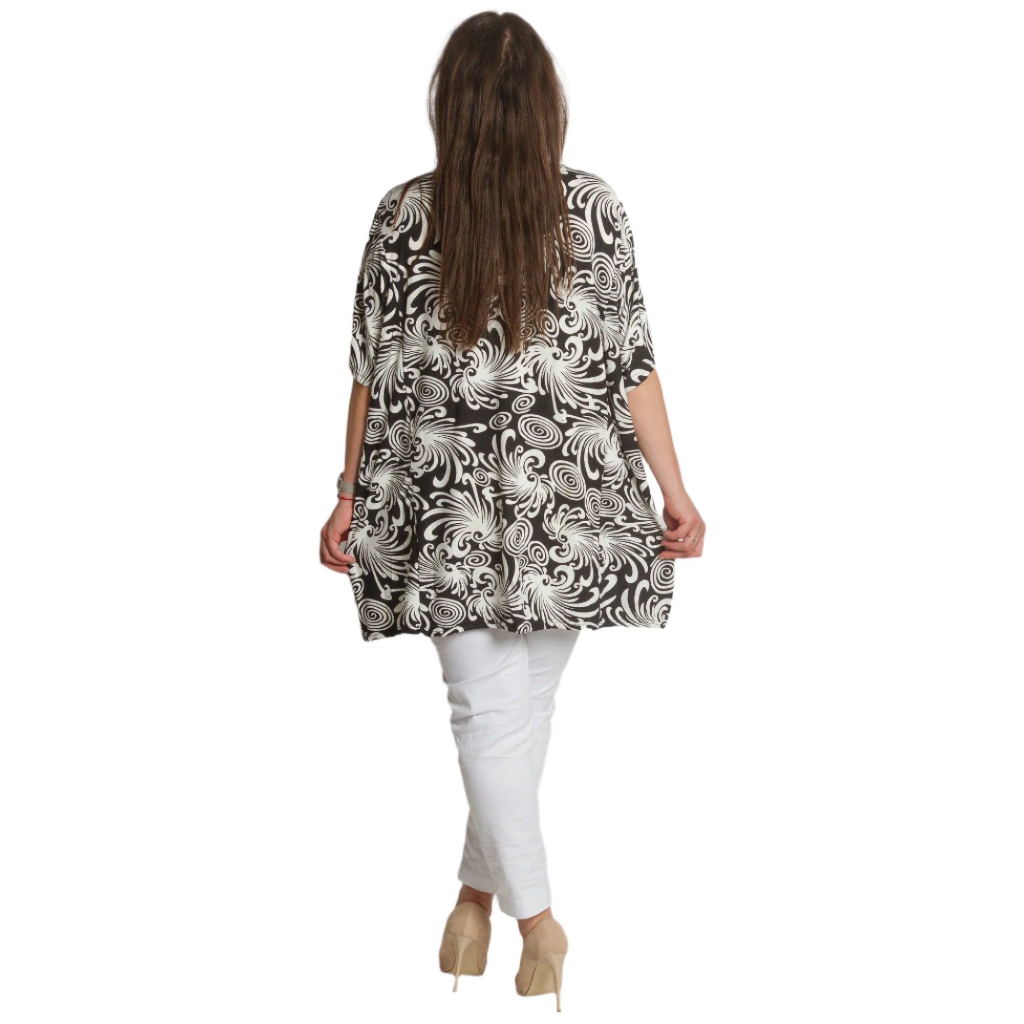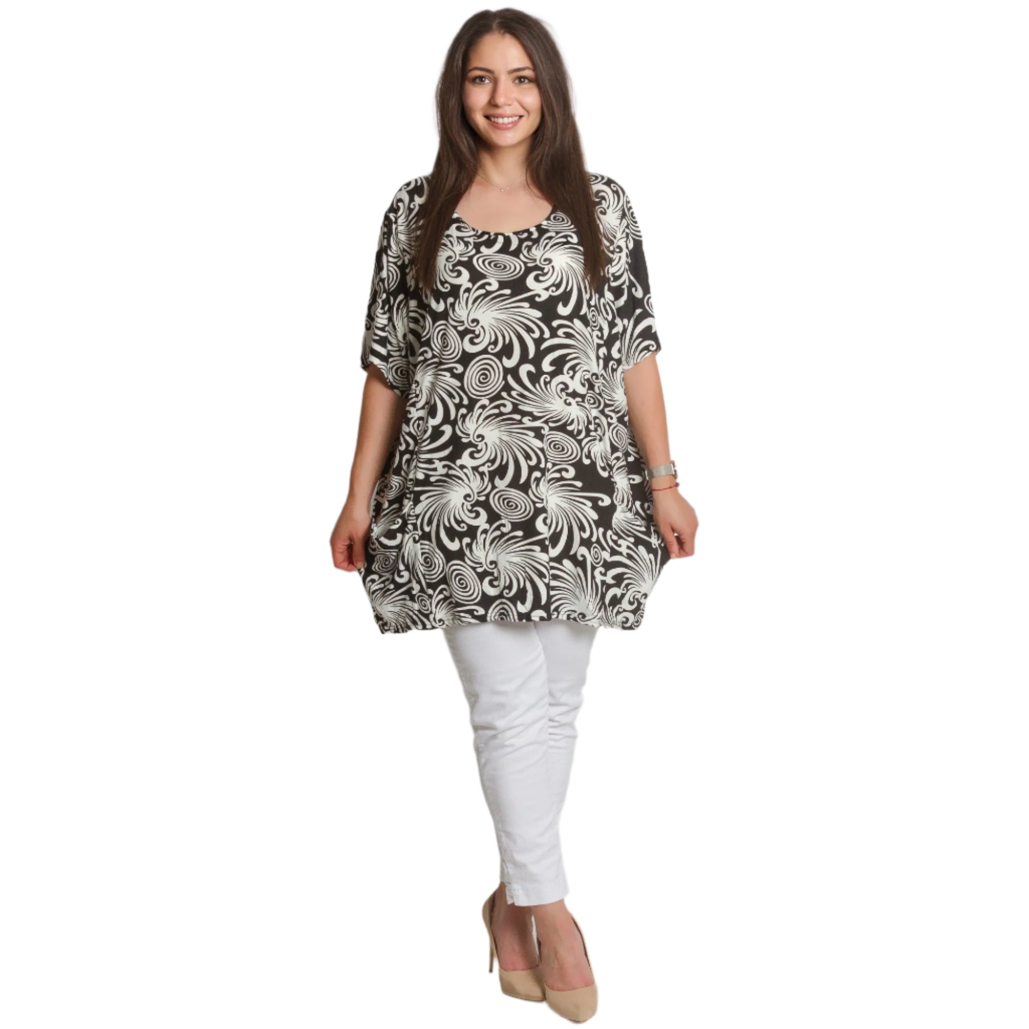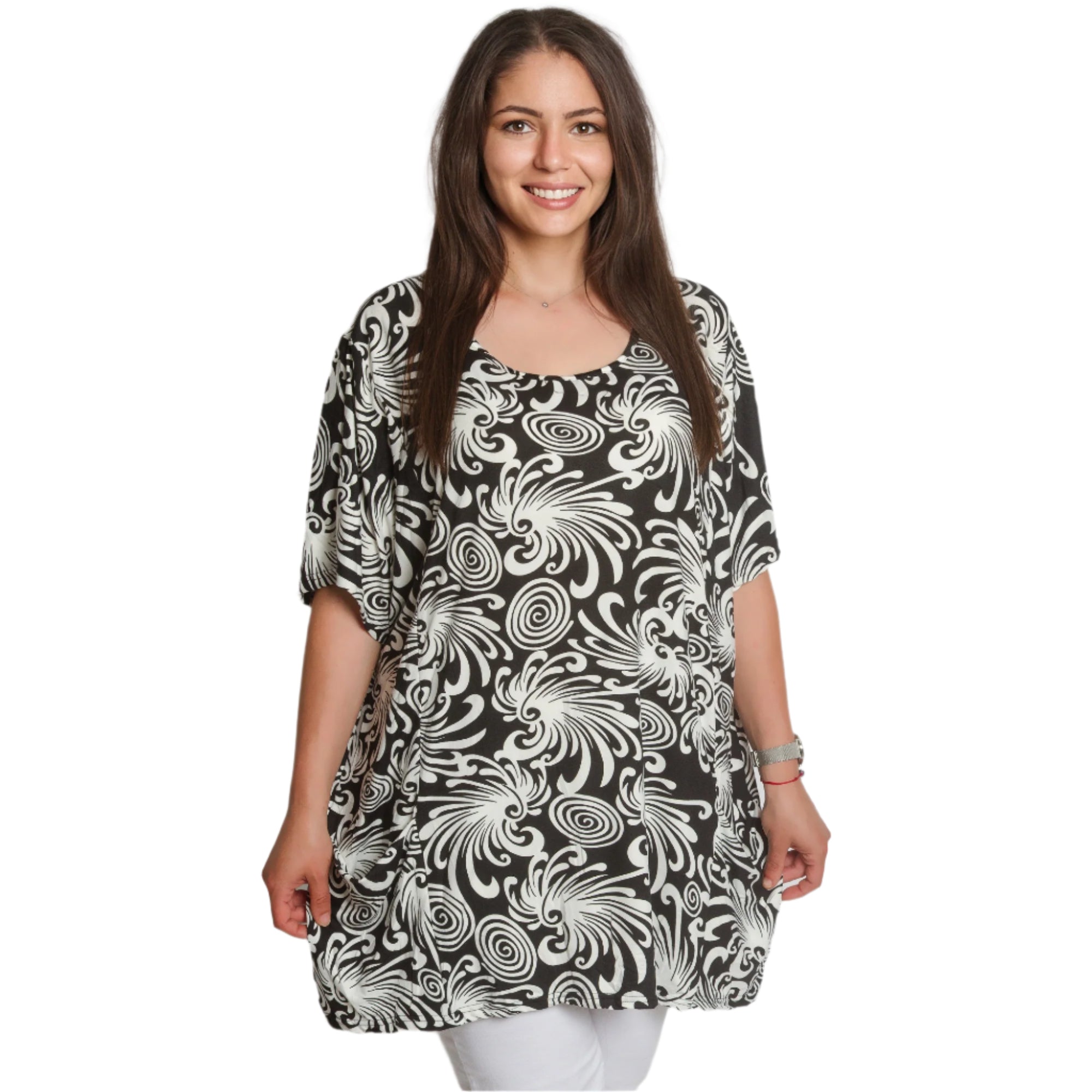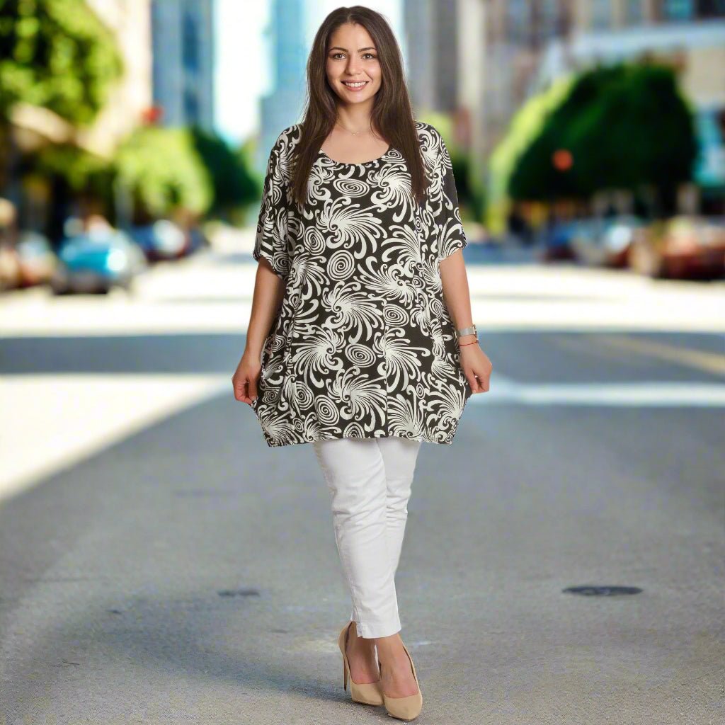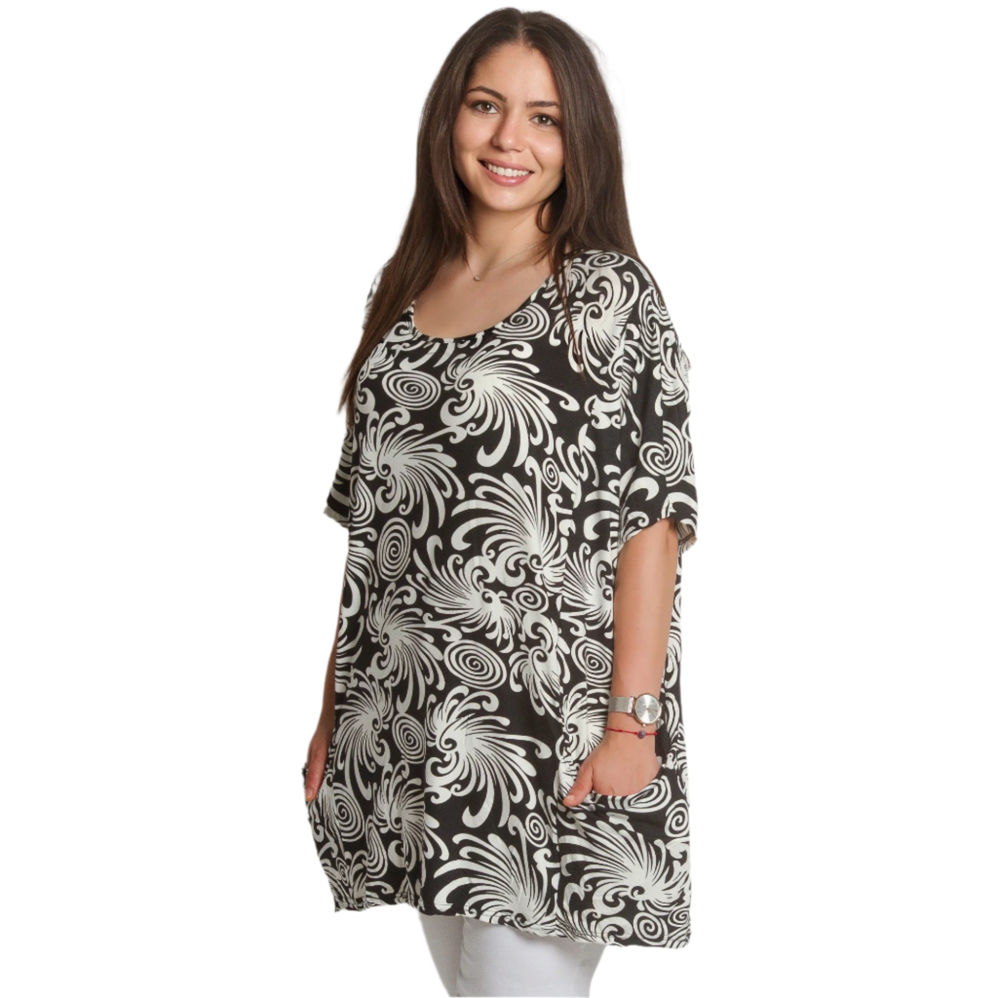 Tunică maxi neagră cu model abstract și buzunare