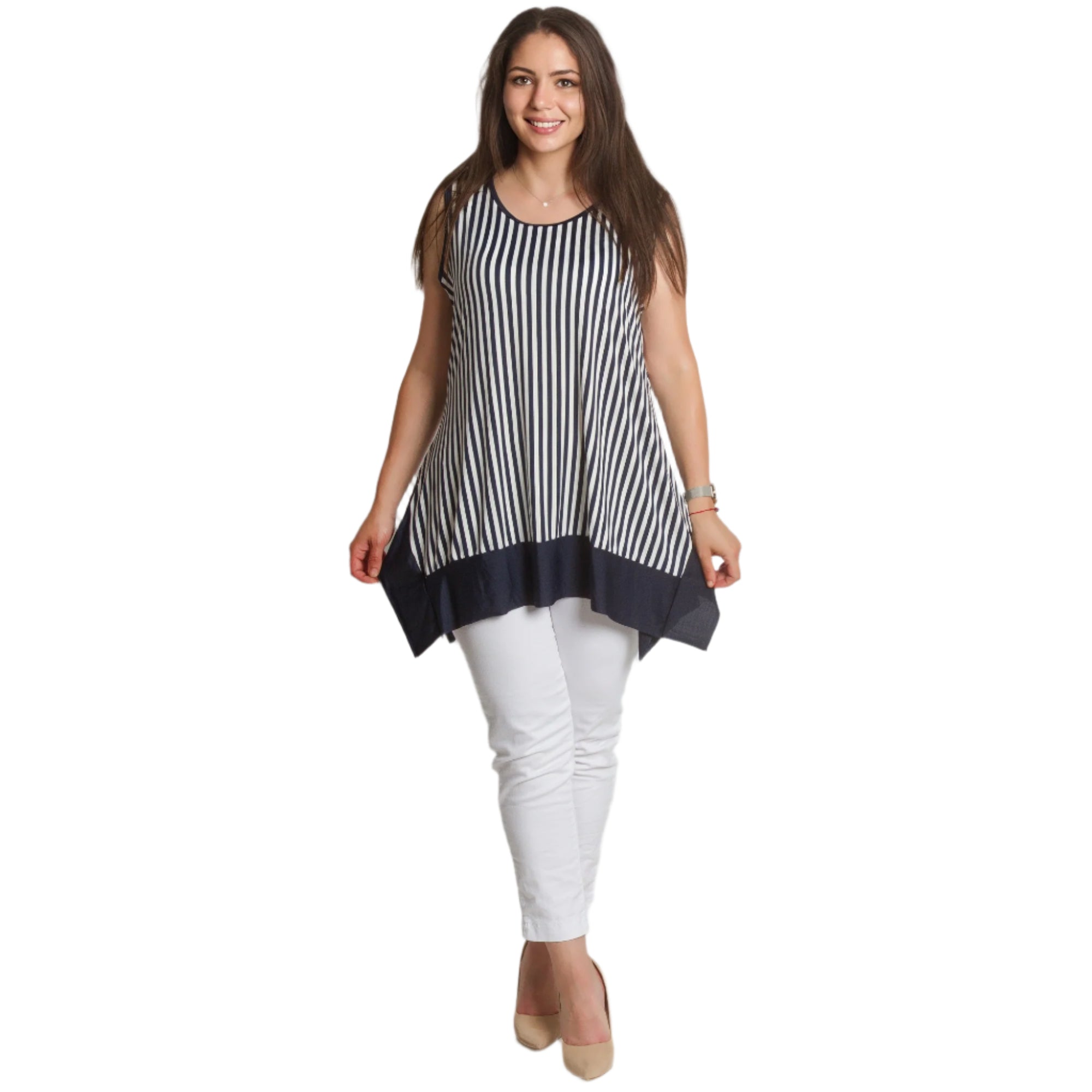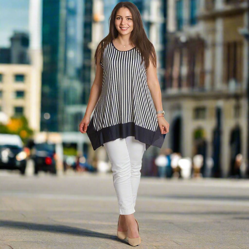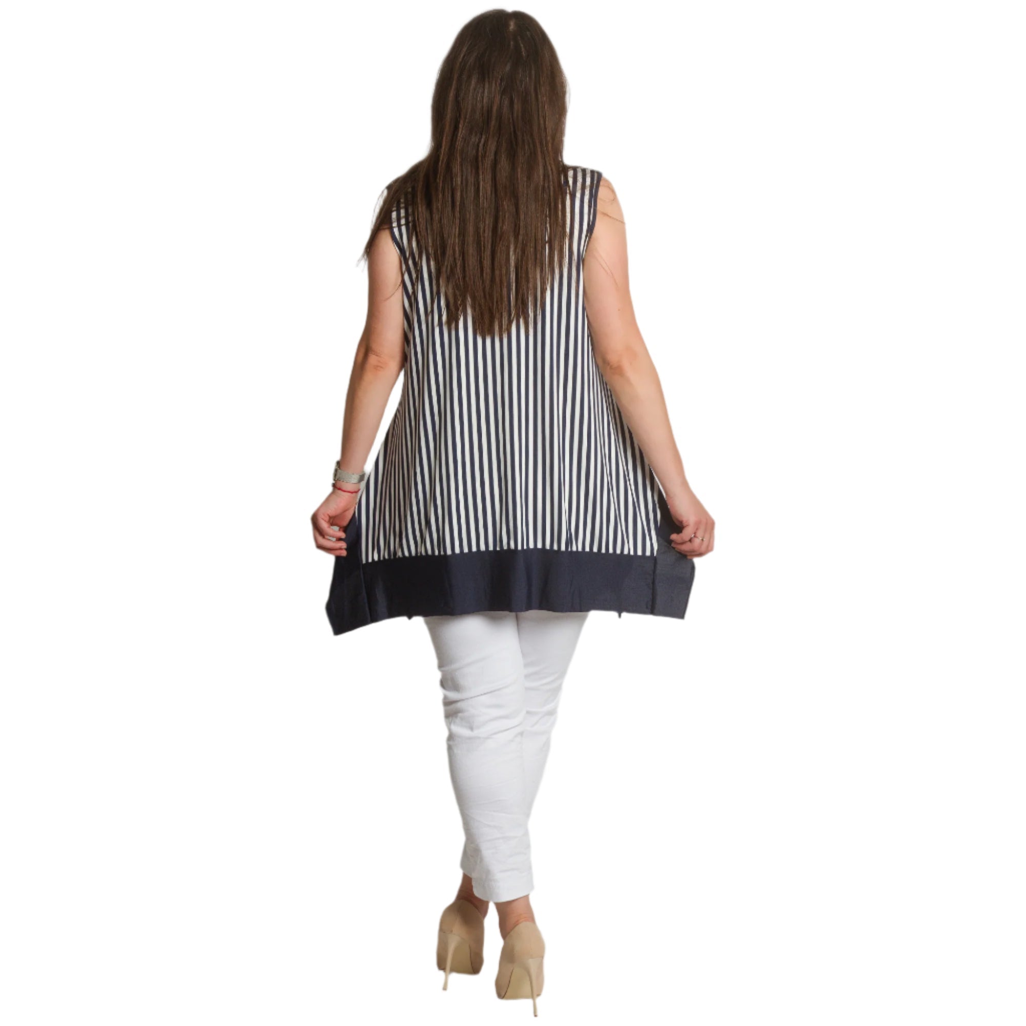 Reîmprospătează-ți garderoba de vară cu acest maiou elegant, scurt, în dungi bleumarin și albe. Modelul este fără mâneci, cu un decolteu rotund confortabil și un tiv asimetric interesant, într-un finisaj bleumarin solid. Croiul lejer creează o siluetă vaporoasă care acoperă zonele dorite, oferind în același timp confort pe tot parcursul zilei. Potrivit atât pentru viața de zi cu zi, cât și pentru ocazii mai elegante în lunile mai calde.