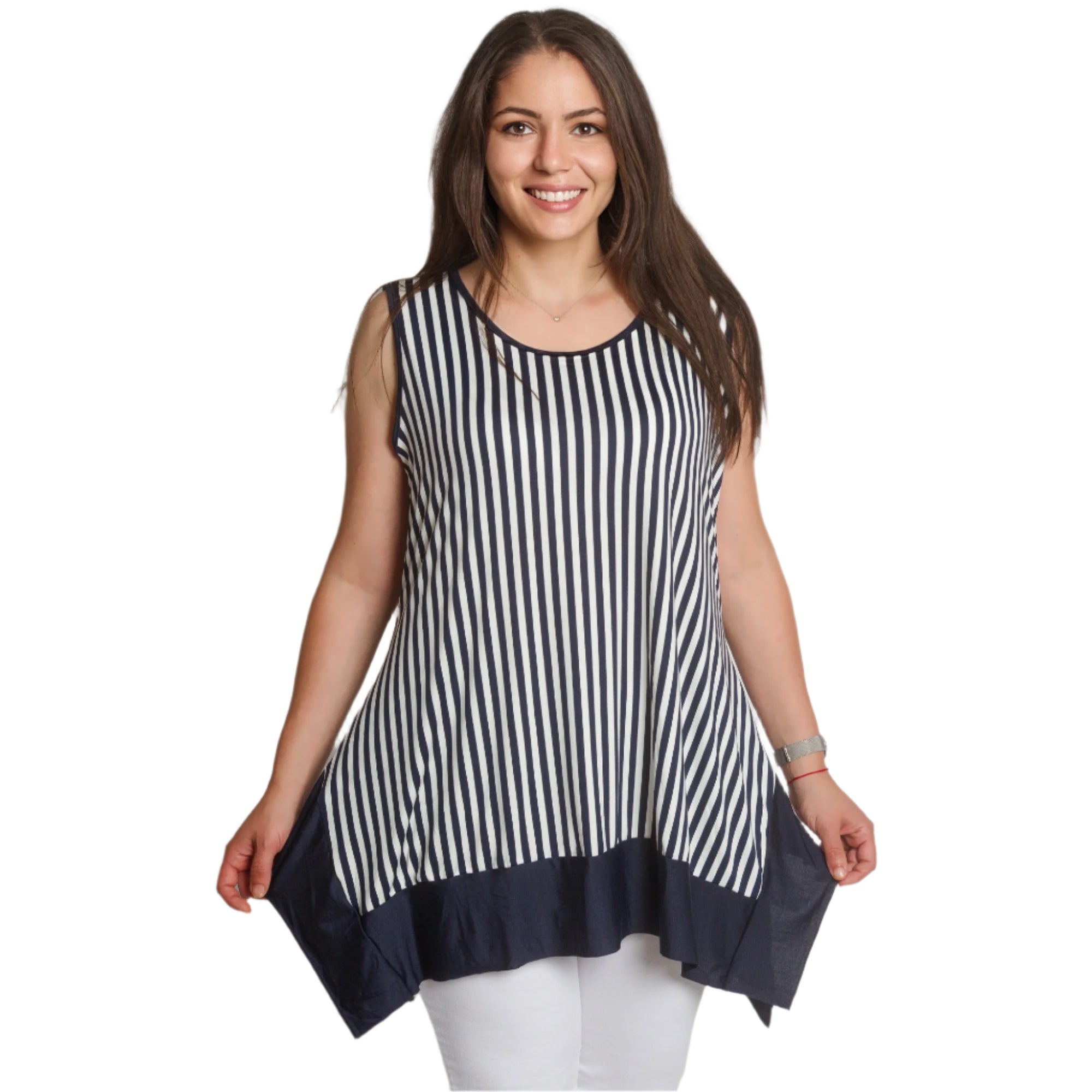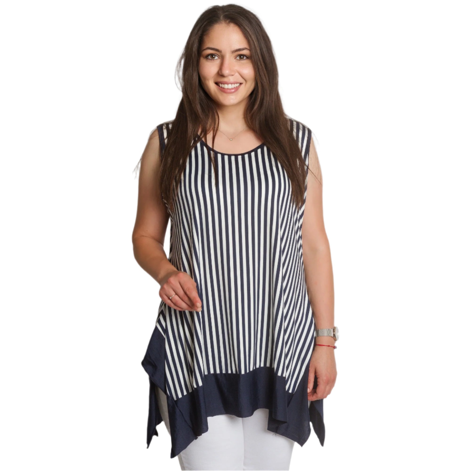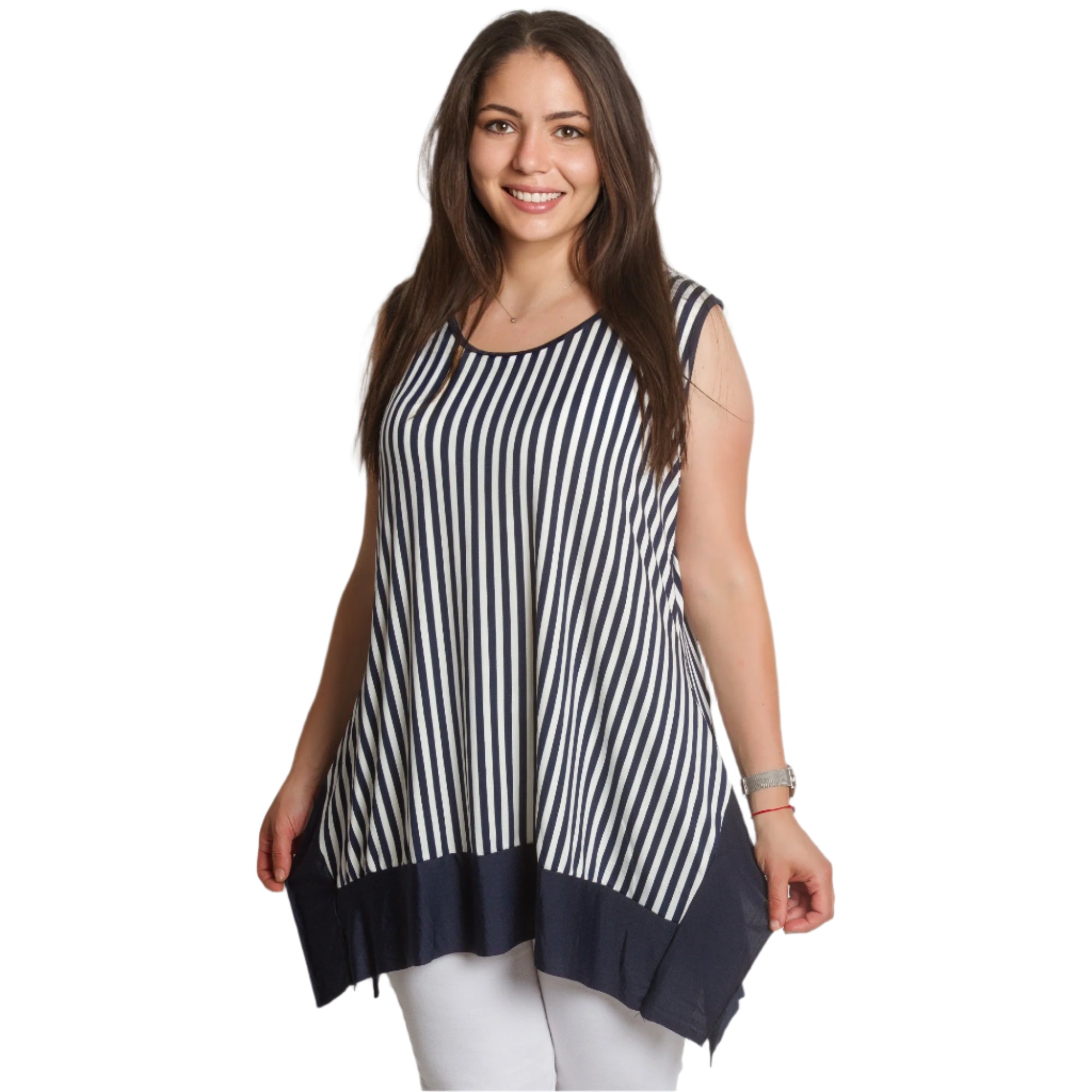 Reîmprospătează-ți garderoba de vară cu acest maiou elegant, scurt, în dungi bleumarin și albe. Modelul este fără mâneci, cu un decolteu rotund confortabil și un tiv asimetric interesant, într-un finisaj bleumarin solid. Croiul lejer creează o siluetă vaporoasă care acoperă zonele dorite, oferind în același timp confort pe tot parcursul zilei. Potrivit atât pentru viața de zi cu zi, cât și pentru ocazii mai elegante în lunile mai calde.