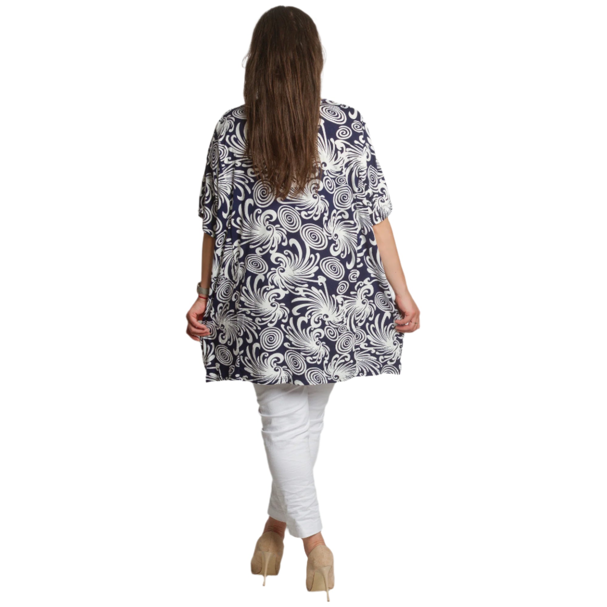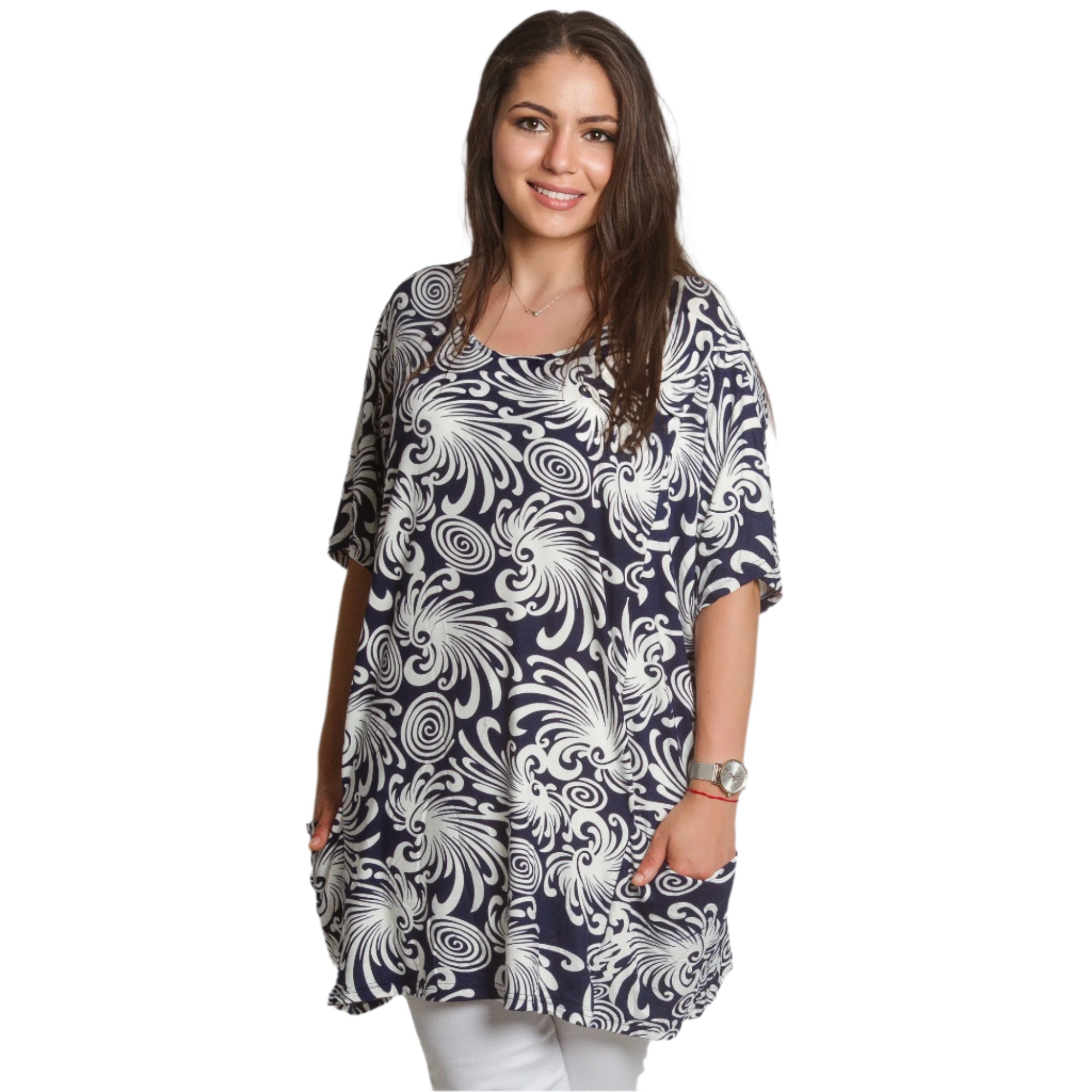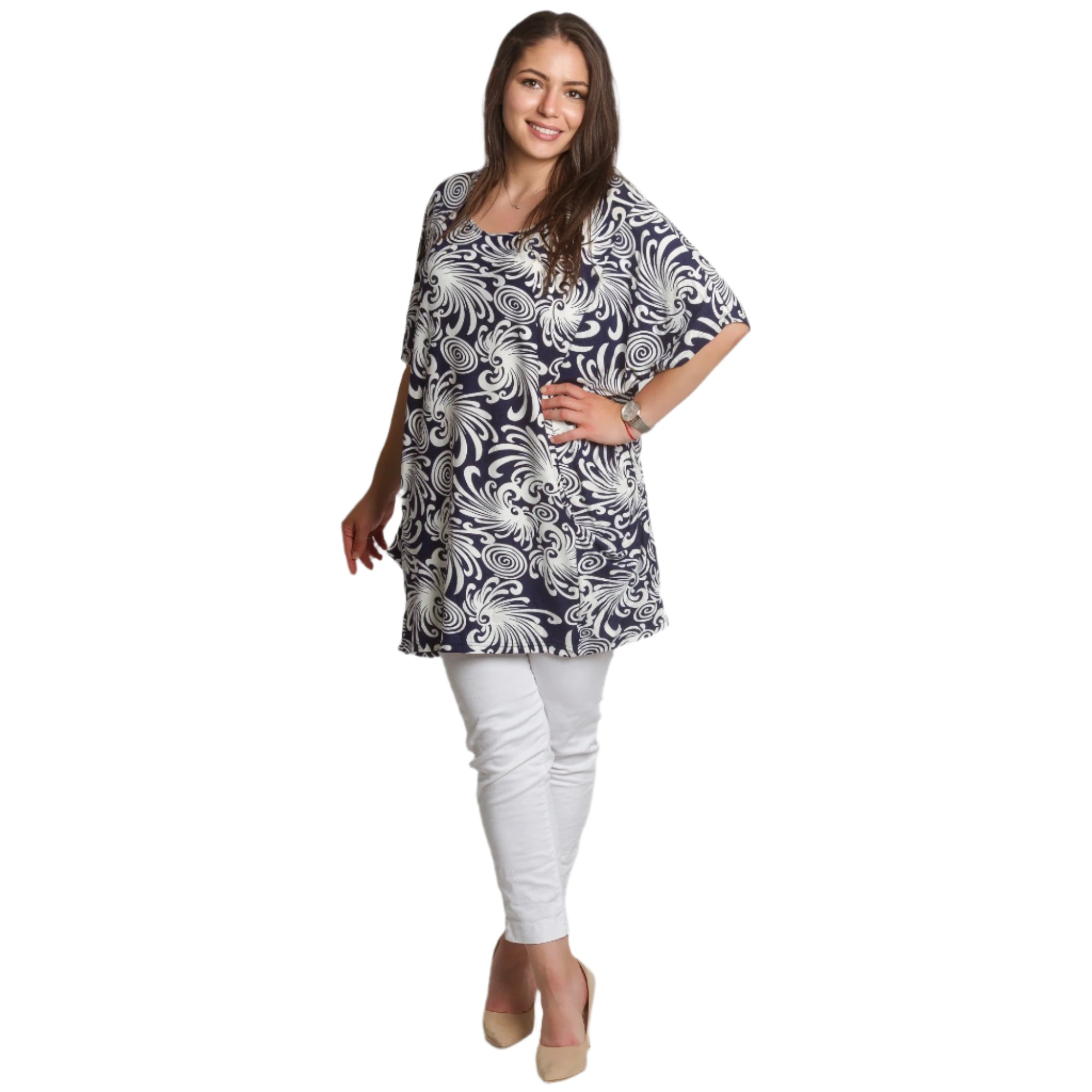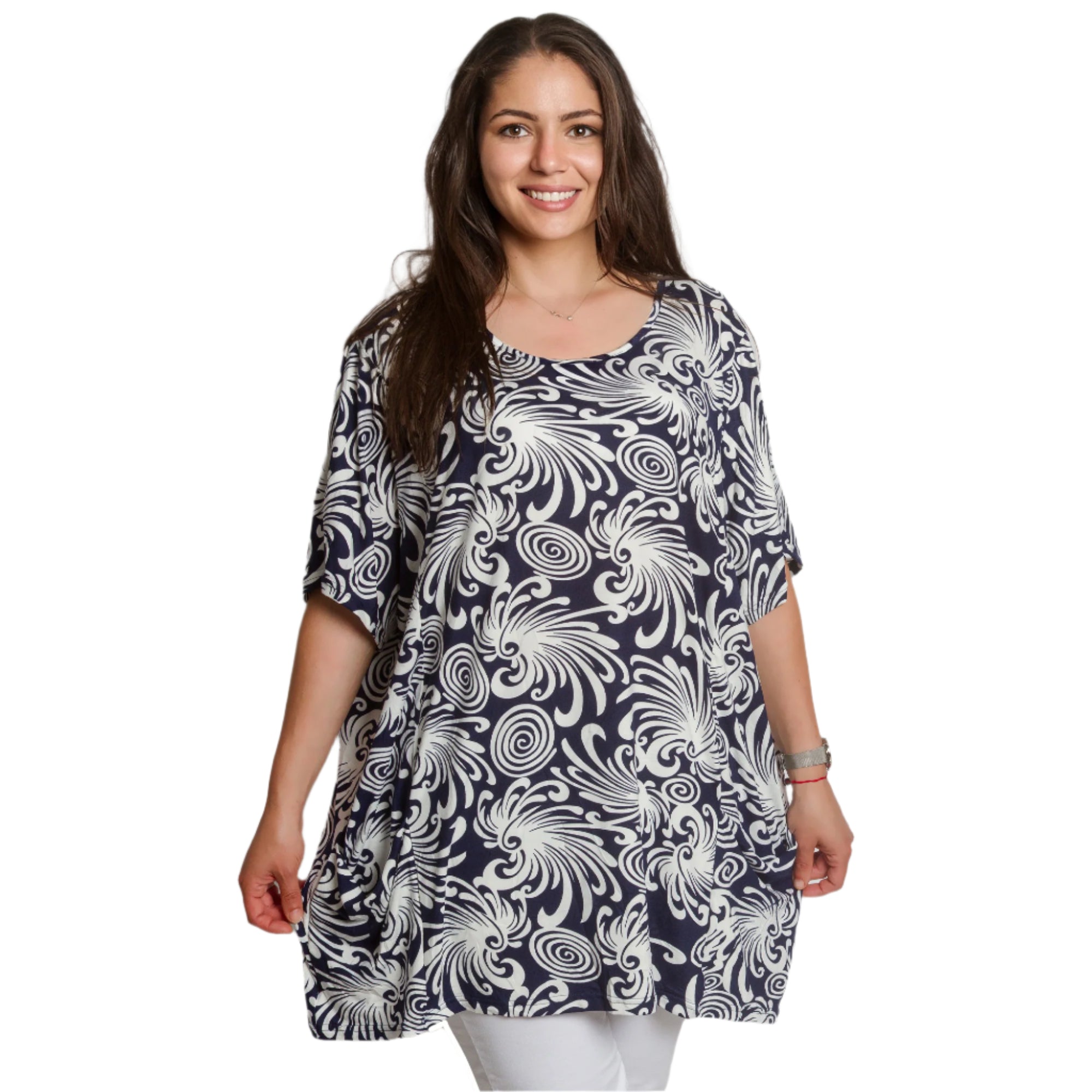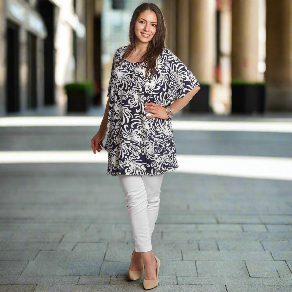 Simte-te confortabil și elegantă cu această tunică neagră cu imprimeu artistic alb. Modelul are un decolteu rotund, o croială lejeră și buzunare laterale pentru mai multă practicitate. Este potrivită atât pentru viața de zi cu zi, cât și pentru ocazii mai formale. Combină-o cu pantaloni sau colanți albi pentru un look stilat în zilele de primăvară și vară.