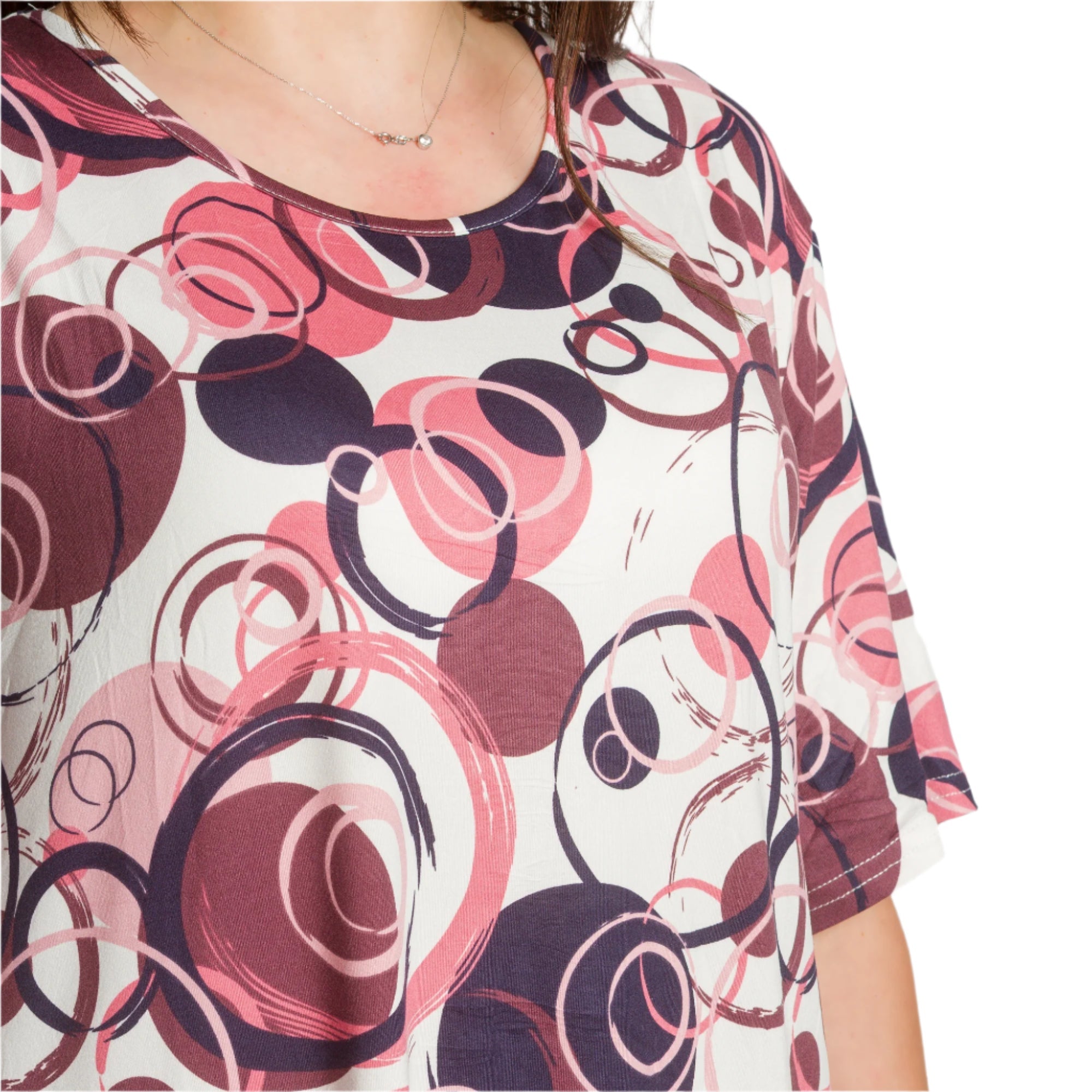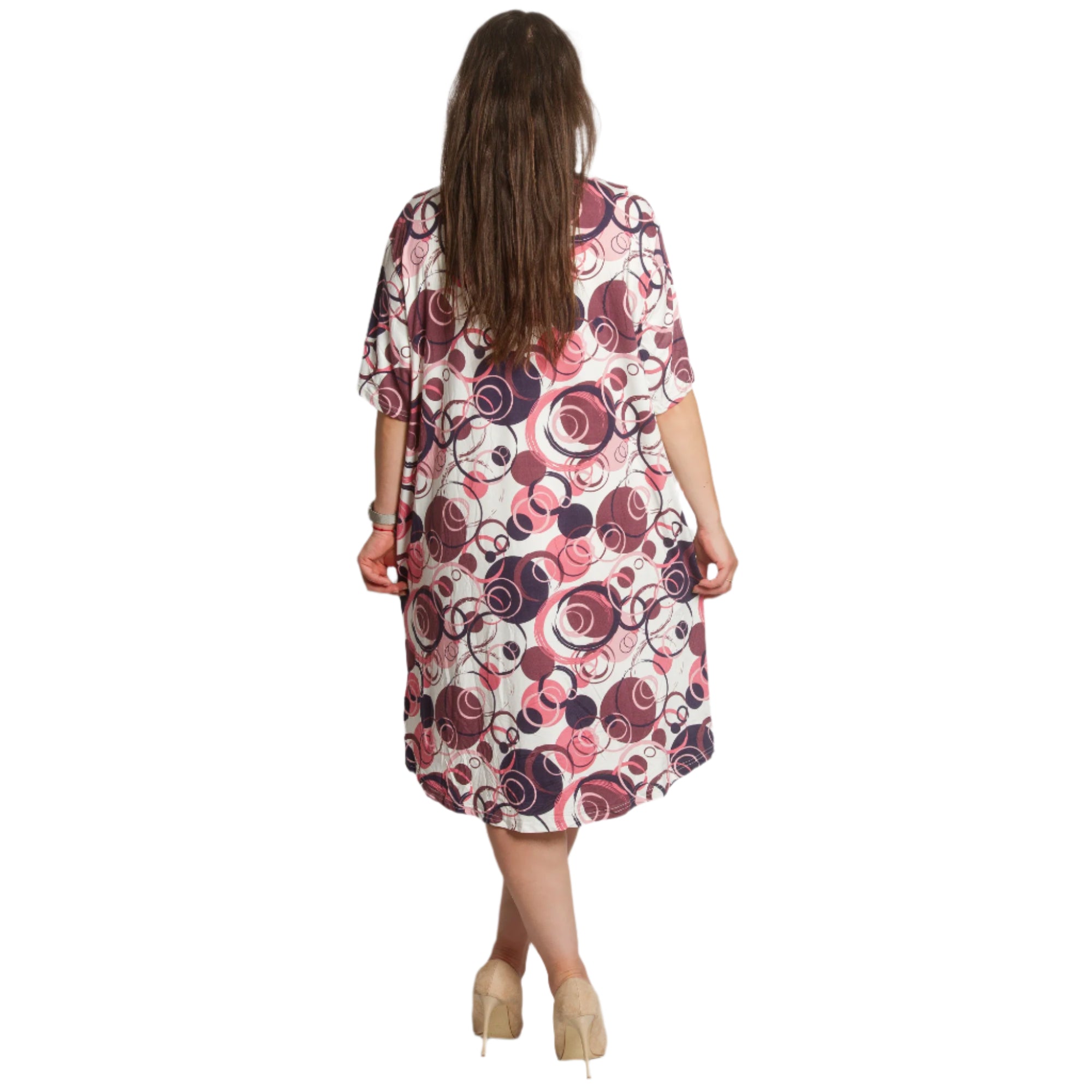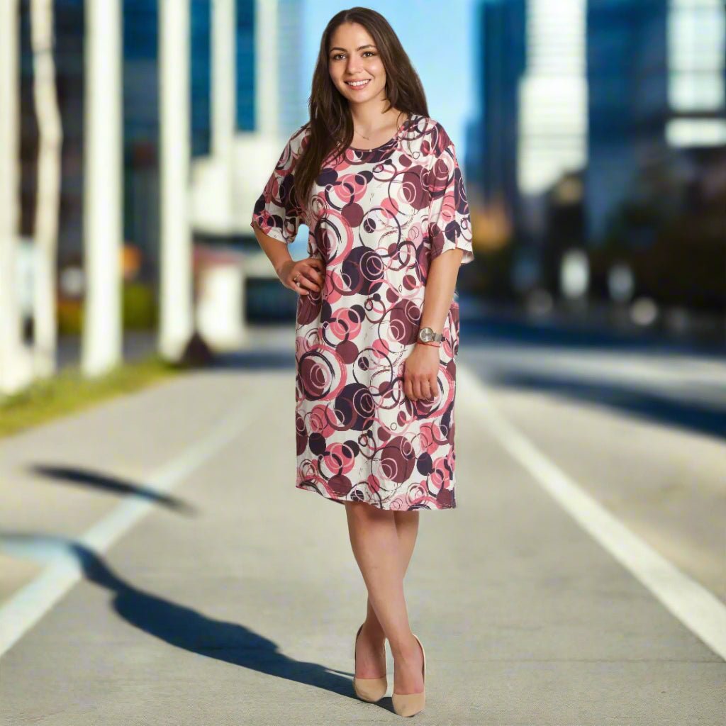 O rochie ușoară și confortabilă, cu o lungime modernă până la genunchi, potrivită atât pentru viața de zi cu zi, cât și pentru ocazii mai formale. Modelul are un decolteu rotund și o croială lejeră care oferă confort și libertate de mișcare. Rochia este confecționată din material elastic care se adaptează corpului, iar buzunarele adaugă un accent practic. Cea din dreapta cu cercuri în roz, mov și bordo este ideală pentru sezonul primăvară-vară și conferă un aspect artistic.