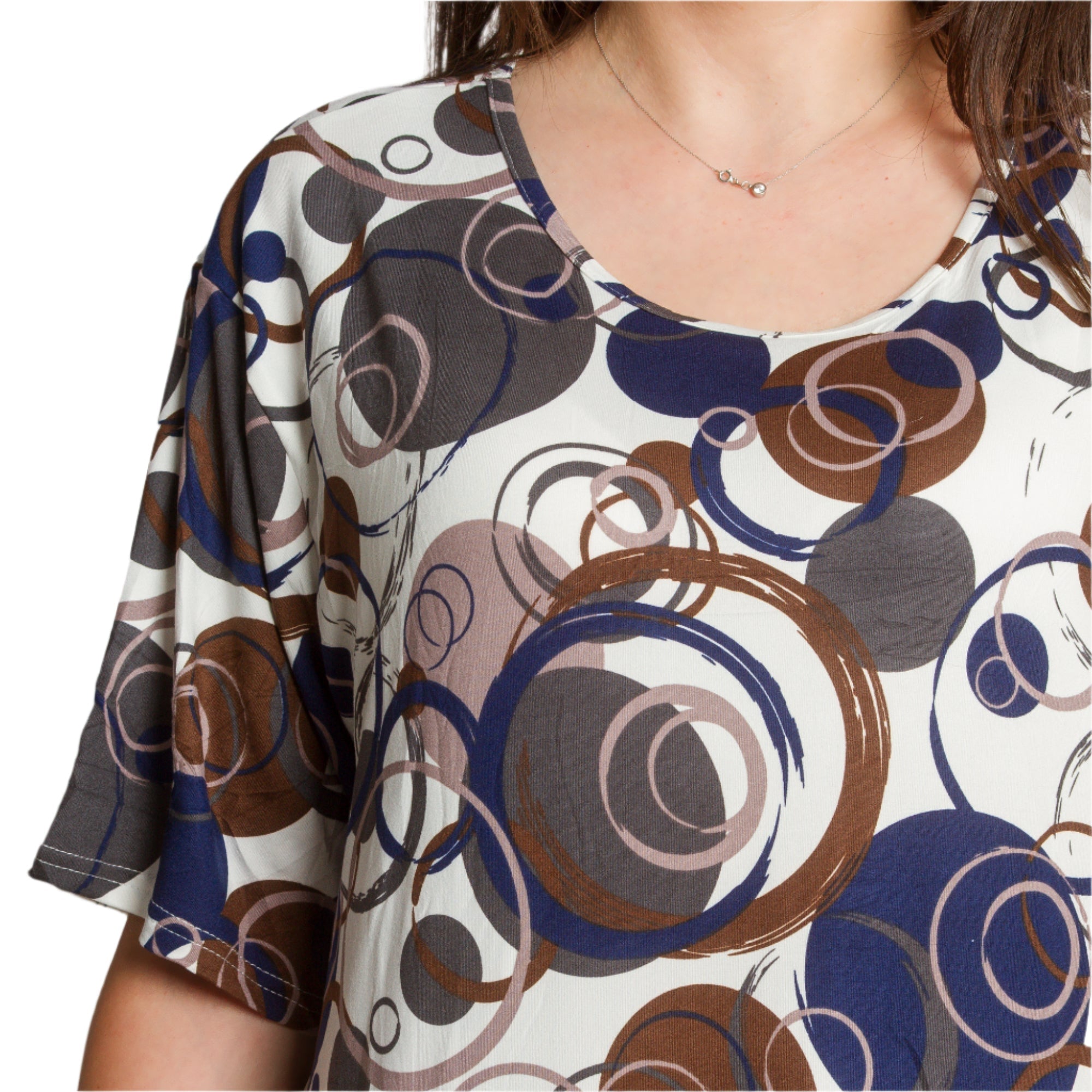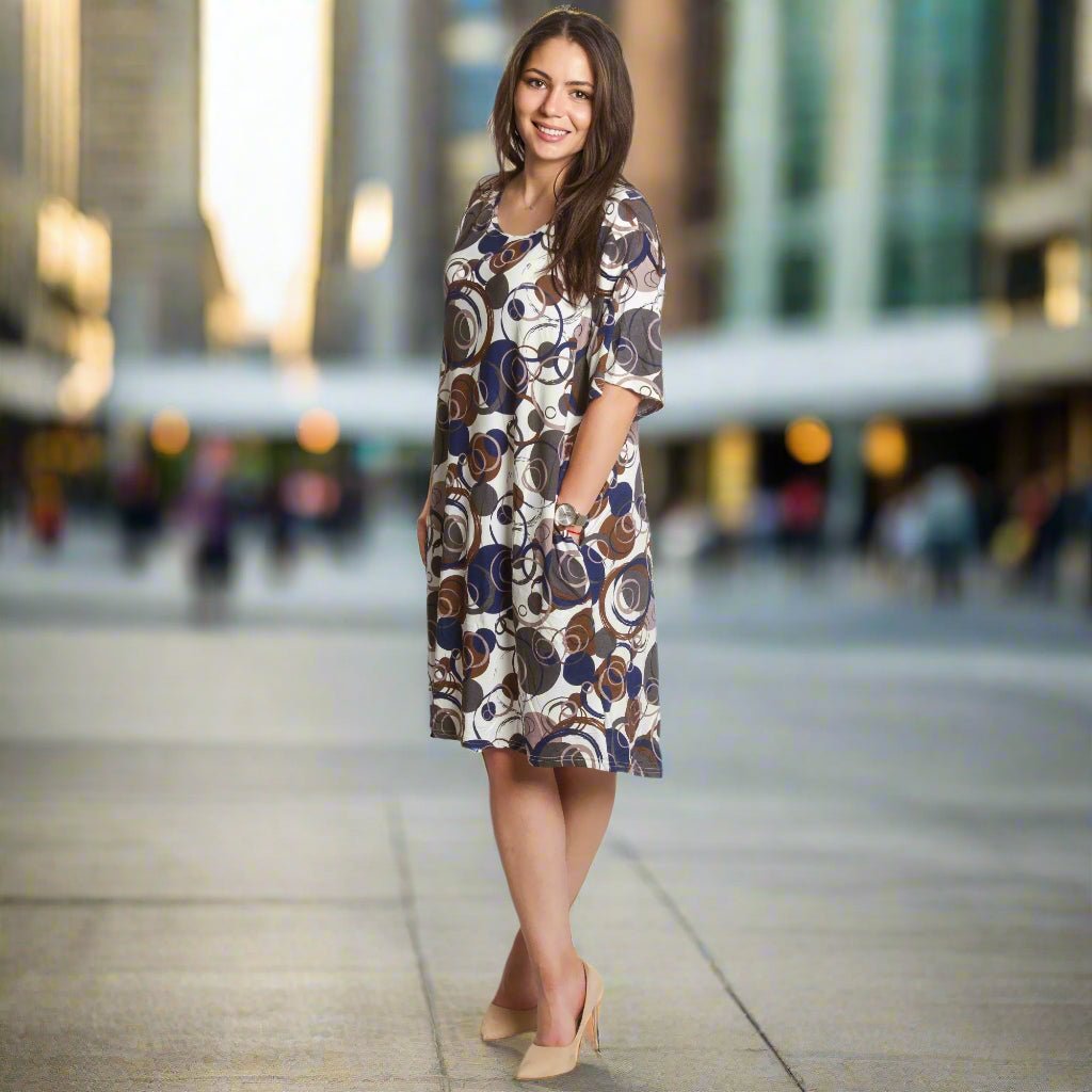 Rochie elegantă și practică, cu o croială modernă și lejeră, confecționată din material elastic și ușor. Modelul are buzunare practice și un decolteu rotund, potrivită atât pentru viața de zi cu zi, cât și pentru ocazii mai elegante. Cea potrivită este extrem de atractivă - o combinație de cercuri albastre, maro și gri pe un fundal deschis, care conferă un aspect artistic și dinamic. O alegere perfectă pentru sezonul primăvară-vară.