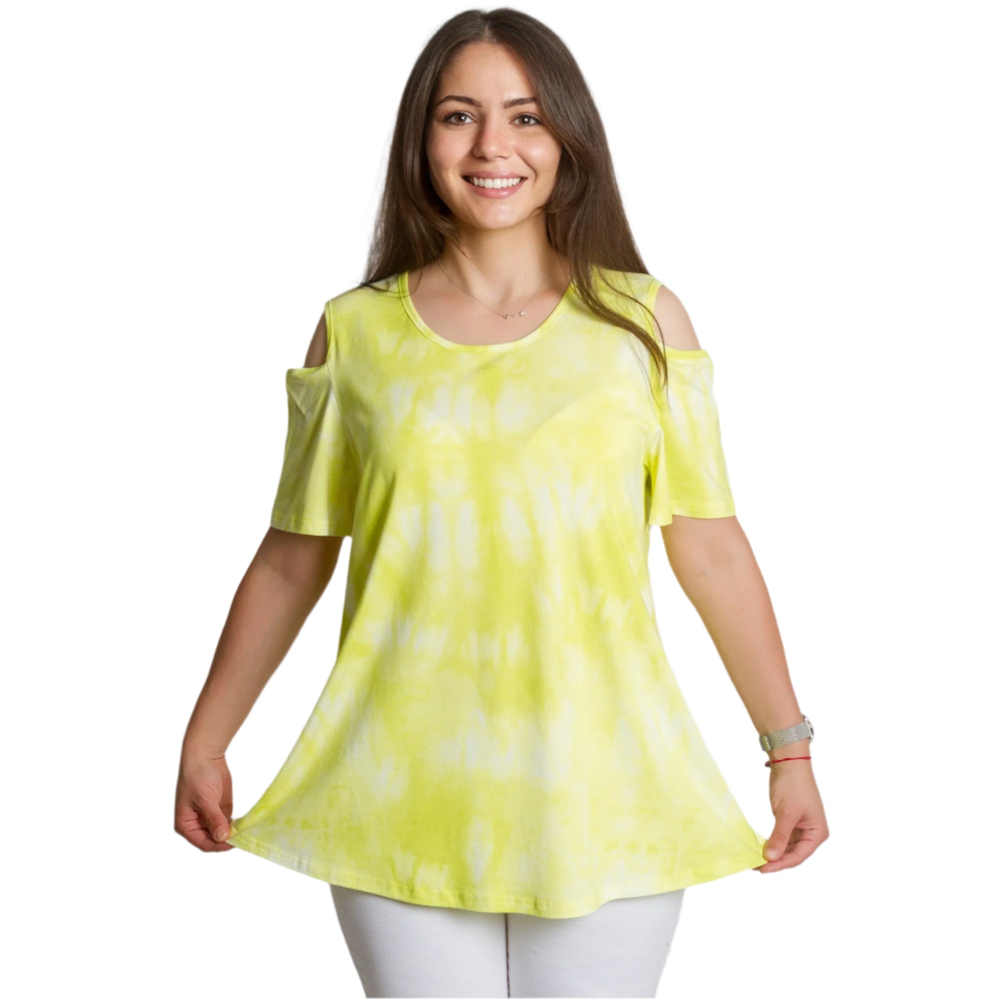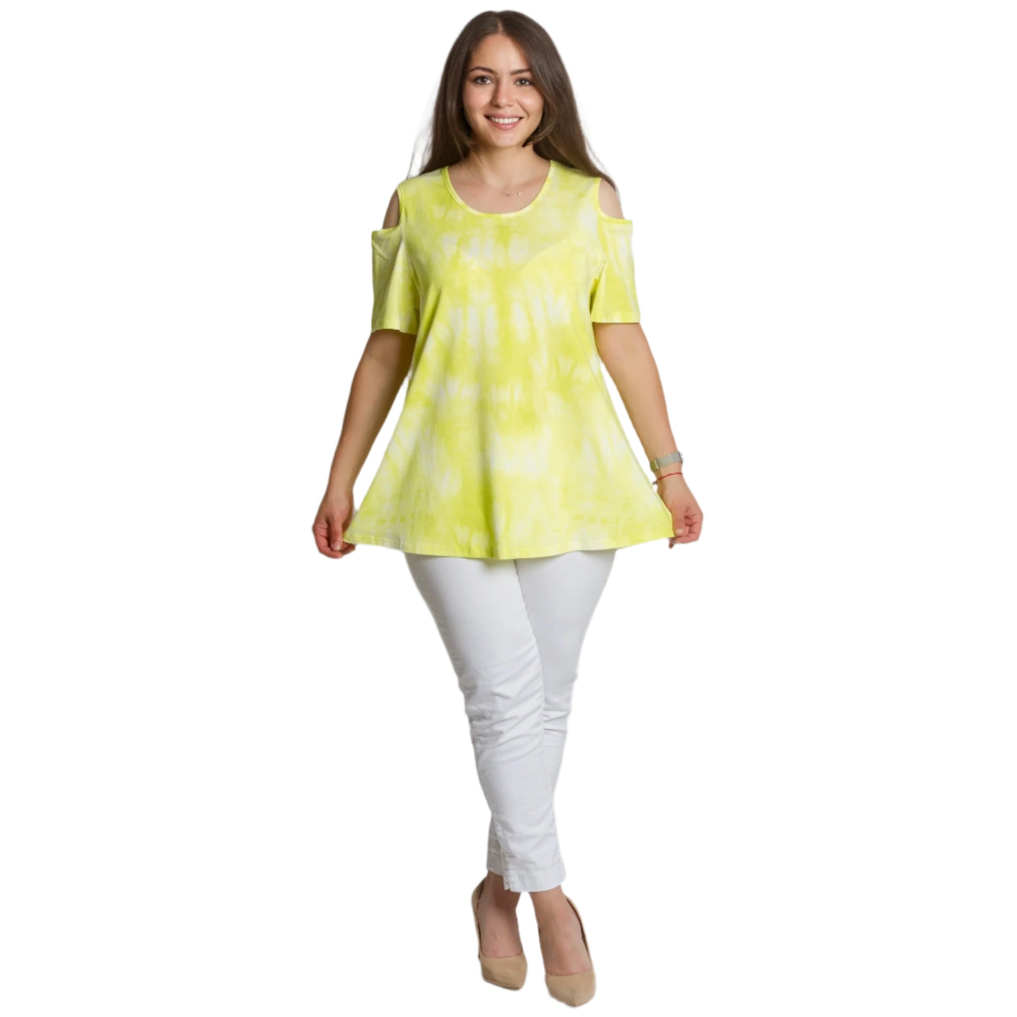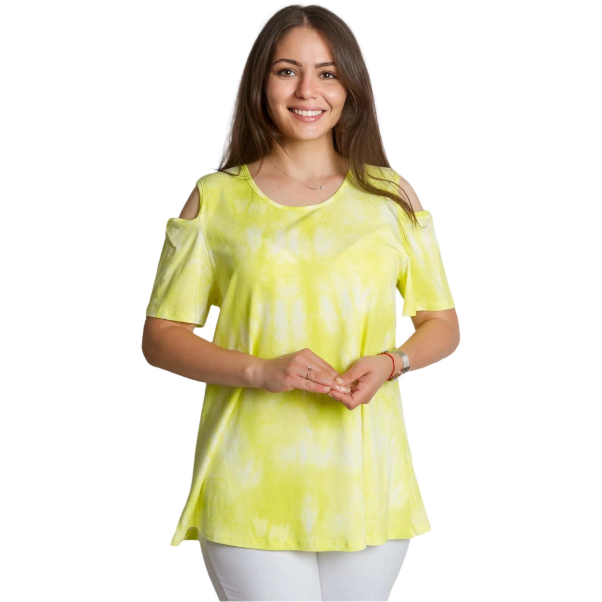 Tunică maxi galbenă cu umeri descuiți și croială lejeră