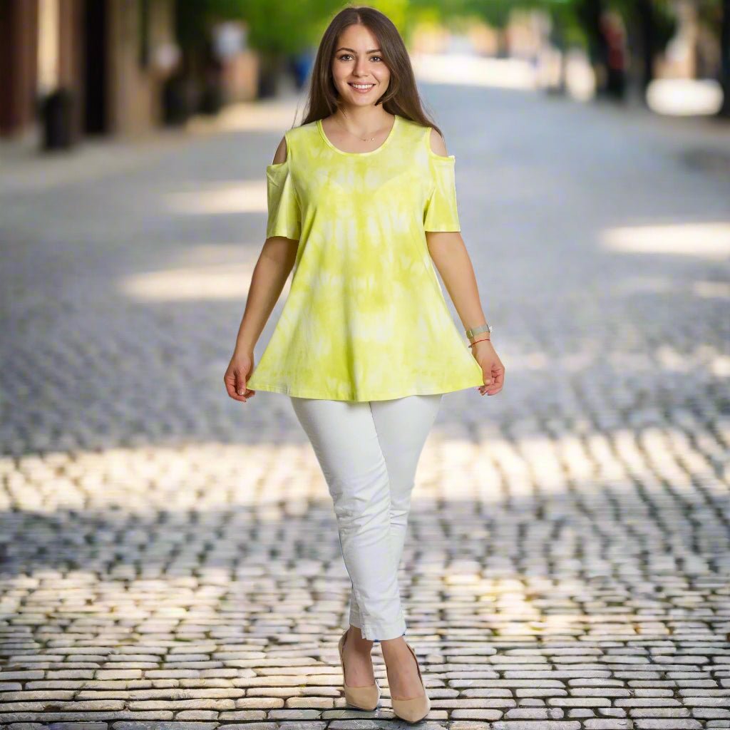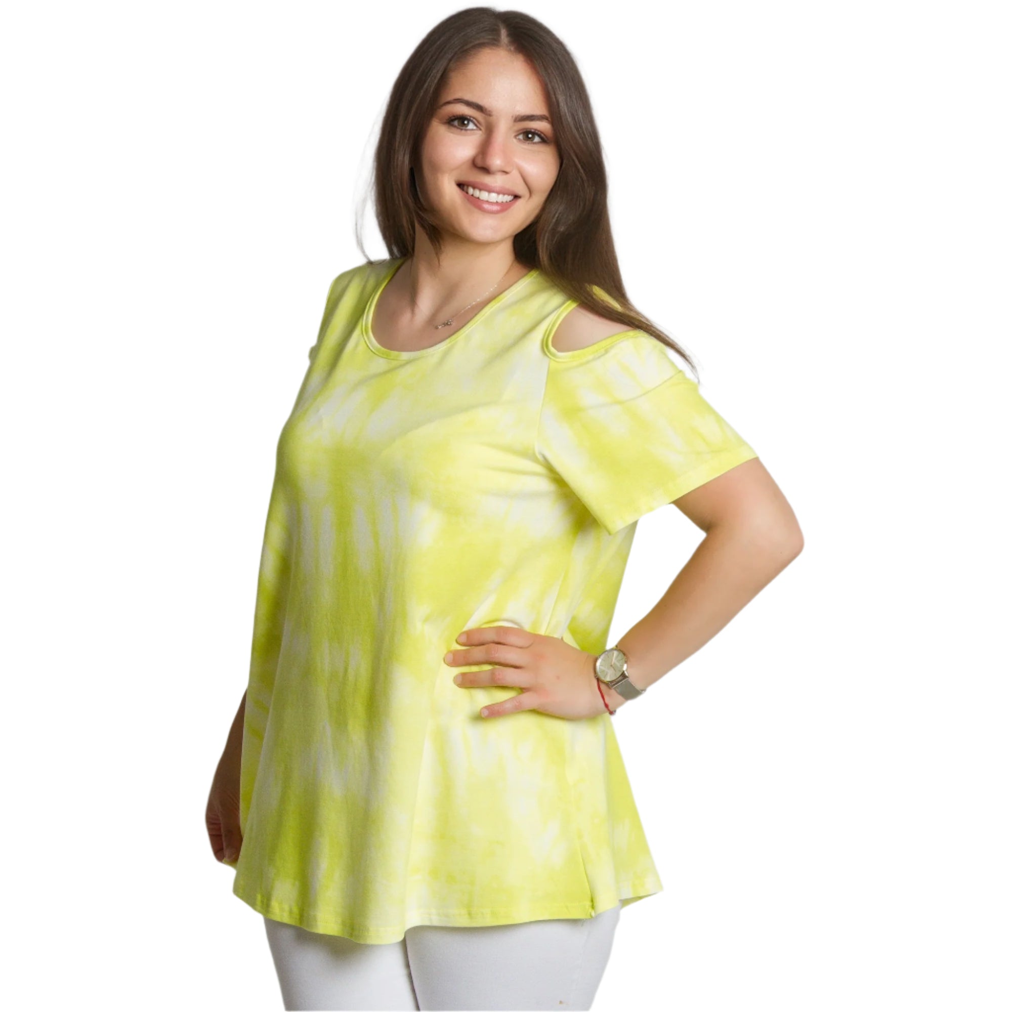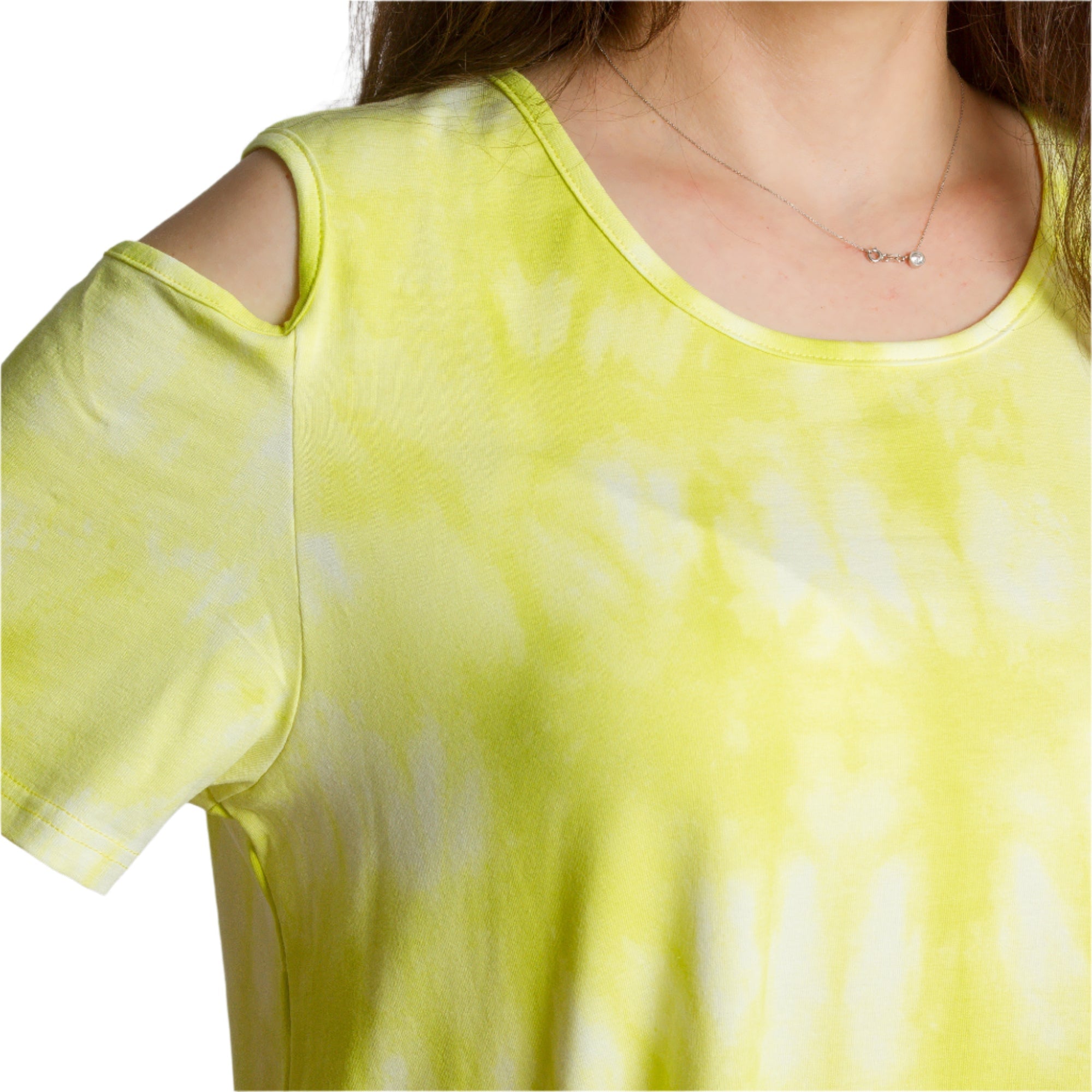 Tunică maxi galbenă cu umeri descuiți și croială lejeră