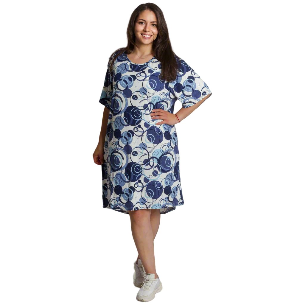Această rochie confortabilă și spectaculoasă, de culoare bleumarin, cu model abstract, este completarea perfectă a garderobei tale de primăvară-vară. Modelul are o croială lejeră și mâneci scurte, asigurând lejeritate și confort la purtare. Cele două buzunare funcționale adaugă practicitate, iar decolteul rotund conferă feminitate. Este potrivită atât pentru viața de zi cu zi, cât și pentru evenimente formale mai casual.