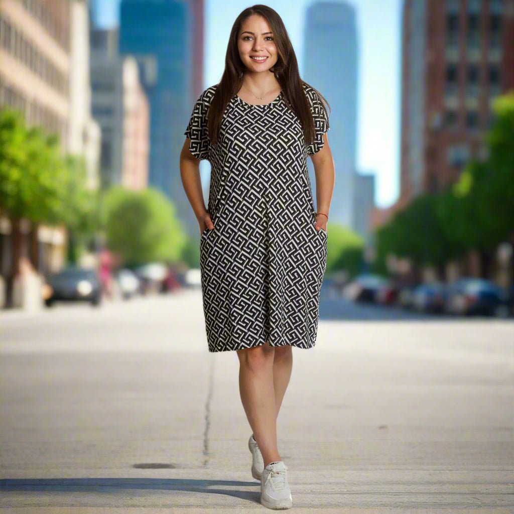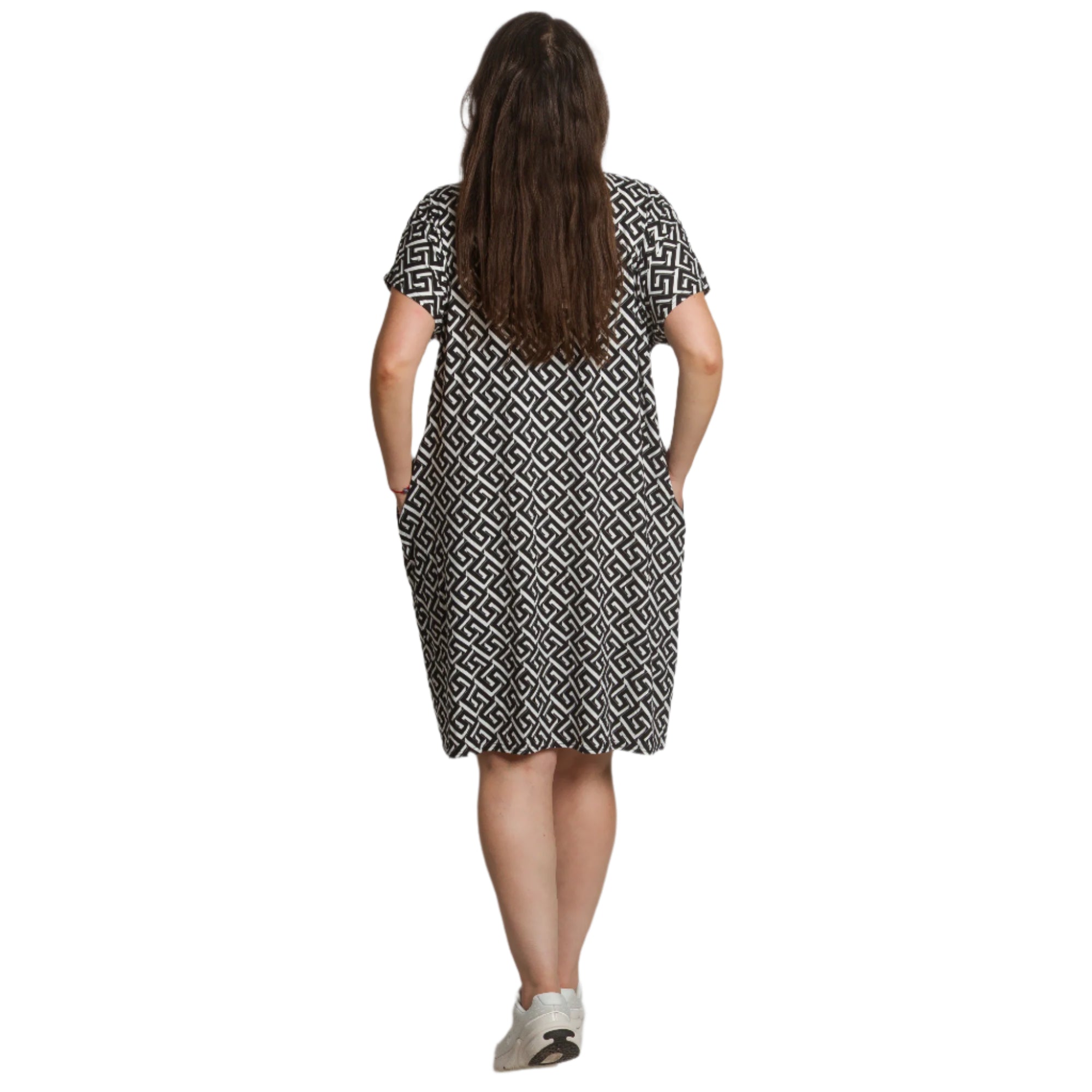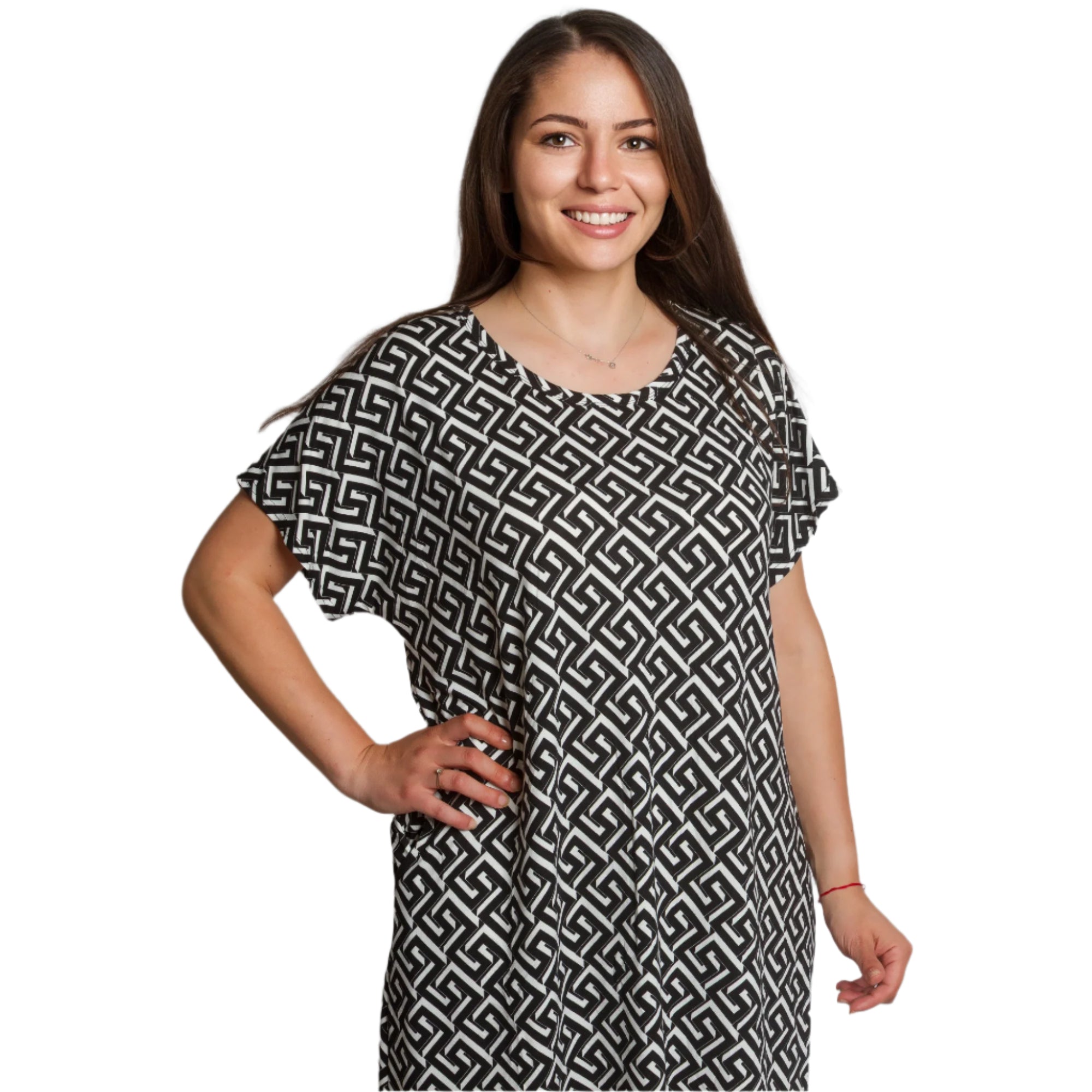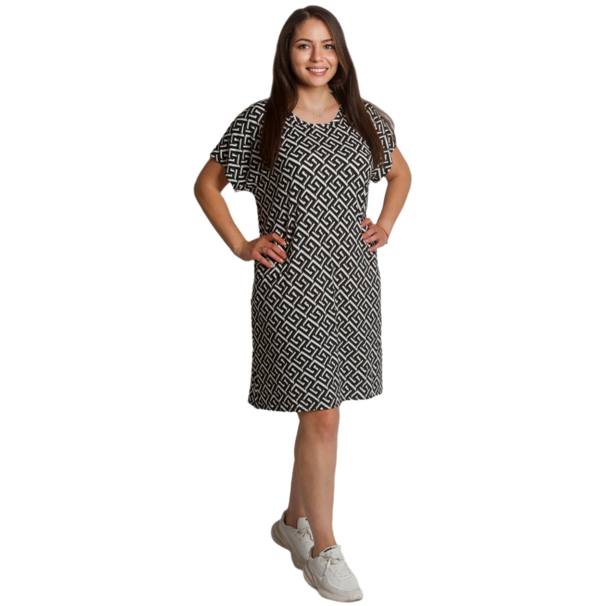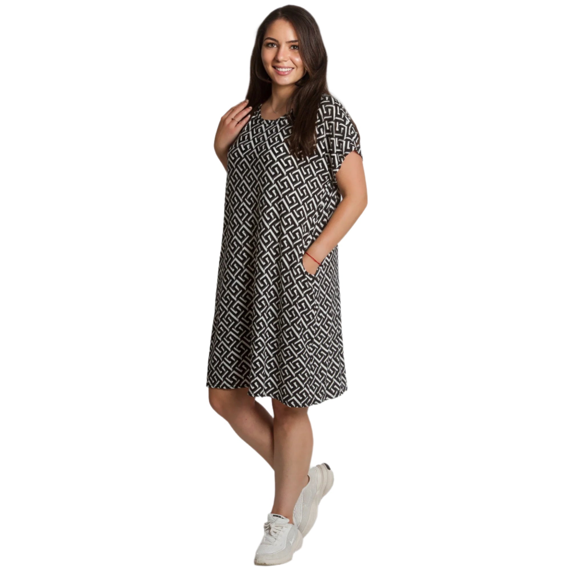 Confort și stil într-un singur lucru – această rochie neagră cu model geometric alb este alegerea perfectă pentru sezonul primăvară-vară. Confecționată din material moale și elastic, oferă libertate de mișcare și este potrivită atât pentru viața de zi cu zi, cât și pentru ocazii mai formale. Croiul evazat accentuează talia fără a fi strâmtă, iar buzunarele practice adaugă funcționalitate aspectului modern. Decolteul rotund și mânecile scurte conferă un farmec casual siluetei de ansamblu.