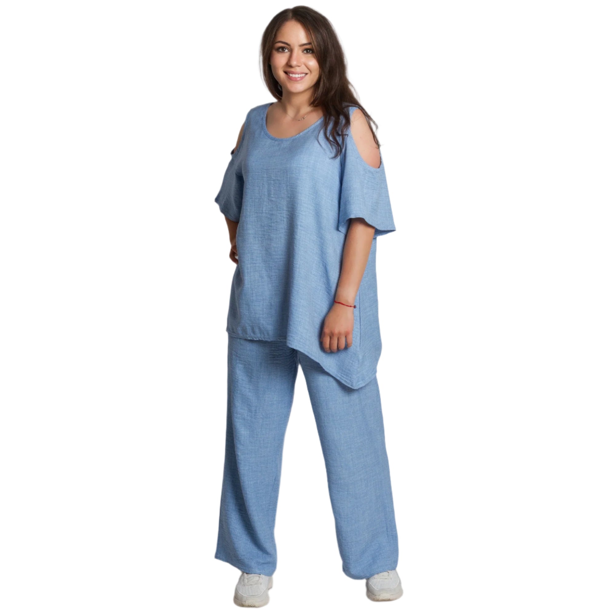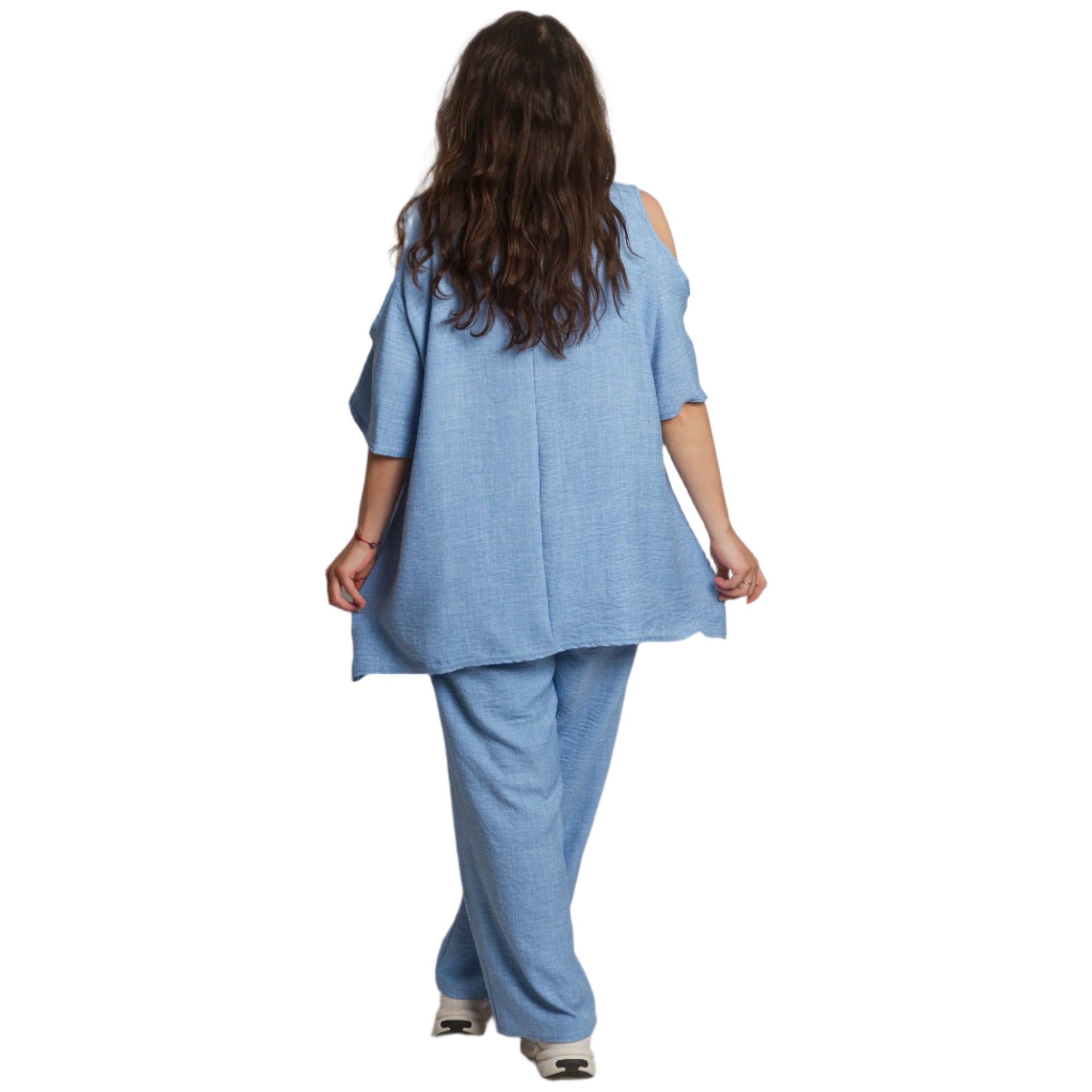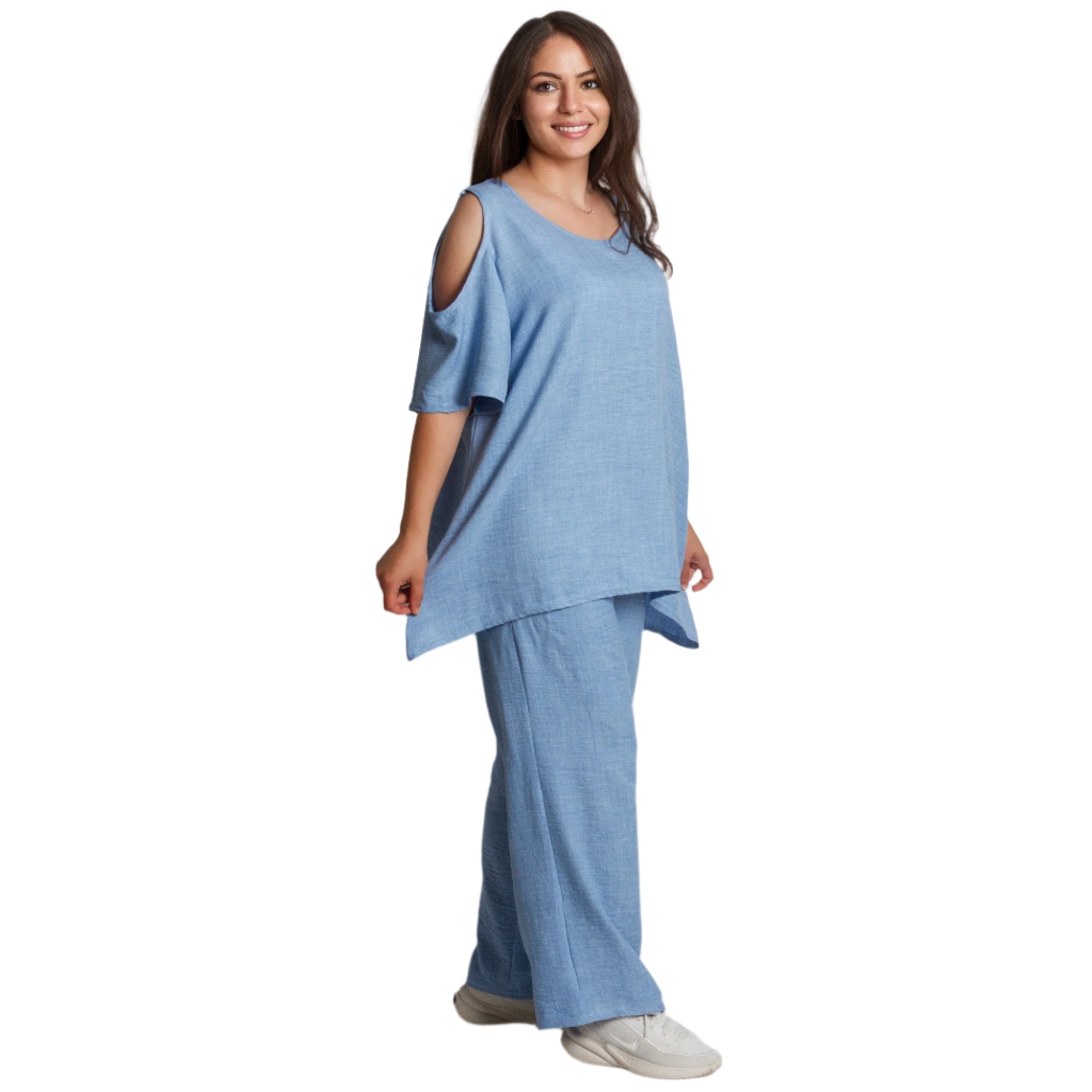 Descoperă stilul și confortul cu acest costum elegant din două piese, care combină o tunică cu umeri deschiși spectaculoși și pantaloni lungi cu buzunare și talie elastică. Materialul moale și respirabil, compus din 70% bumbac și 30% poliester, îl face o alegere ideală pentru zilele călduroase. Croiul lejer oferă lejeritate și libertate de mișcare, iar culoarea albastru curat adaugă prospețime și feminitate. Potrivit atât pentru viața de zi cu zi, cât și pentru ocazii mai formale.