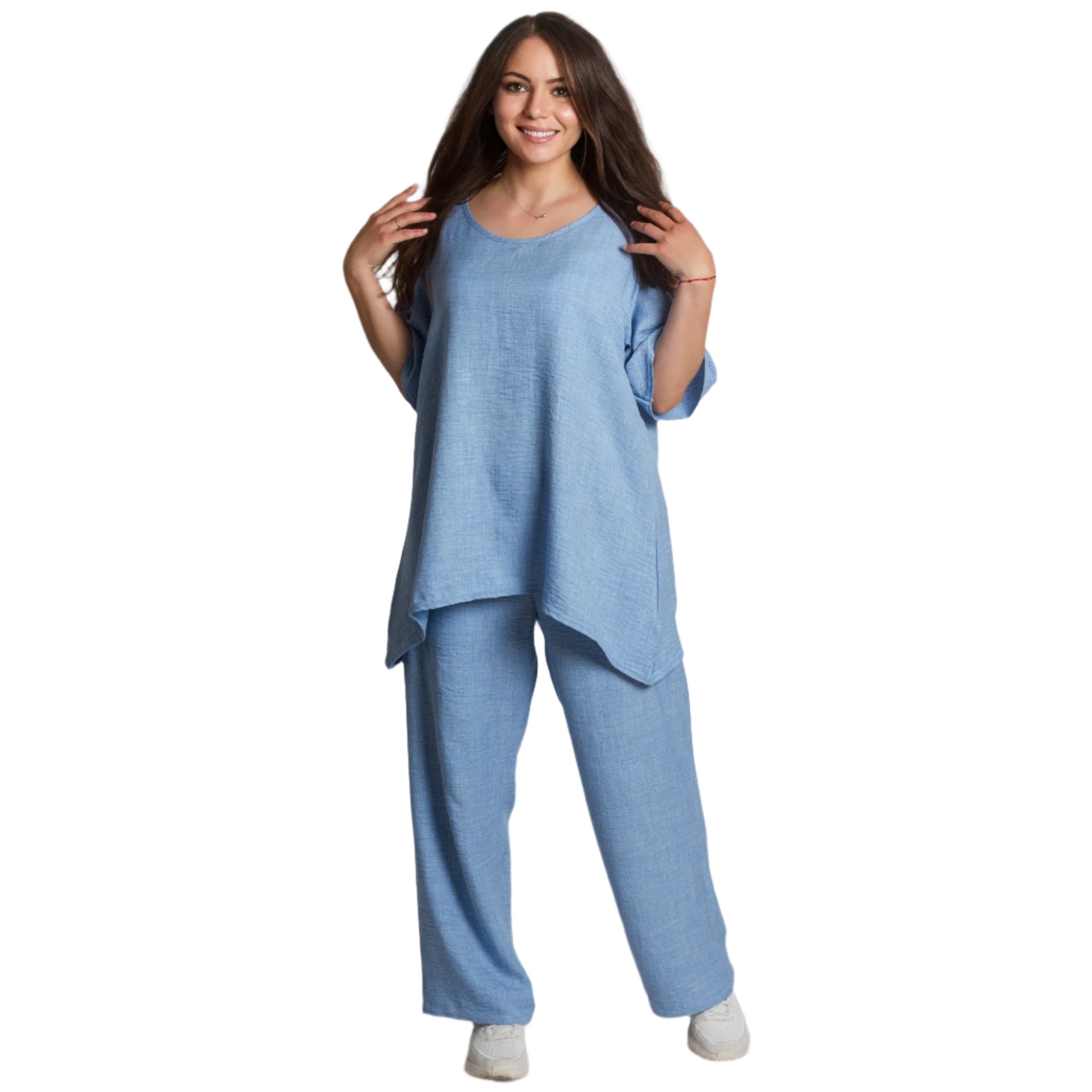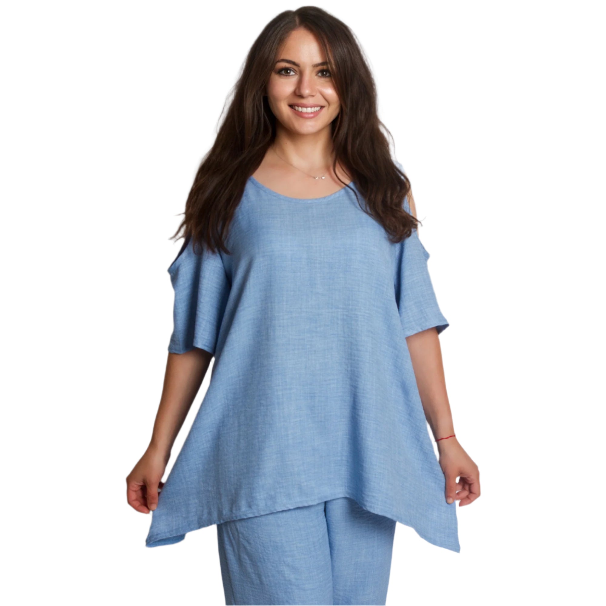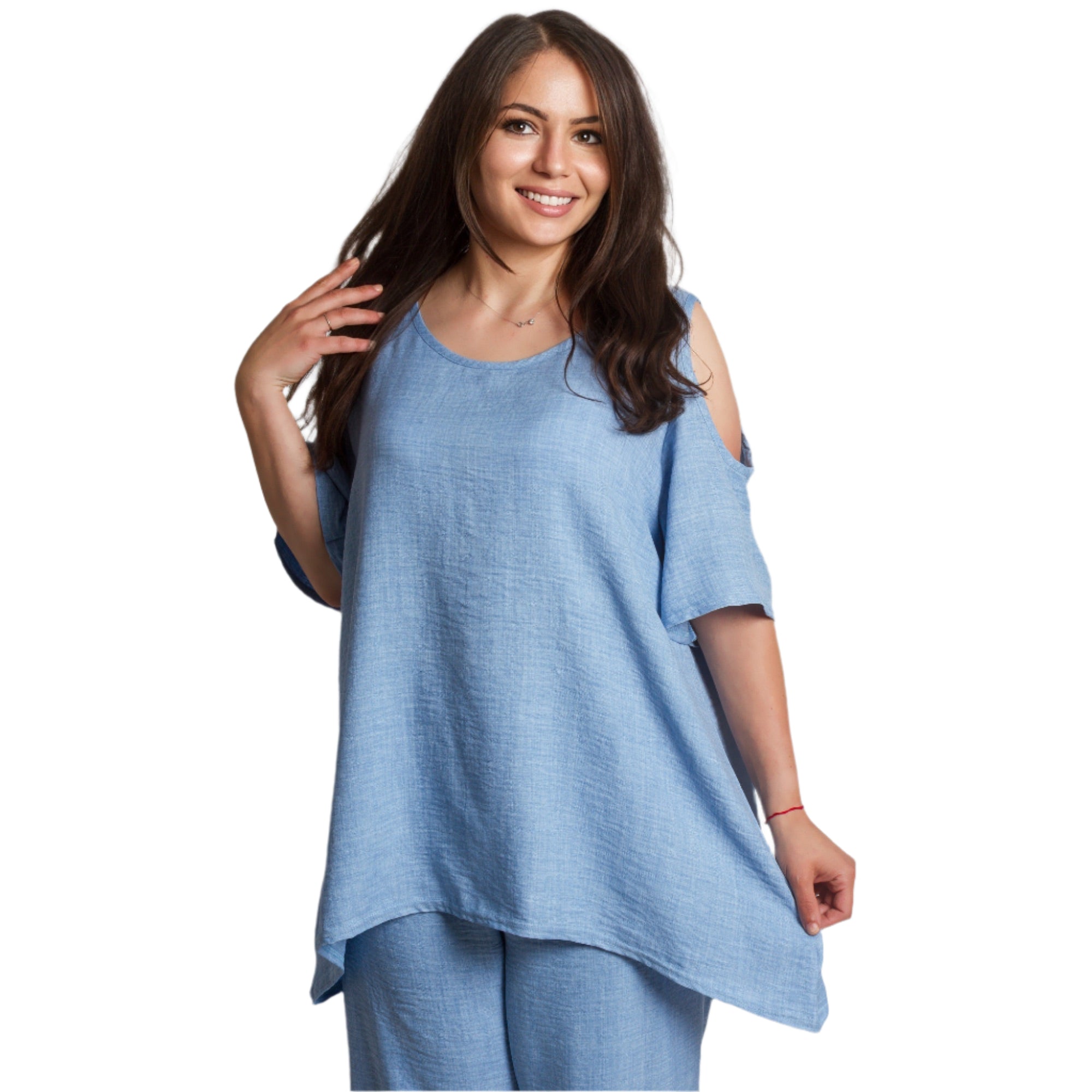 Descoperă stilul și confortul cu acest costum elegant din două piese, care combină o tunică cu umeri deschiși spectaculoși și pantaloni lungi cu buzunare și talie elastică. Materialul moale și respirabil, compus din 70% bumbac și 30% poliester, îl face o alegere ideală pentru zilele călduroase. Croiul lejer oferă lejeritate și libertate de mișcare, iar culoarea albastru curat adaugă prospețime și feminitate. Potrivit atât pentru viața de zi cu zi, cât și pentru ocazii mai formale.
