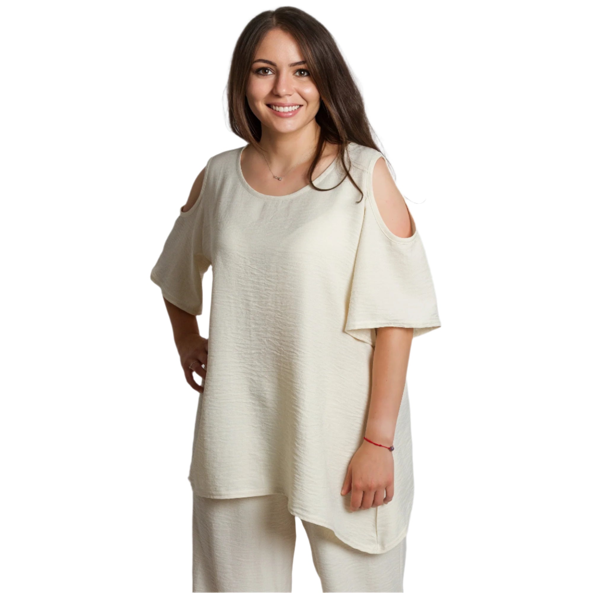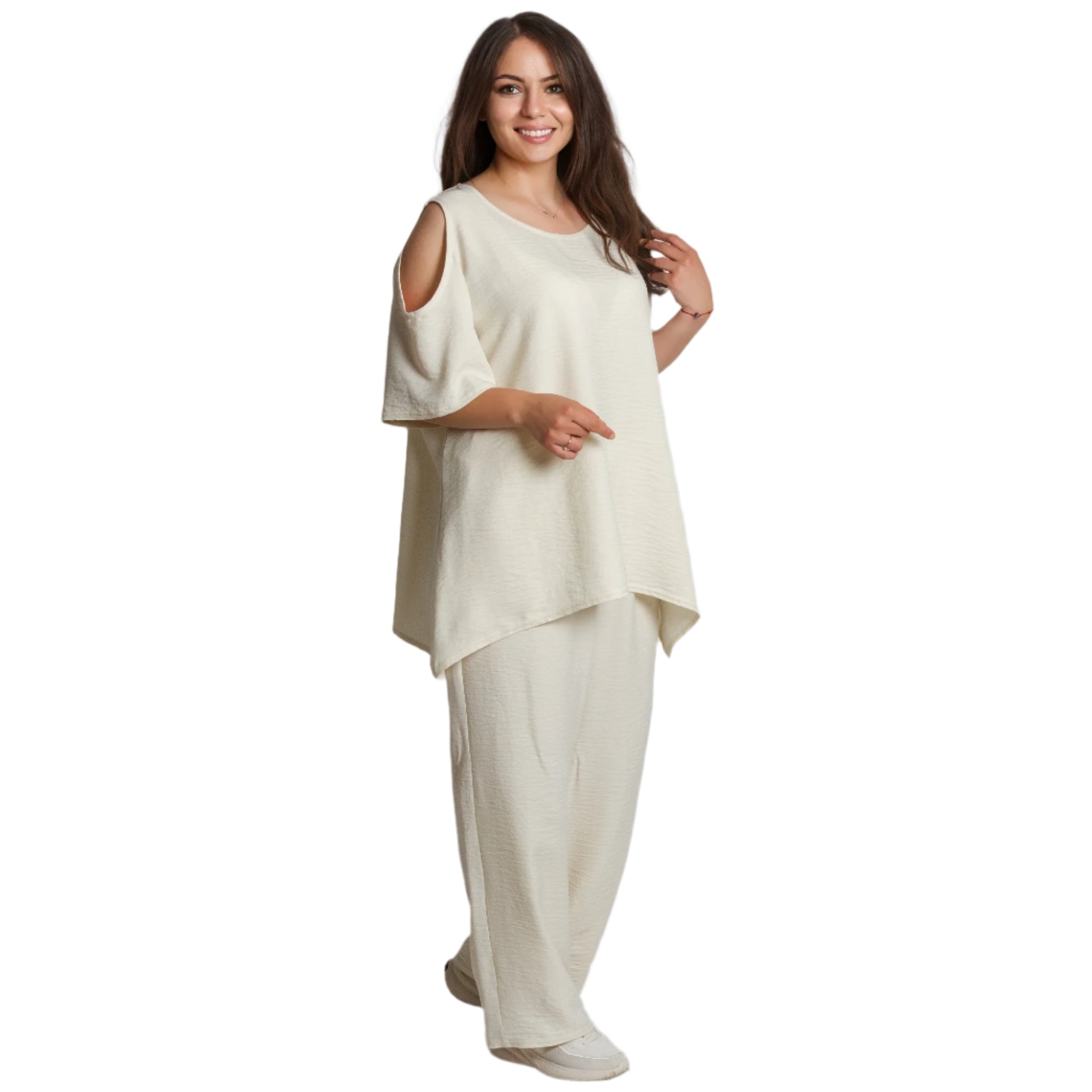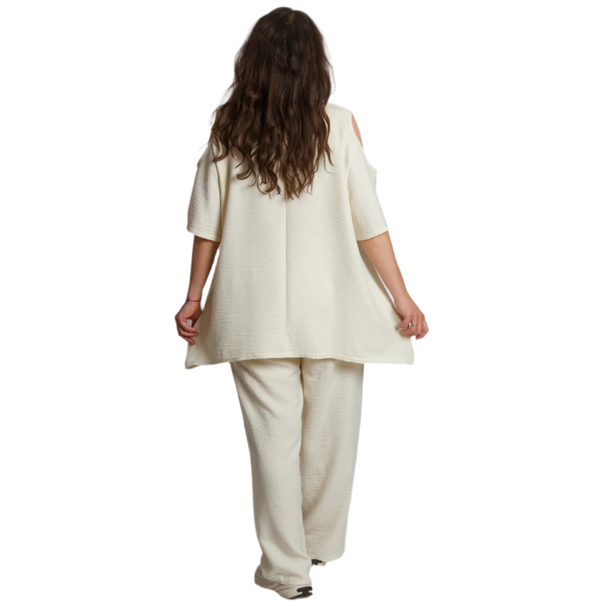 Oferă-ți eleganță și lejeritate cu acest costum elegant crem din două piese, care include o tunică cu umeri descheiați și pantaloni largi cu elastic confortabil și buzunare. Materialul este moale și respirabil - ideal pentru sezonul primăvară-vară. Croiul lejer oferă confort, în timp ce culoarea crem neutră accentuează tandrețea și feminitatea siluetei. O alegere perfectă atât pentru viața de zi cu zi, cât și pentru ocazii speciale.