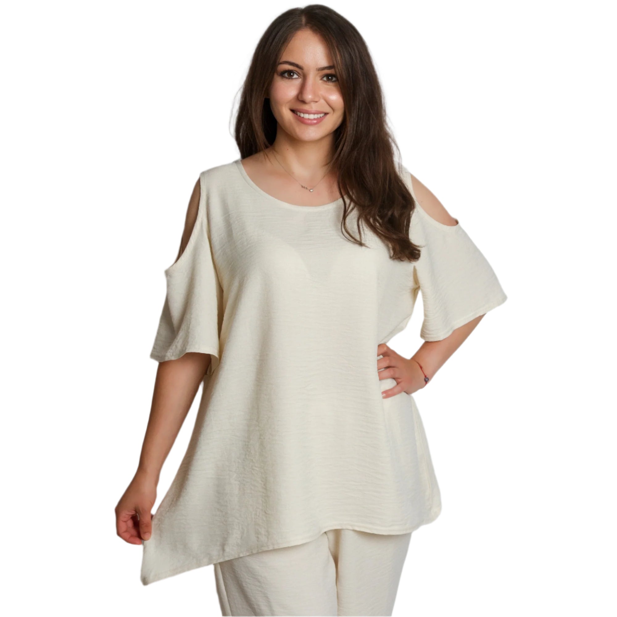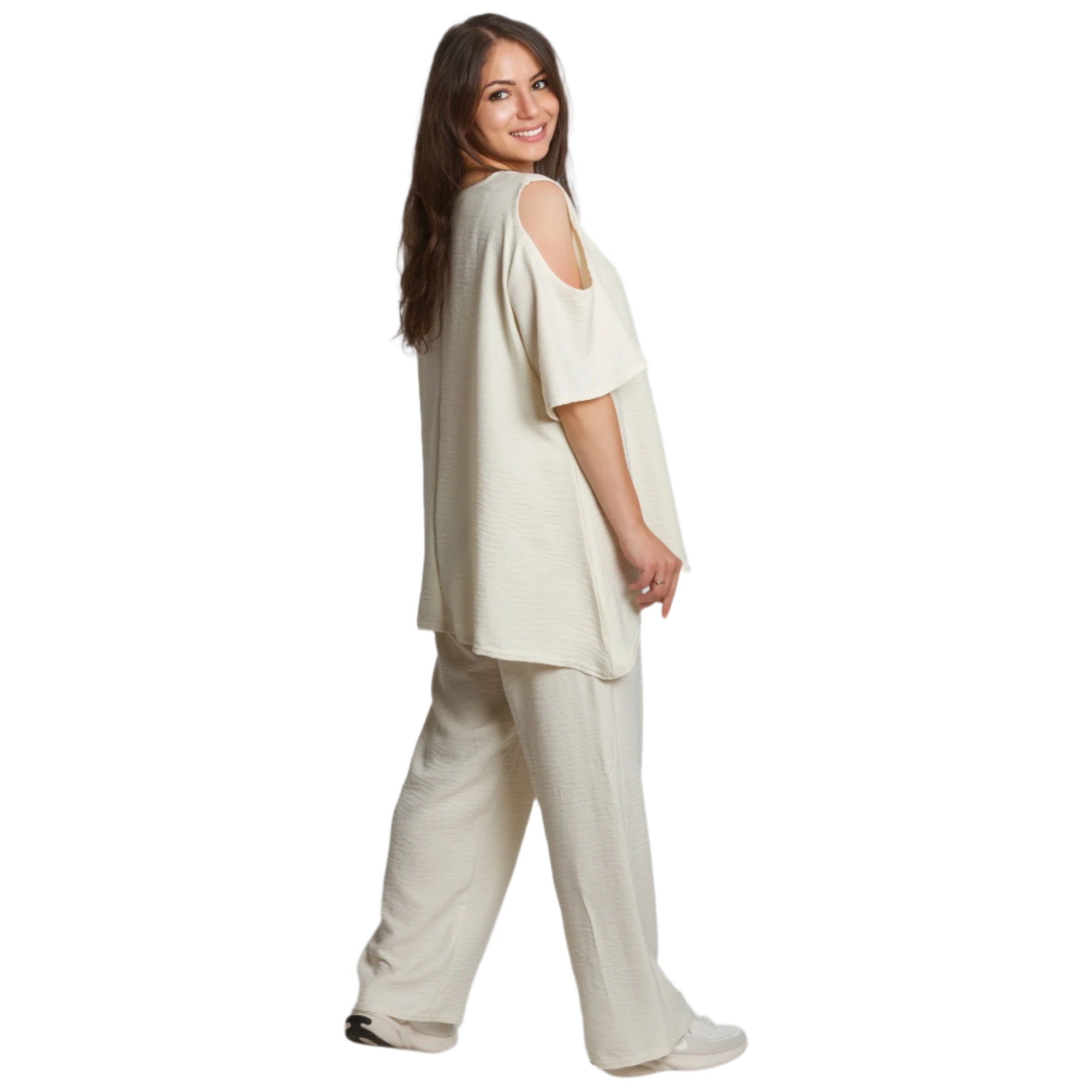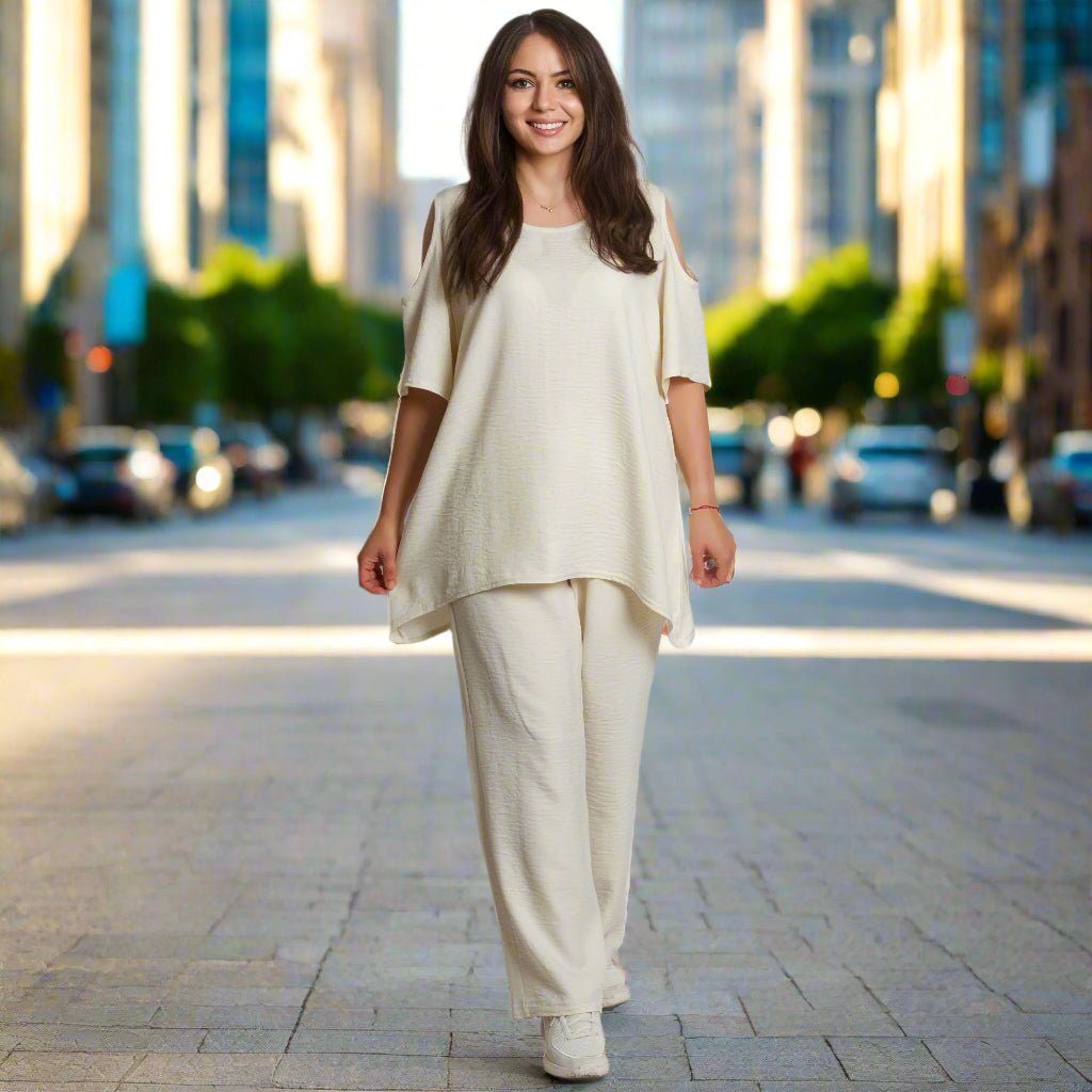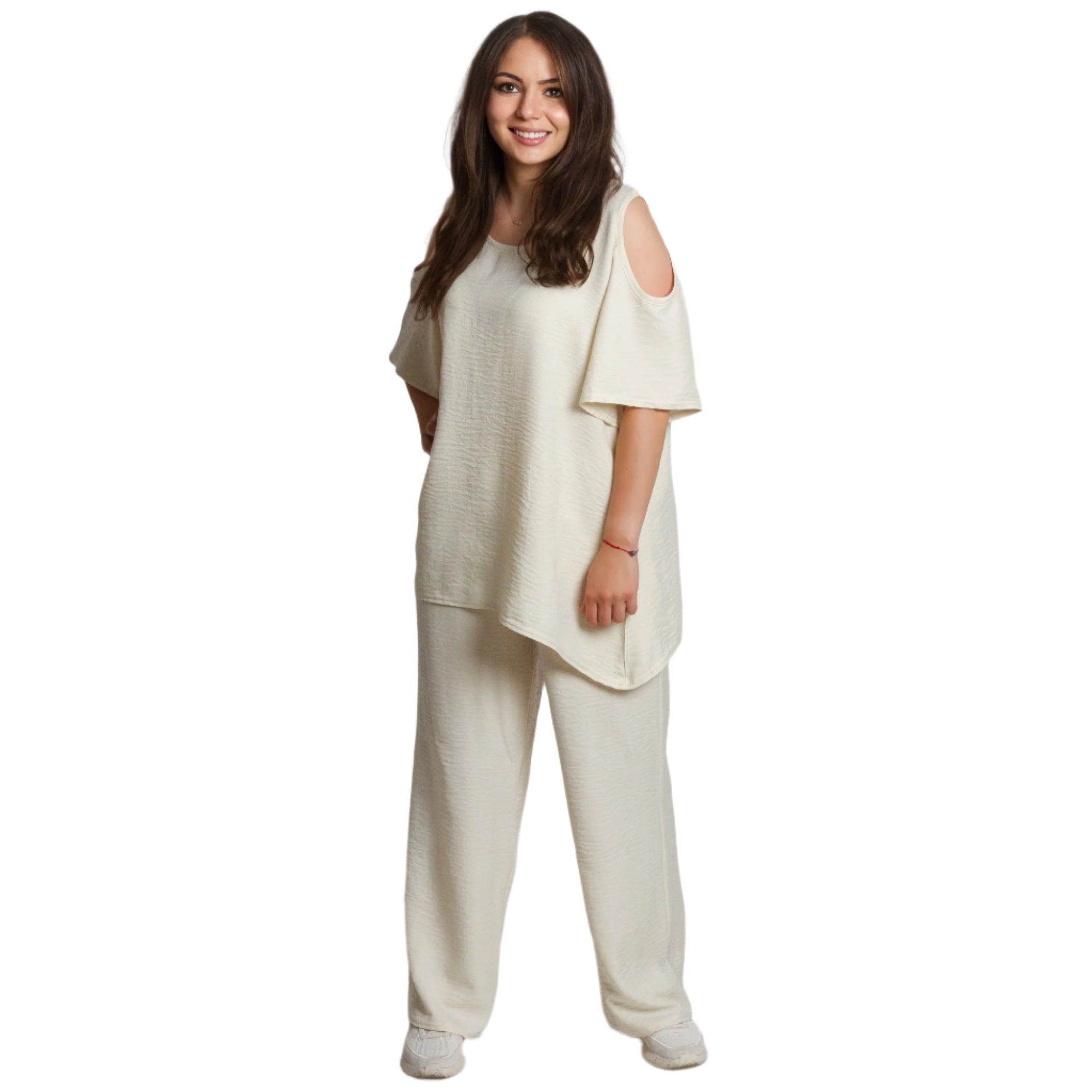 Oferă-ți eleganță și lejeritate cu acest costum elegant crem din două piese, care include o tunică cu umeri descheiați și pantaloni largi cu elastic confortabil și buzunare. Materialul este moale și respirabil - ideal pentru sezonul primăvară-vară. Croiul lejer oferă confort, în timp ce culoarea crem neutră accentuează tandrețea și feminitatea siluetei. O alegere perfectă atât pentru viața de zi cu zi, cât și pentru ocazii speciale.