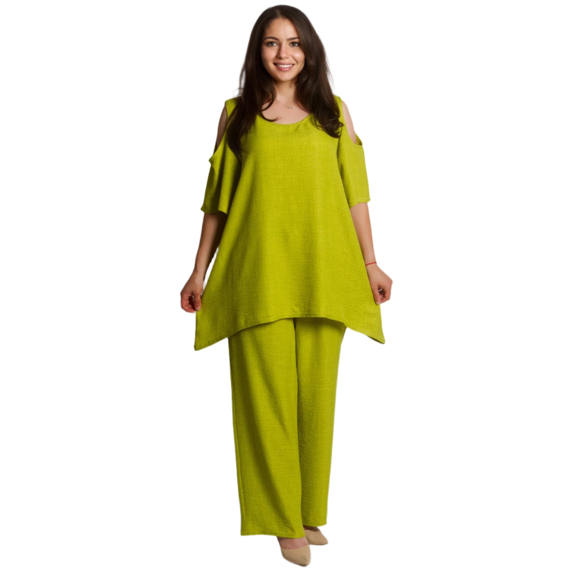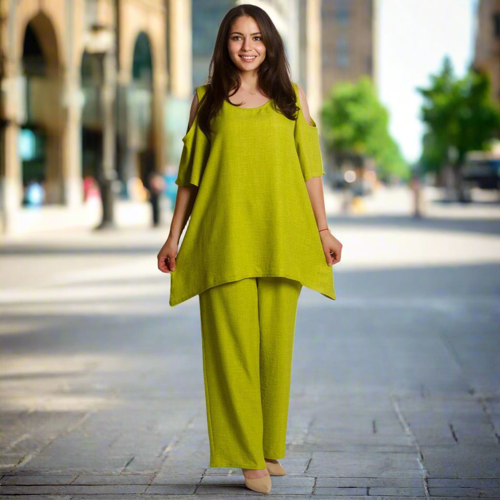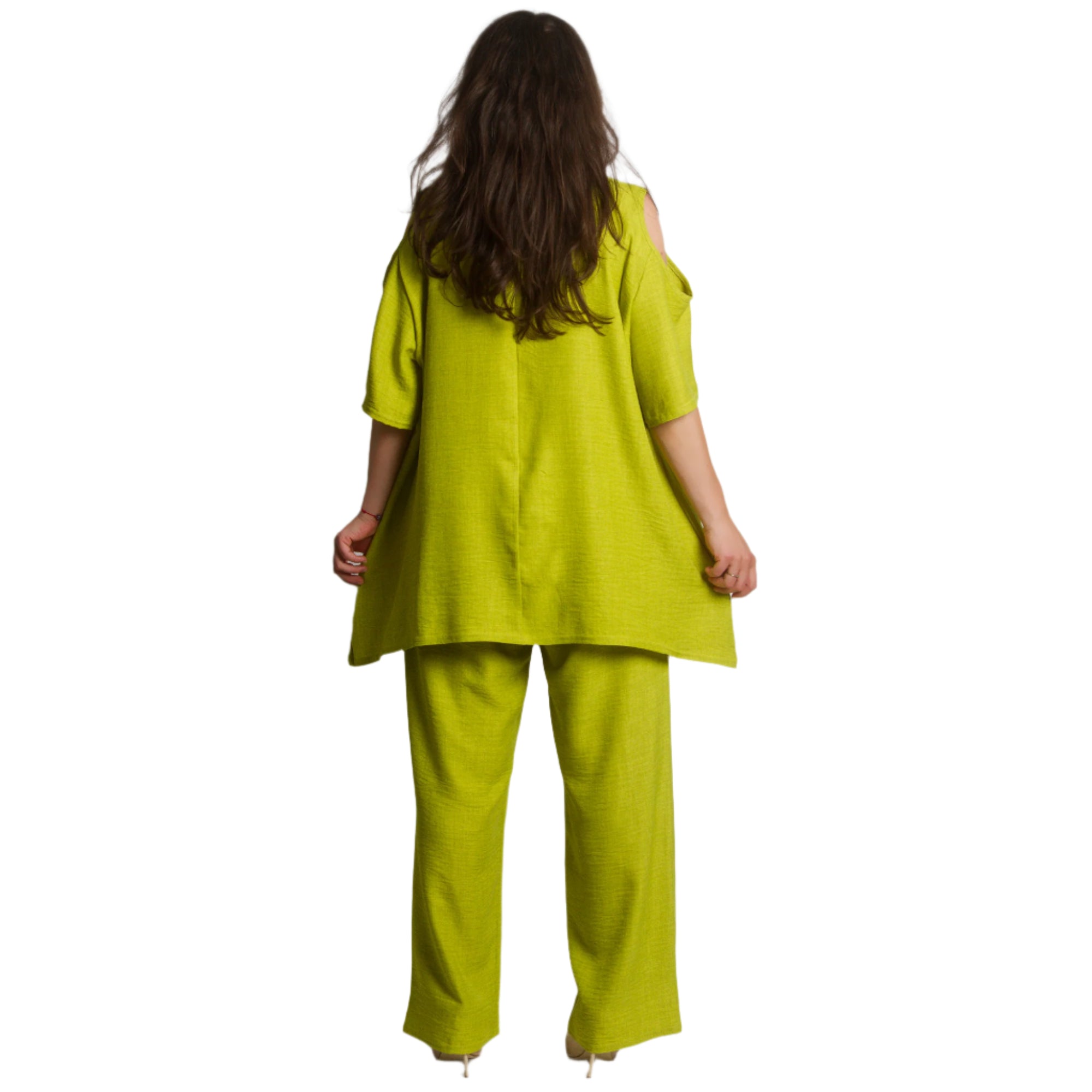 Costum verde larg, din două piese, cu umerii deschiși