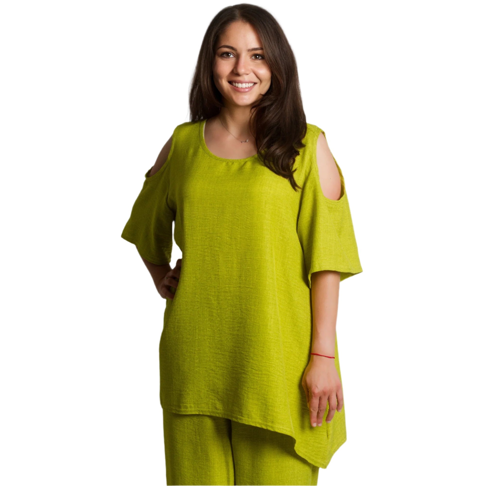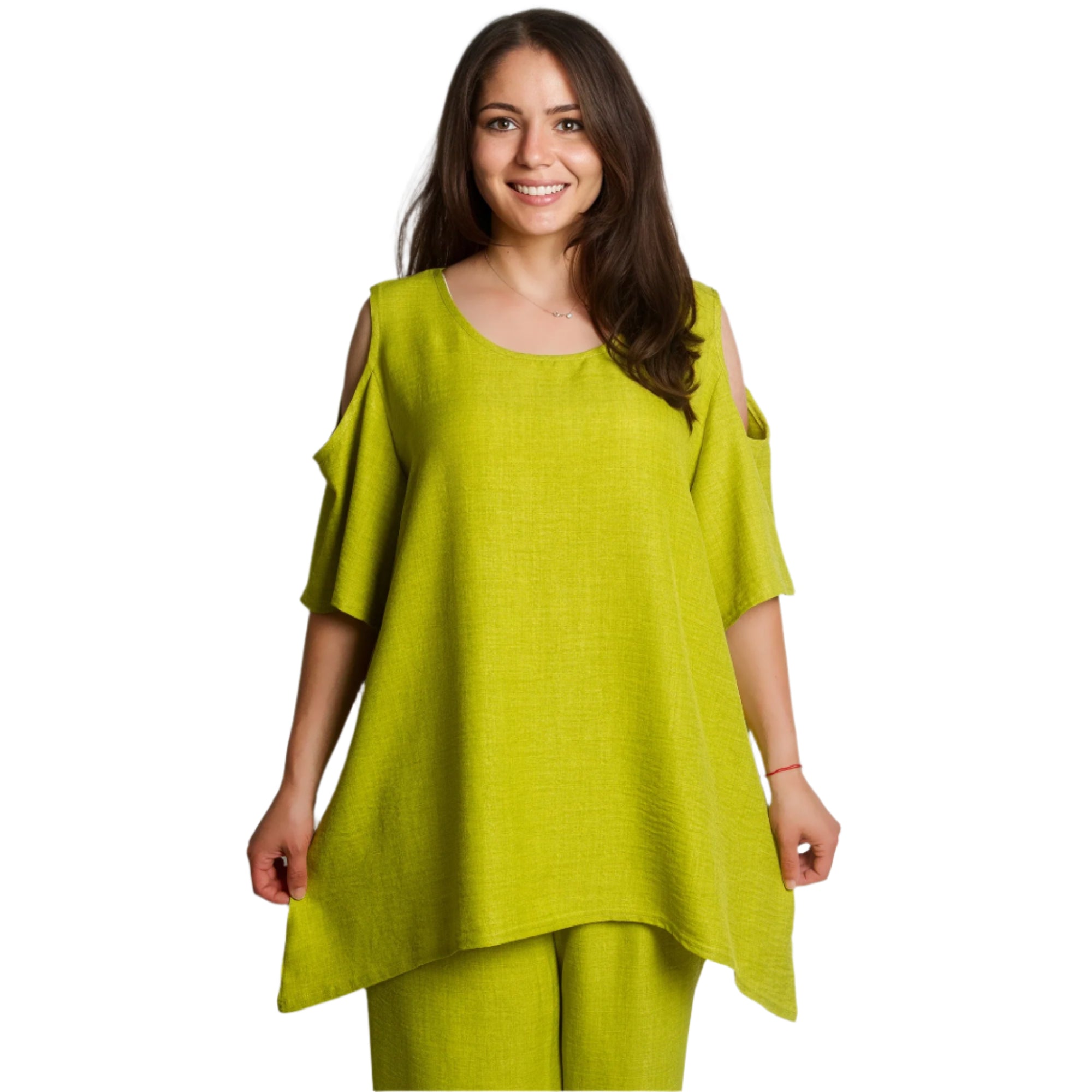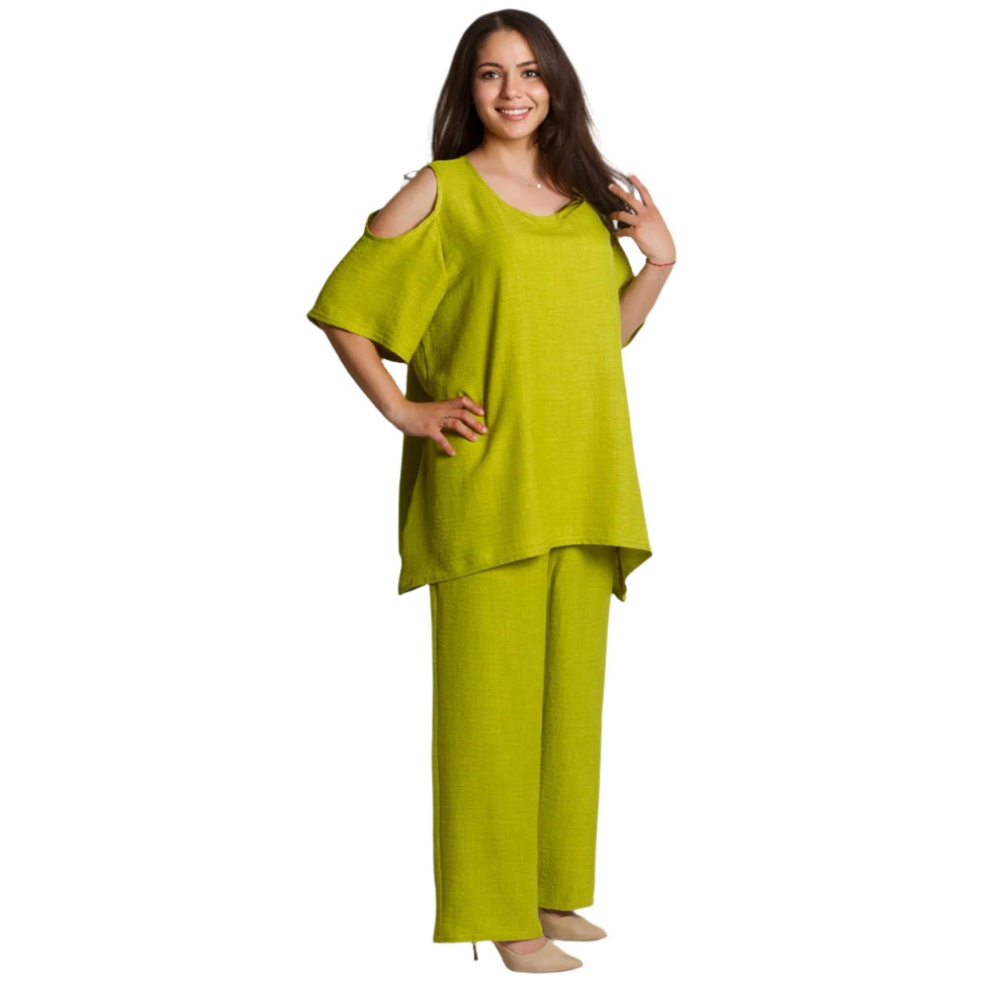 Costum verde larg, din două piese, cu umerii deschiși