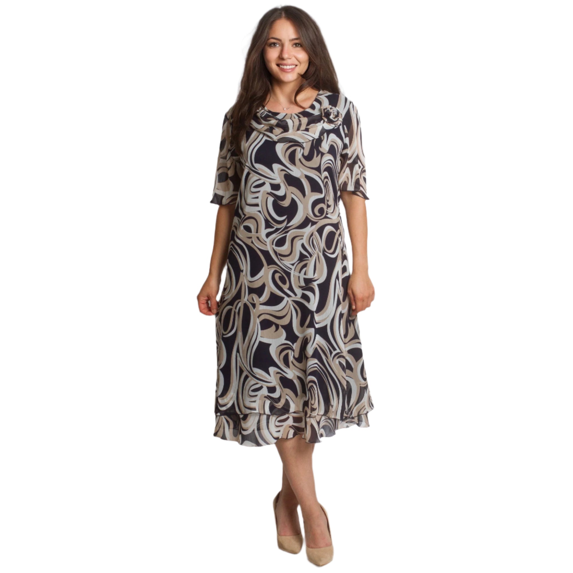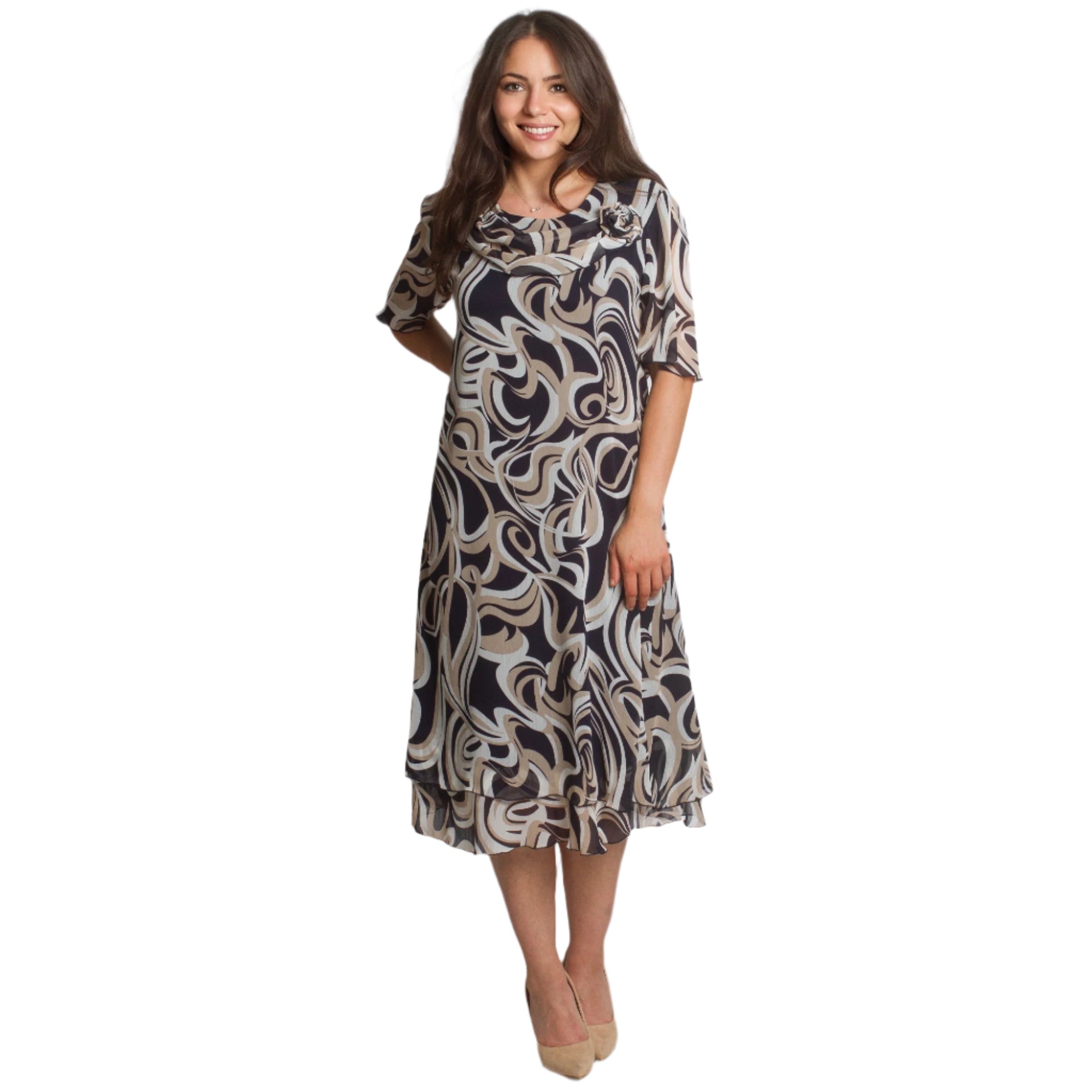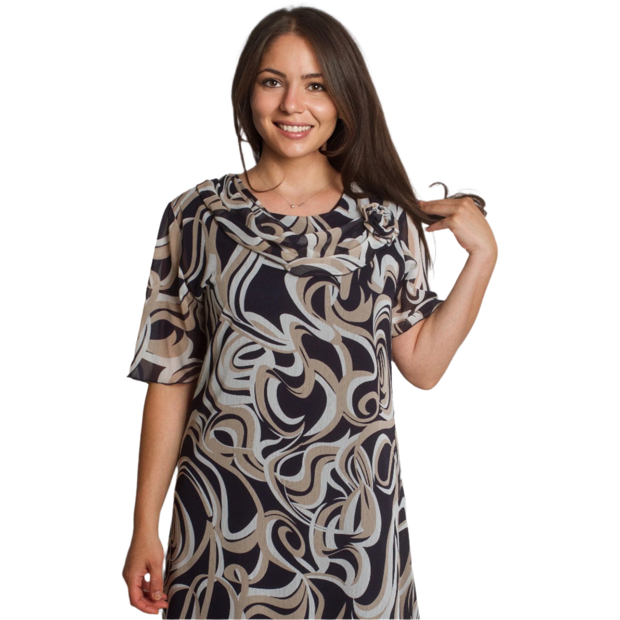 Adaugă eleganță și stil garderobei tale cu această rochie formală din șifon, creată special pentru doamnele plus-size. Modelul are o croială dreaptă și căptușeală elastică, care oferă confort pe tot parcursul zilei. Fundalul negru este combinat cu un model abstract bej spectaculos, iar pe umăr există o decorațiune elegantă - o floare confecționată din aceeași țesătură, oferind un finisaj unic look-ului. Este potrivită pentru sezonul primăvară-vară și ocazii formale precum sărbători, nunți sau cocktailuri.